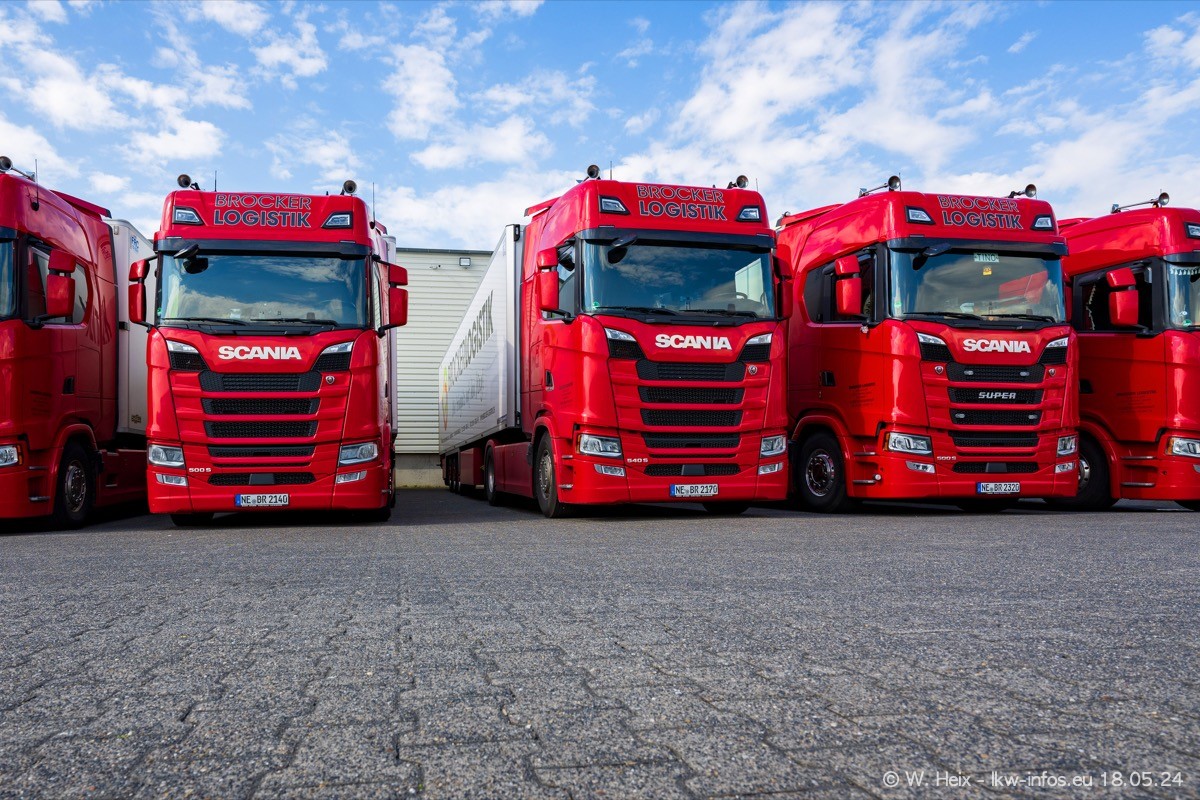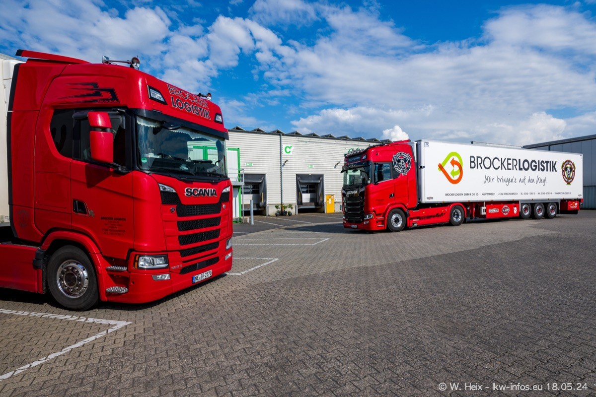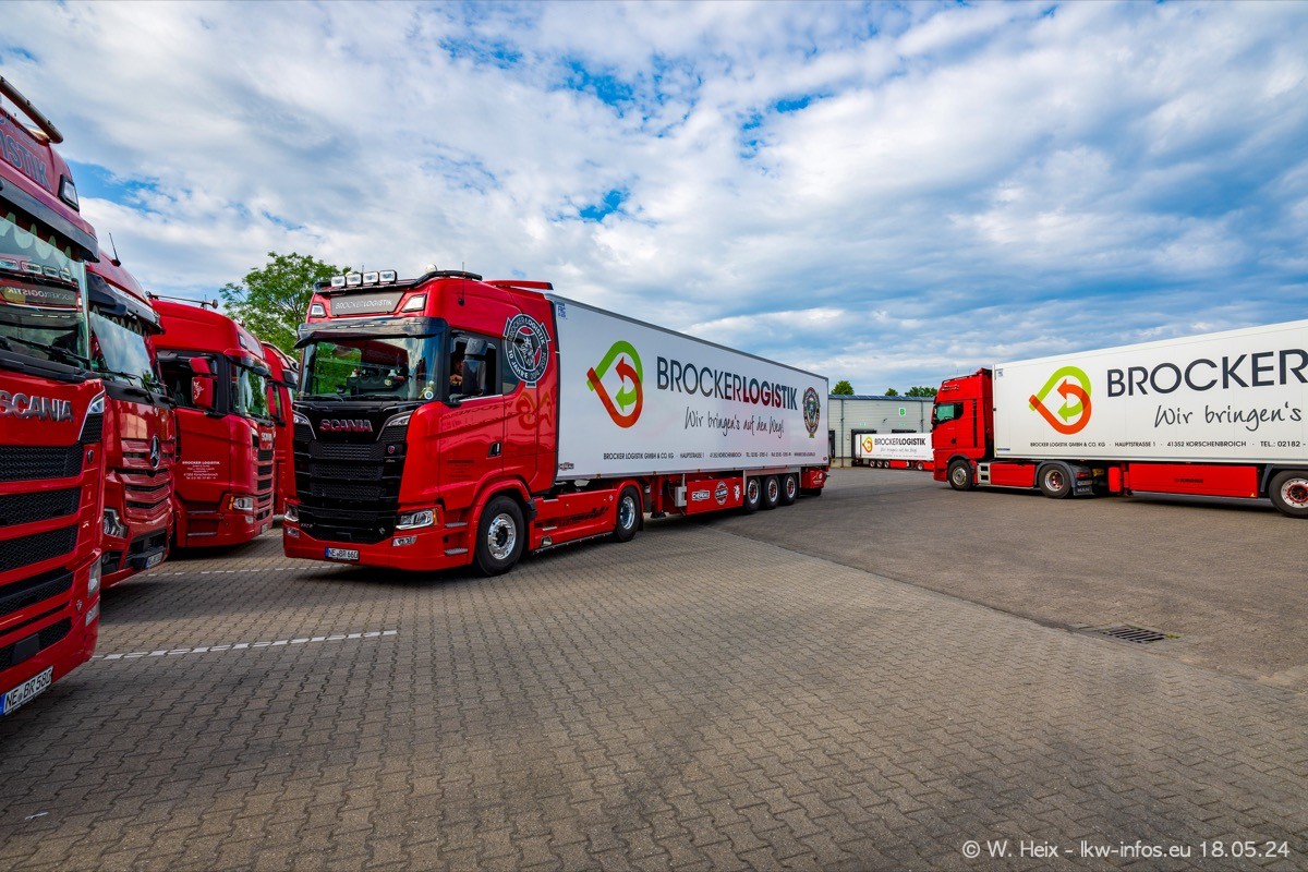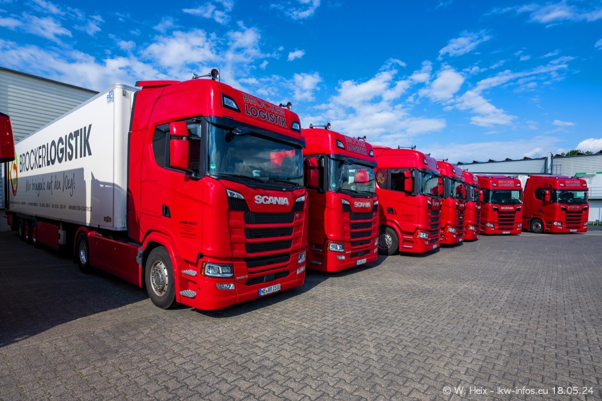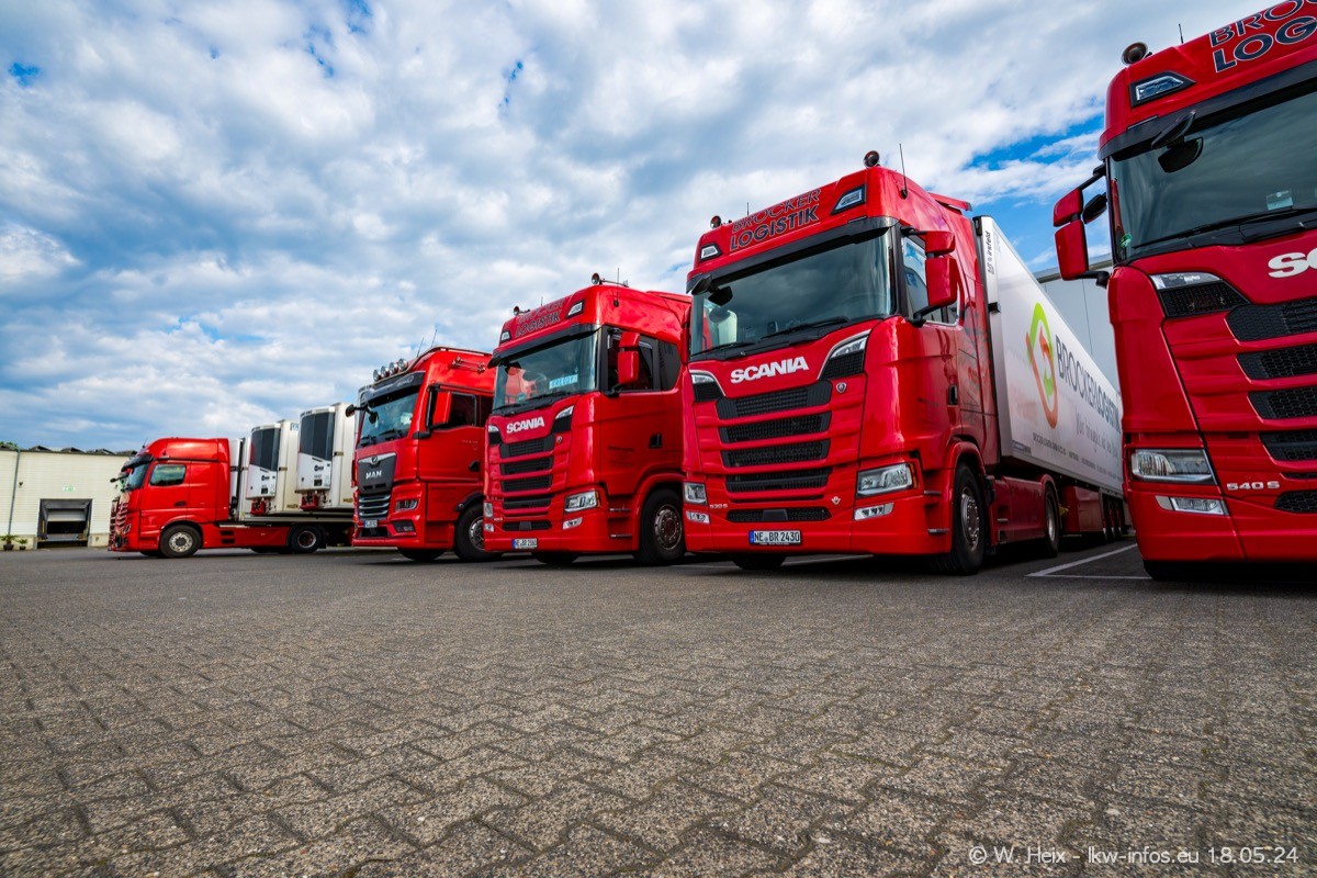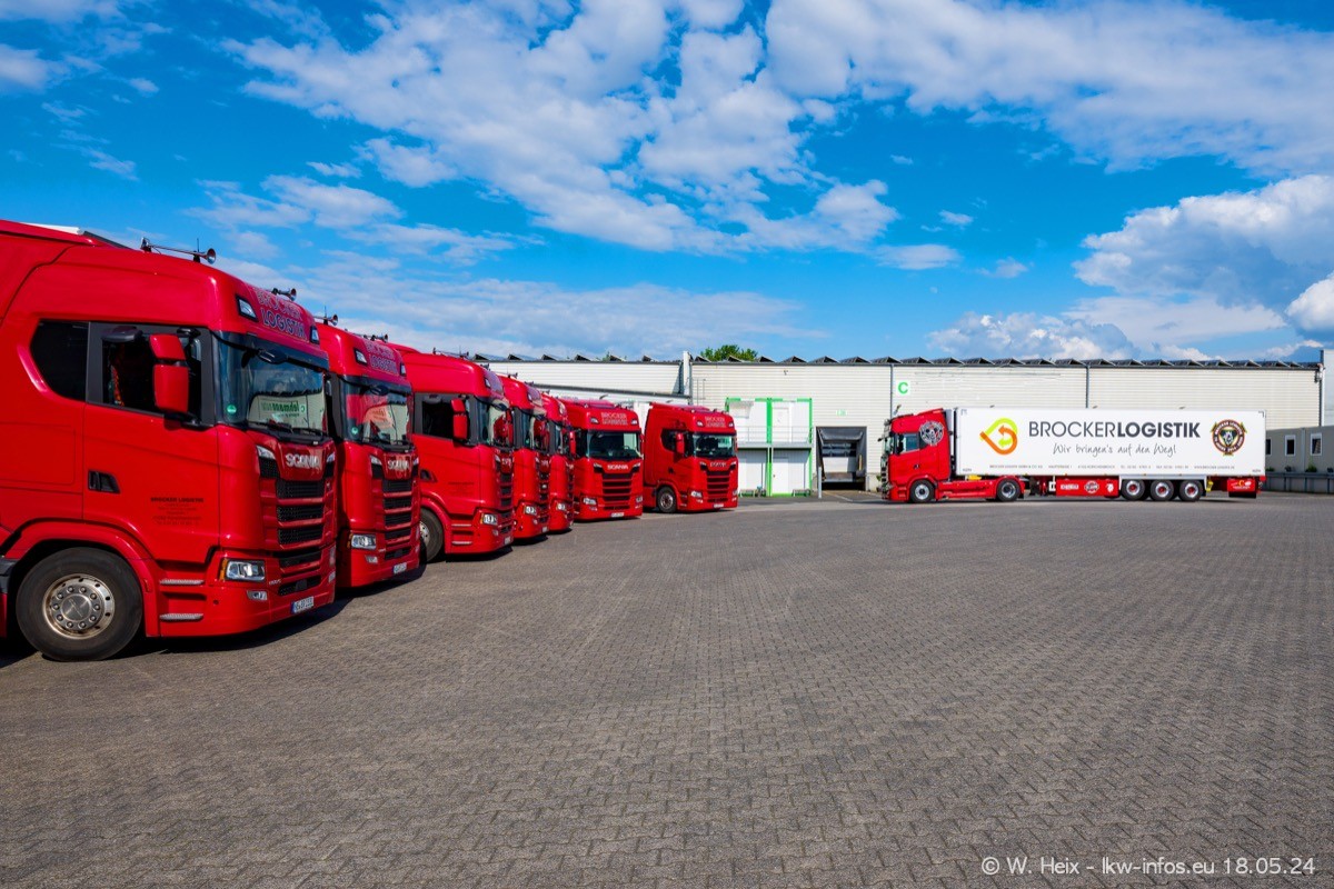 Nach über fünf Jahren war ich wieder bei Brocker Logistik in Korschenbroich. Diesmal wurde ich zu einem kleinen Fotoshooting eingeladen. Am späten Samstag Nachmittag war fast der komplette Fuhrpark zuhause. Das sind aktuell 38 LKW. Zwei fehlten. Zum 10-jährigen Firmenjubiläum wurde im März ein SCANIA 660 S V8 NextGen gekauft. Dieser ist etwas aufwändiger gestaltet als der restliche Fuhrpark, der sich aber auch sehen lassen kann. Auf dem weitläufigen Gelände gab es genug schöne Plätze für dieses kleine Fotoshooting.