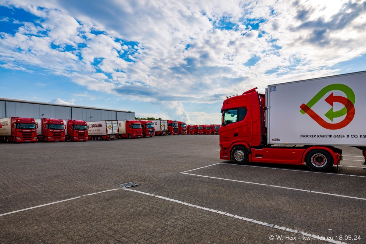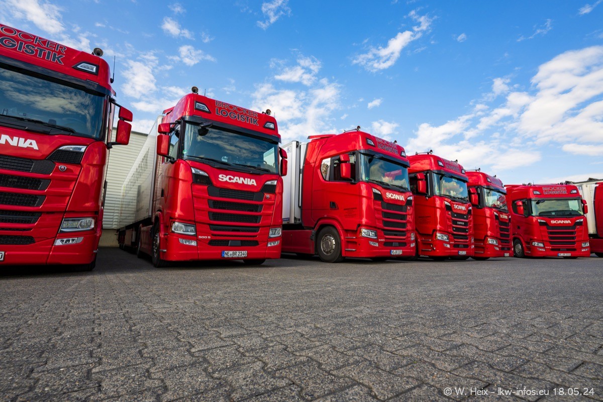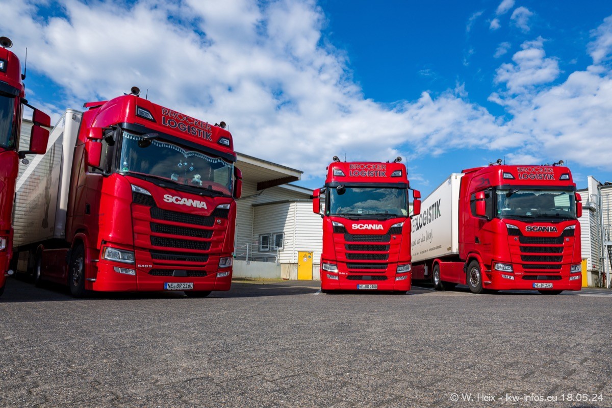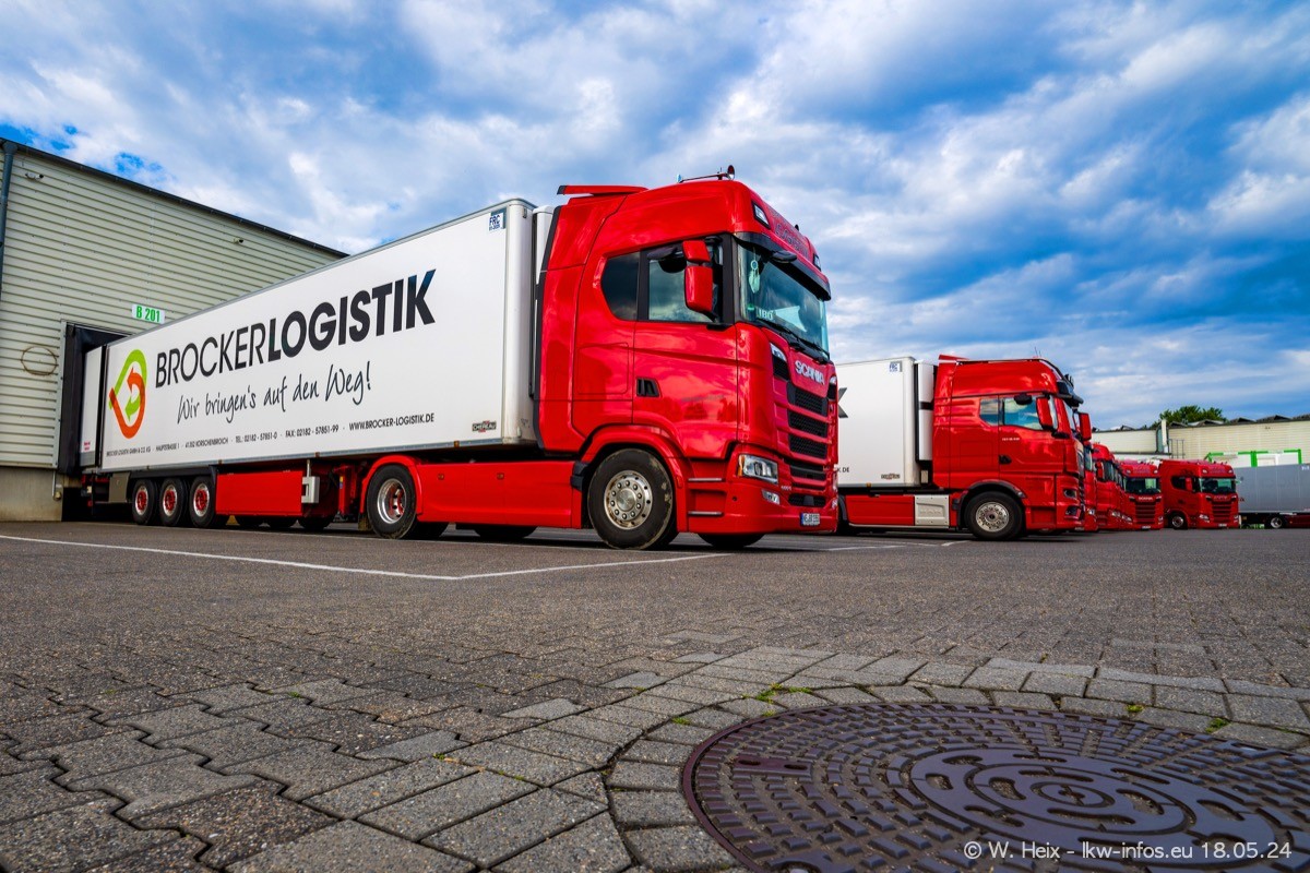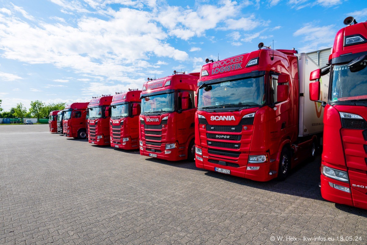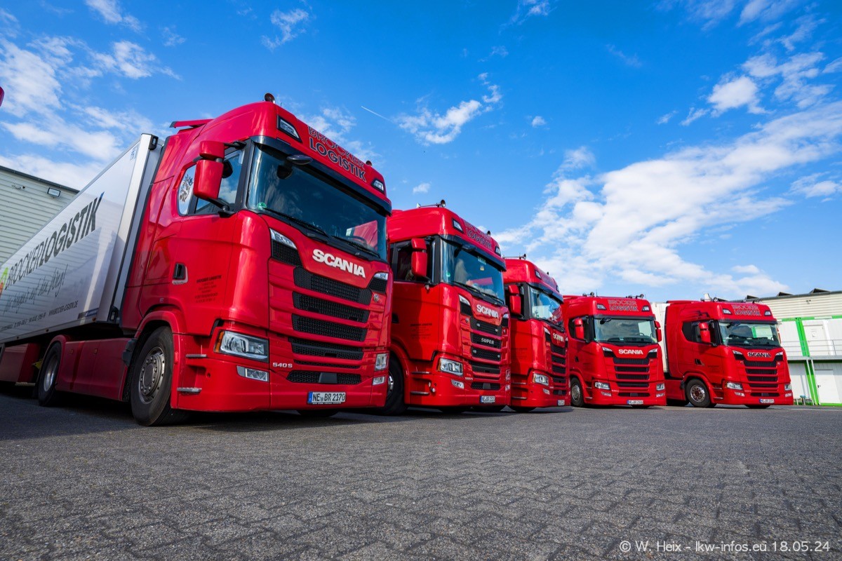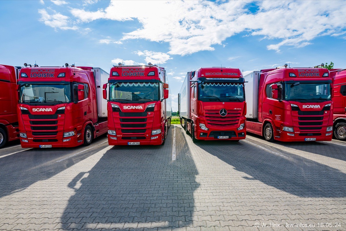 Nach über fünf Jahren war ich wieder bei Brocker Logistik in Korschenbroich. Diesmal wurde ich zu einem kleinen Fotoshooting eingeladen. Am späten Samstag Nachmittag war fast der komplette Fuhrpark zuhause. Das sind aktuell 38 LKW. Zwei fehlten. Zum 10-jährigen Firmenjubiläum wurde im März ein SCANIA 660 S V8 NextGen gekauft. Dieser ist etwas aufwändiger gestaltet als der restliche Fuhrpark, der sich aber auch sehen lassen kann. Auf dem weitläufigen Gelände gab es genug schöne Plätze für dieses kleine Fotoshooting.