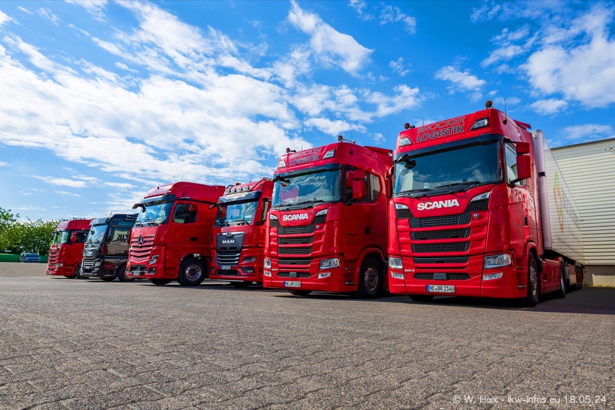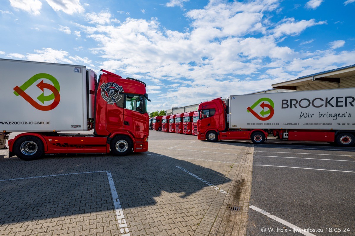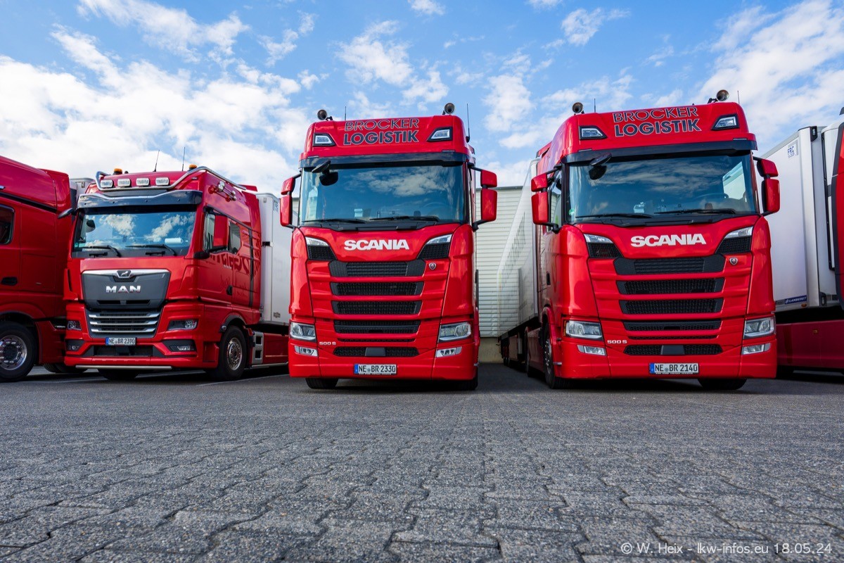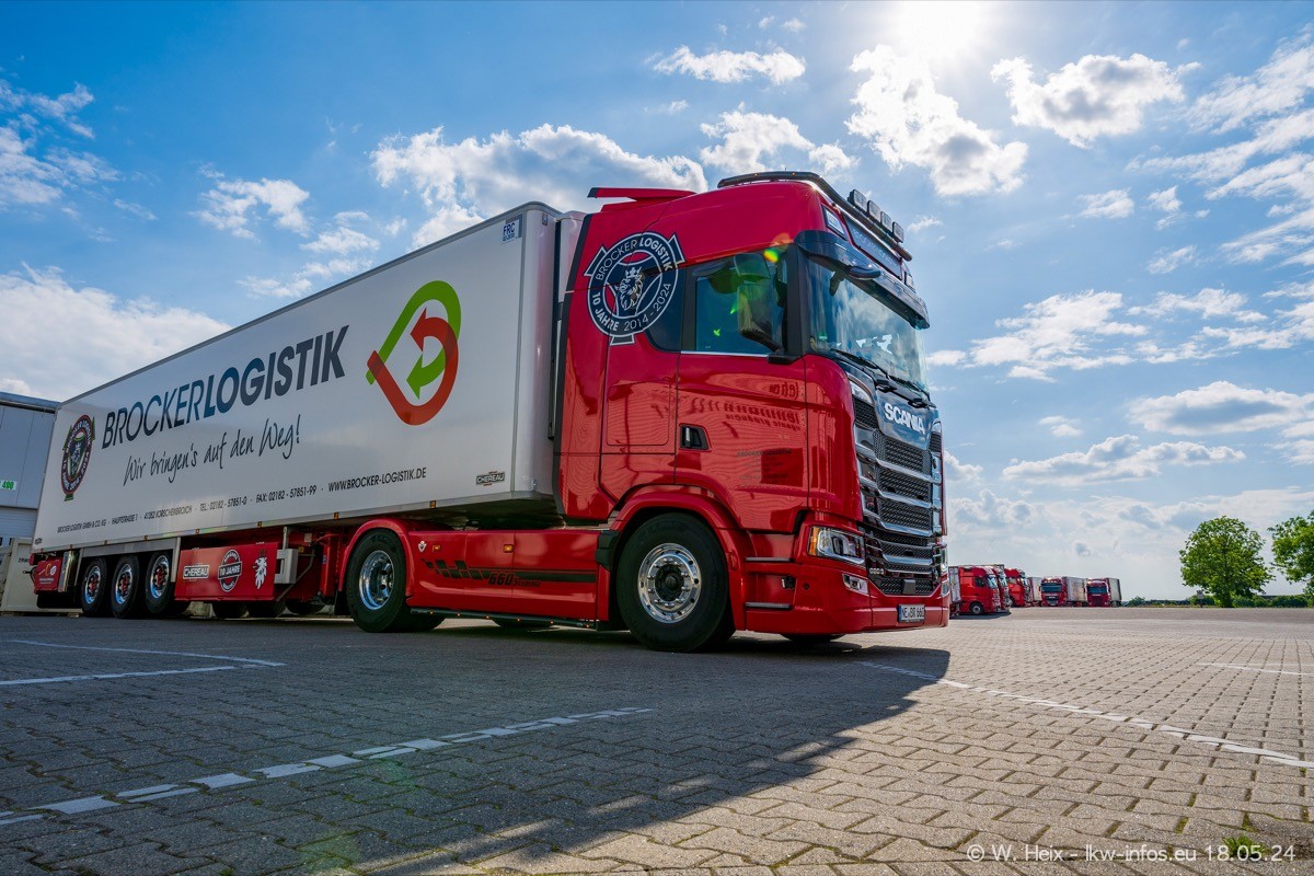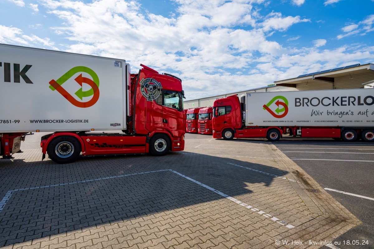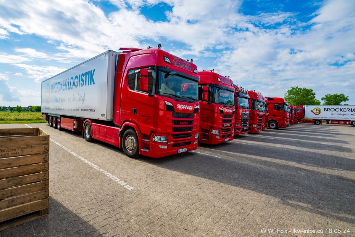 Nach über fünf Jahren war ich wieder bei Brocker Logistik in Korschenbroich. Diesmal wurde ich zu einem kleinen Fotoshooting eingeladen. Am späten Samstag Nachmittag war fast der komplette Fuhrpark zuhause. Das sind aktuell 38 LKW. Zwei fehlten. Zum 10-jährigen Firmenjubiläum wurde im März ein SCANIA 660 S V8 NextGen gekauft. Dieser ist etwas aufwändiger gestaltet als der restliche Fuhrpark, der sich aber auch sehen lassen kann. Auf dem weitläufigen Gelände gab es genug schöne Plätze für dieses kleine Fotoshooting.