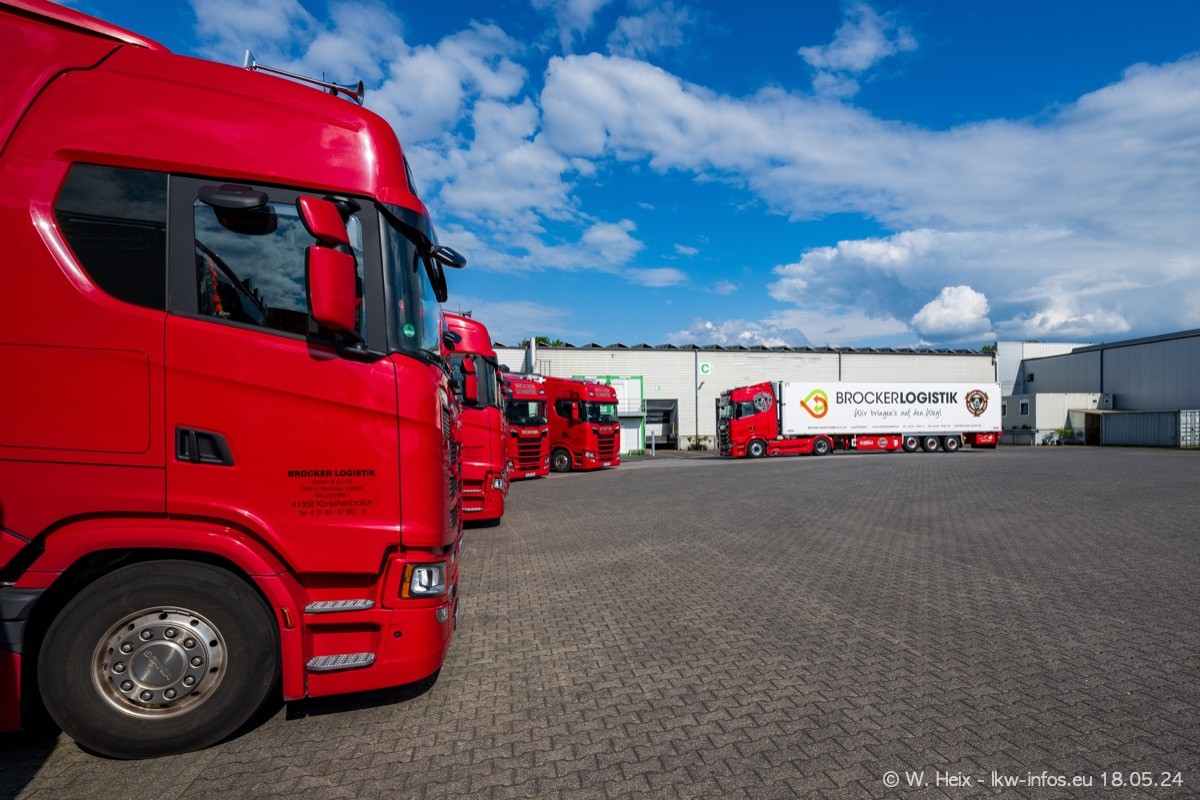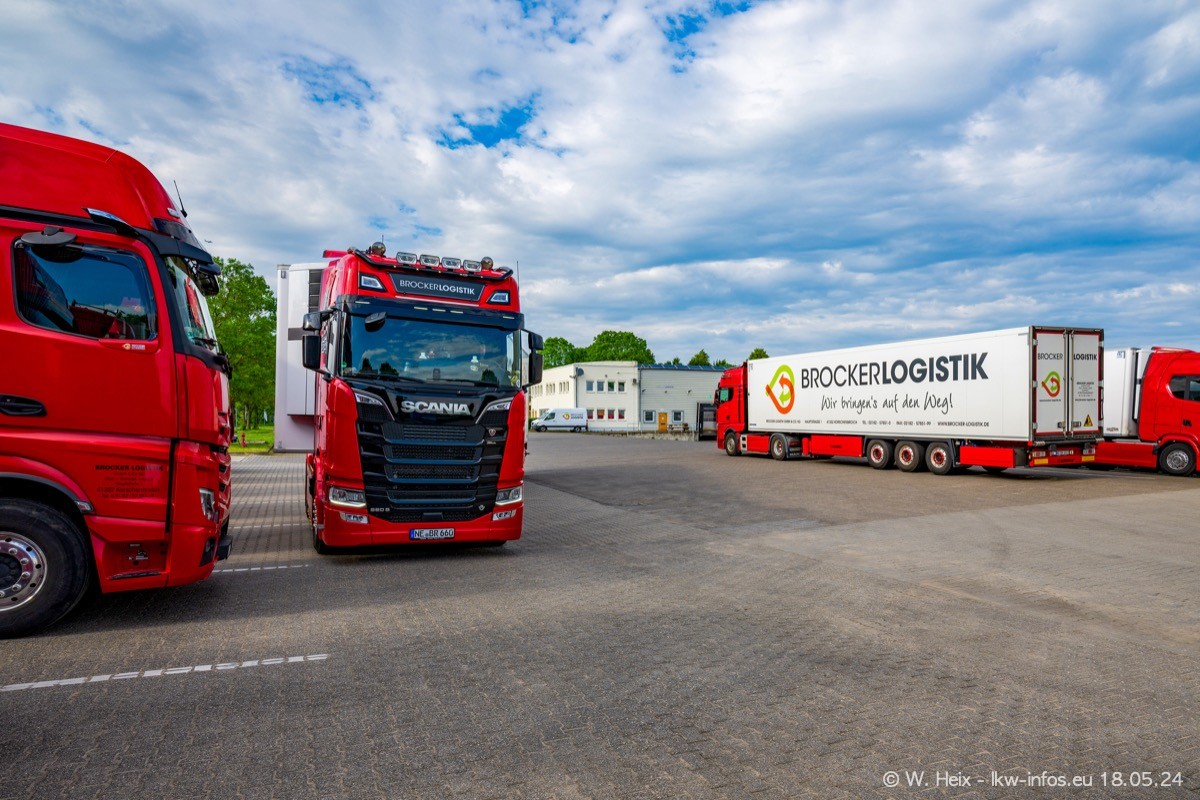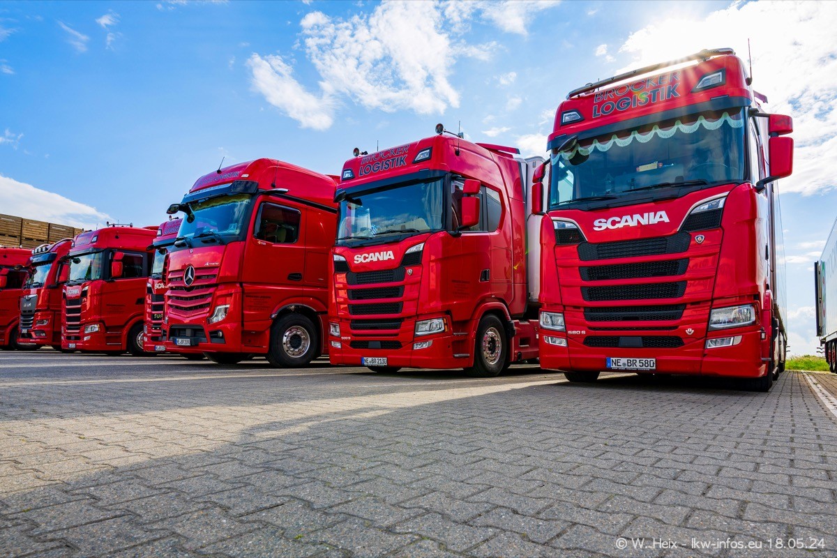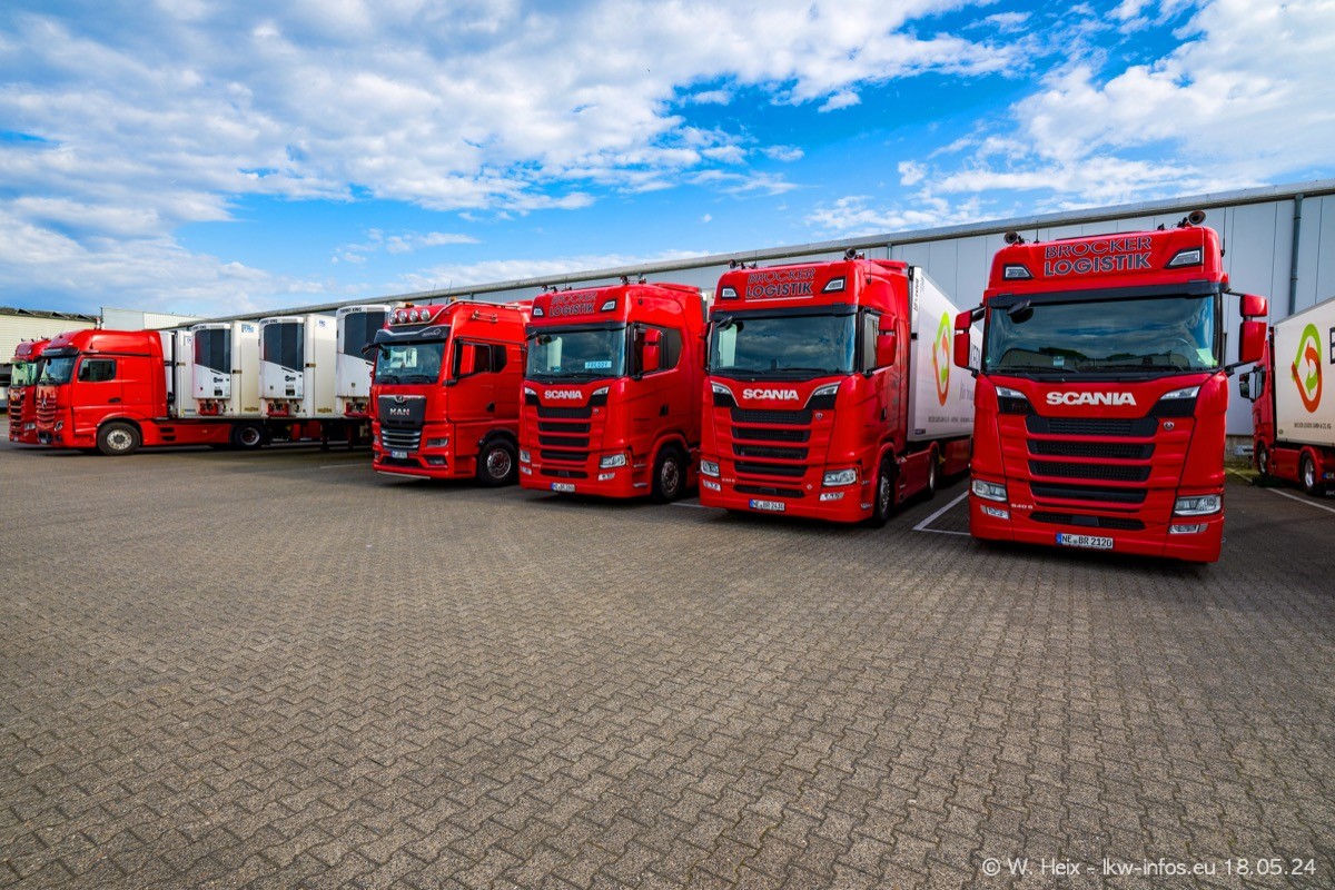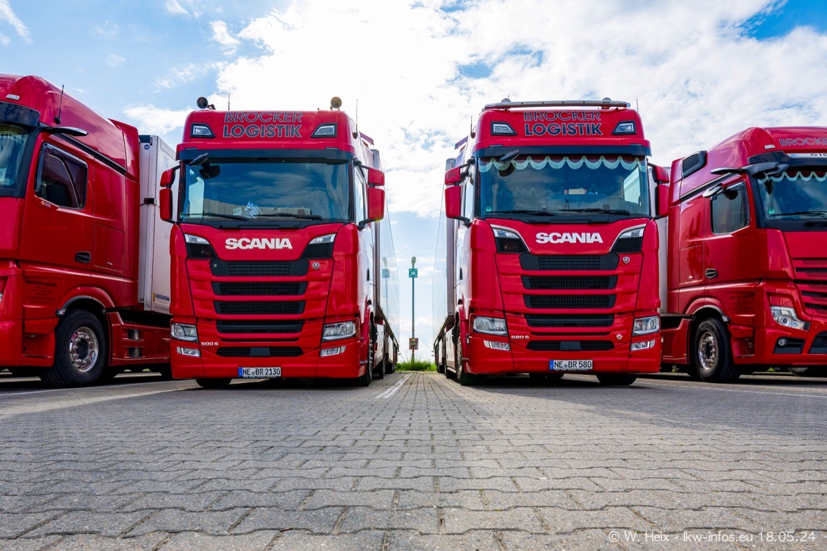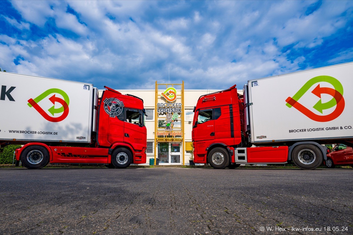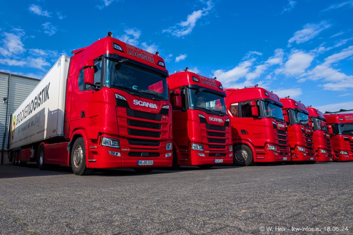 Nach über fünf Jahren war ich wieder bei Brocker Logistik in Korschenbroich. Diesmal wurde ich zu einem kleinen Fotoshooting eingeladen. Am späten Samstag Nachmittag war fast der komplette Fuhrpark zuhause. Das sind aktuell 38 LKW. Zwei fehlten. Zum 10-jährigen Firmenjubiläum wurde im März ein SCANIA 660 S V8 NextGen gekauft. Dieser ist etwas aufwändiger gestaltet als der restliche Fuhrpark, der sich aber auch sehen lassen kann. Auf dem weitläufigen Gelände gab es genug schöne Plätze für dieses kleine Fotoshooting.