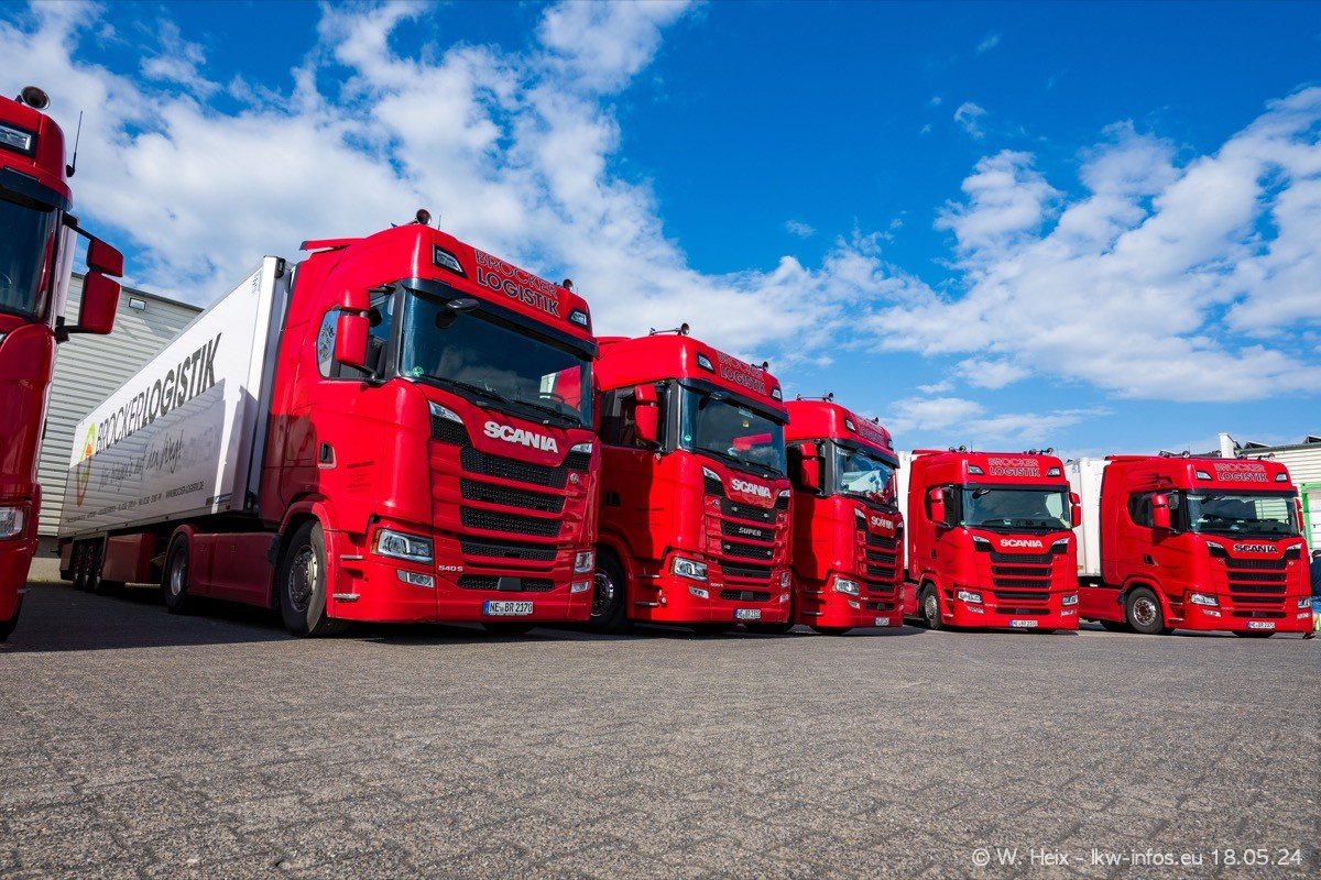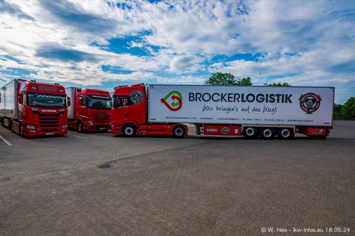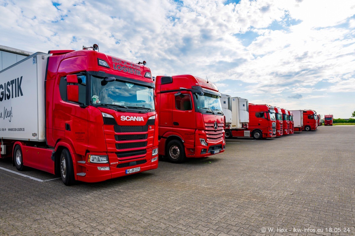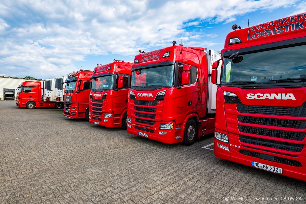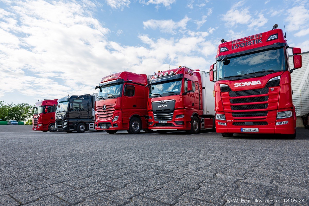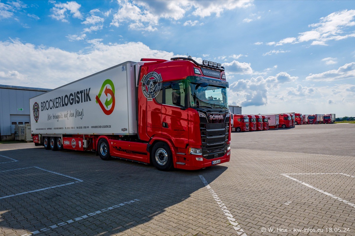 Nach über fünf Jahren war ich wieder bei Brocker Logistik in Korschenbroich. Diesmal wurde ich zu einem kleinen Fotoshooting eingeladen. Am späten Samstag Nachmittag war fast der komplette Fuhrpark zuhause. Das sind aktuell 38 LKW. Zwei fehlten. Zum 10-jährigen Firmenjubiläum wurde im März ein SCANIA 660 S V8 NextGen gekauft. Dieser ist etwas aufwändiger gestaltet als der restliche Fuhrpark, der sich aber auch sehen lassen kann. Auf dem weitläufigen Gelände gab es genug schöne Plätze für dieses kleine Fotoshooting.