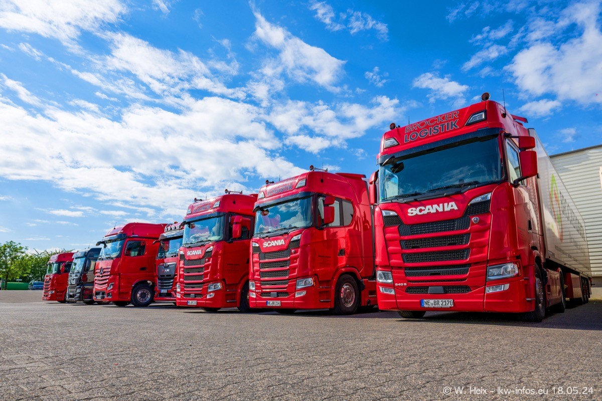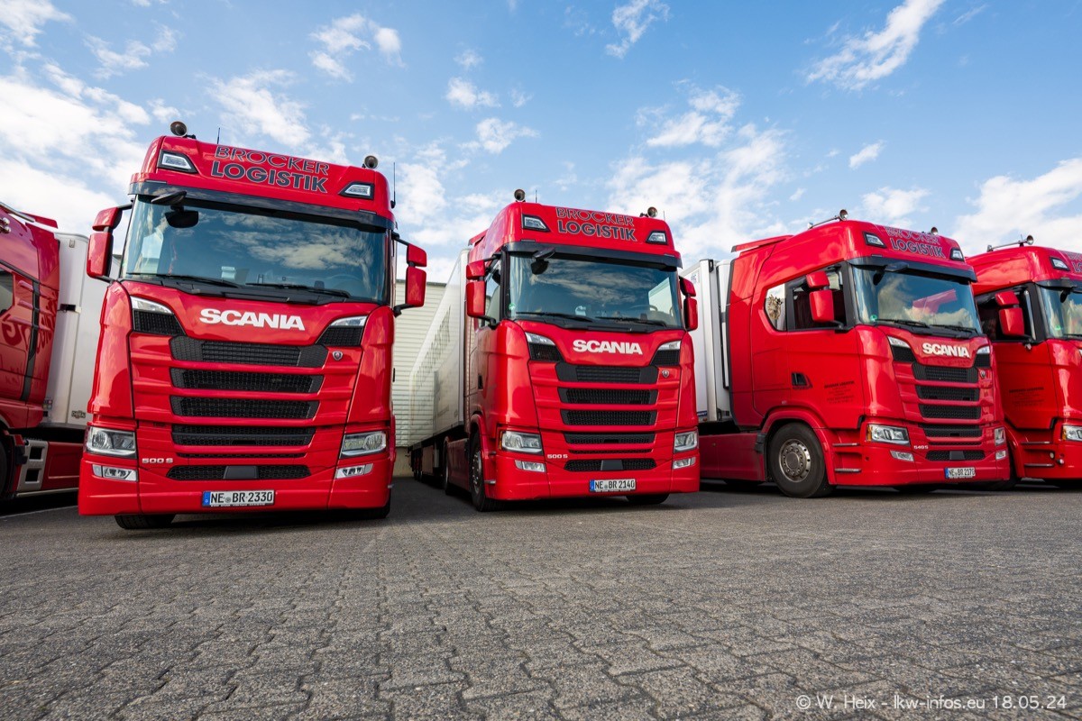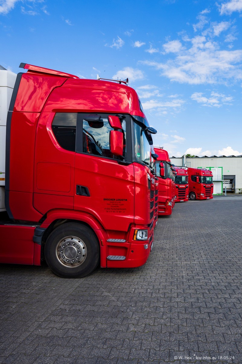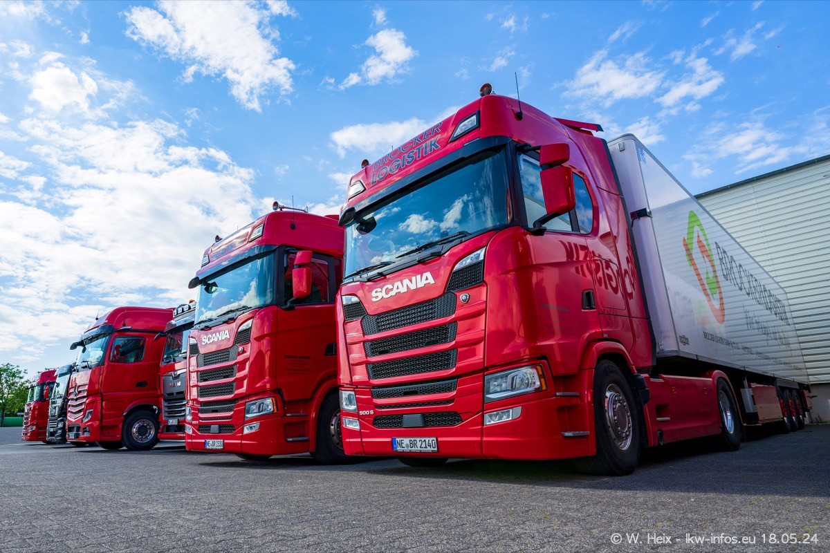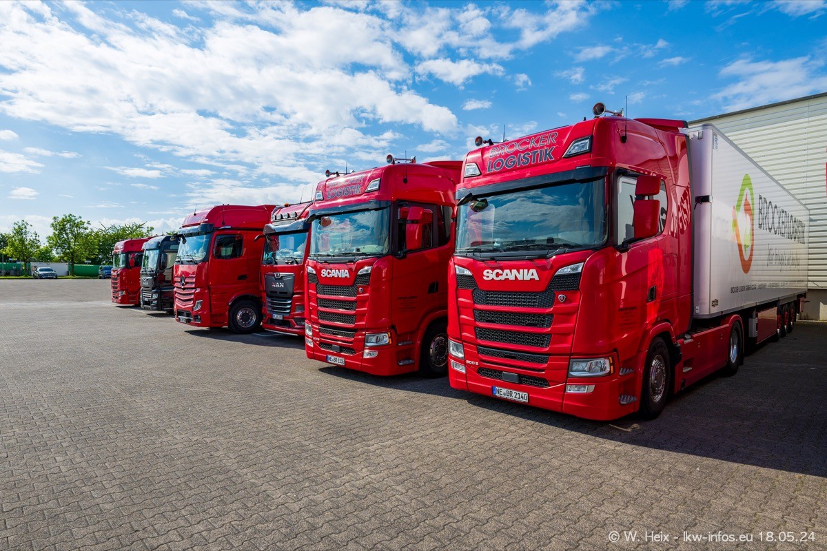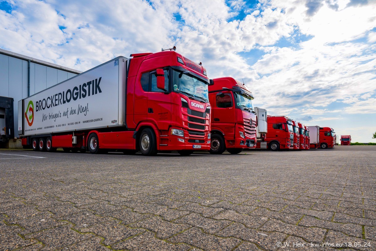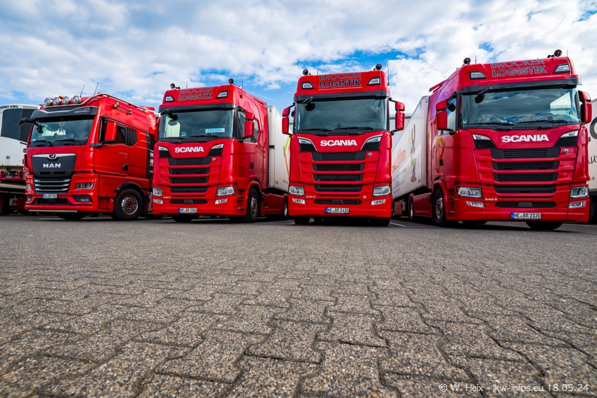 Nach über fünf Jahren war ich wieder bei Brocker Logistik in Korschenbroich. Diesmal wurde ich zu einem kleinen Fotoshooting eingeladen. Am späten Samstag Nachmittag war fast der komplette Fuhrpark zuhause. Das sind aktuell 38 LKW. Zwei fehlten. Zum 10-jährigen Firmenjubiläum wurde im März ein SCANIA 660 S V8 NextGen gekauft. Dieser ist etwas aufwändiger gestaltet als der restliche Fuhrpark, der sich aber auch sehen lassen kann. Auf dem weitläufigen Gelände gab es genug schöne Plätze für dieses kleine Fotoshooting.