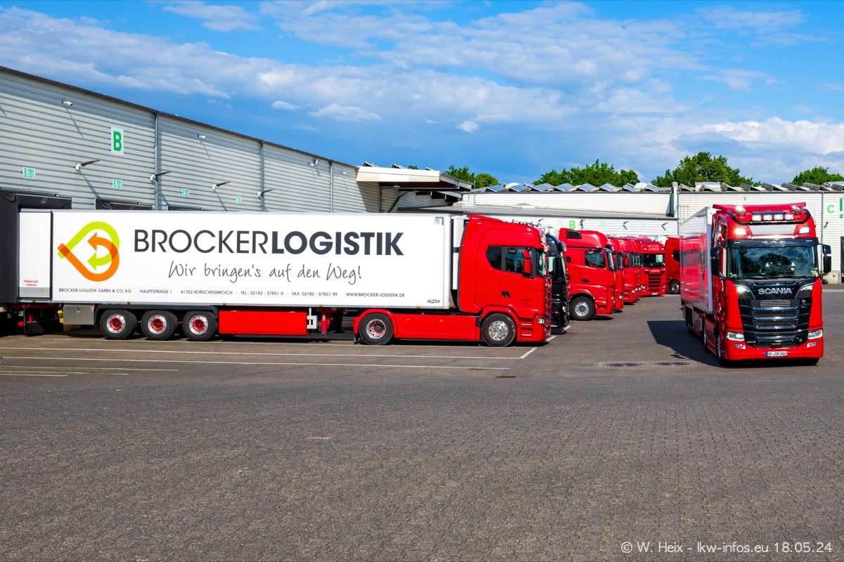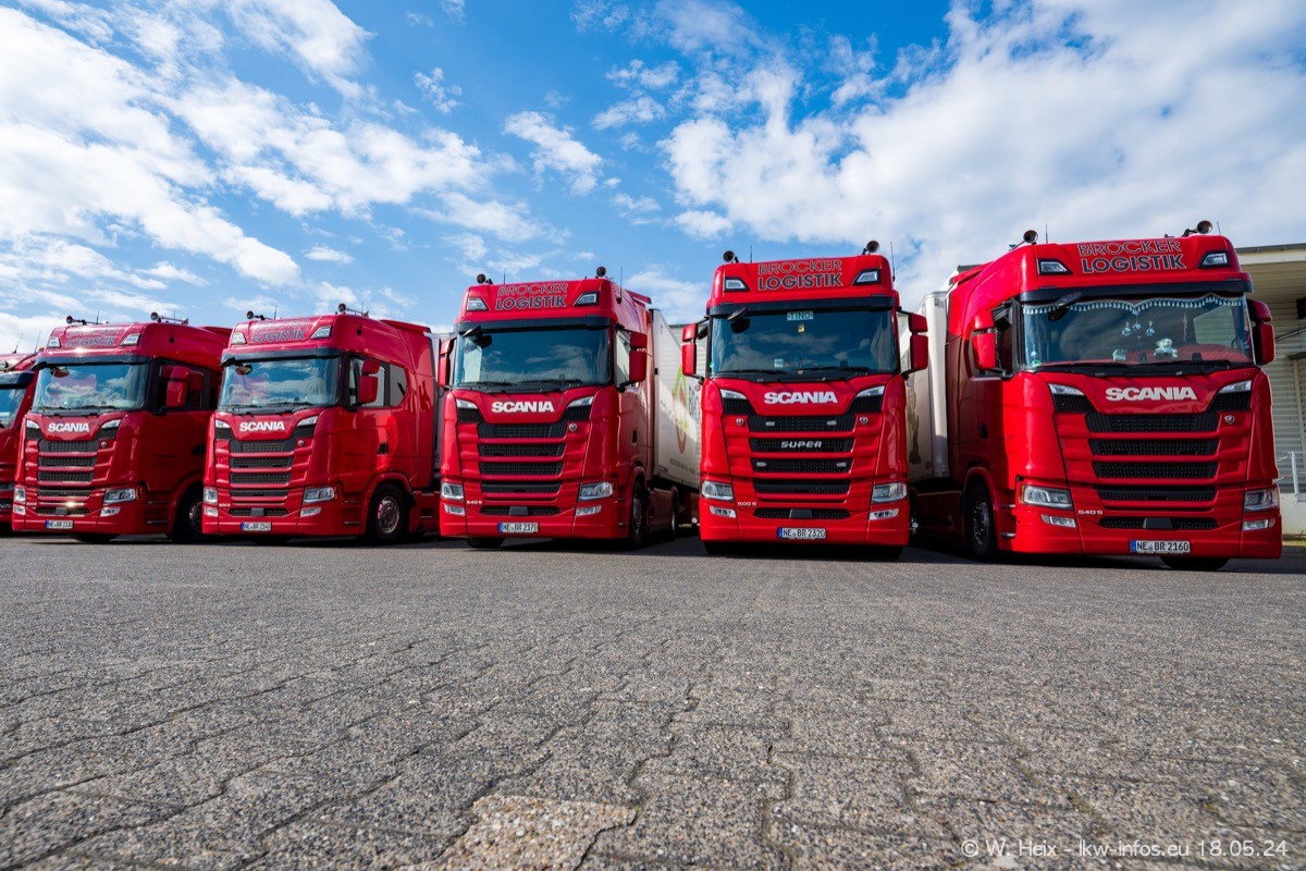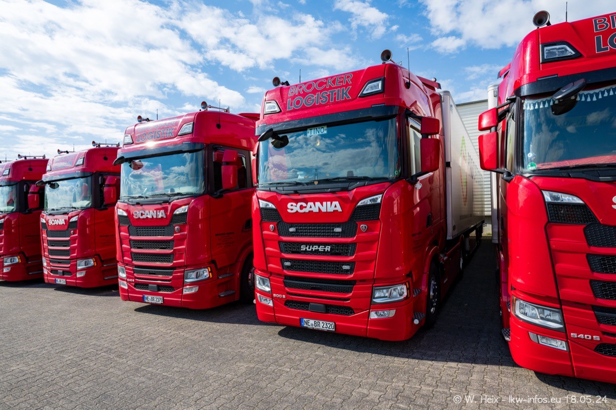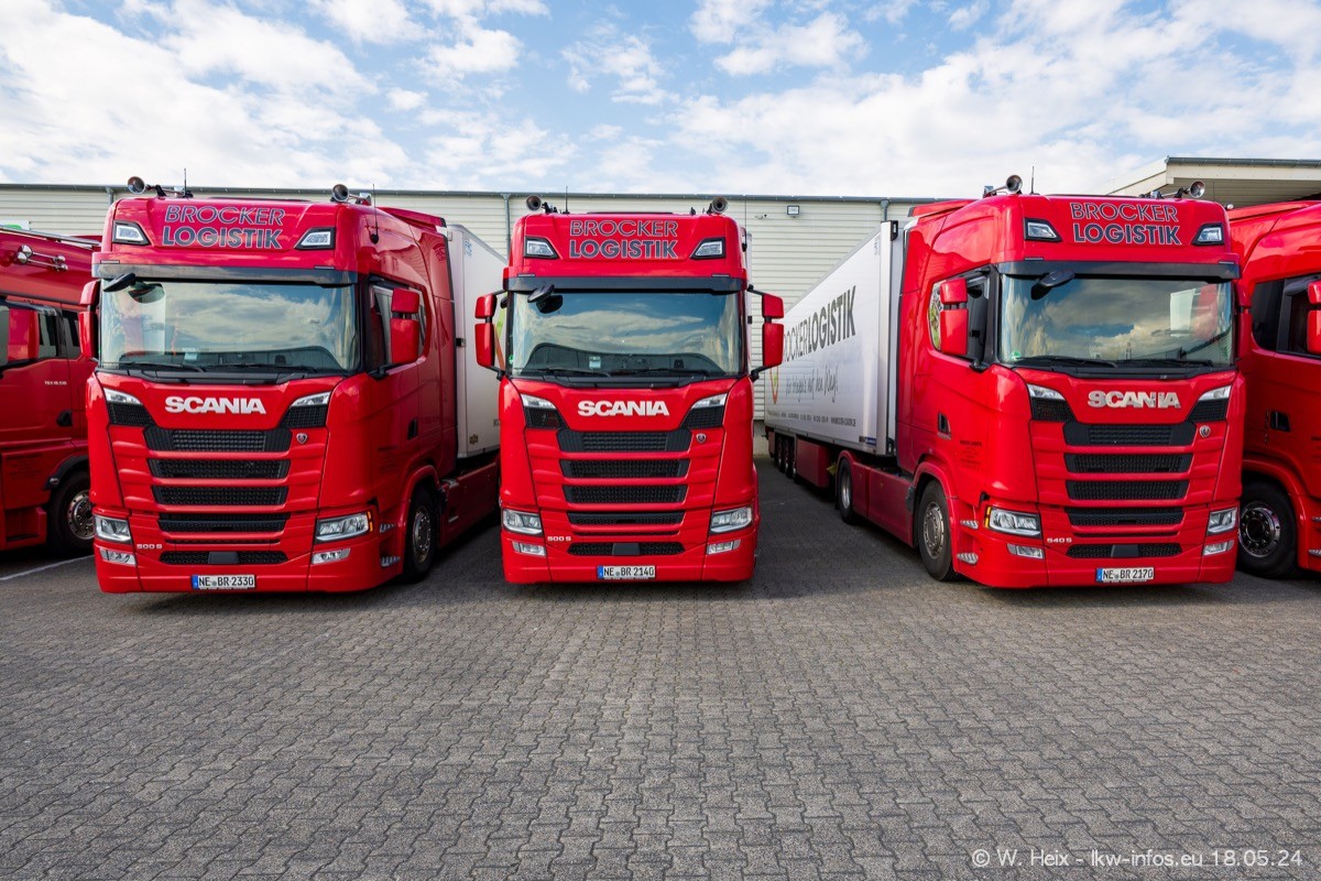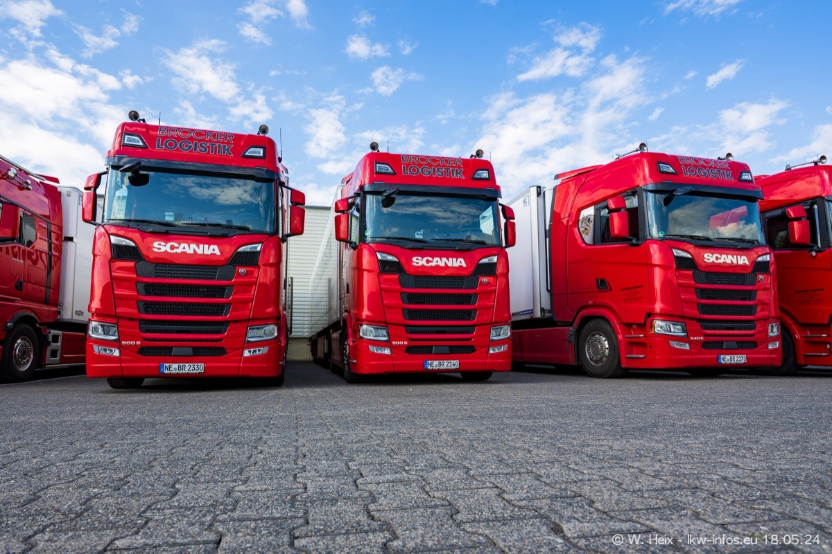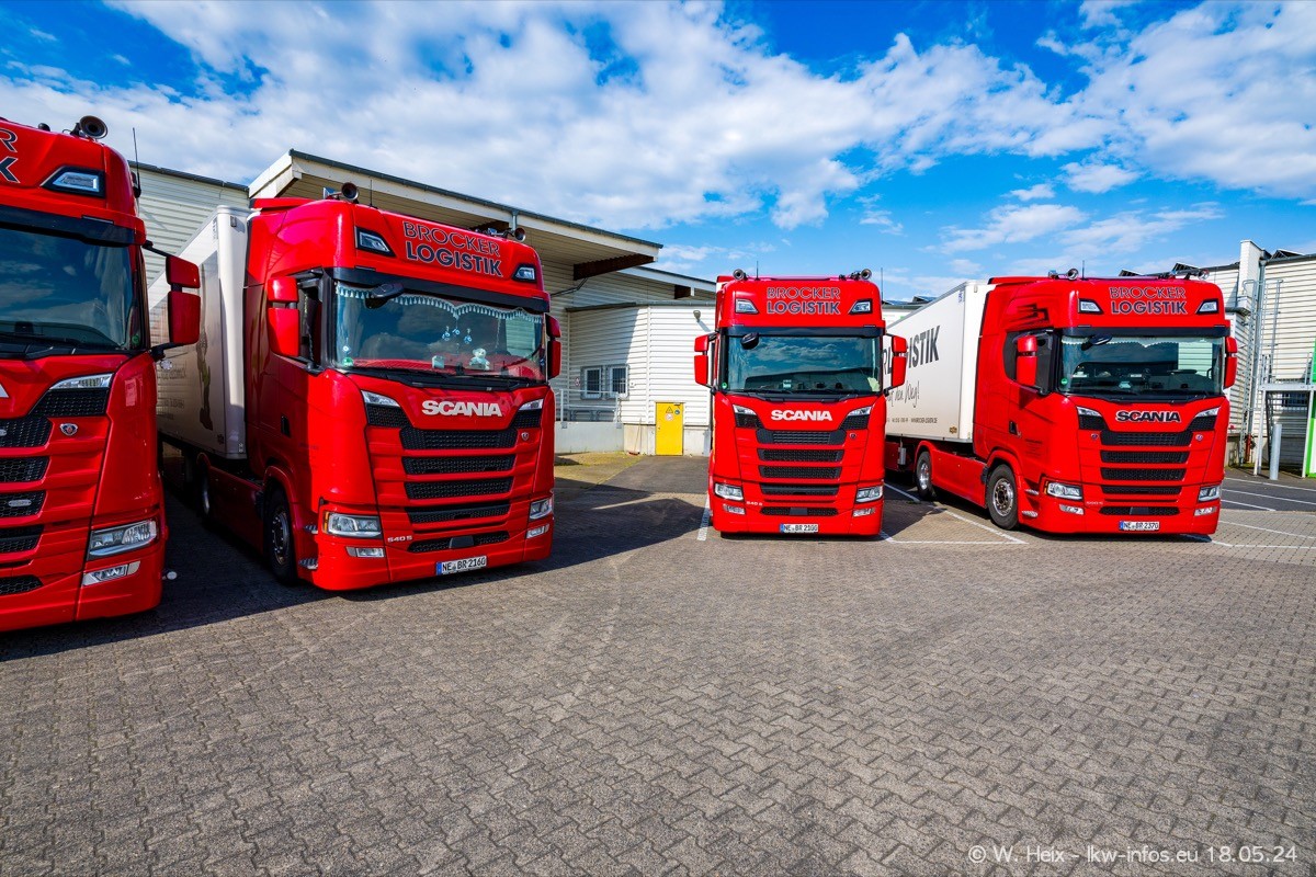 Nach über fünf Jahren war ich wieder bei Brocker Logistik in Korschenbroich. Diesmal wurde ich zu einem kleinen Fotoshooting eingeladen. Am späten Samstag Nachmittag war fast der komplette Fuhrpark zuhause. Das sind aktuell 38 LKW. Zwei fehlten. Zum 10-jährigen Firmenjubiläum wurde im März ein SCANIA 660 S V8 NextGen gekauft. Dieser ist etwas aufwändiger gestaltet als der restliche Fuhrpark, der sich aber auch sehen lassen kann. Auf dem weitläufigen Gelände gab es genug schöne Plätze für dieses kleine Fotoshooting.