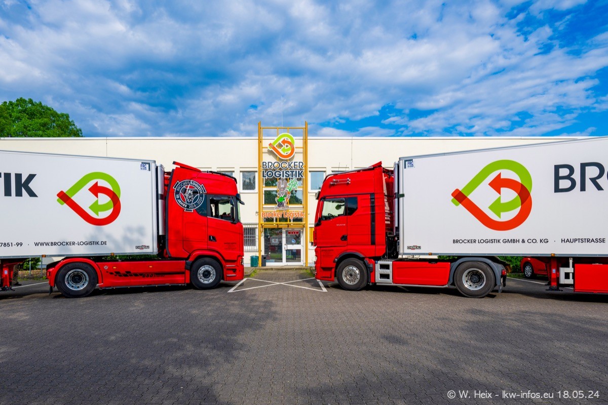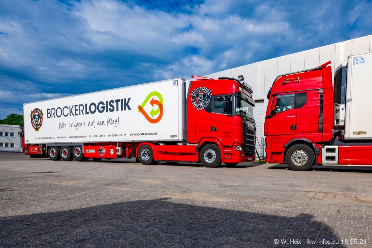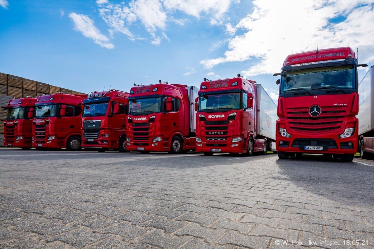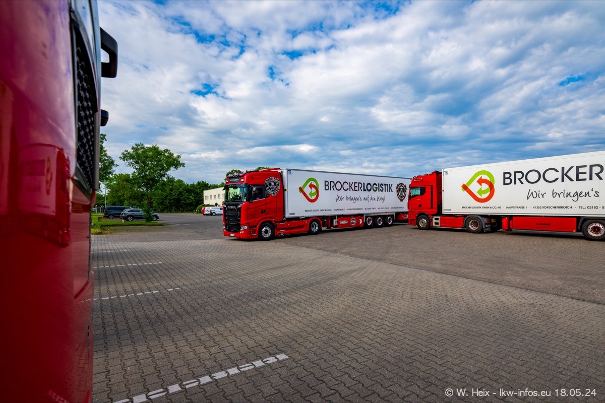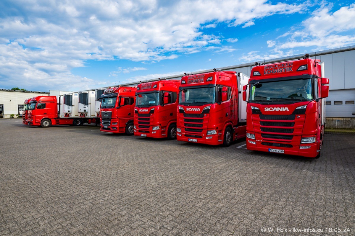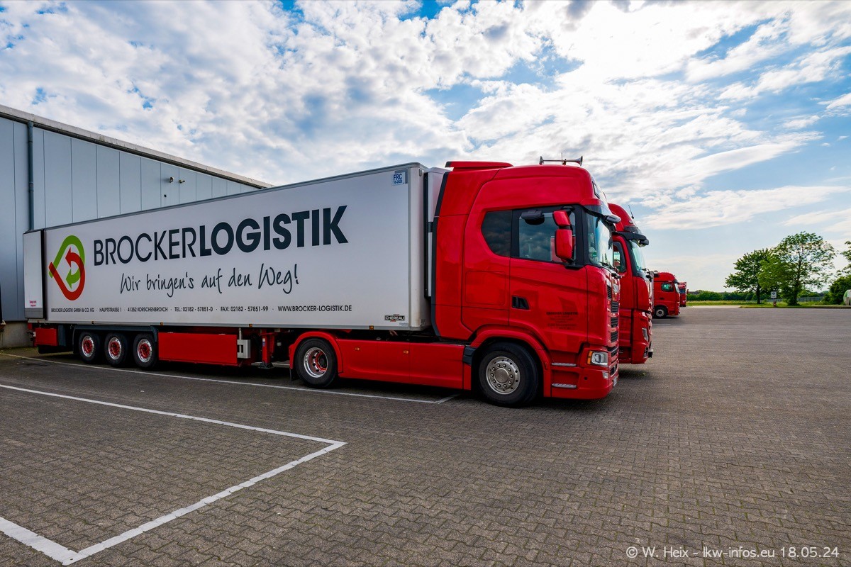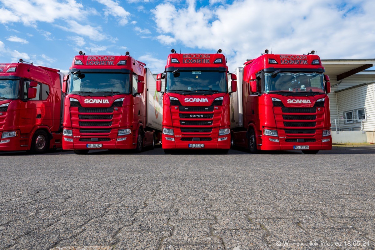 Nach über fünf Jahren war ich wieder bei Brocker Logistik in Korschenbroich. Diesmal wurde ich zu einem kleinen Fotoshooting eingeladen. Am späten Samstag Nachmittag war fast der komplette Fuhrpark zuhause. Das sind aktuell 38 LKW. Zwei fehlten. Zum 10-jährigen Firmenjubiläum wurde im März ein SCANIA 660 S V8 NextGen gekauft. Dieser ist etwas aufwändiger gestaltet als der restliche Fuhrpark, der sich aber auch sehen lassen kann. Auf dem weitläufigen Gelände gab es genug schöne Plätze für dieses kleine Fotoshooting.