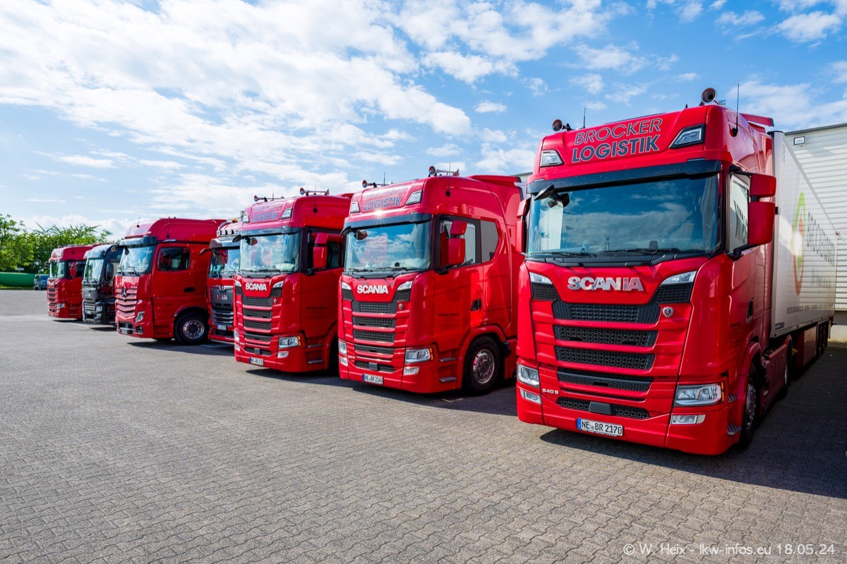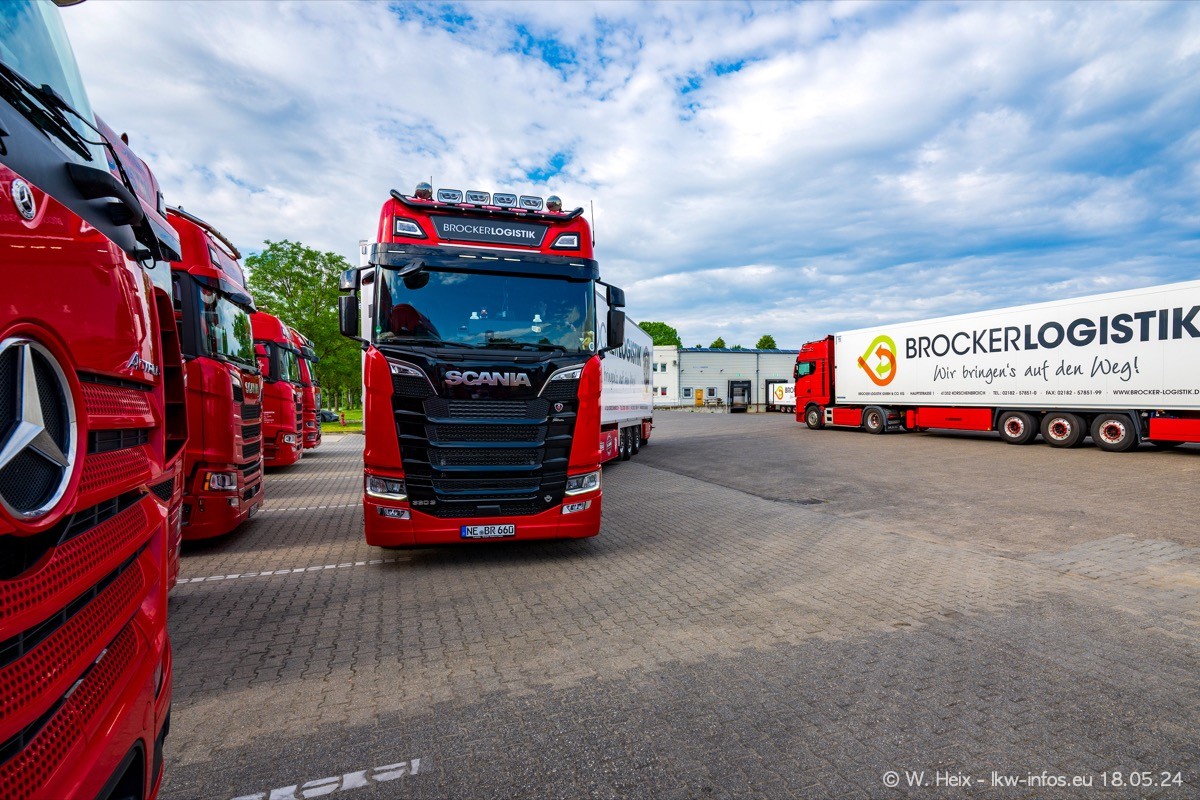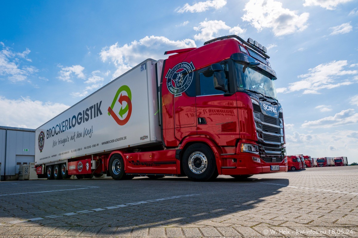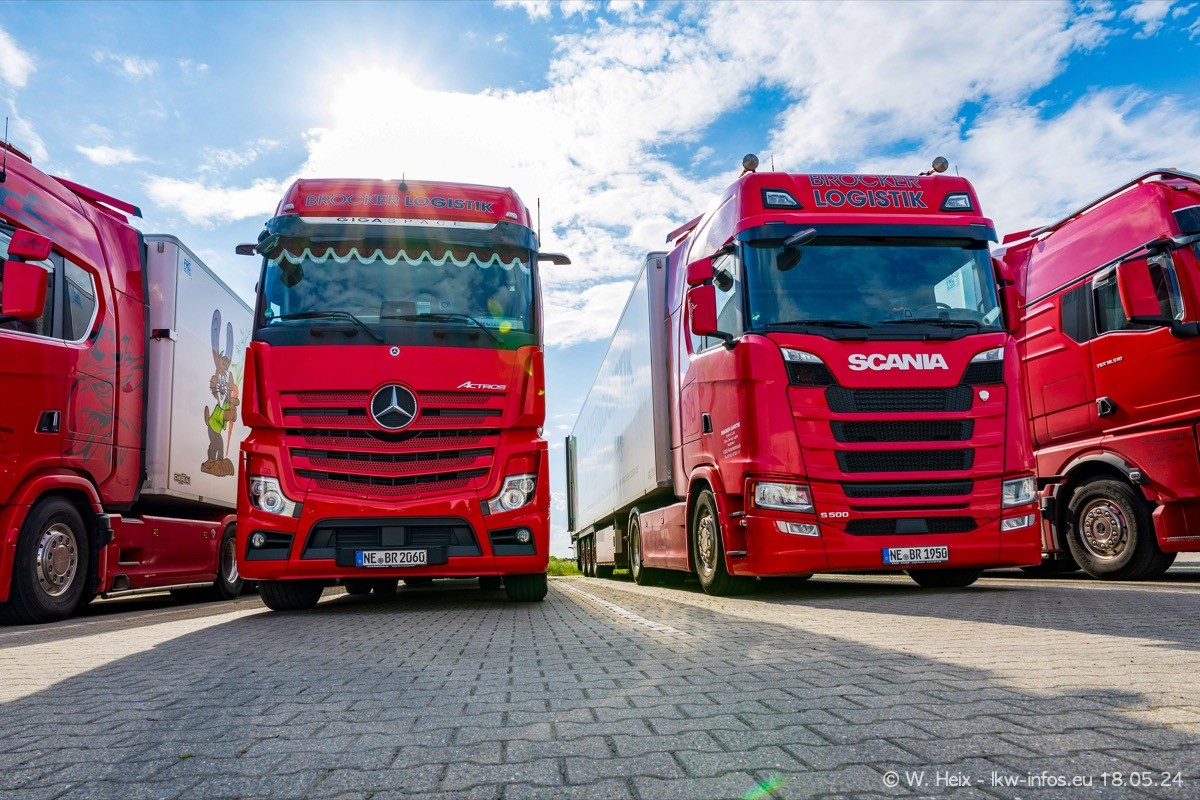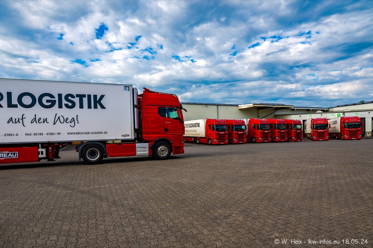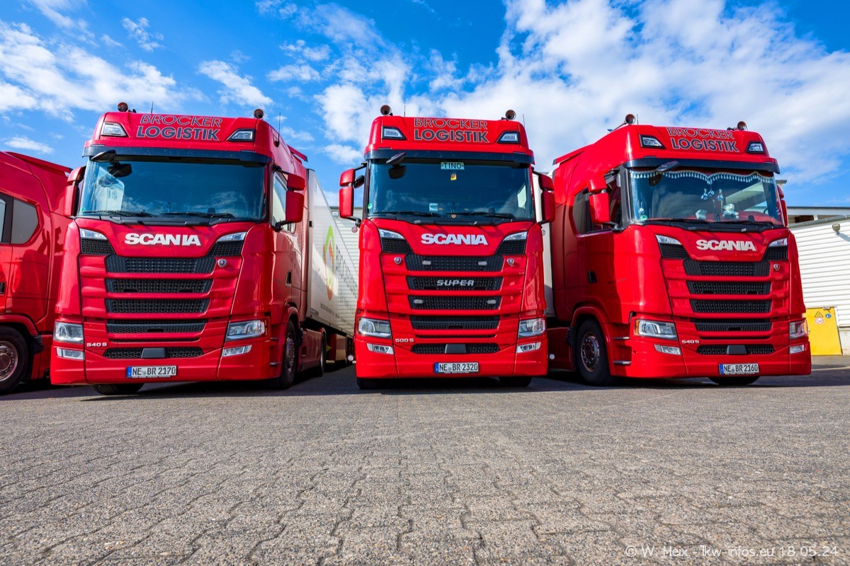 Nach über fünf Jahren war ich wieder bei Brocker Logistik in Korschenbroich. Diesmal wurde ich zu einem kleinen Fotoshooting eingeladen. Am späten Samstag Nachmittag war fast der komplette Fuhrpark zuhause. Das sind aktuell 38 LKW. Zwei fehlten. Zum 10-jährigen Firmenjubiläum wurde im März ein SCANIA 660 S V8 NextGen gekauft. Dieser ist etwas aufwändiger gestaltet als der restliche Fuhrpark, der sich aber auch sehen lassen kann. Auf dem weitläufigen Gelände gab es genug schöne Plätze für dieses kleine Fotoshooting.