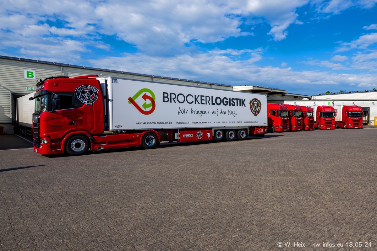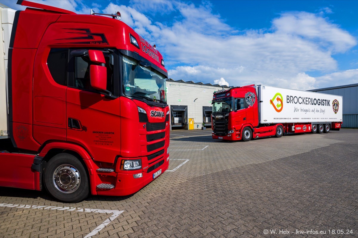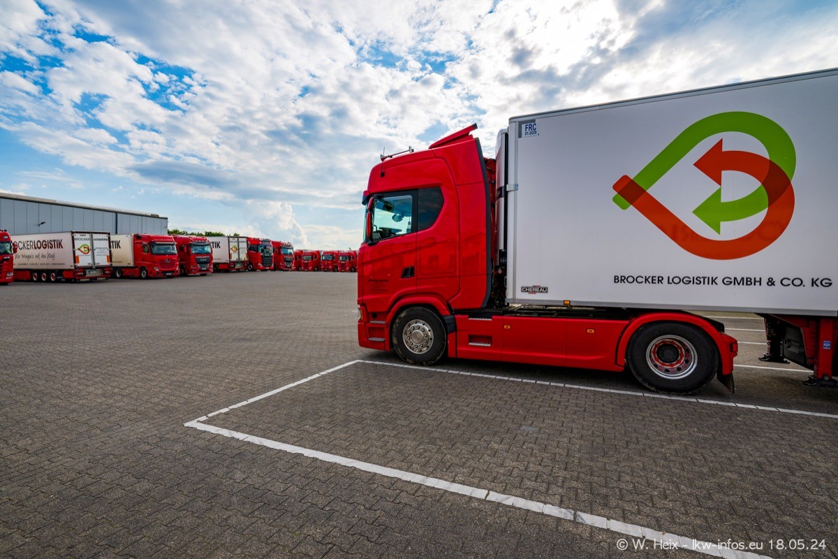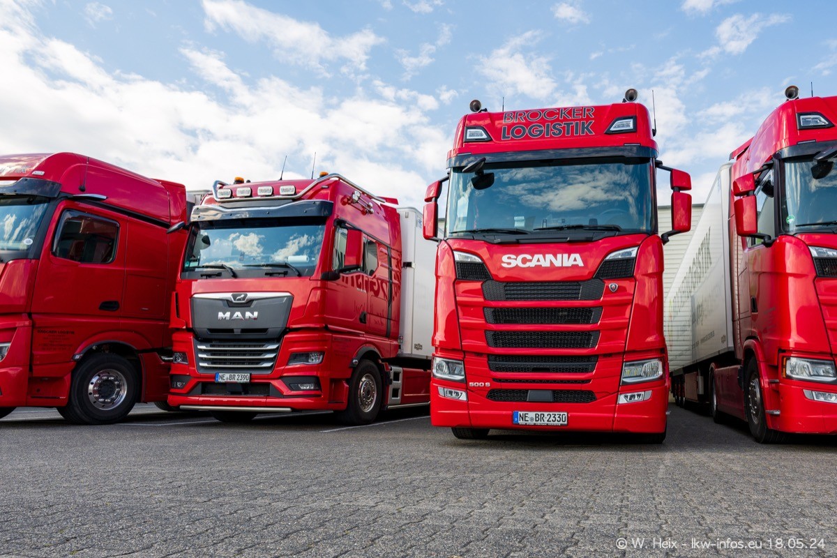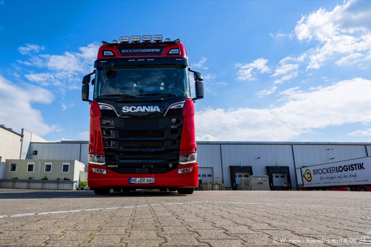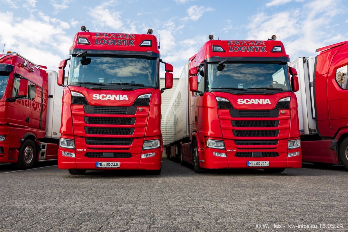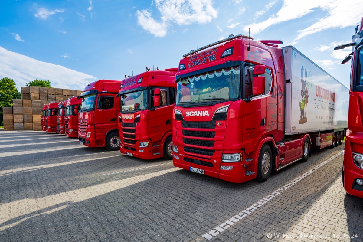 Nach über fünf Jahren war ich wieder bei Brocker Logistik in Korschenbroich. Diesmal wurde ich zu einem kleinen Fotoshooting eingeladen. Am späten Samstag Nachmittag war fast der komplette Fuhrpark zuhause. Das sind aktuell 38 LKW. Zwei fehlten. Zum 10-jährigen Firmenjubiläum wurde im März ein SCANIA 660 S V8 NextGen gekauft. Dieser ist etwas aufwändiger gestaltet als der restliche Fuhrpark, der sich aber auch sehen lassen kann. Auf dem weitläufigen Gelände gab es genug schöne Plätze für dieses kleine Fotoshooting.
