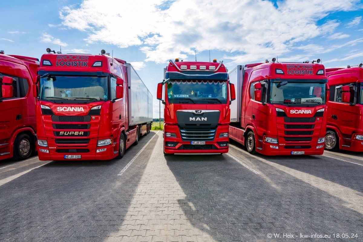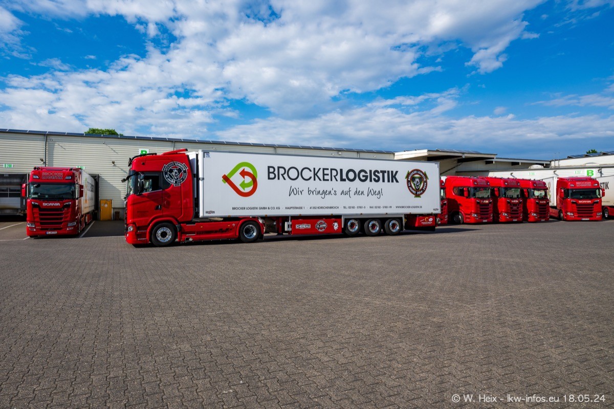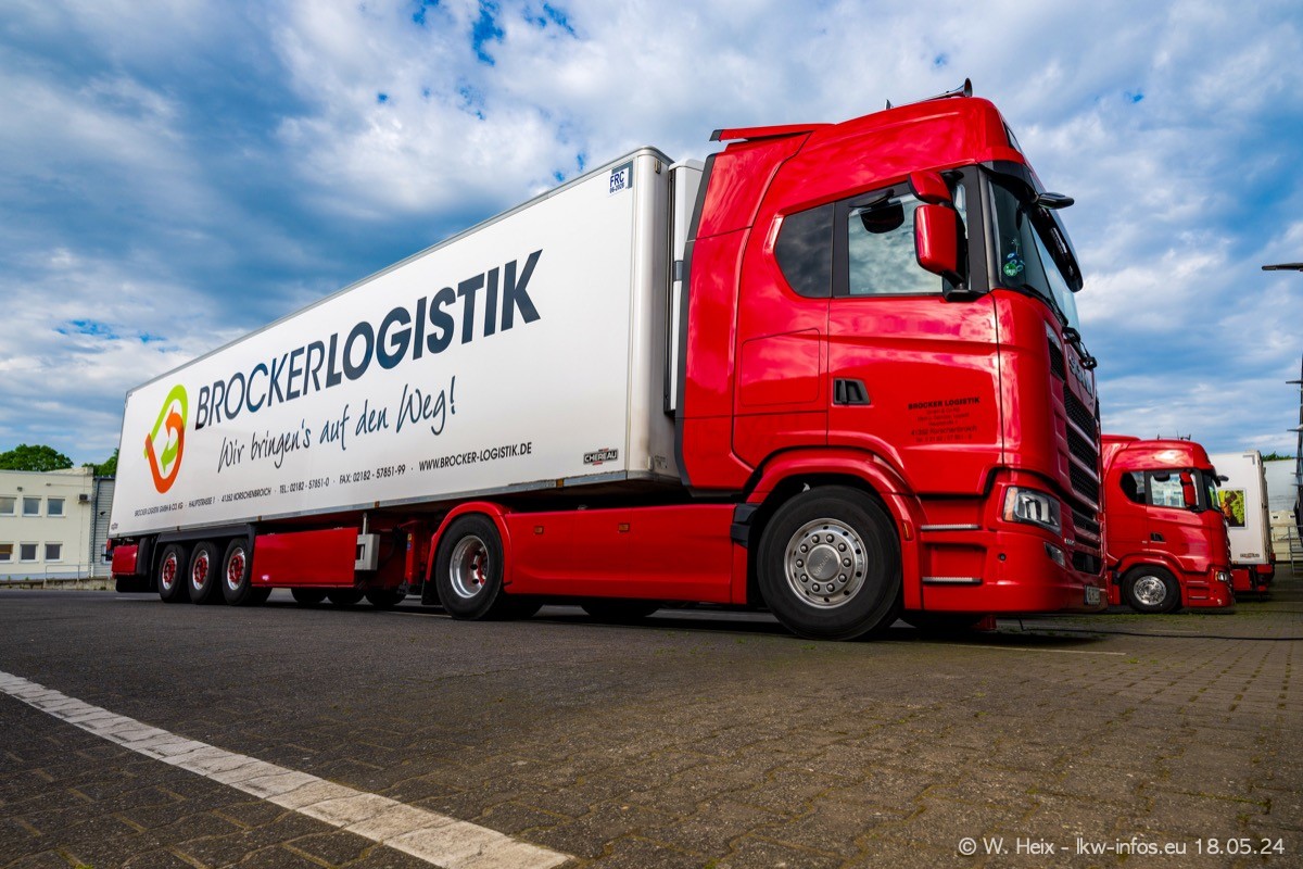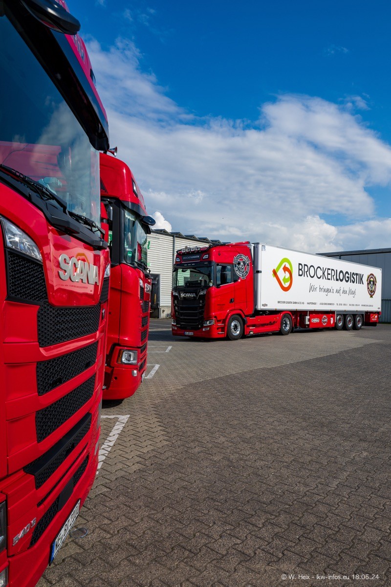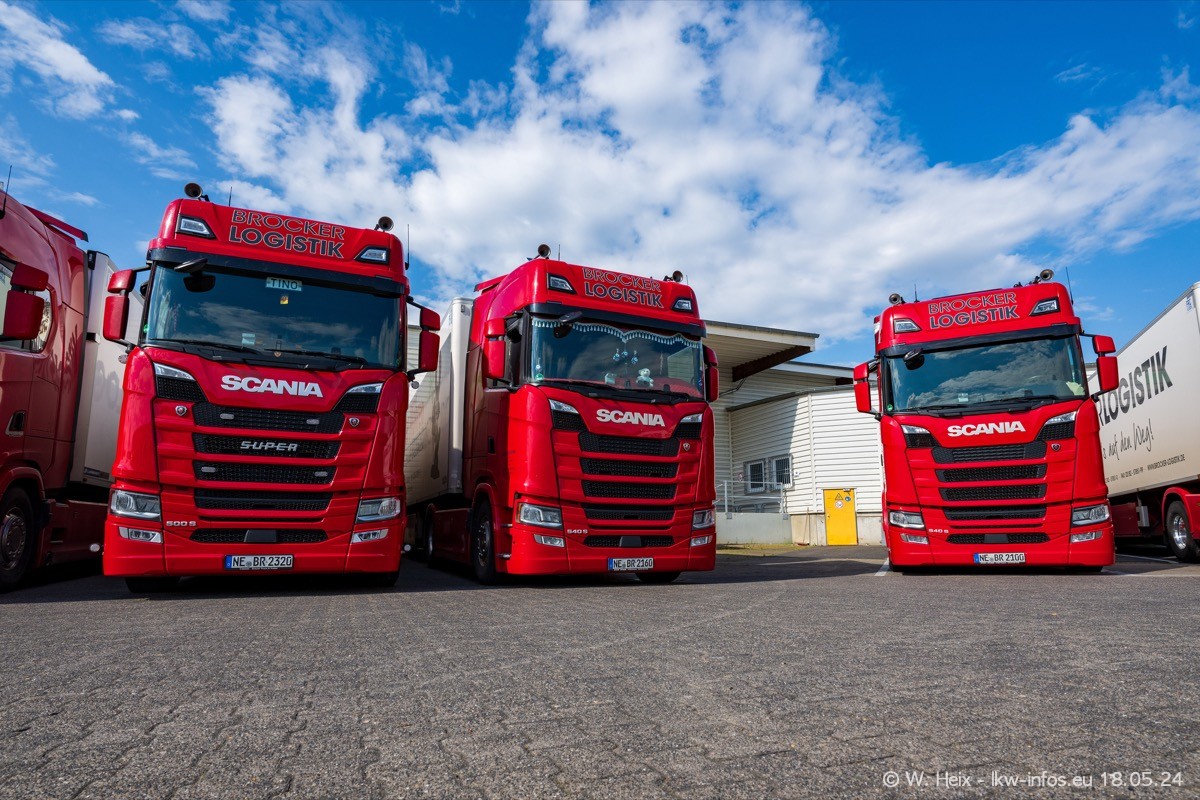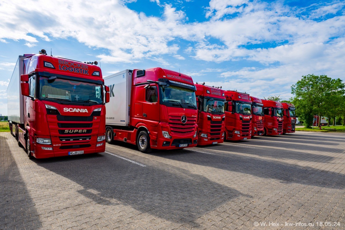 Nach über fünf Jahren war ich wieder bei Brocker Logistik in Korschenbroich. Diesmal wurde ich zu einem kleinen Fotoshooting eingeladen. Am späten Samstag Nachmittag war fast der komplette Fuhrpark zuhause. Das sind aktuell 38 LKW. Zwei fehlten. Zum 10-jährigen Firmenjubiläum wurde im März ein SCANIA 660 S V8 NextGen gekauft. Dieser ist etwas aufwändiger gestaltet als der restliche Fuhrpark, der sich aber auch sehen lassen kann. Auf dem weitläufigen Gelände gab es genug schöne Plätze für dieses kleine Fotoshooting.