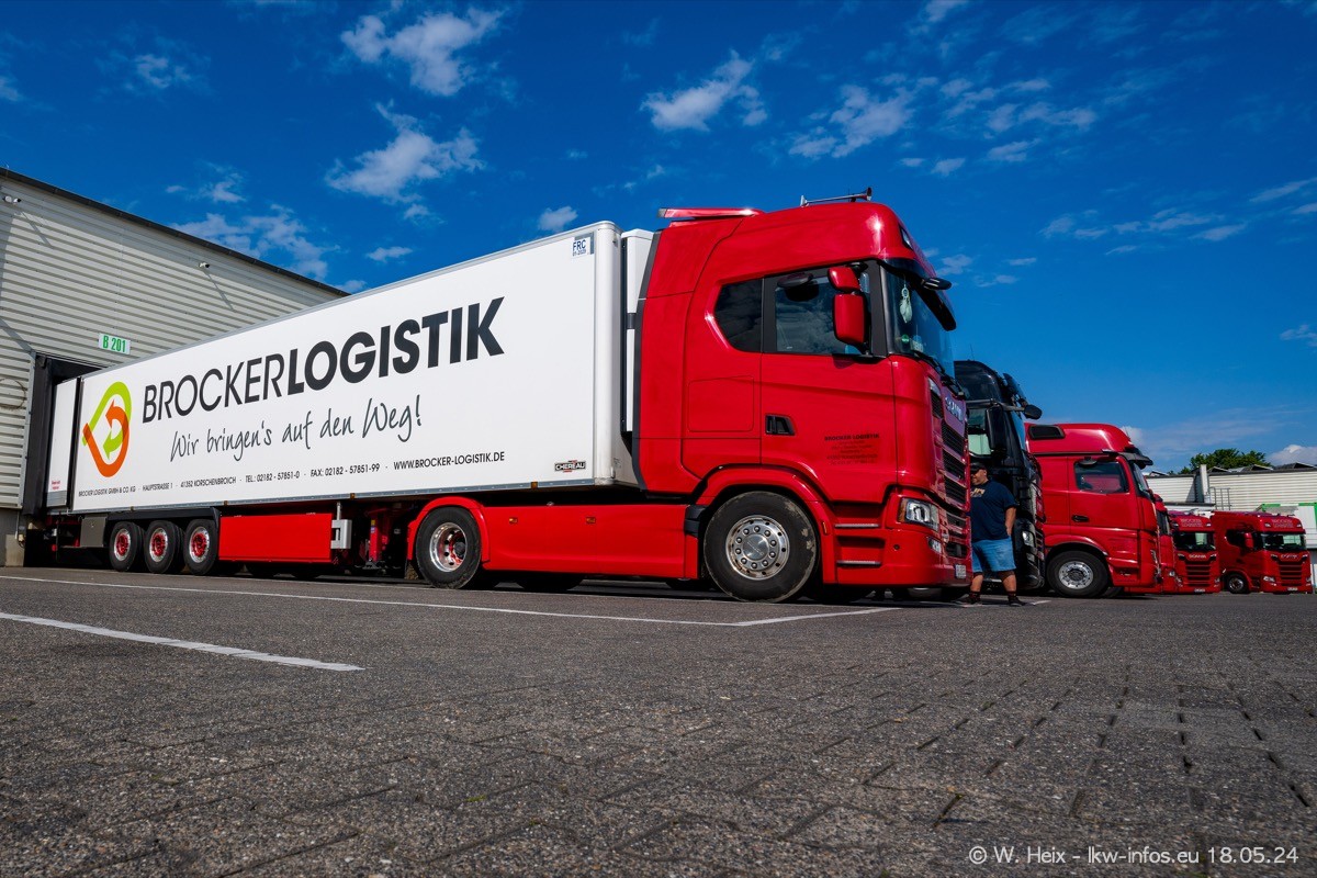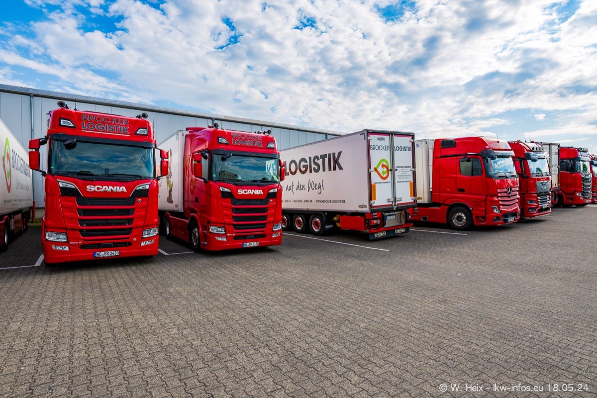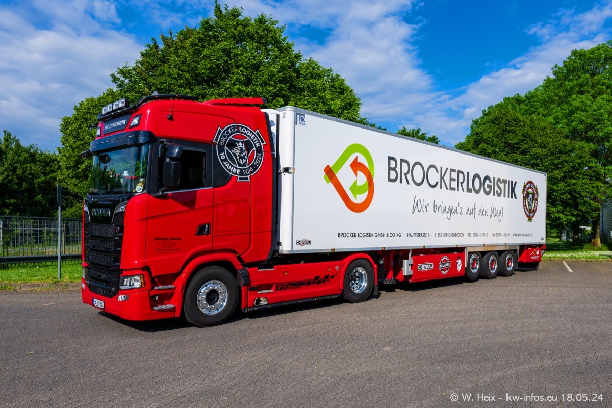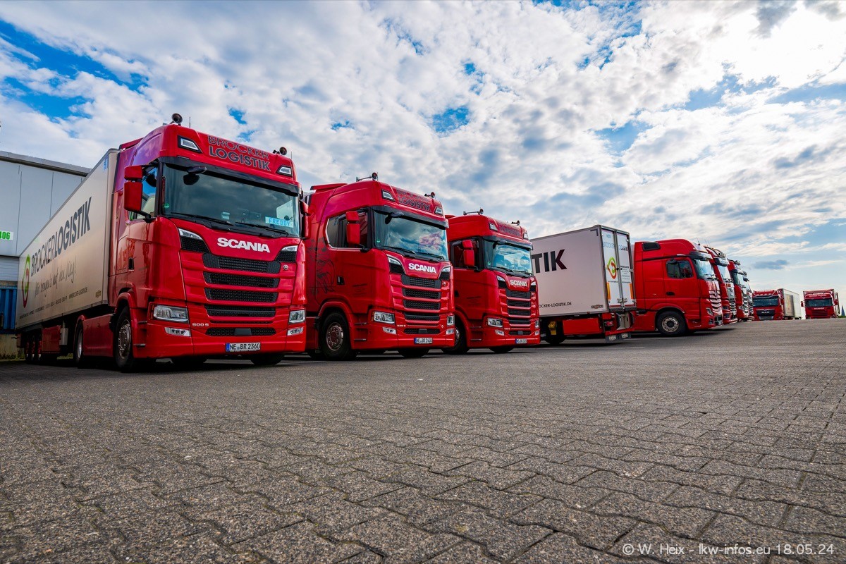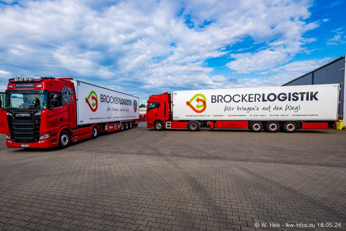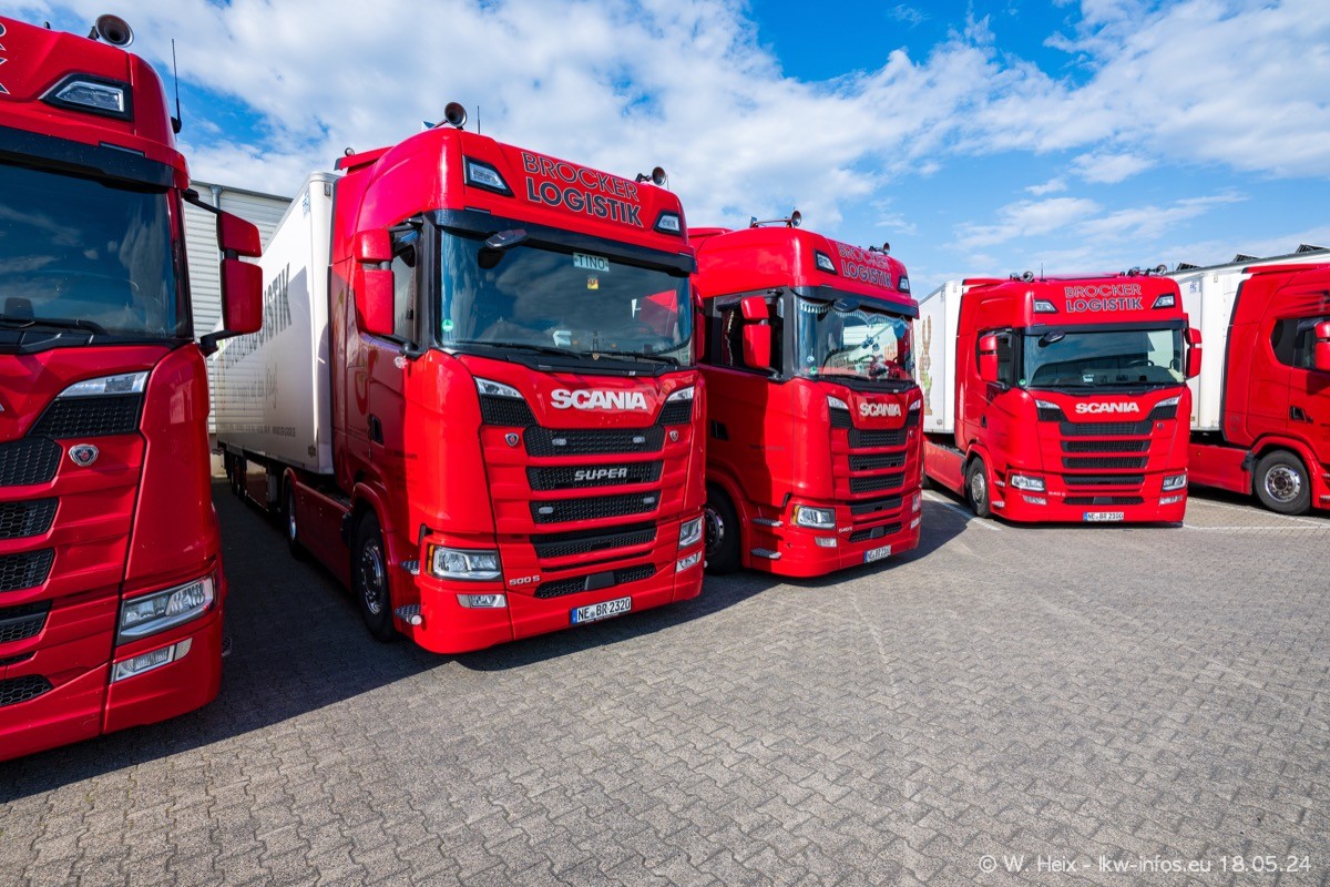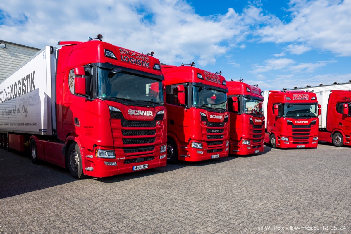 Nach über fünf Jahren war ich wieder bei Brocker Logistik in Korschenbroich. Diesmal wurde ich zu einem kleinen Fotoshooting eingeladen. Am späten Samstag Nachmittag war fast der komplette Fuhrpark zuhause. Das sind aktuell 38 LKW. Zwei fehlten. Zum 10-jährigen Firmenjubiläum wurde im März ein SCANIA 660 S V8 NextGen gekauft. Dieser ist etwas aufwändiger gestaltet als der restliche Fuhrpark, der sich aber auch sehen lassen kann. Auf dem weitläufigen Gelände gab es genug schöne Plätze für dieses kleine Fotoshooting.