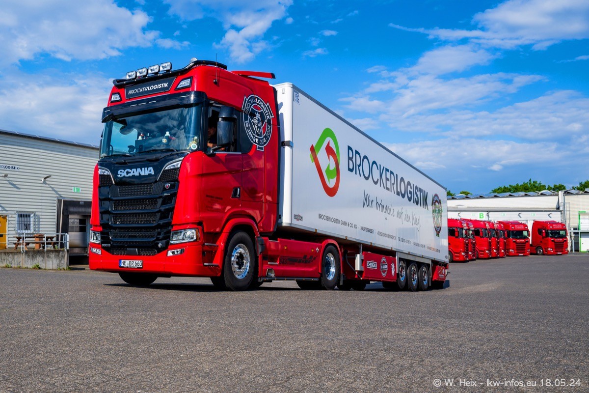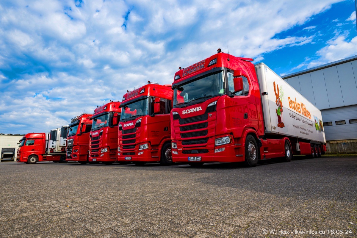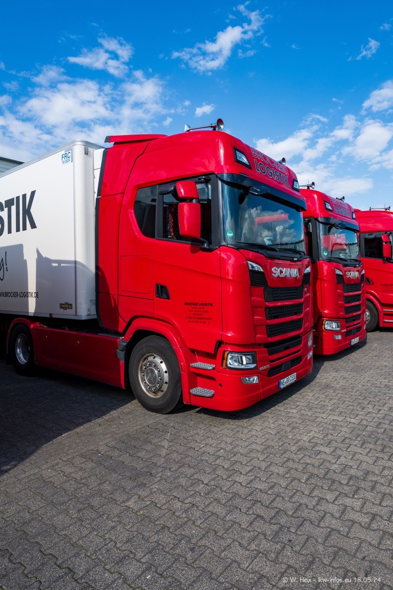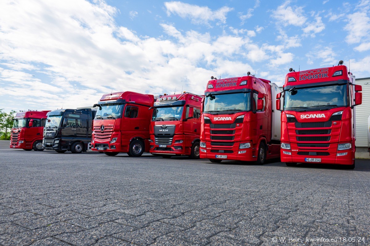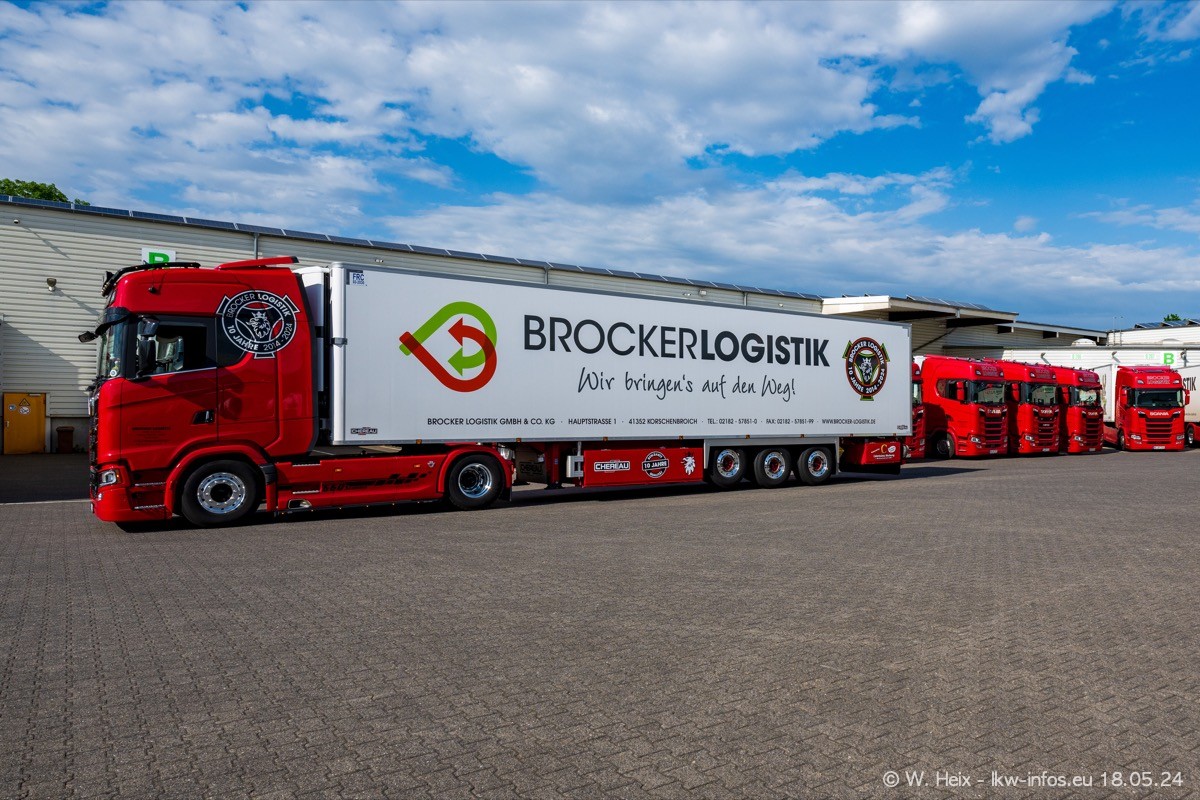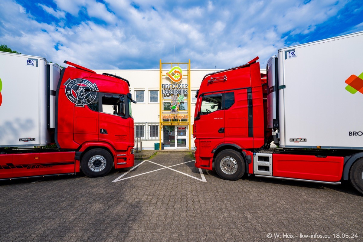 Nach über fünf Jahren war ich wieder bei Brocker Logistik in Korschenbroich. Diesmal wurde ich zu einem kleinen Fotoshooting eingeladen. Am späten Samstag Nachmittag war fast der komplette Fuhrpark zuhause. Das sind aktuell 38 LKW. Zwei fehlten. Zum 10-jährigen Firmenjubiläum wurde im März ein SCANIA 660 S V8 NextGen gekauft. Dieser ist etwas aufwändiger gestaltet als der restliche Fuhrpark, der sich aber auch sehen lassen kann. Auf dem weitläufigen Gelände gab es genug schöne Plätze für dieses kleine Fotoshooting.