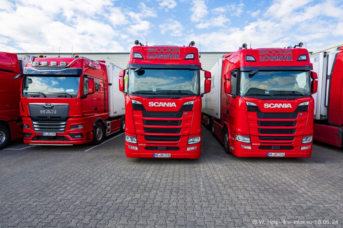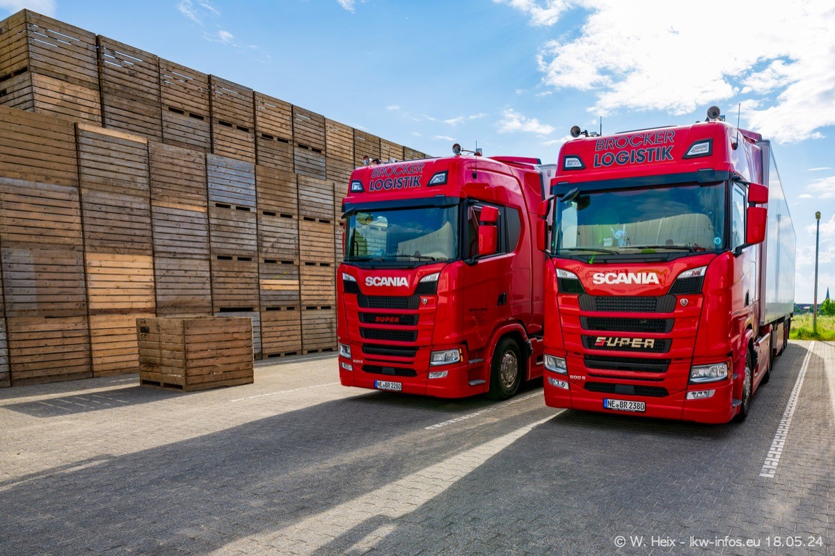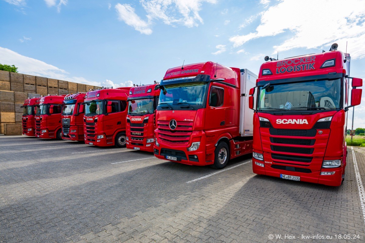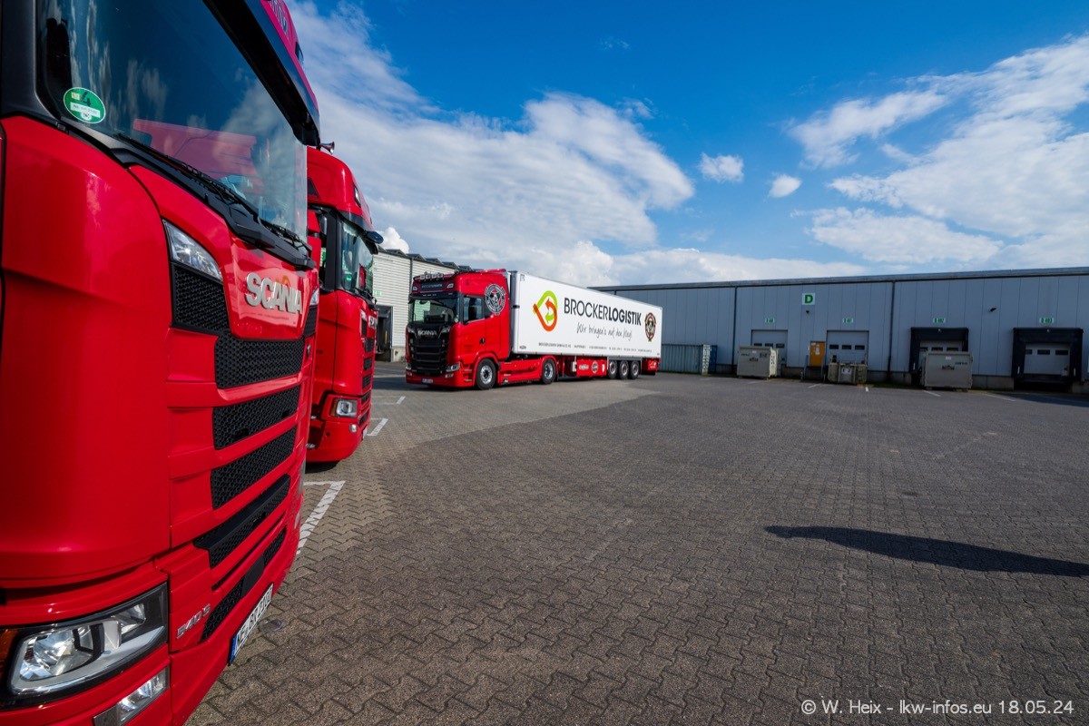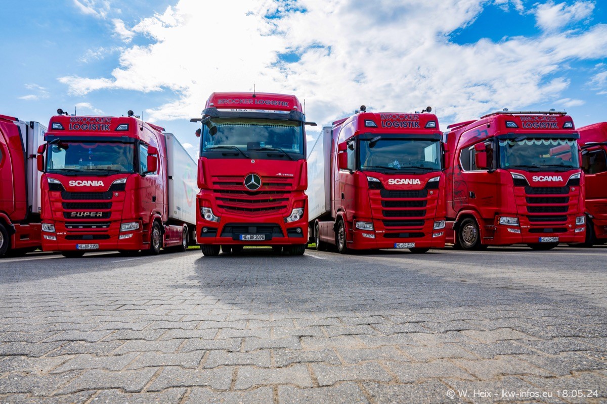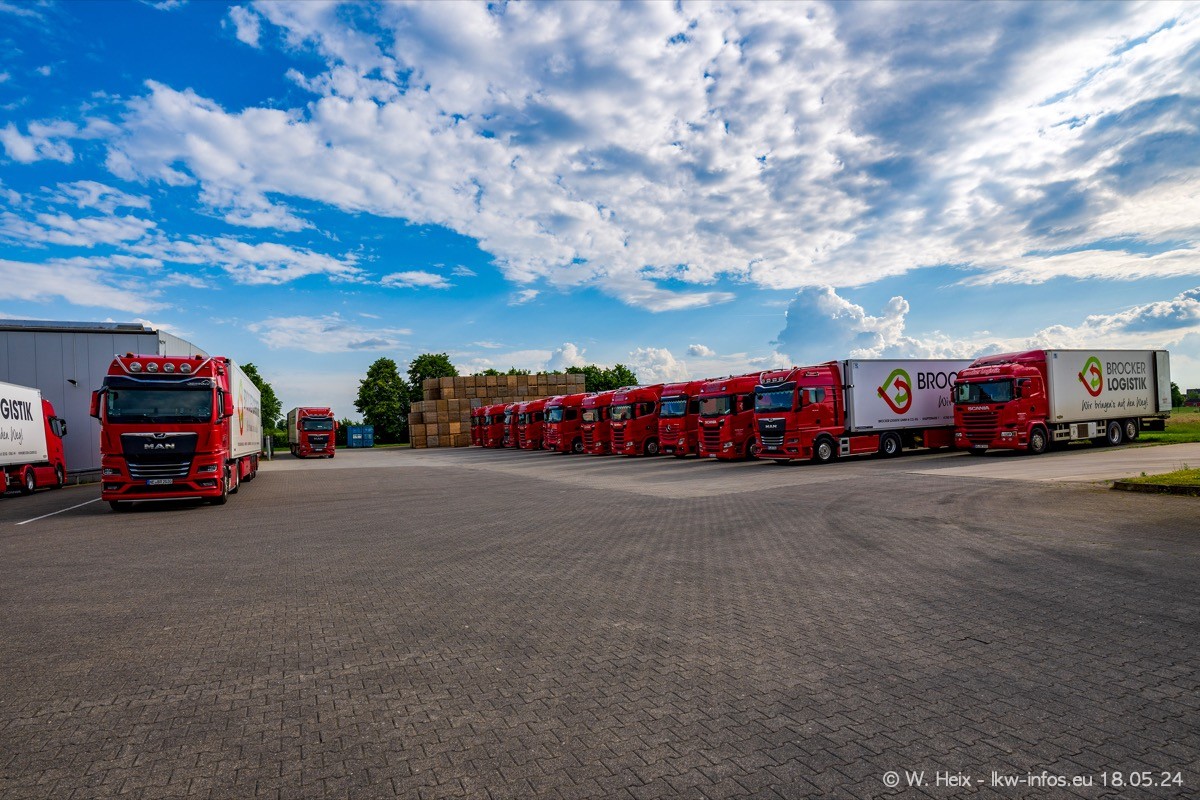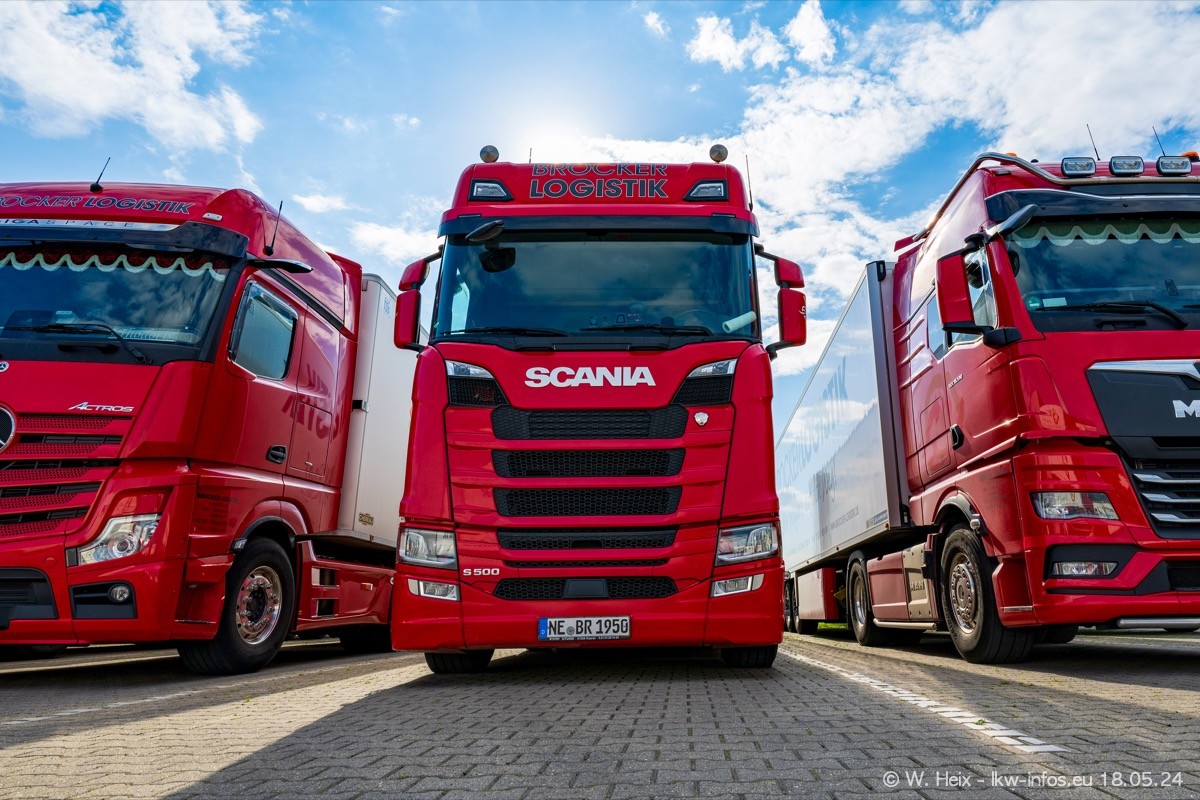 Nach über fünf Jahren war ich wieder bei Brocker Logistik in Korschenbroich. Diesmal wurde ich zu einem kleinen Fotoshooting eingeladen. Am späten Samstag Nachmittag war fast der komplette Fuhrpark zuhause. Das sind aktuell 38 LKW. Zwei fehlten. Zum 10-jährigen Firmenjubiläum wurde im März ein SCANIA 660 S V8 NextGen gekauft. Dieser ist etwas aufwändiger gestaltet als der restliche Fuhrpark, der sich aber auch sehen lassen kann. Auf dem weitläufigen Gelände gab es genug schöne Plätze für dieses kleine Fotoshooting.