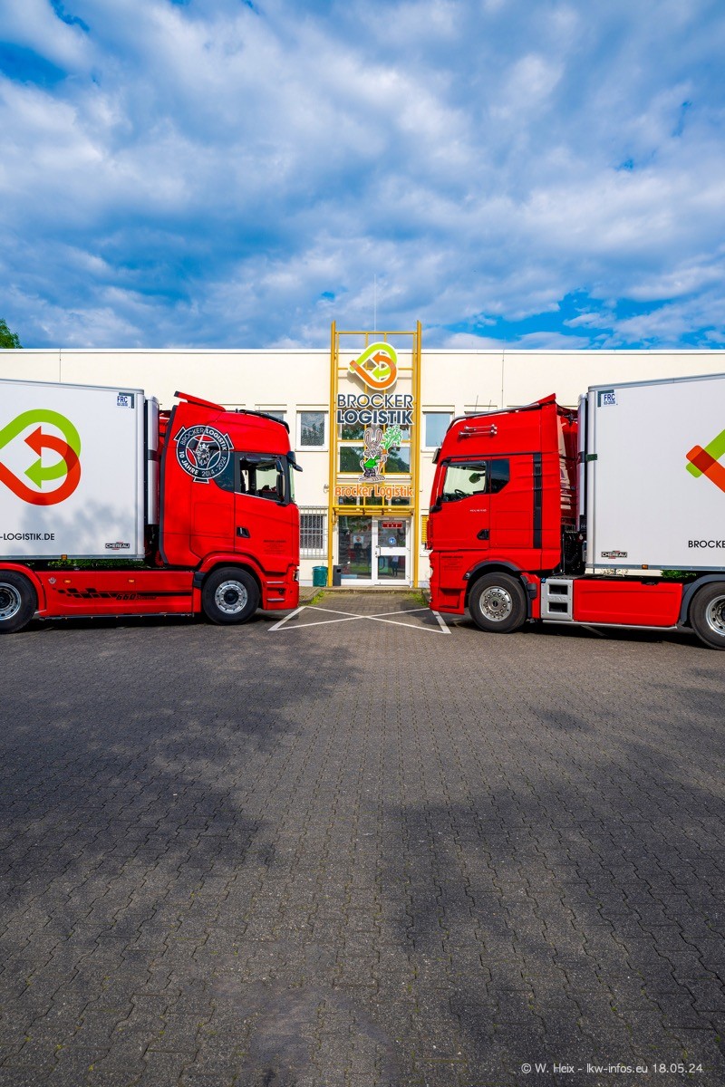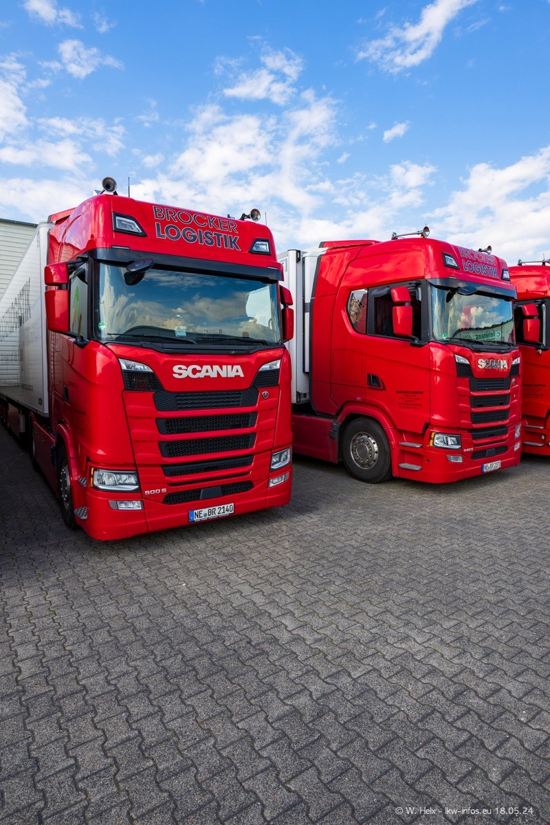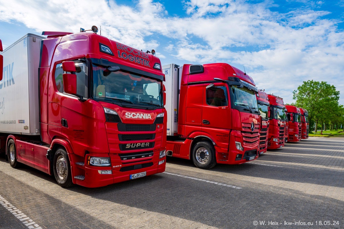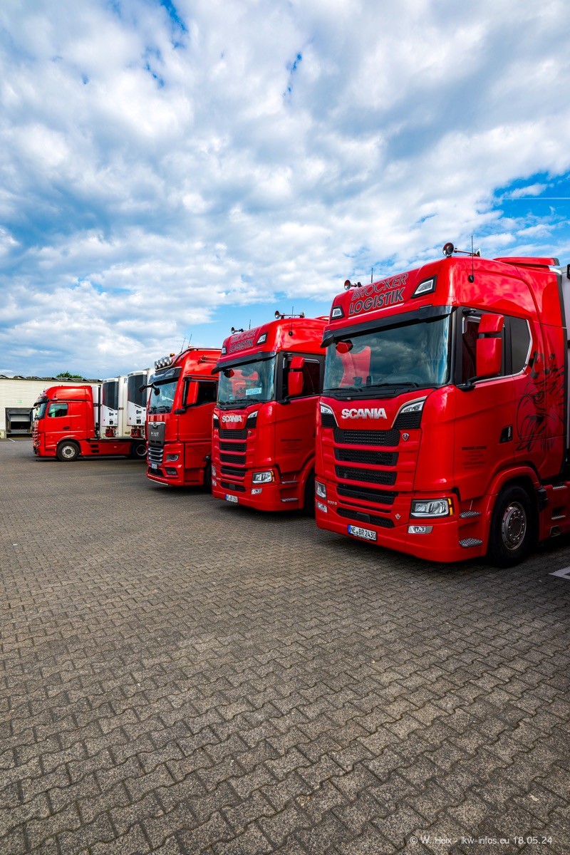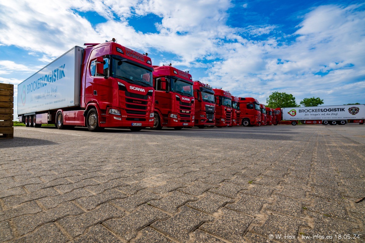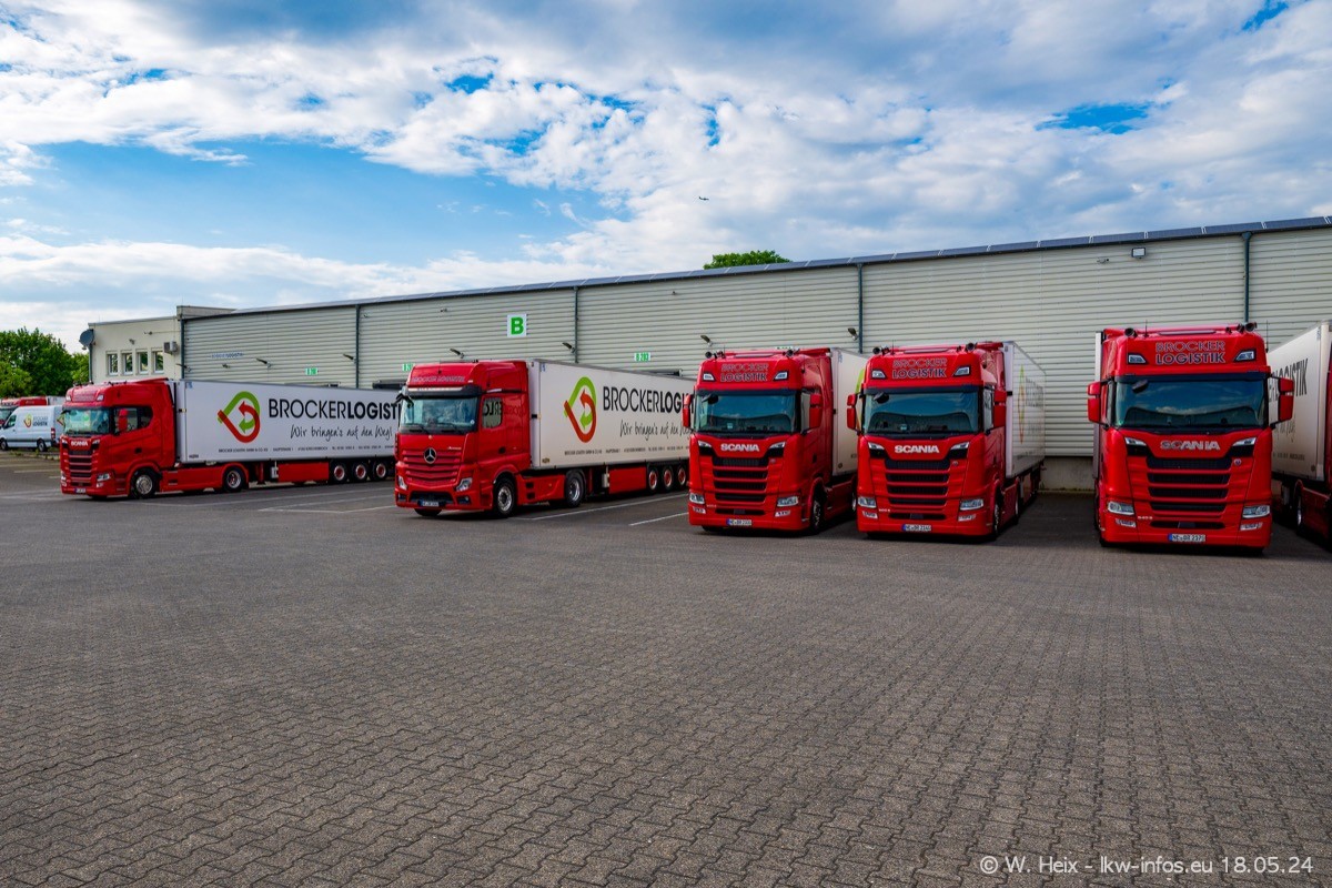 Nach über fünf Jahren war ich wieder bei Brocker Logistik in Korschenbroich. Diesmal wurde ich zu einem kleinen Fotoshooting eingeladen. Am späten Samstag Nachmittag war fast der komplette Fuhrpark zuhause. Das sind aktuell 38 LKW. Zwei fehlten. Zum 10-jährigen Firmenjubiläum wurde im März ein SCANIA 660 S V8 NextGen gekauft. Dieser ist etwas aufwändiger gestaltet als der restliche Fuhrpark, der sich aber auch sehen lassen kann. Auf dem weitläufigen Gelände gab es genug schöne Plätze für dieses kleine Fotoshooting.