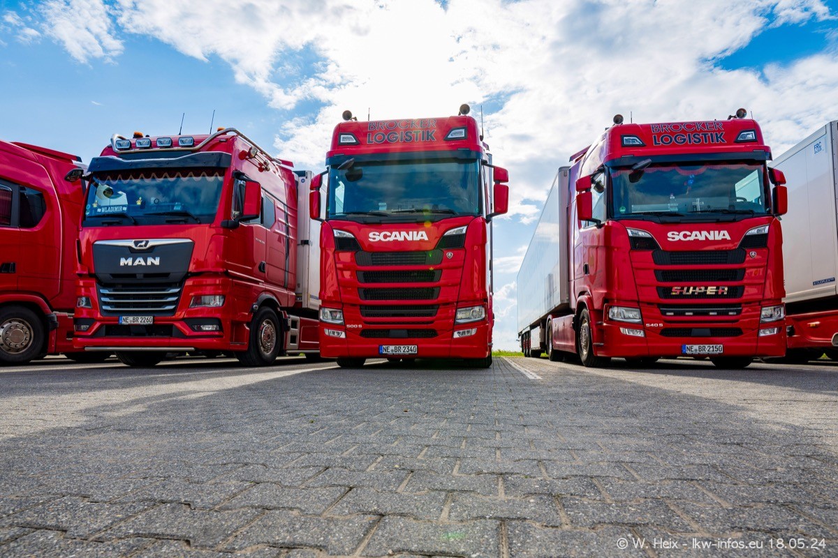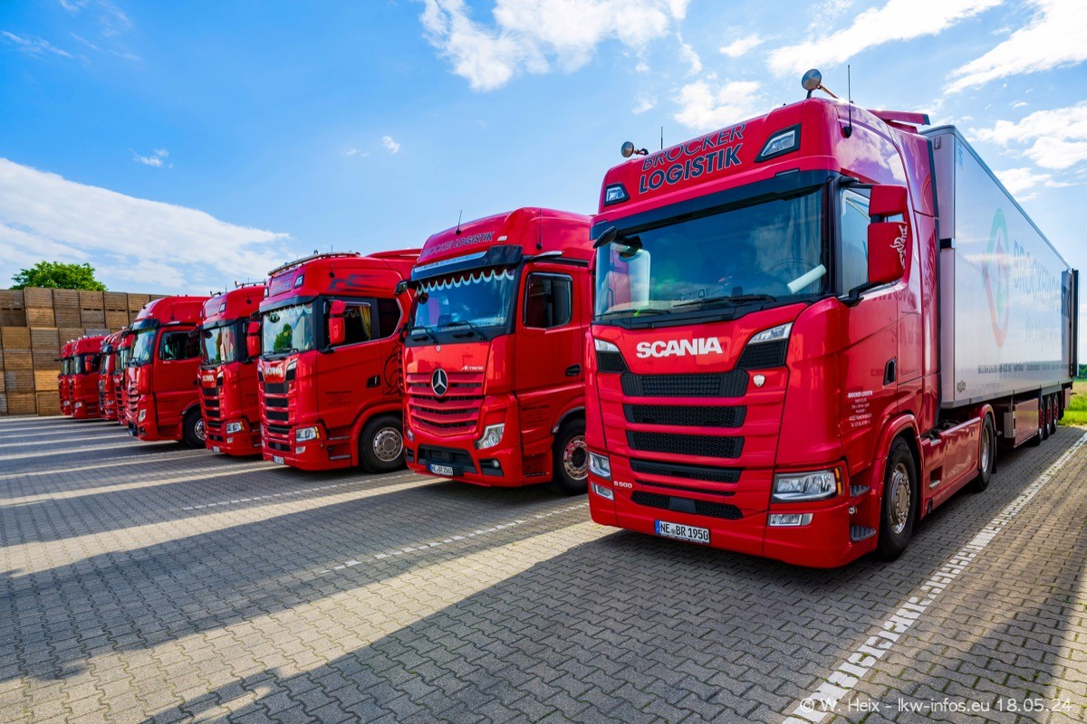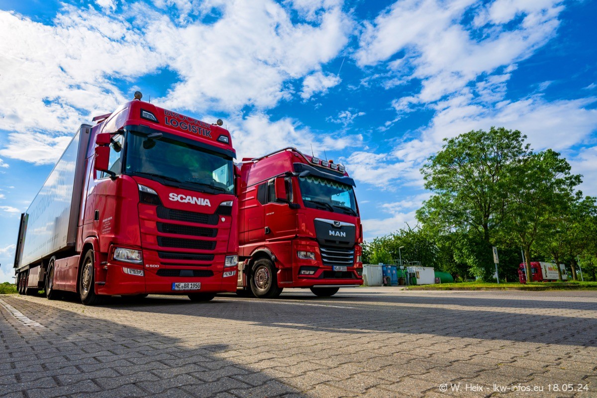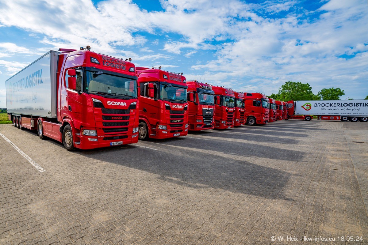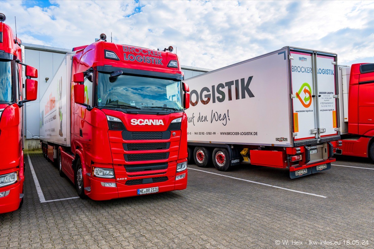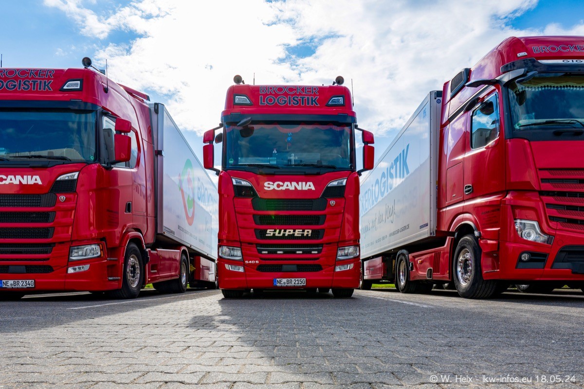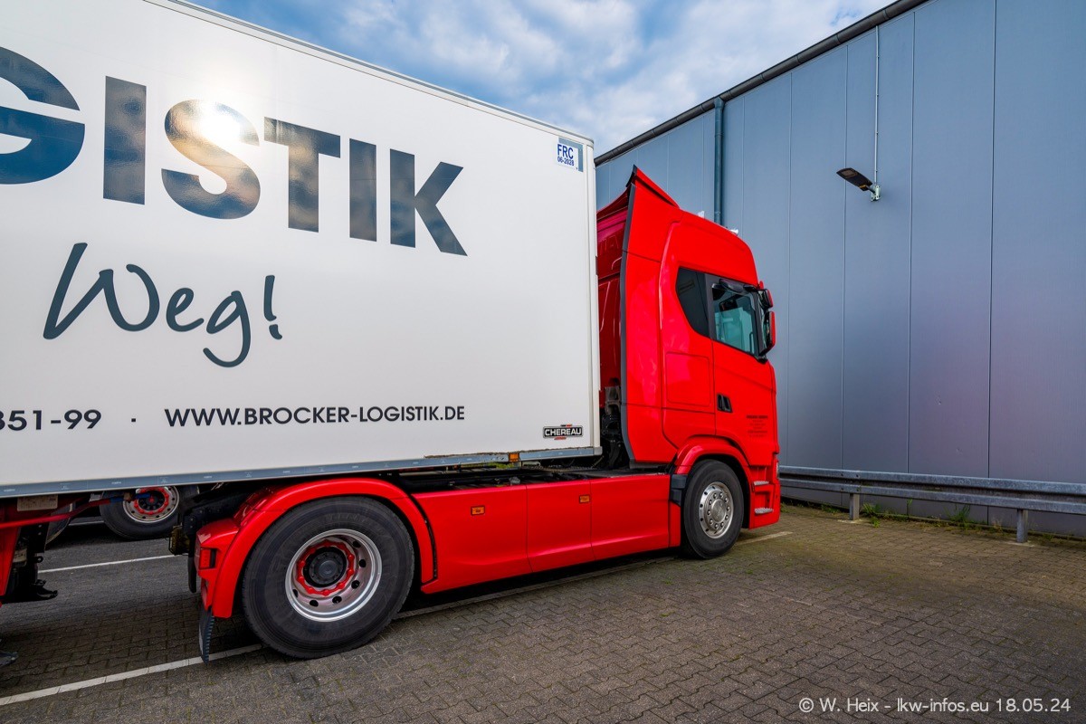 Nach über fünf Jahren war ich wieder bei Brocker Logistik in Korschenbroich. Diesmal wurde ich zu einem kleinen Fotoshooting eingeladen. Am späten Samstag Nachmittag war fast der komplette Fuhrpark zuhause. Das sind aktuell 38 LKW. Zwei fehlten. Zum 10-jährigen Firmenjubiläum wurde im März ein SCANIA 660 S V8 NextGen gekauft. Dieser ist etwas aufwändiger gestaltet als der restliche Fuhrpark, der sich aber auch sehen lassen kann. Auf dem weitläufigen Gelände gab es genug schöne Plätze für dieses kleine Fotoshooting.