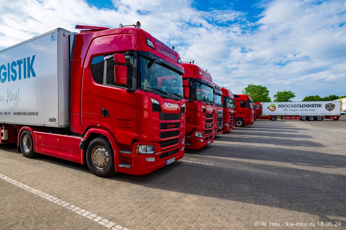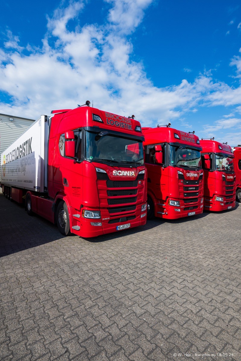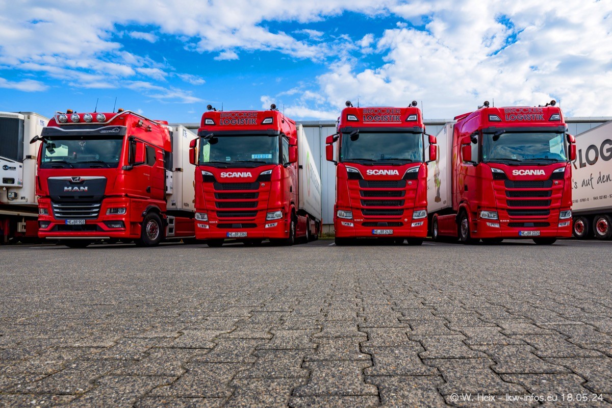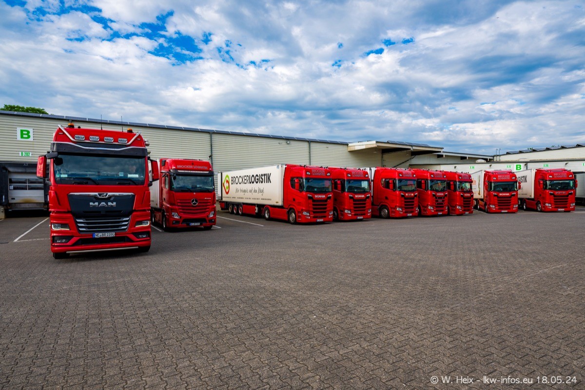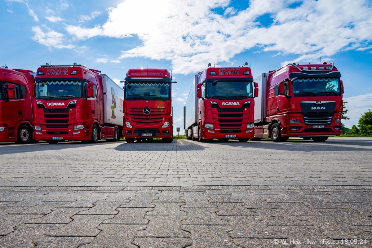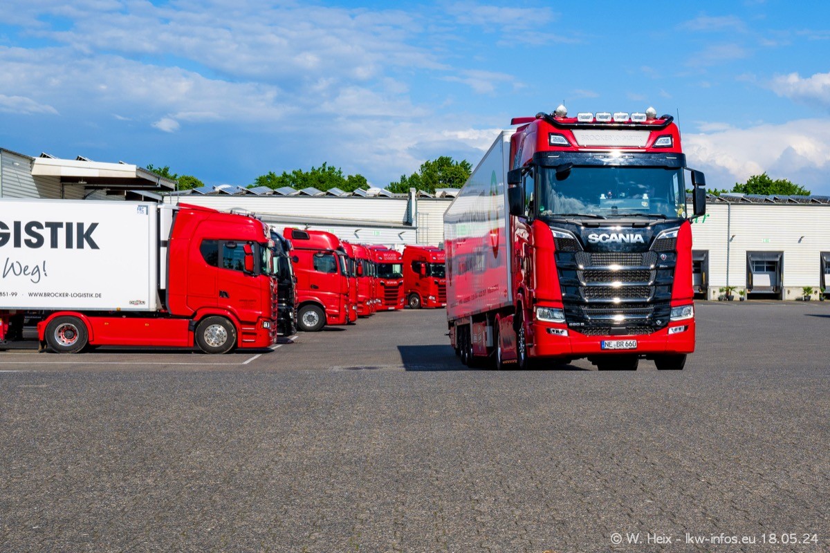 Nach über fünf Jahren war ich wieder bei Brocker Logistik in Korschenbroich. Diesmal wurde ich zu einem kleinen Fotoshooting eingeladen. Am späten Samstag Nachmittag war fast der komplette Fuhrpark zuhause. Das sind aktuell 38 LKW. Zwei fehlten. Zum 10-jährigen Firmenjubiläum wurde im März ein SCANIA 660 S V8 NextGen gekauft. Dieser ist etwas aufwändiger gestaltet als der restliche Fuhrpark, der sich aber auch sehen lassen kann. Auf dem weitläufigen Gelände gab es genug schöne Plätze für dieses kleine Fotoshooting.
