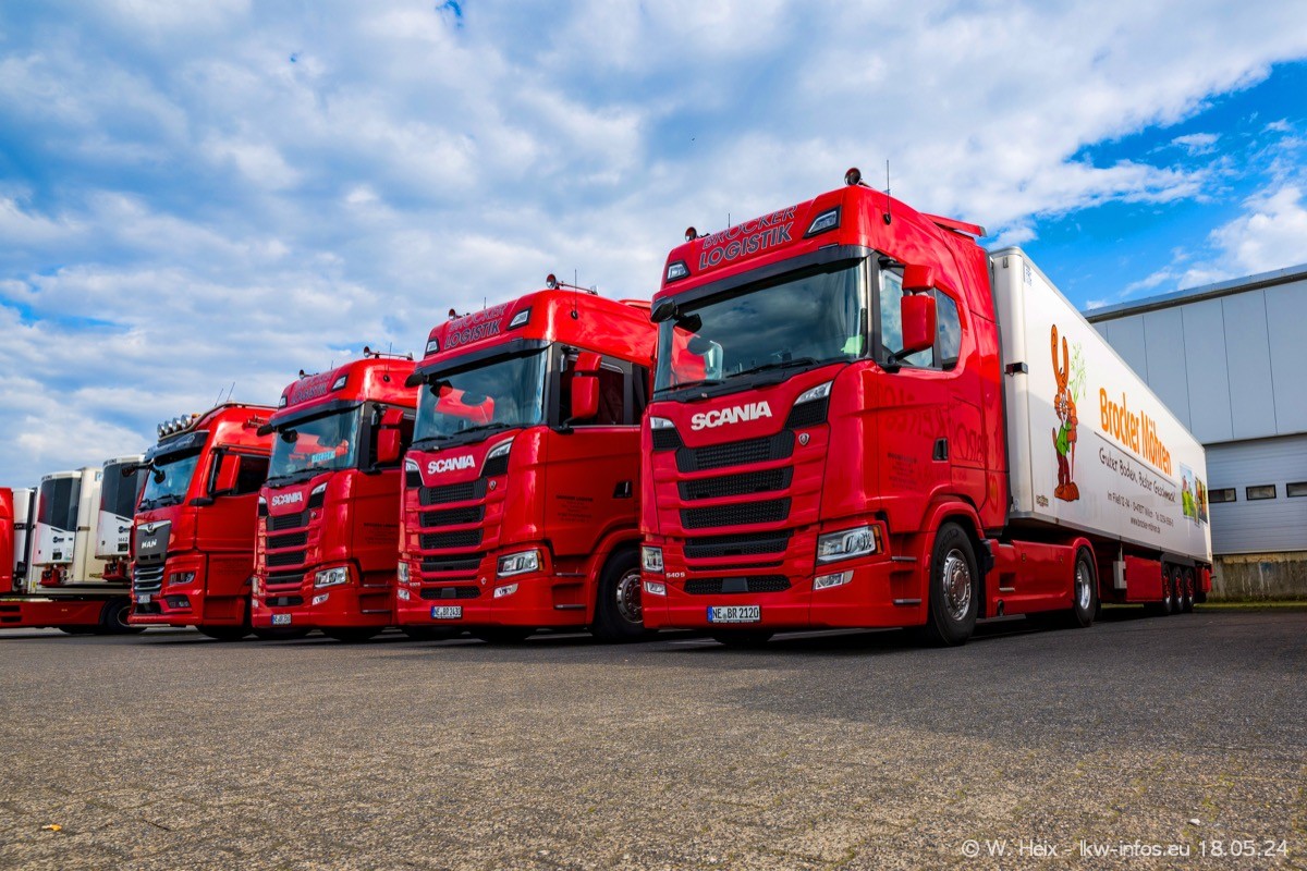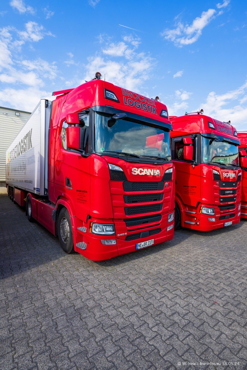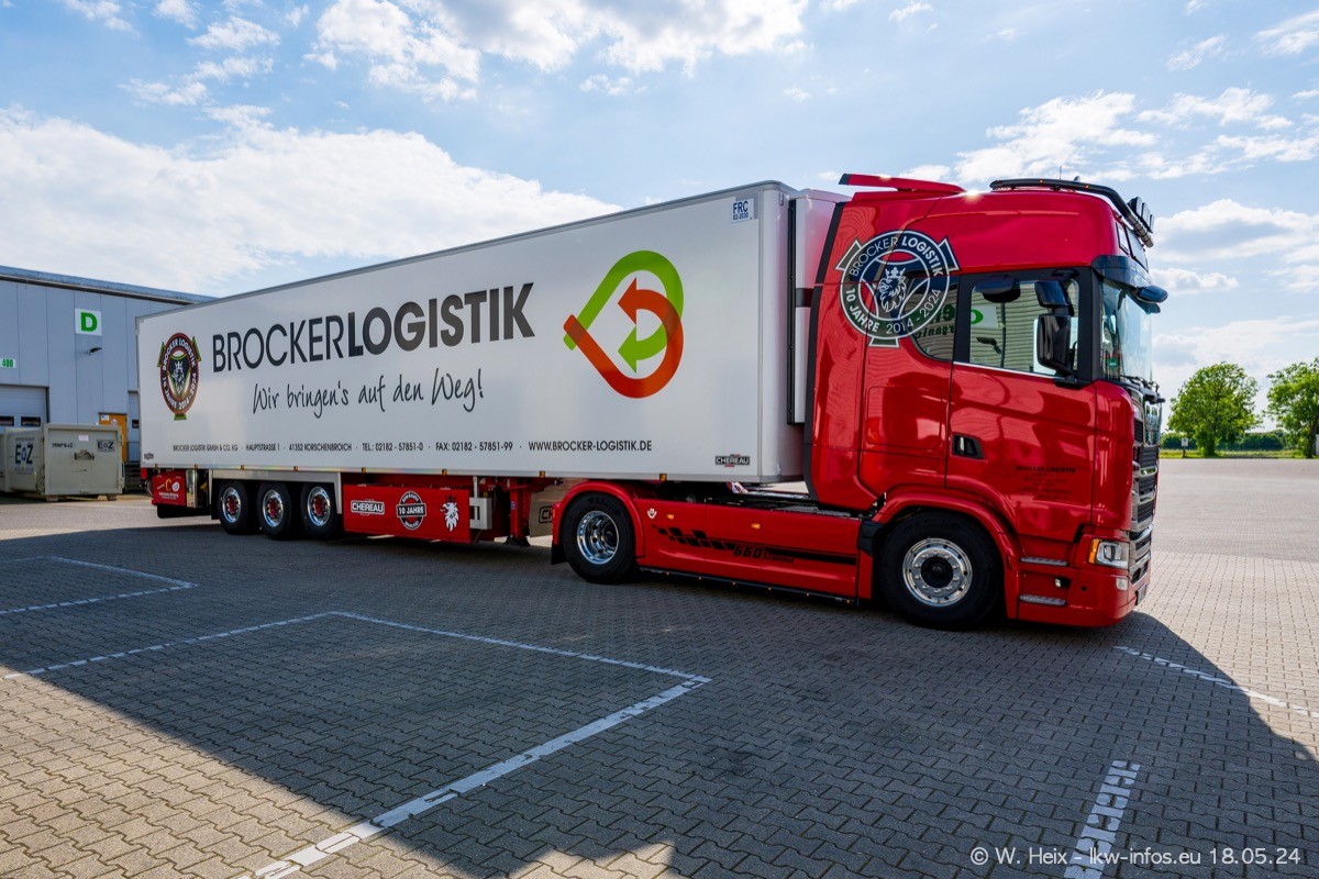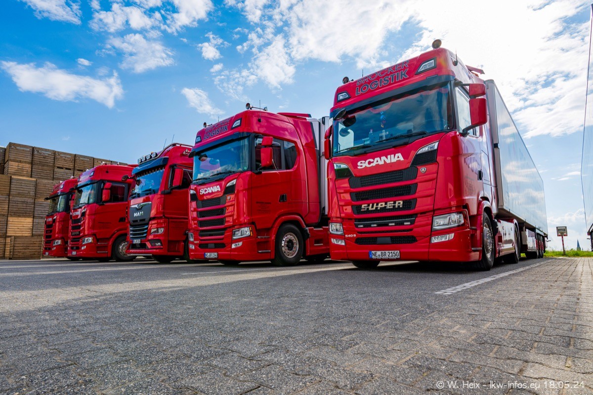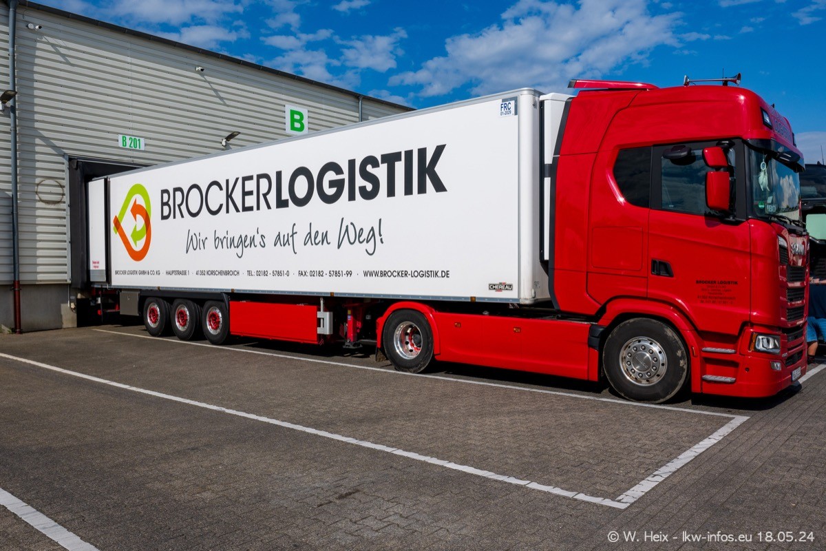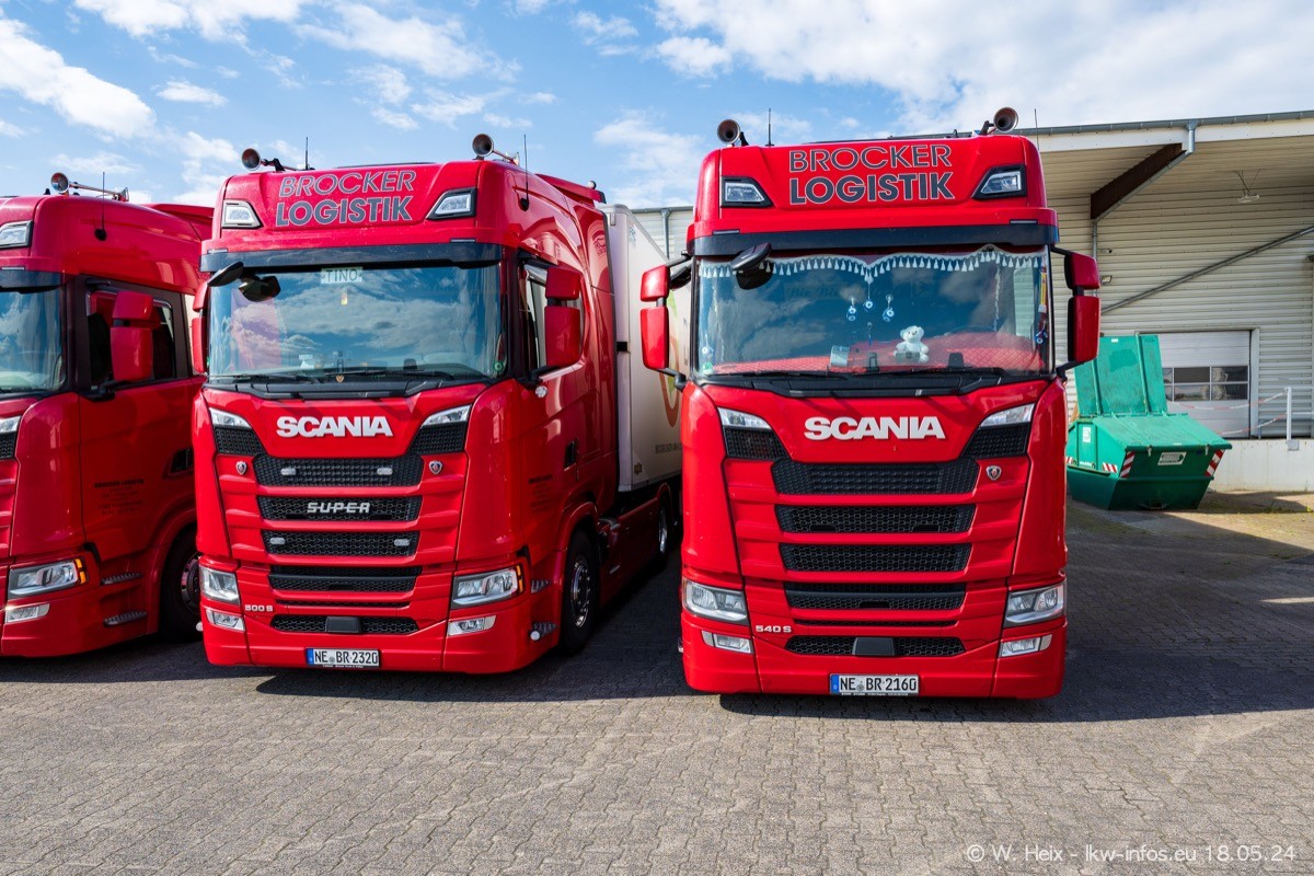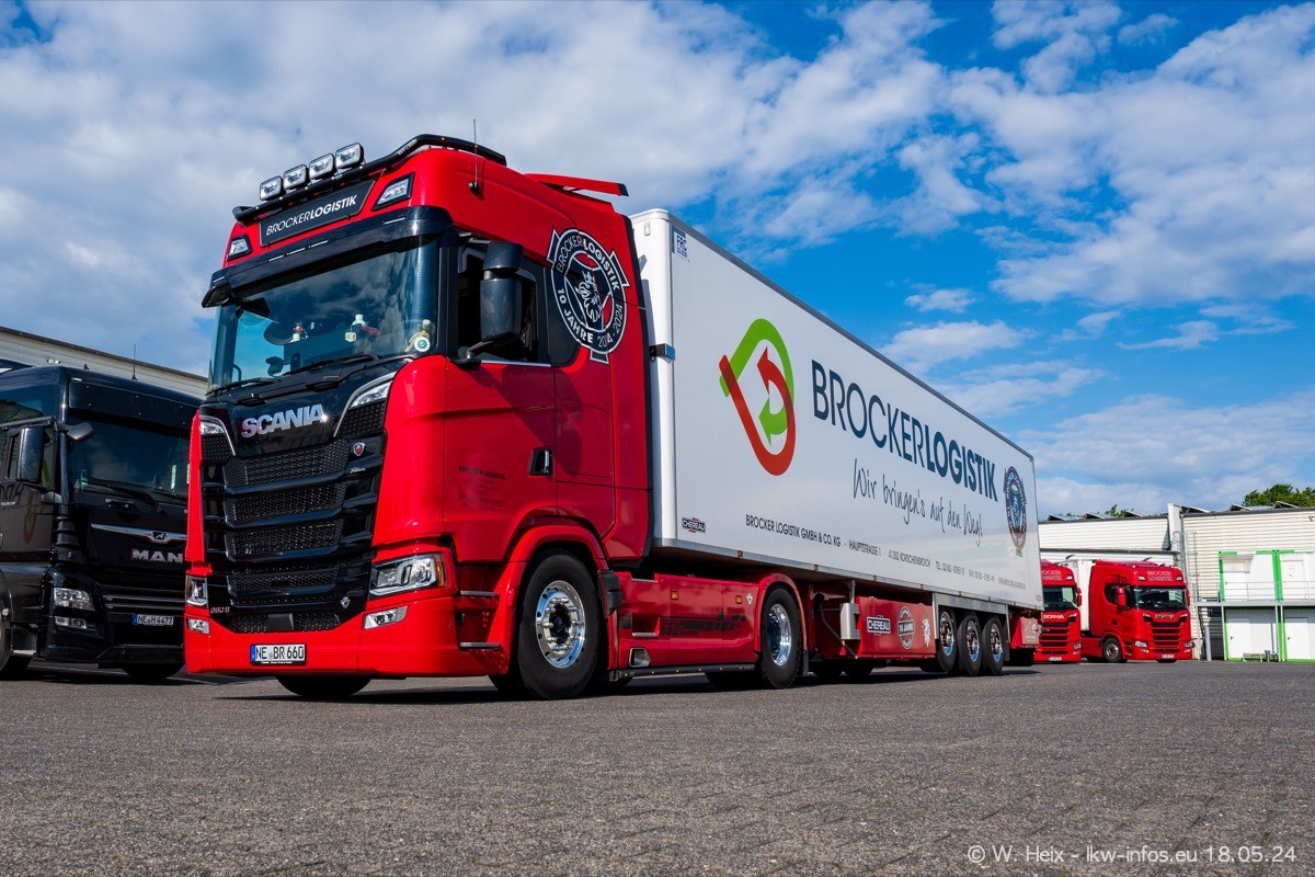 Nach über fünf Jahren war ich wieder bei Brocker Logistik in Korschenbroich. Diesmal wurde ich zu einem kleinen Fotoshooting eingeladen. Am späten Samstag Nachmittag war fast der komplette Fuhrpark zuhause. Das sind aktuell 38 LKW. Zwei fehlten. Zum 10-jährigen Firmenjubiläum wurde im März ein SCANIA 660 S V8 NextGen gekauft. Dieser ist etwas aufwändiger gestaltet als der restliche Fuhrpark, der sich aber auch sehen lassen kann. Auf dem weitläufigen Gelände gab es genug schöne Plätze für dieses kleine Fotoshooting.