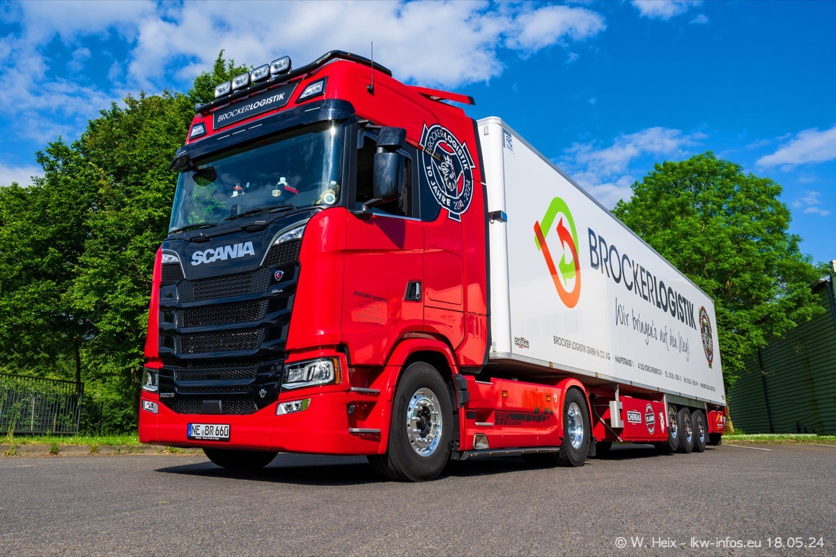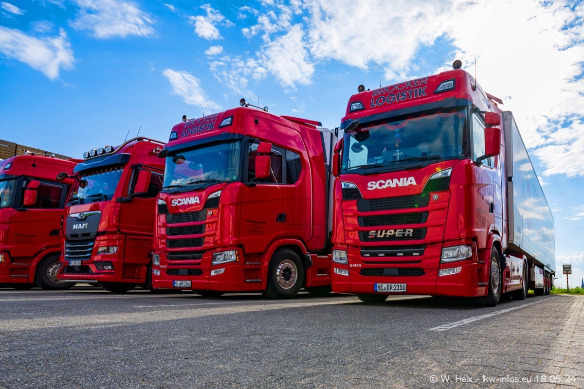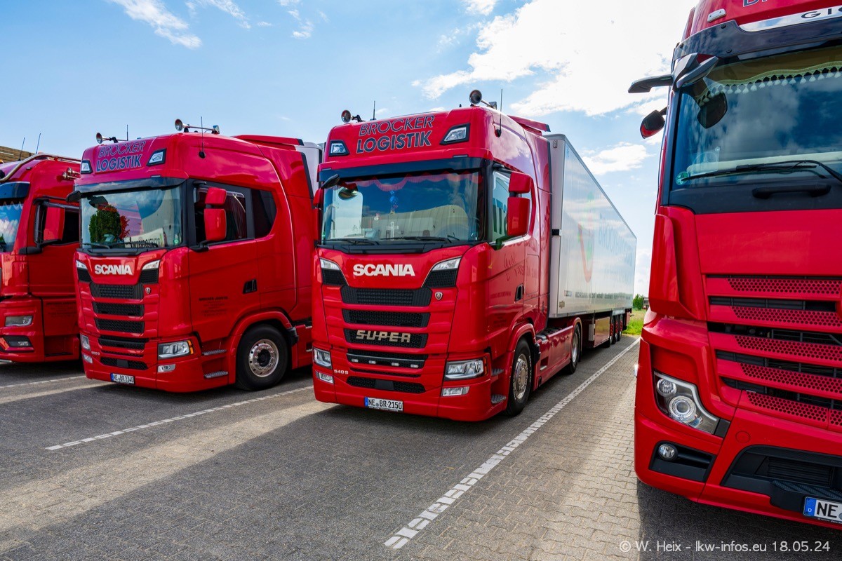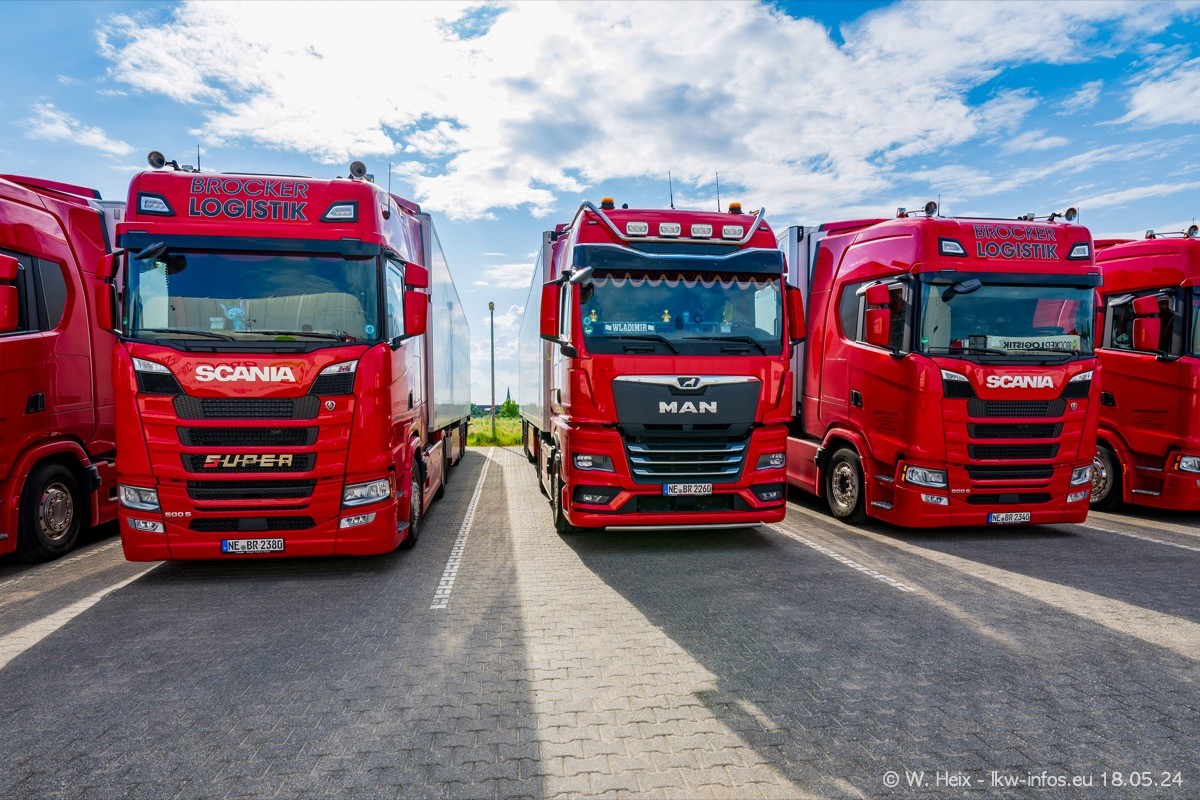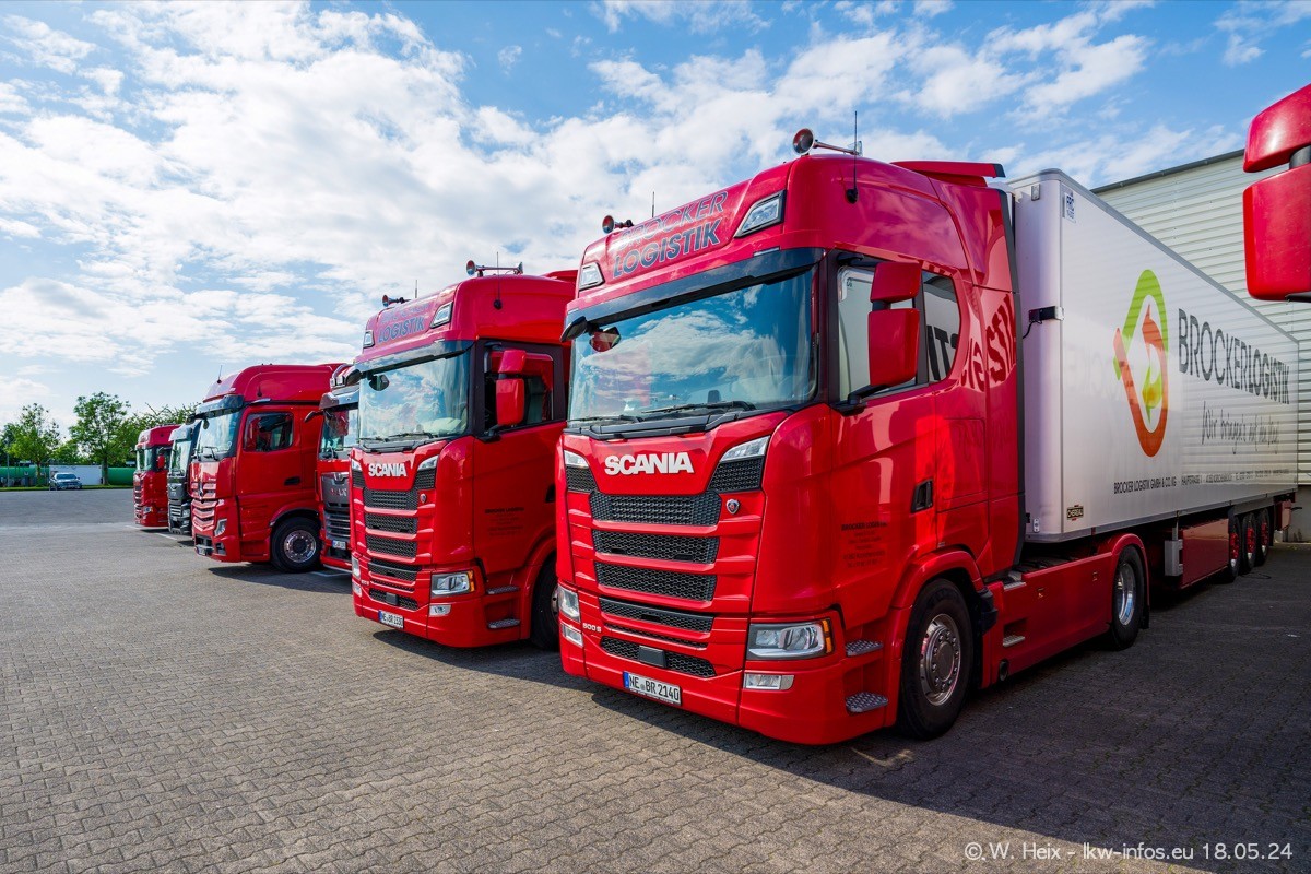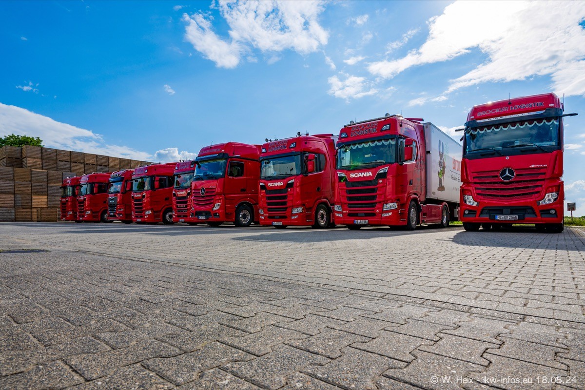 Nach über fünf Jahren war ich wieder bei Brocker Logistik in Korschenbroich. Diesmal wurde ich zu einem kleinen Fotoshooting eingeladen. Am späten Samstag Nachmittag war fast der komplette Fuhrpark zuhause. Das sind aktuell 38 LKW. Zwei fehlten. Zum 10-jährigen Firmenjubiläum wurde im März ein SCANIA 660 S V8 NextGen gekauft. Dieser ist etwas aufwändiger gestaltet als der restliche Fuhrpark, der sich aber auch sehen lassen kann. Auf dem weitläufigen Gelände gab es genug schöne Plätze für dieses kleine Fotoshooting.