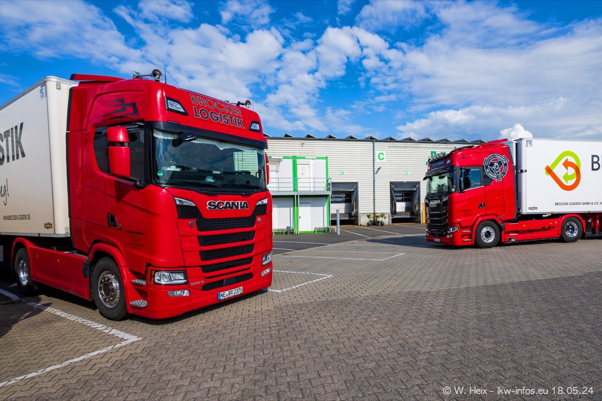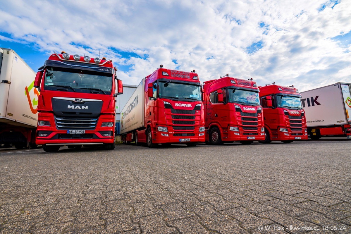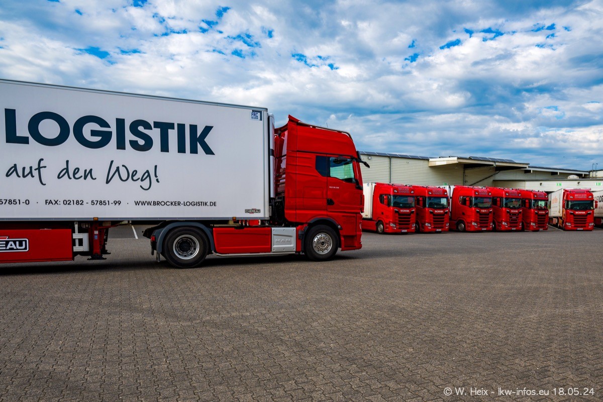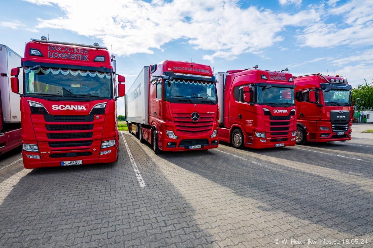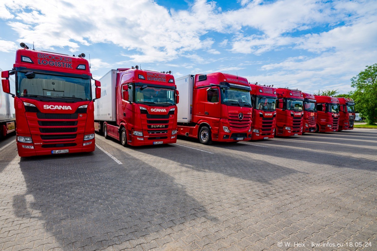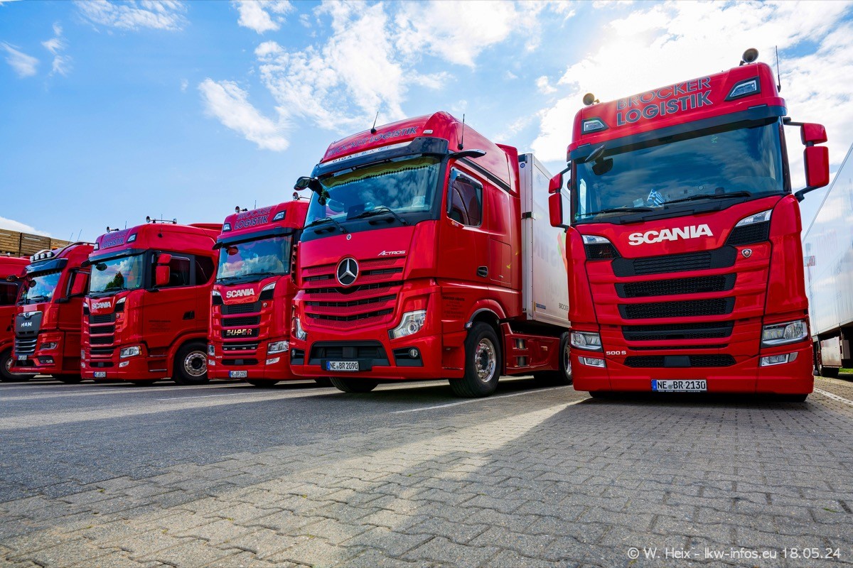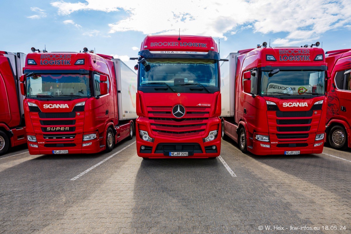 Nach über fünf Jahren war ich wieder bei Brocker Logistik in Korschenbroich. Diesmal wurde ich zu einem kleinen Fotoshooting eingeladen. Am späten Samstag Nachmittag war fast der komplette Fuhrpark zuhause. Das sind aktuell 38 LKW. Zwei fehlten. Zum 10-jährigen Firmenjubiläum wurde im März ein SCANIA 660 S V8 NextGen gekauft. Dieser ist etwas aufwändiger gestaltet als der restliche Fuhrpark, der sich aber auch sehen lassen kann. Auf dem weitläufigen Gelände gab es genug schöne Plätze für dieses kleine Fotoshooting.
