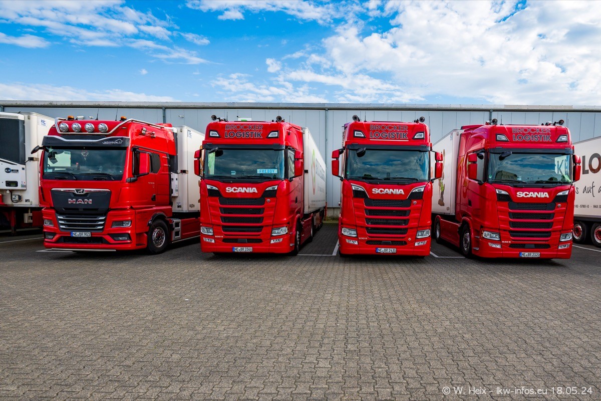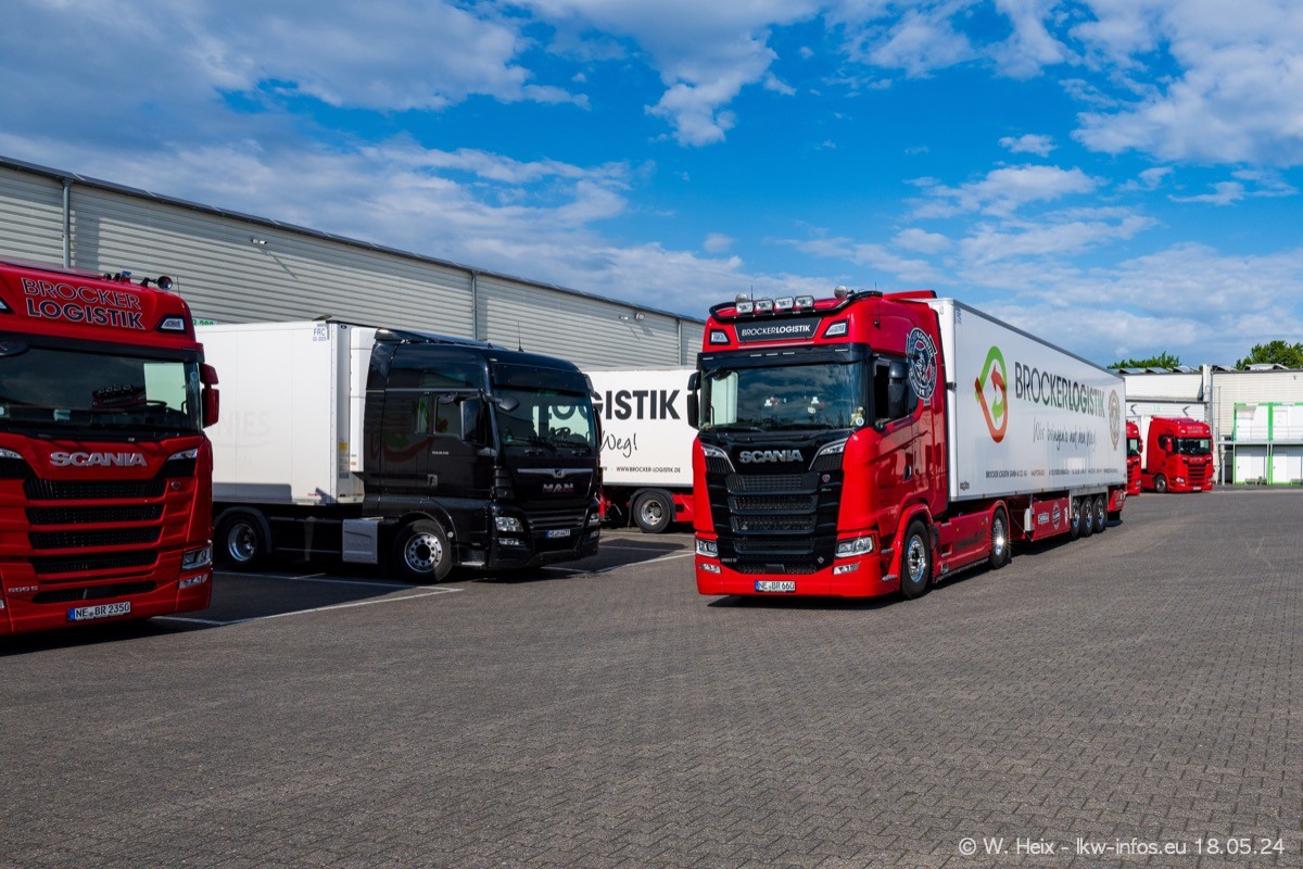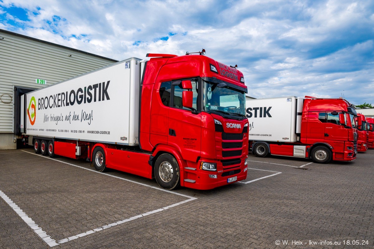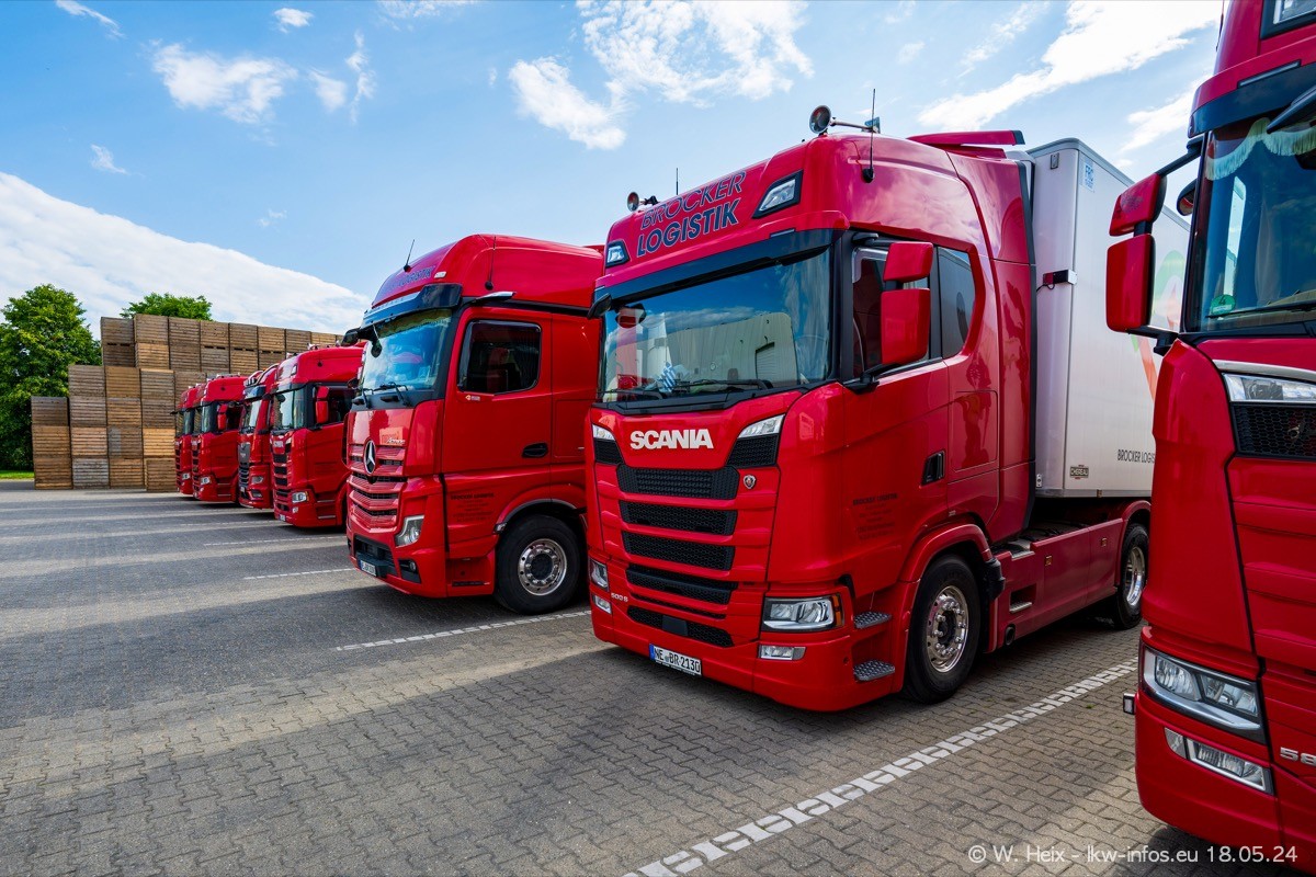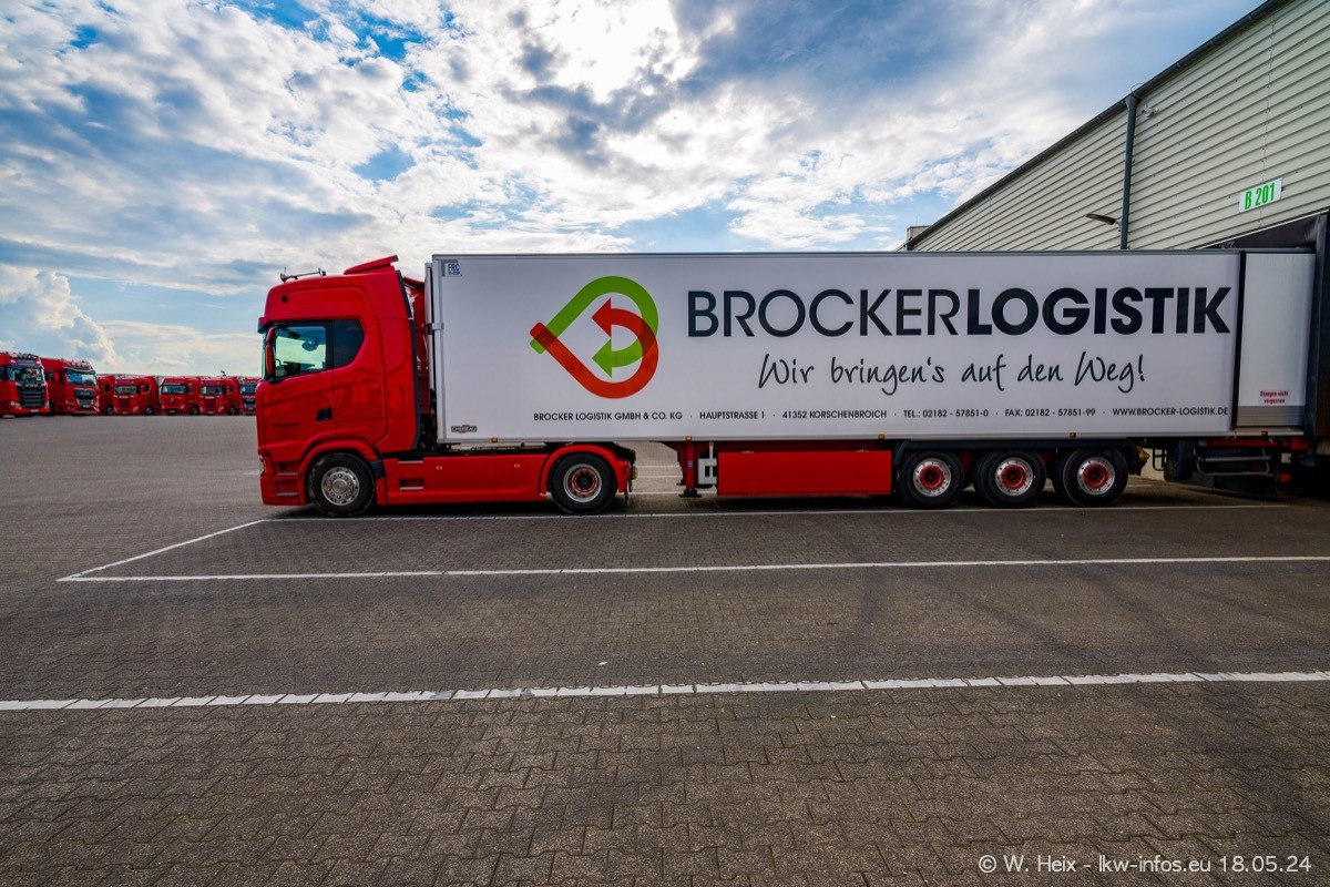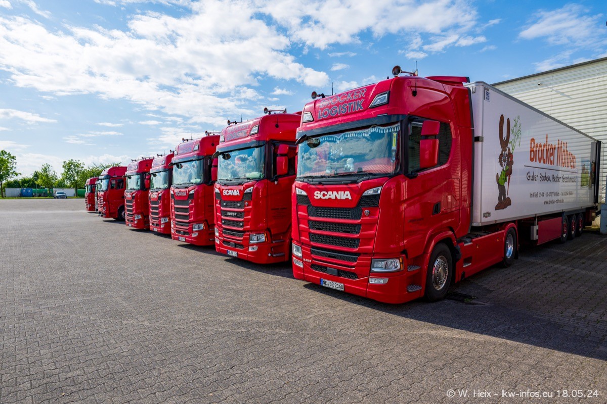 Nach über fünf Jahren war ich wieder bei Brocker Logistik in Korschenbroich. Diesmal wurde ich zu einem kleinen Fotoshooting eingeladen. Am späten Samstag Nachmittag war fast der komplette Fuhrpark zuhause. Das sind aktuell 38 LKW. Zwei fehlten. Zum 10-jährigen Firmenjubiläum wurde im März ein SCANIA 660 S V8 NextGen gekauft. Dieser ist etwas aufwändiger gestaltet als der restliche Fuhrpark, der sich aber auch sehen lassen kann. Auf dem weitläufigen Gelände gab es genug schöne Plätze für dieses kleine Fotoshooting.