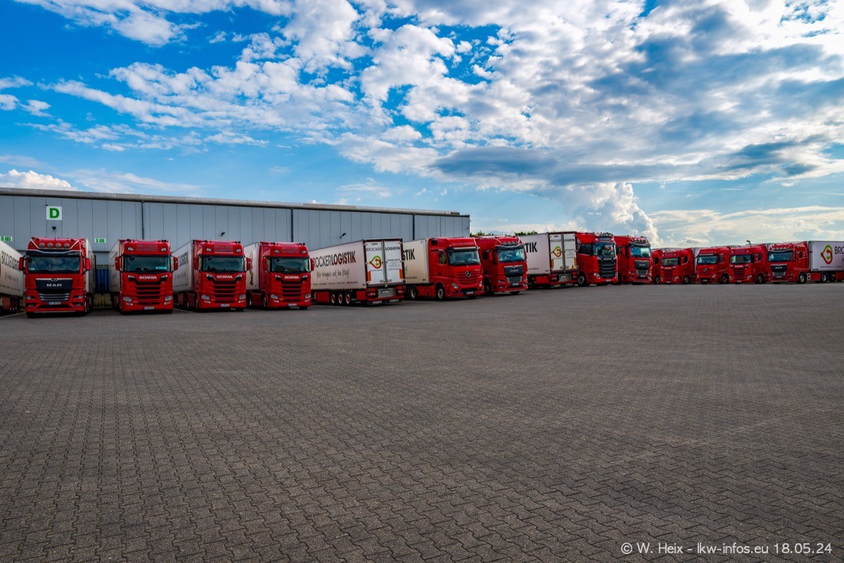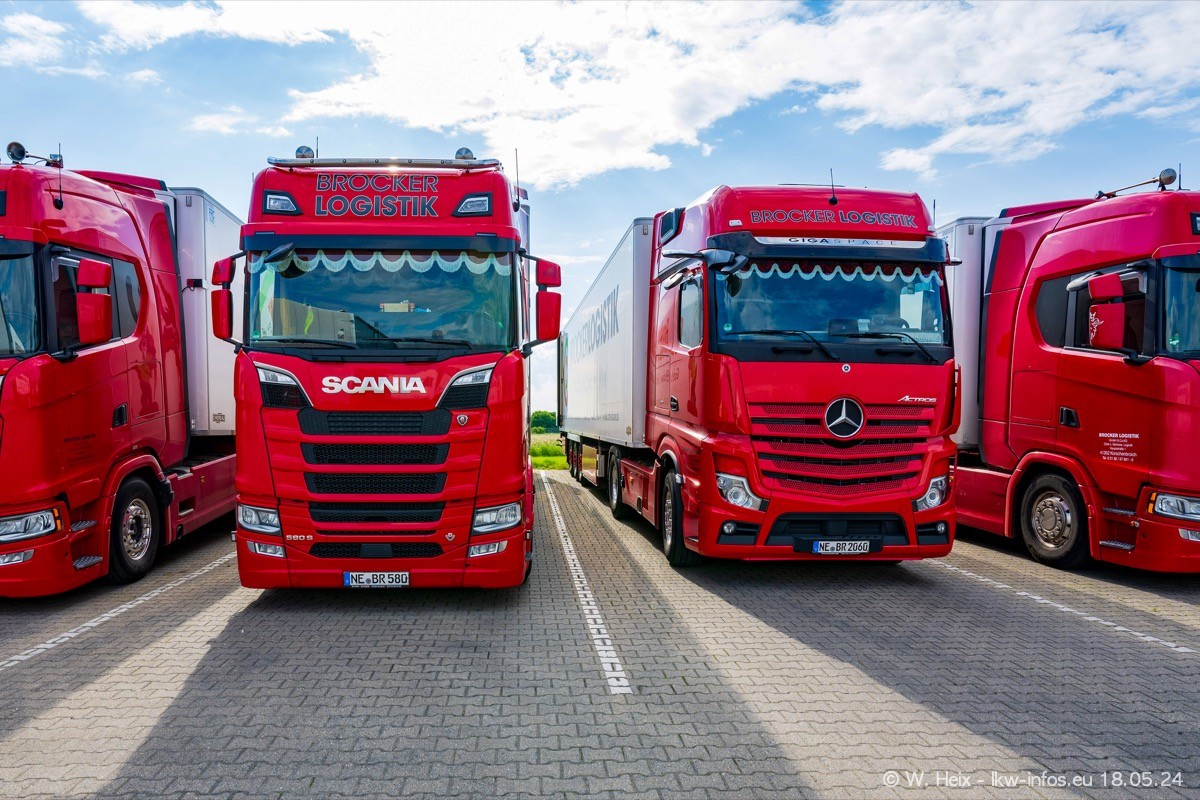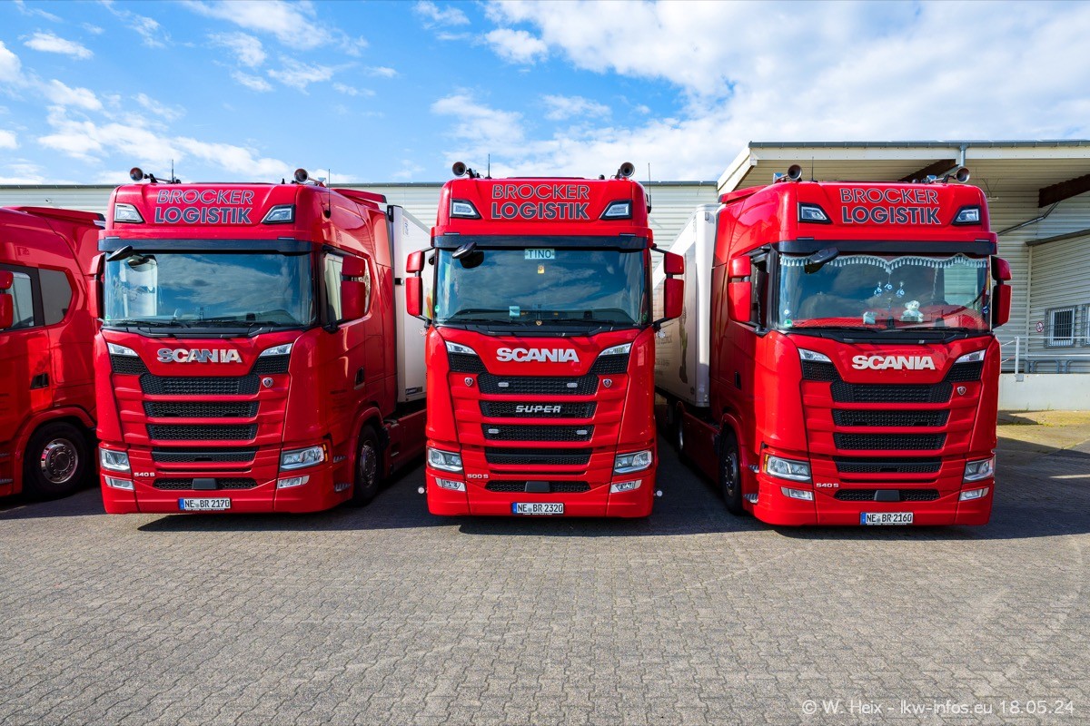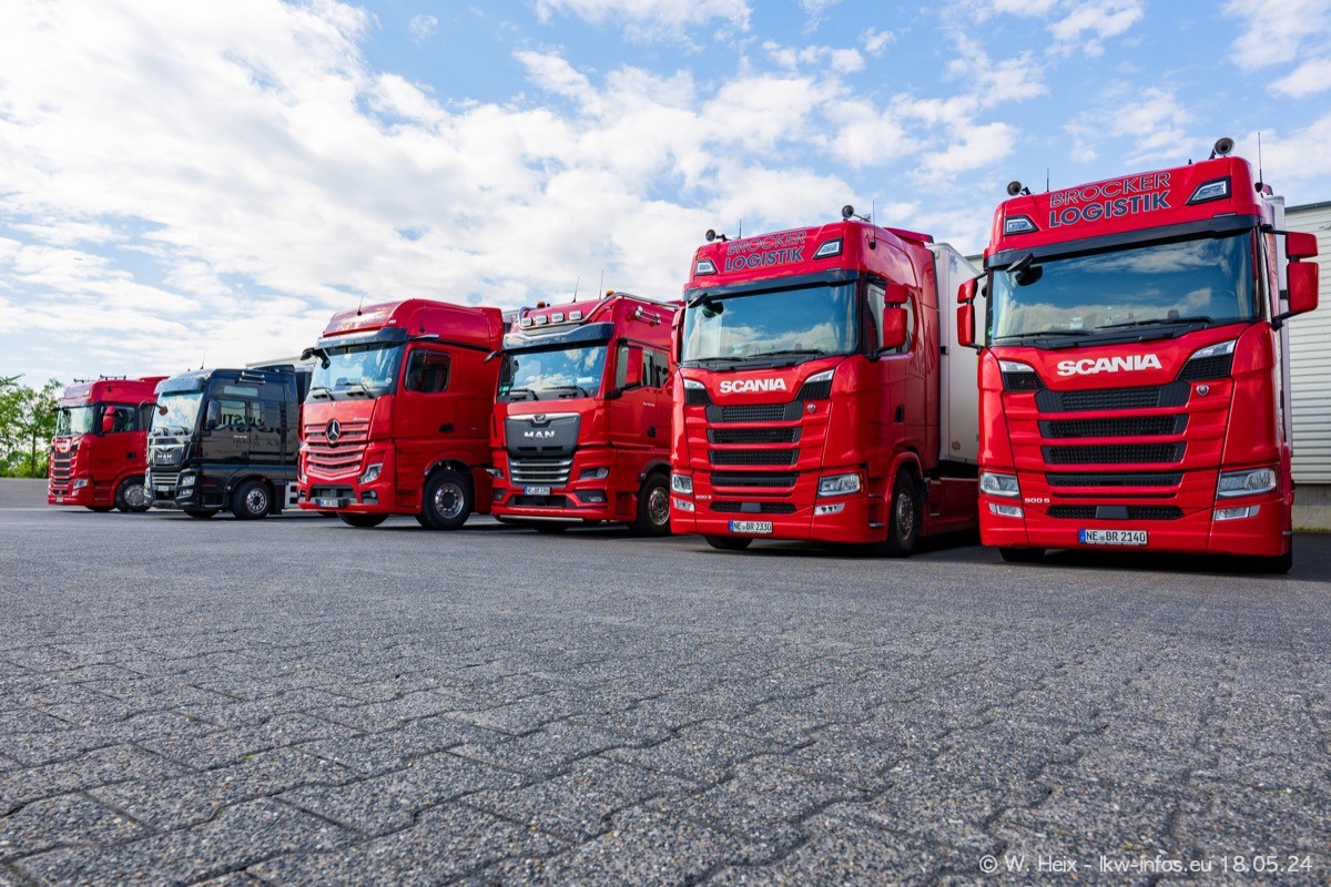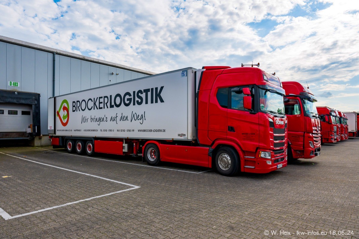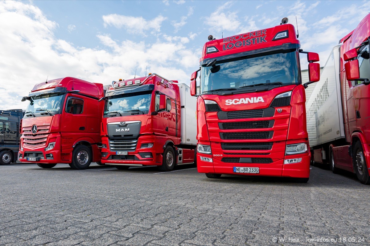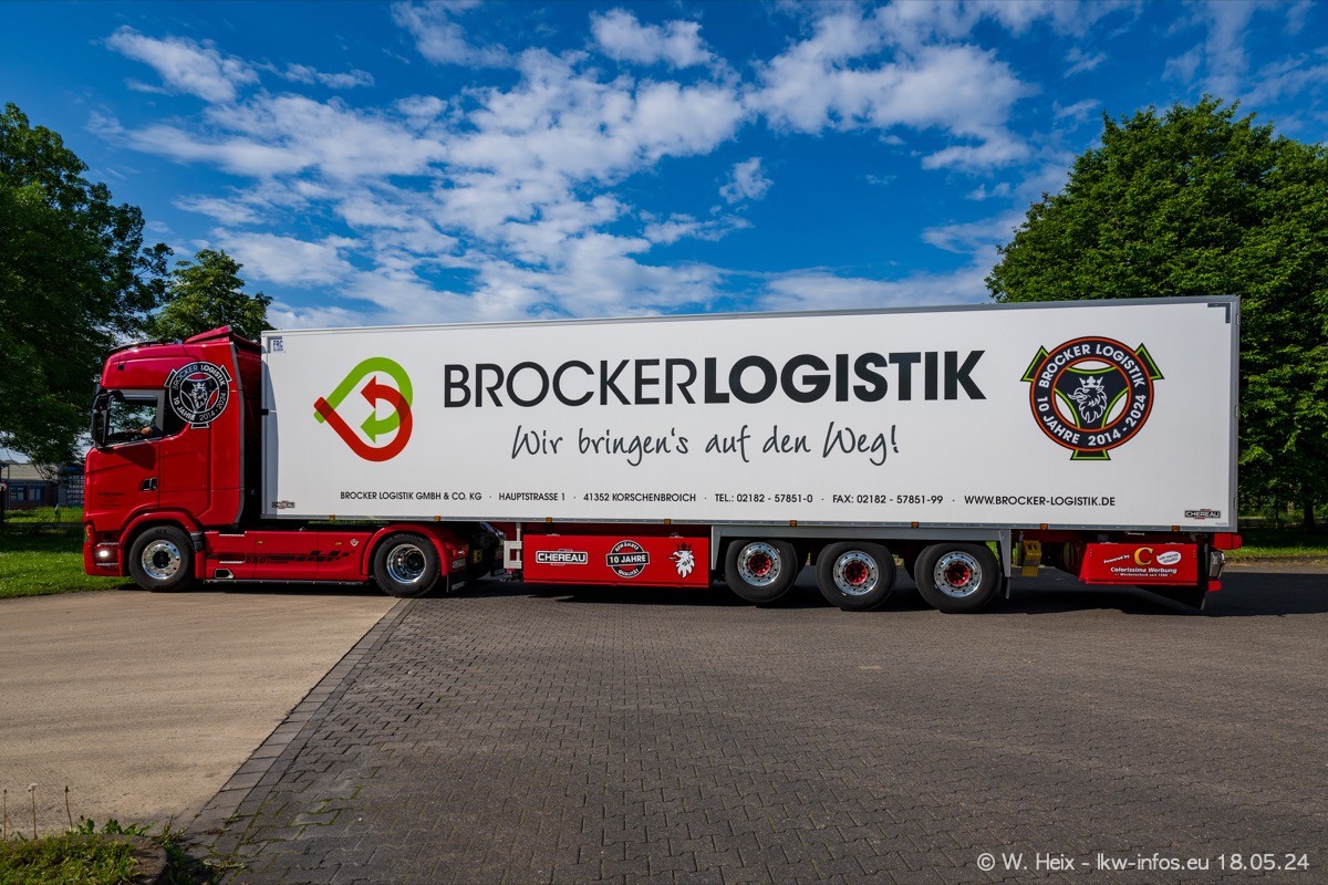 Nach über fünf Jahren war ich wieder bei Brocker Logistik in Korschenbroich. Diesmal wurde ich zu einem kleinen Fotoshooting eingeladen. Am späten Samstag Nachmittag war fast der komplette Fuhrpark zuhause. Das sind aktuell 38 LKW. Zwei fehlten. Zum 10-jährigen Firmenjubiläum wurde im März ein SCANIA 660 S V8 NextGen gekauft. Dieser ist etwas aufwändiger gestaltet als der restliche Fuhrpark, der sich aber auch sehen lassen kann. Auf dem weitläufigen Gelände gab es genug schöne Plätze für dieses kleine Fotoshooting.