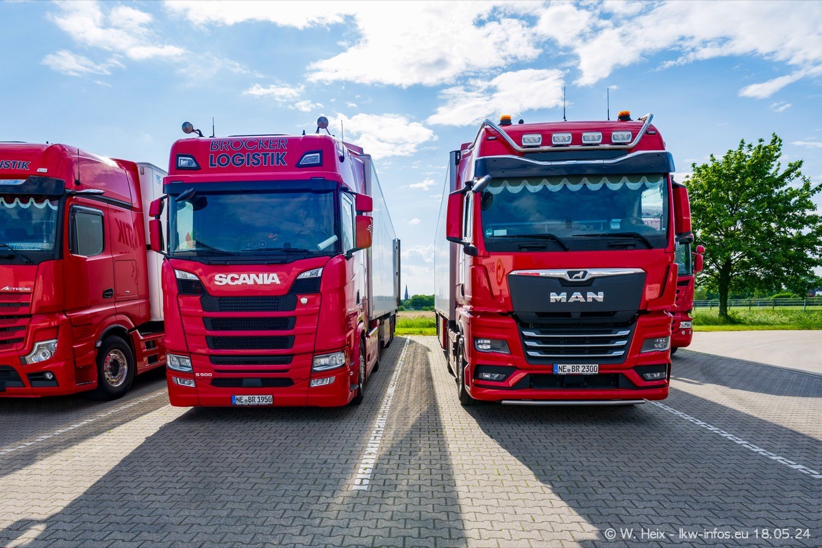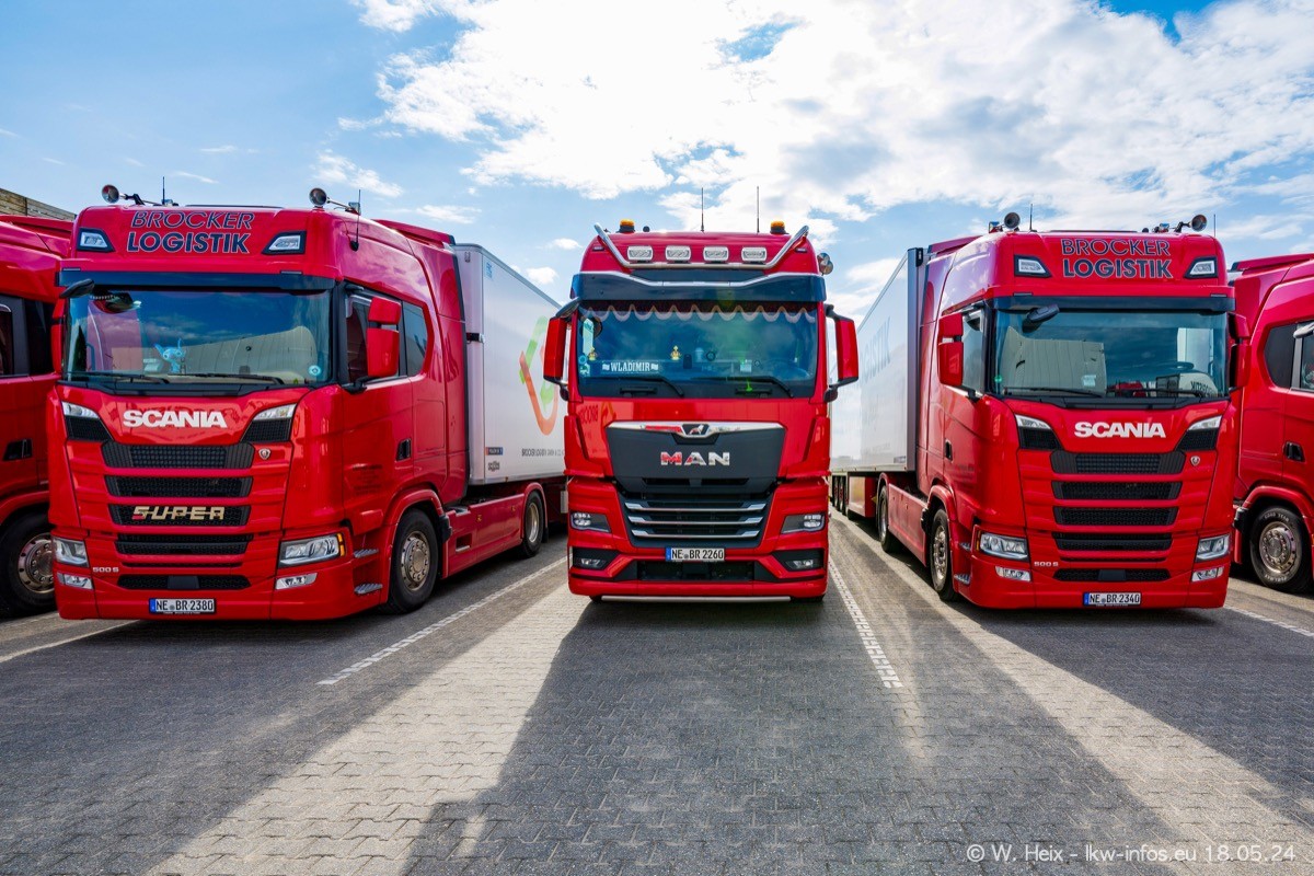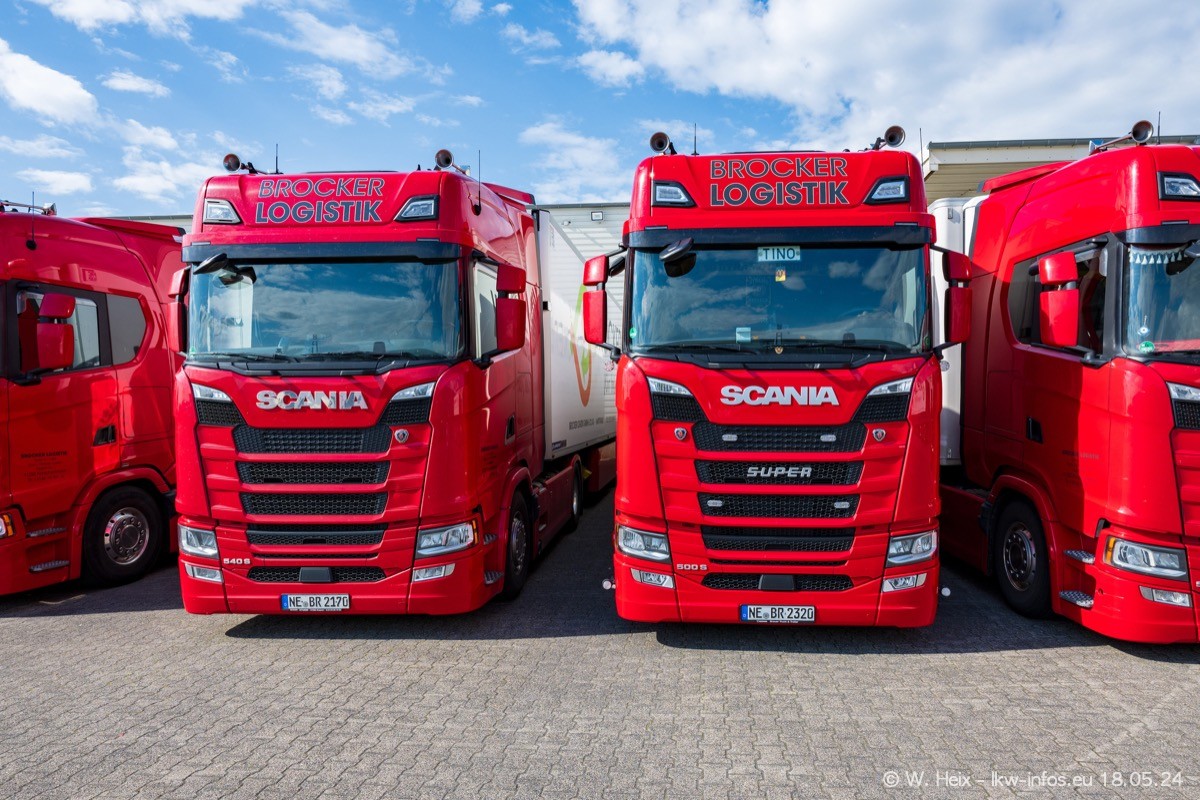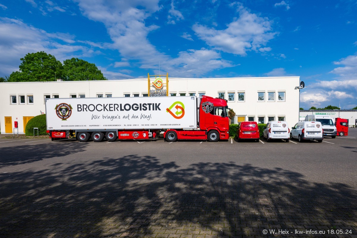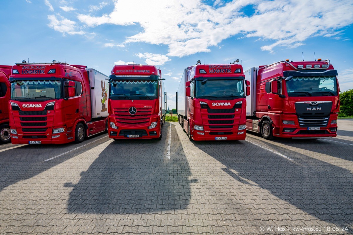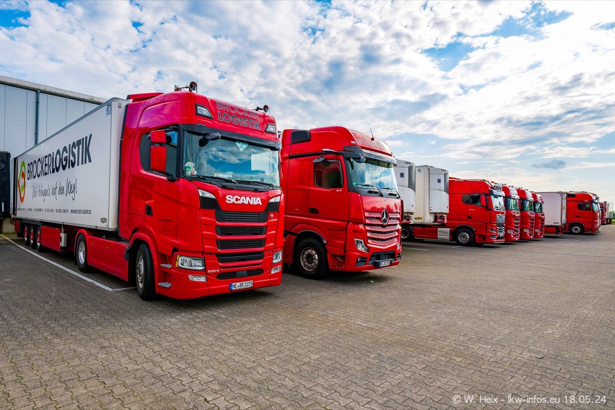 Nach über fünf Jahren war ich wieder bei Brocker Logistik in Korschenbroich. Diesmal wurde ich zu einem kleinen Fotoshooting eingeladen. Am späten Samstag Nachmittag war fast der komplette Fuhrpark zuhause. Das sind aktuell 38 LKW. Zwei fehlten. Zum 10-jährigen Firmenjubiläum wurde im März ein SCANIA 660 S V8 NextGen gekauft. Dieser ist etwas aufwändiger gestaltet als der restliche Fuhrpark, der sich aber auch sehen lassen kann. Auf dem weitläufigen Gelände gab es genug schöne Plätze für dieses kleine Fotoshooting.