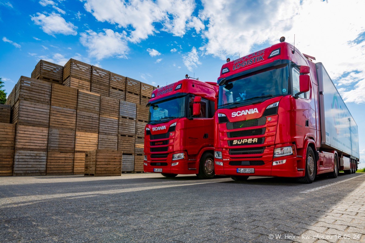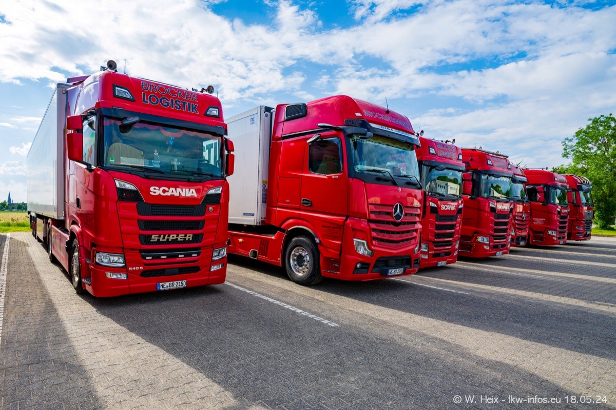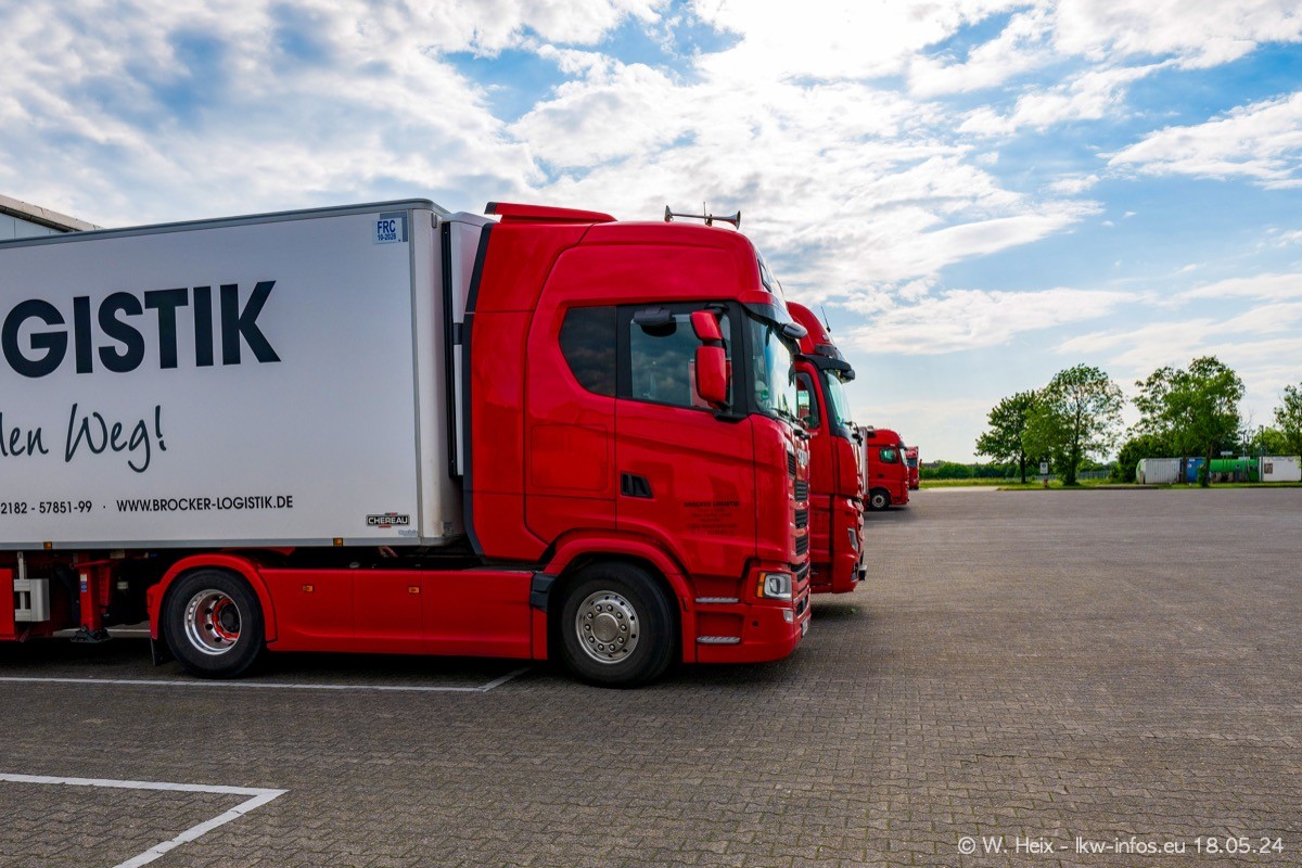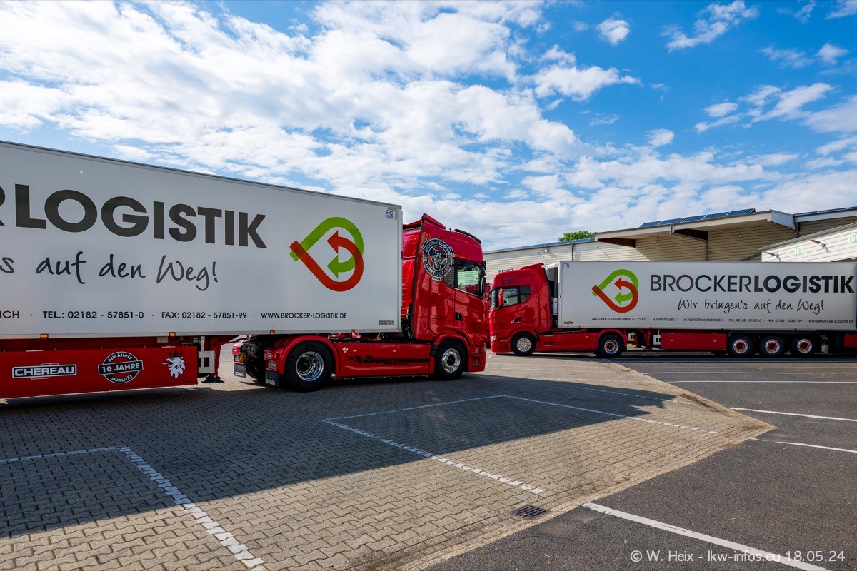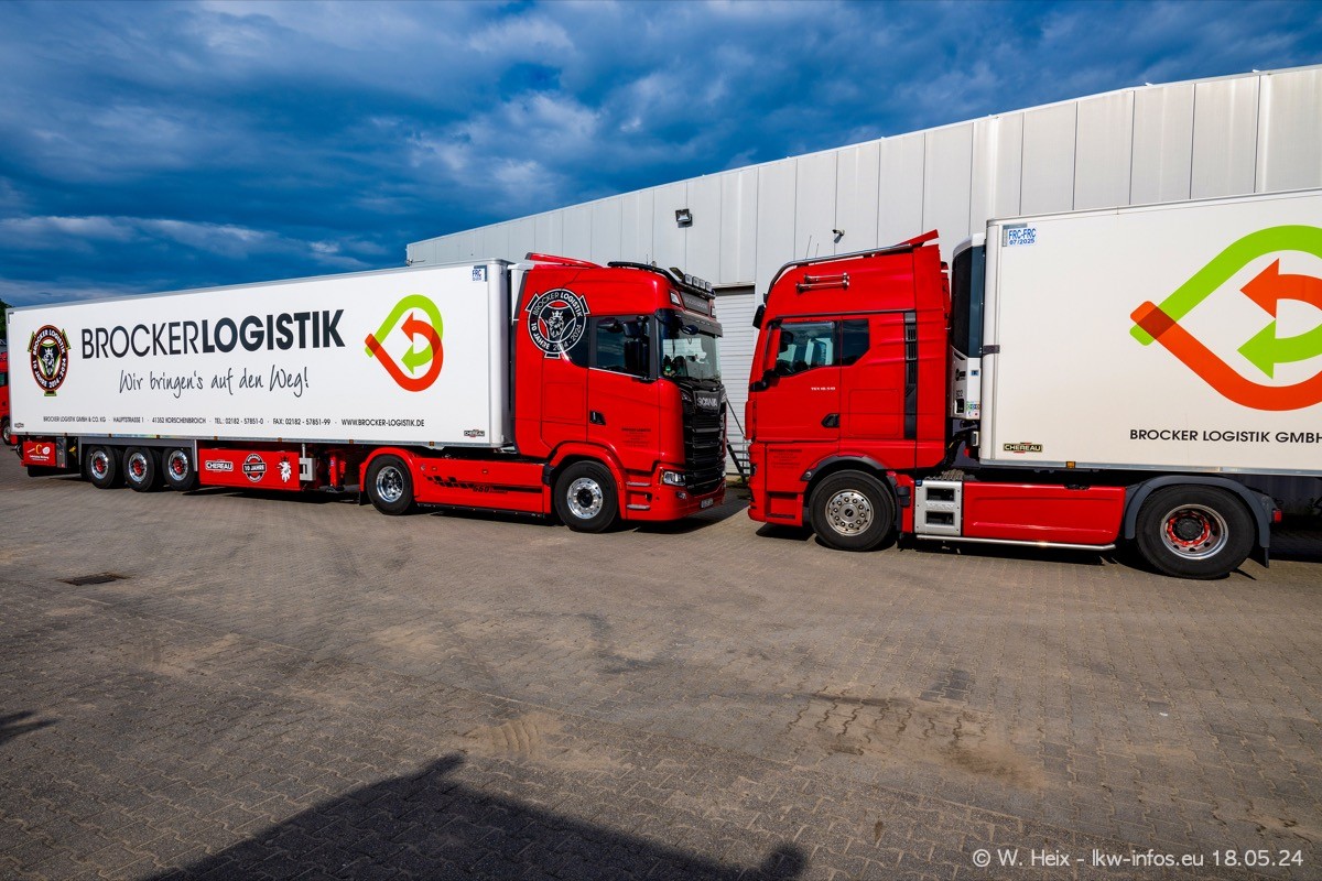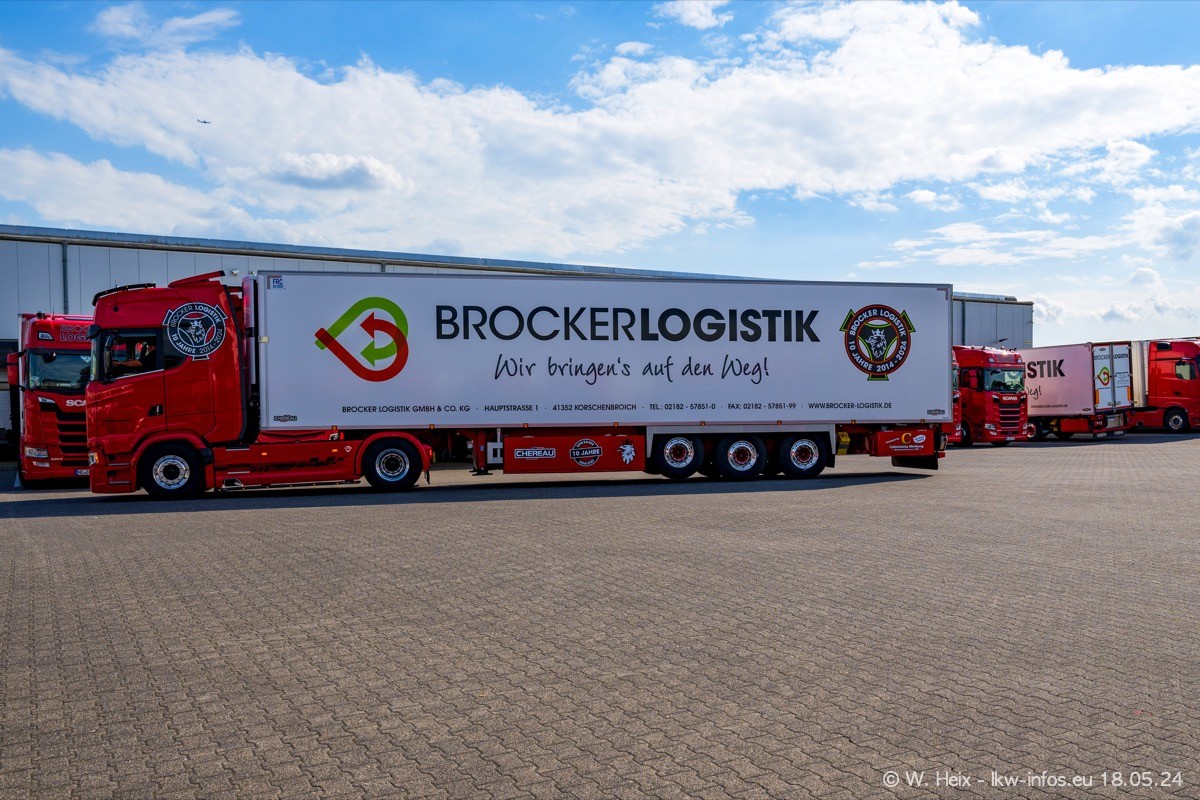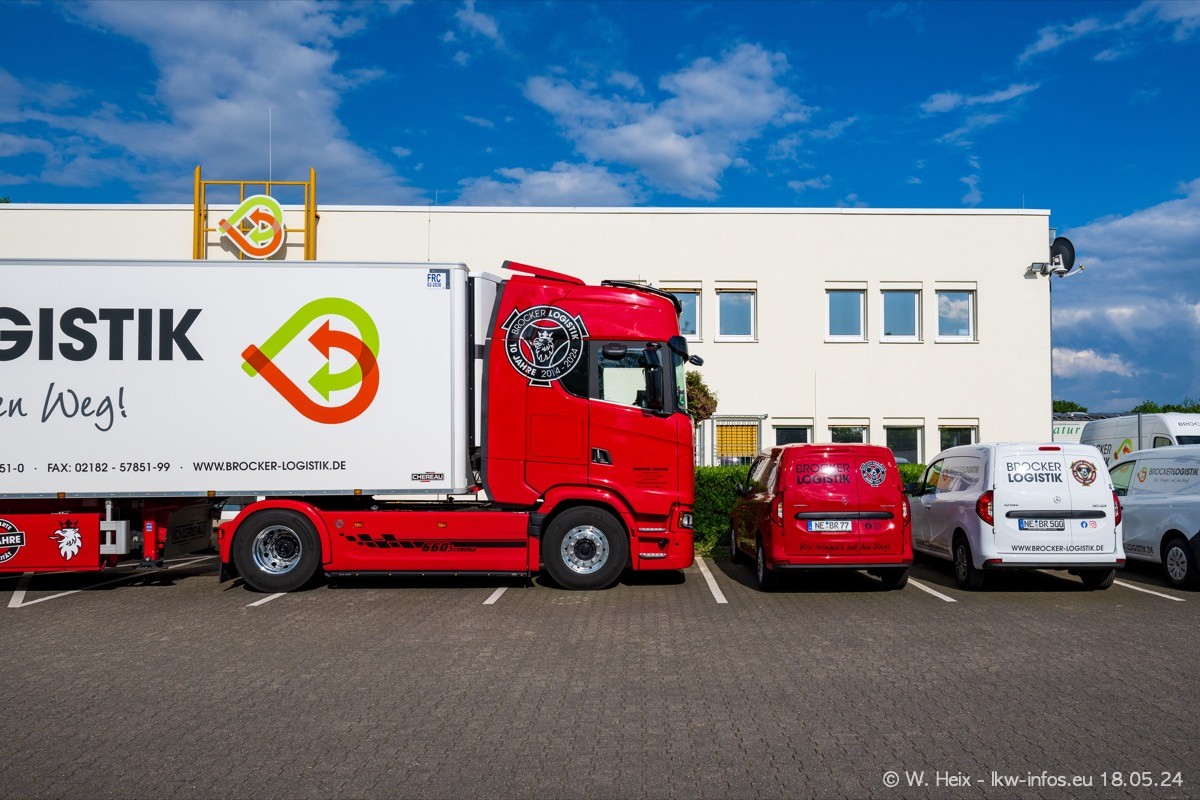 Nach über fünf Jahren war ich wieder bei Brocker Logistik in Korschenbroich. Diesmal wurde ich zu einem kleinen Fotoshooting eingeladen. Am späten Samstag Nachmittag war fast der komplette Fuhrpark zuhause. Das sind aktuell 38 LKW. Zwei fehlten. Zum 10-jährigen Firmenjubiläum wurde im März ein SCANIA 660 S V8 NextGen gekauft. Dieser ist etwas aufwändiger gestaltet als der restliche Fuhrpark, der sich aber auch sehen lassen kann. Auf dem weitläufigen Gelände gab es genug schöne Plätze für dieses kleine Fotoshooting.