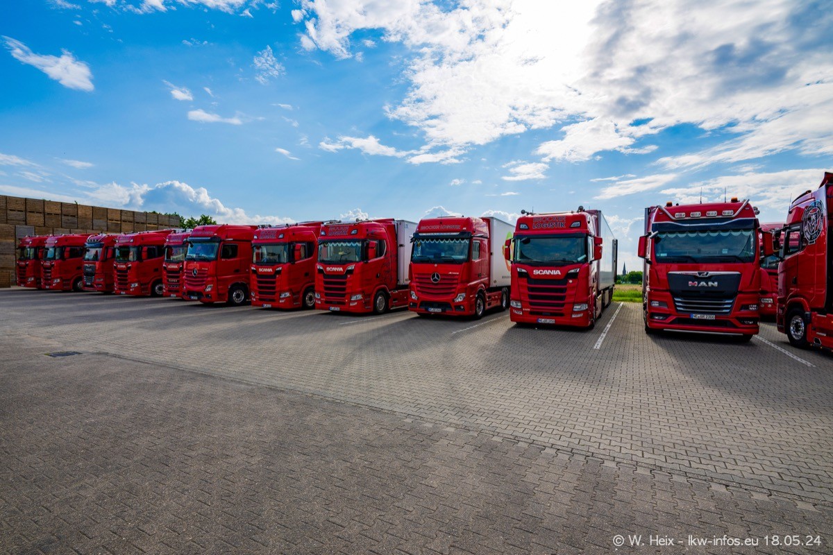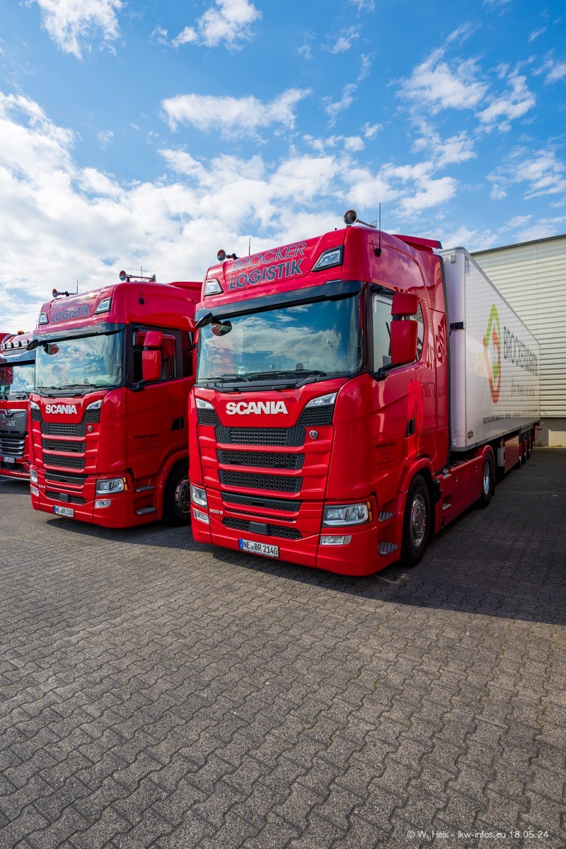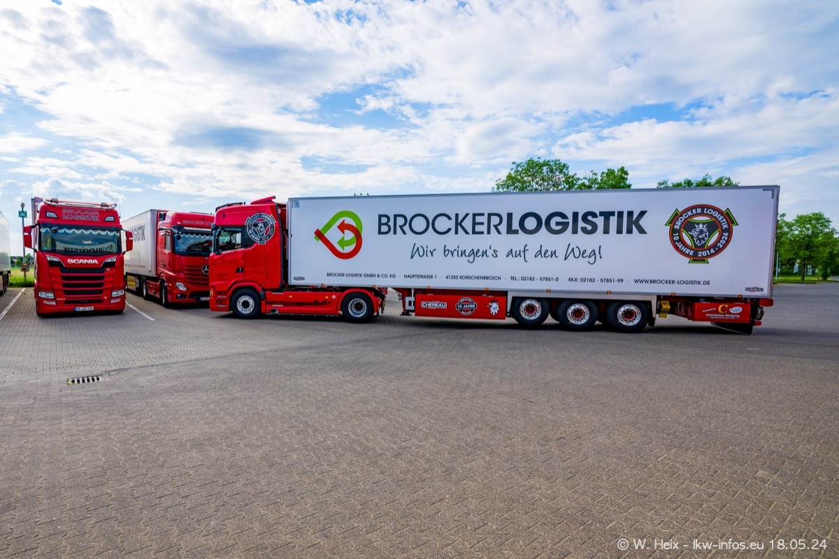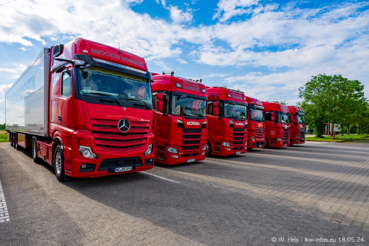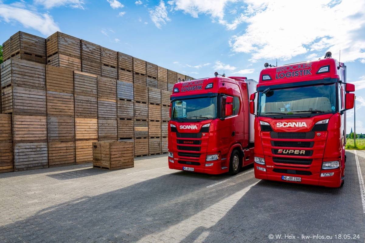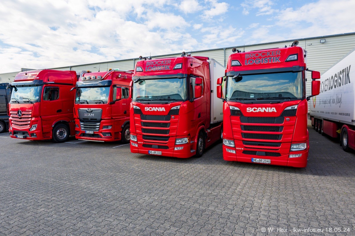 Nach über fünf Jahren war ich wieder bei Brocker Logistik in Korschenbroich. Diesmal wurde ich zu einem kleinen Fotoshooting eingeladen. Am späten Samstag Nachmittag war fast der komplette Fuhrpark zuhause. Das sind aktuell 38 LKW. Zwei fehlten. Zum 10-jährigen Firmenjubiläum wurde im März ein SCANIA 660 S V8 NextGen gekauft. Dieser ist etwas aufwändiger gestaltet als der restliche Fuhrpark, der sich aber auch sehen lassen kann. Auf dem weitläufigen Gelände gab es genug schöne Plätze für dieses kleine Fotoshooting.