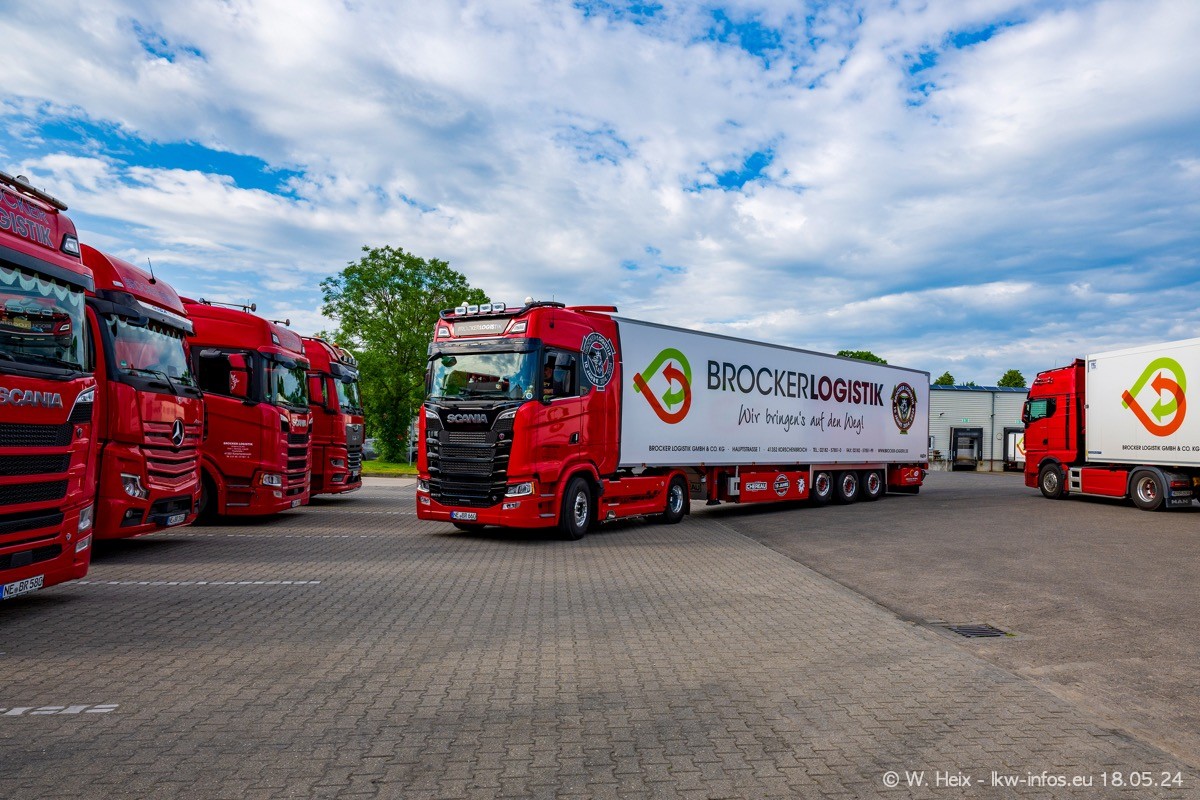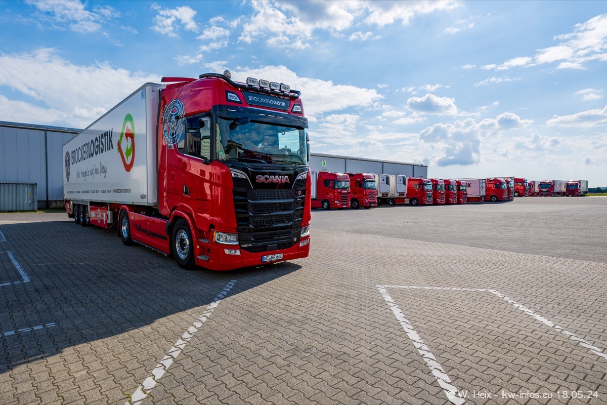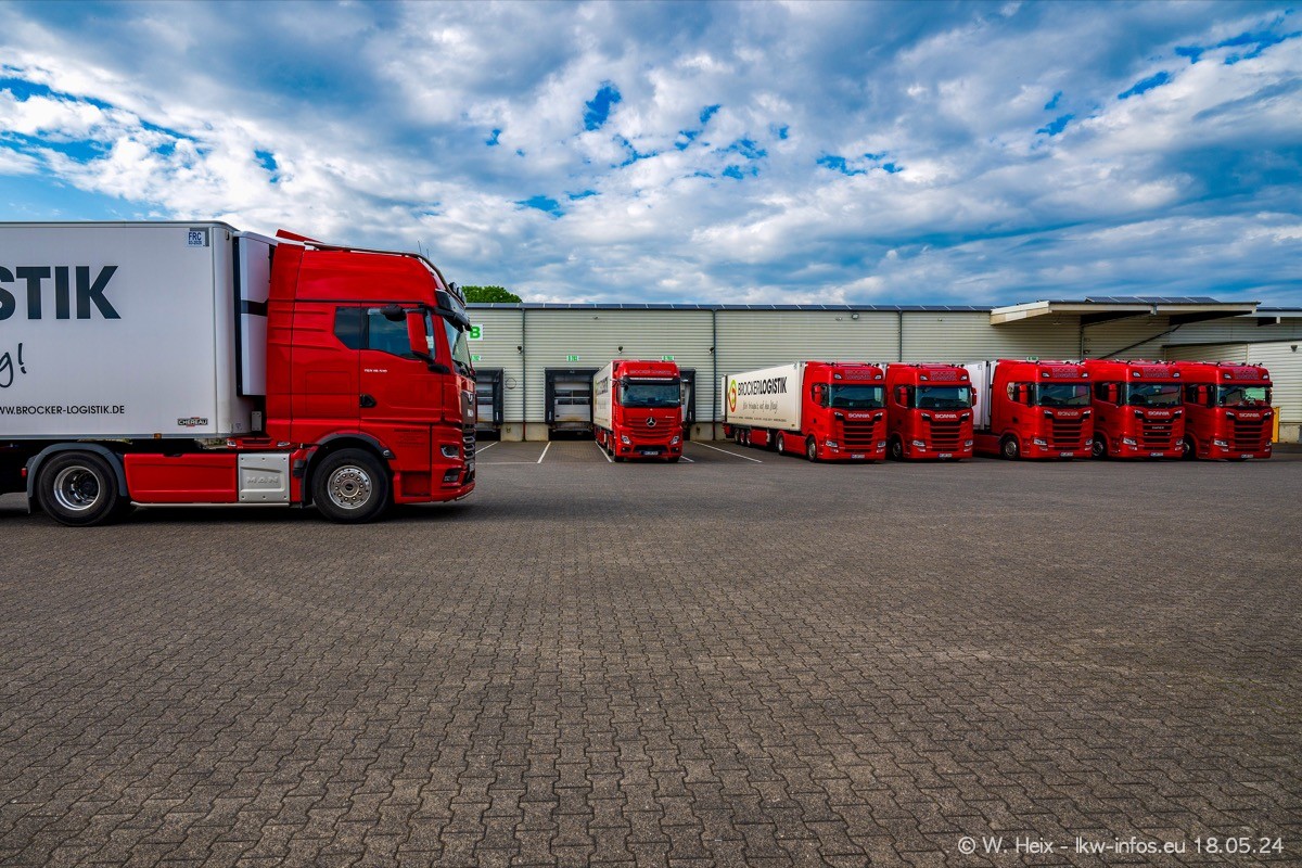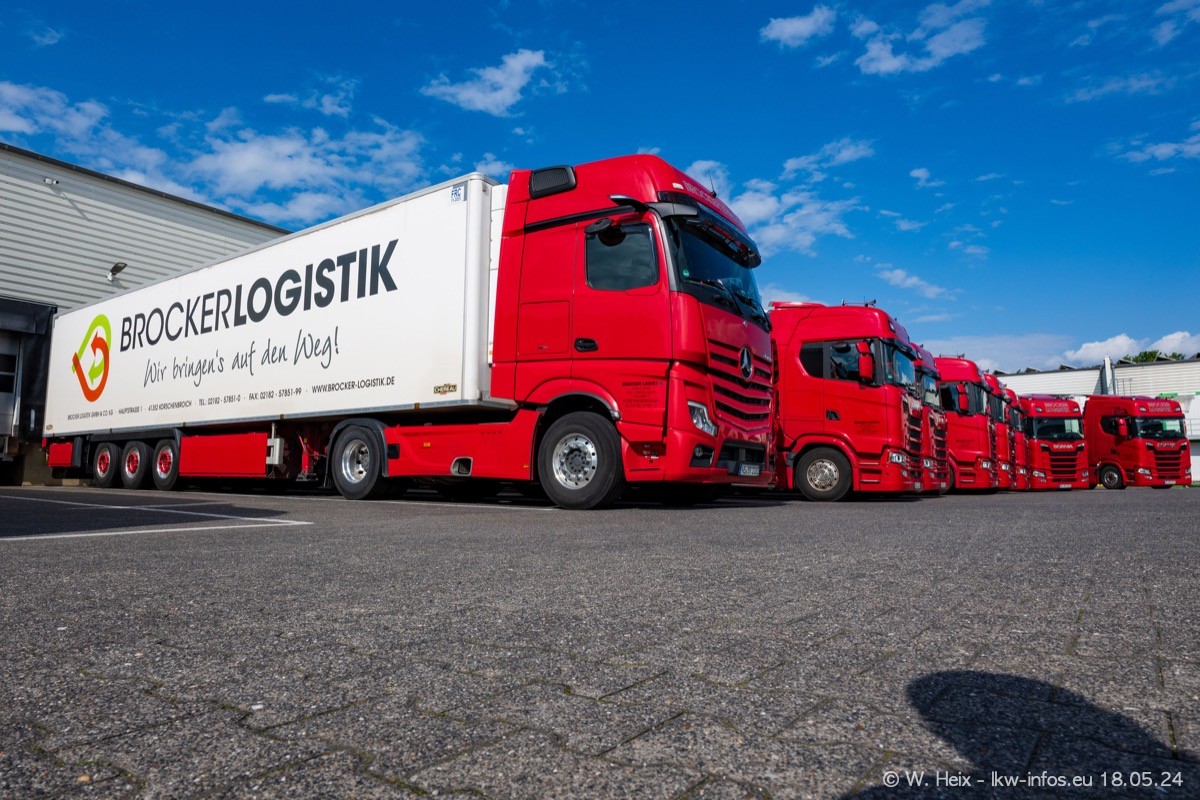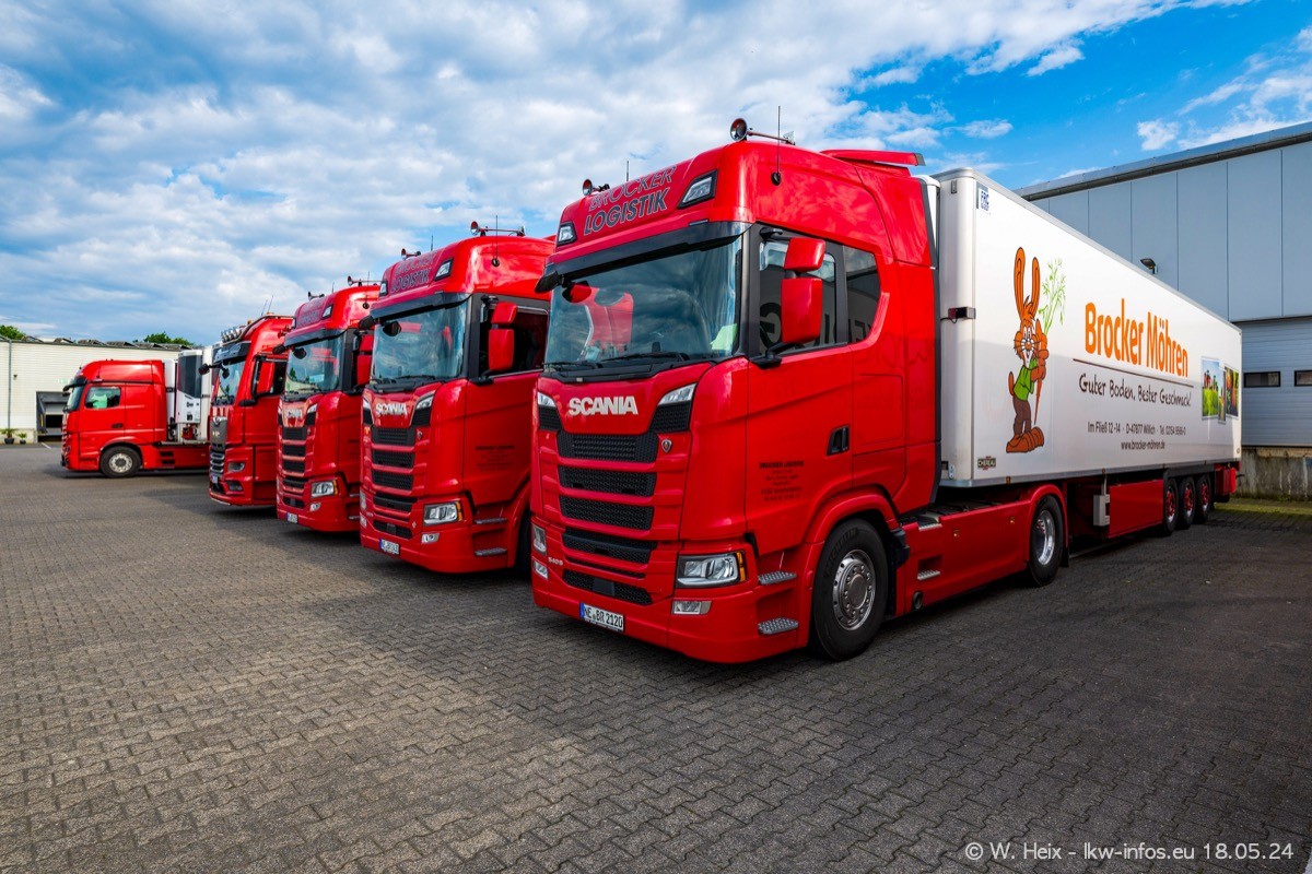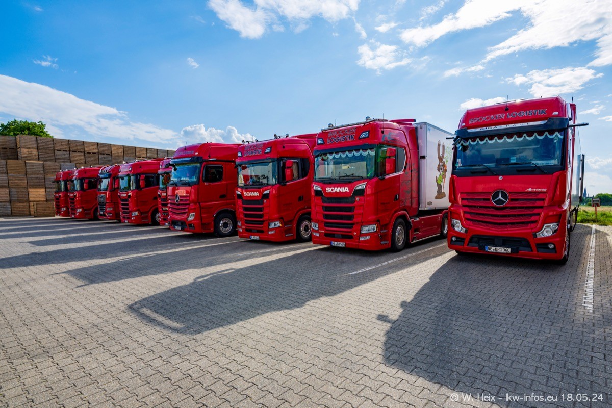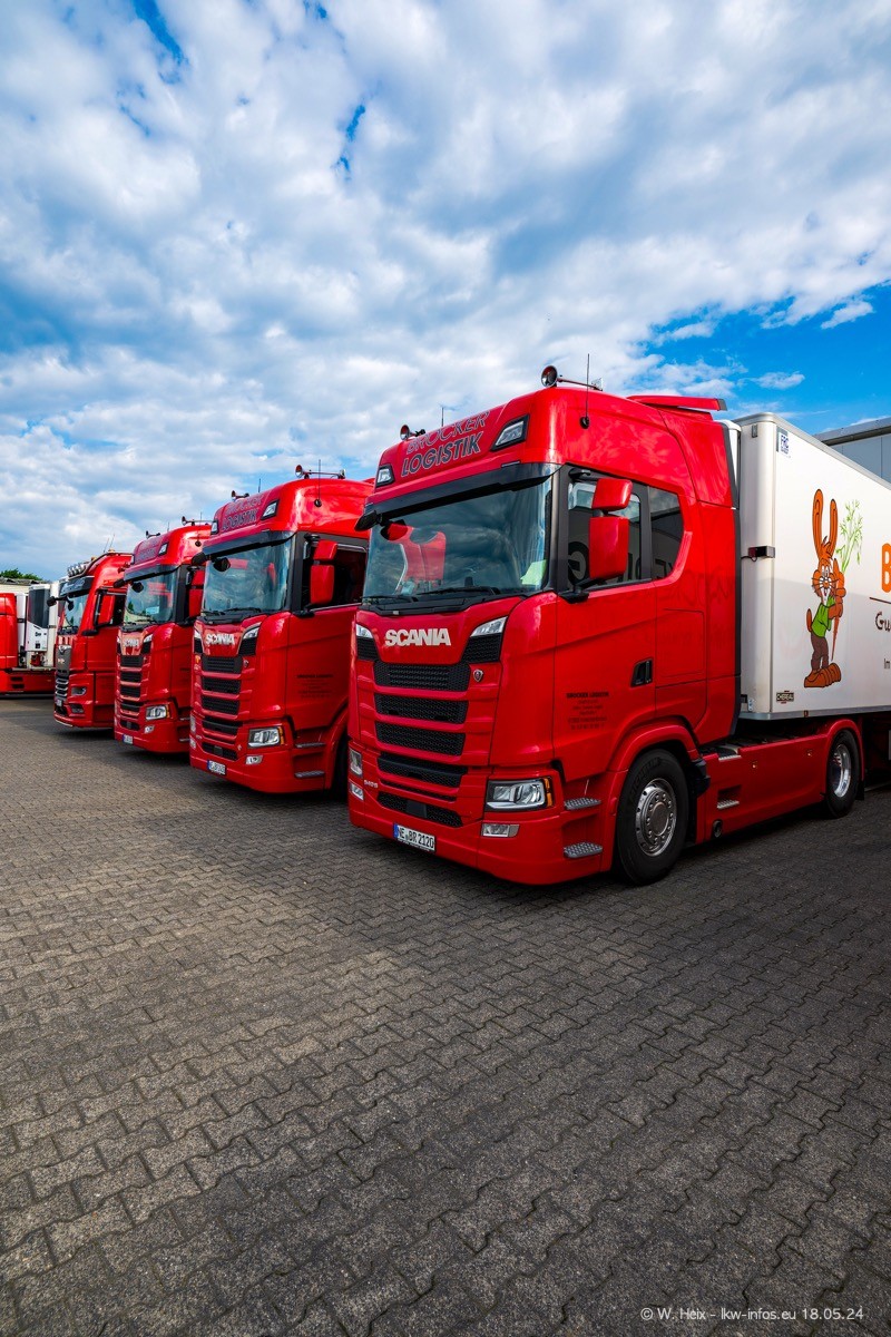 Nach über fünf Jahren war ich wieder bei Brocker Logistik in Korschenbroich. Diesmal wurde ich zu einem kleinen Fotoshooting eingeladen. Am späten Samstag Nachmittag war fast der komplette Fuhrpark zuhause. Das sind aktuell 38 LKW. Zwei fehlten. Zum 10-jährigen Firmenjubiläum wurde im März ein SCANIA 660 S V8 NextGen gekauft. Dieser ist etwas aufwändiger gestaltet als der restliche Fuhrpark, der sich aber auch sehen lassen kann. Auf dem weitläufigen Gelände gab es genug schöne Plätze für dieses kleine Fotoshooting.
