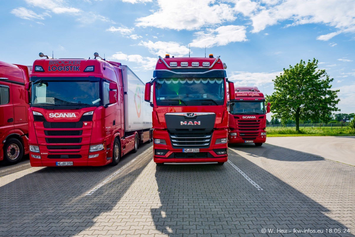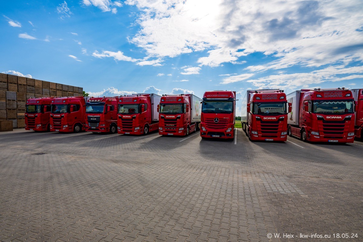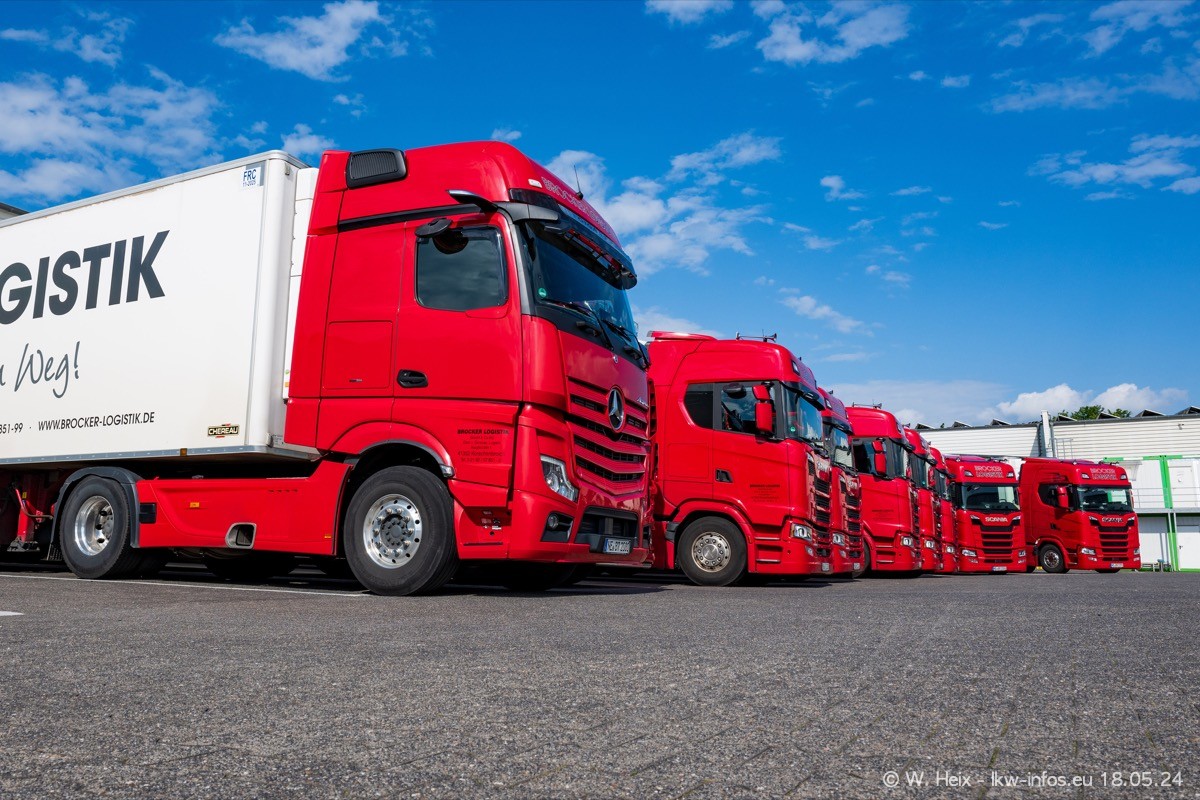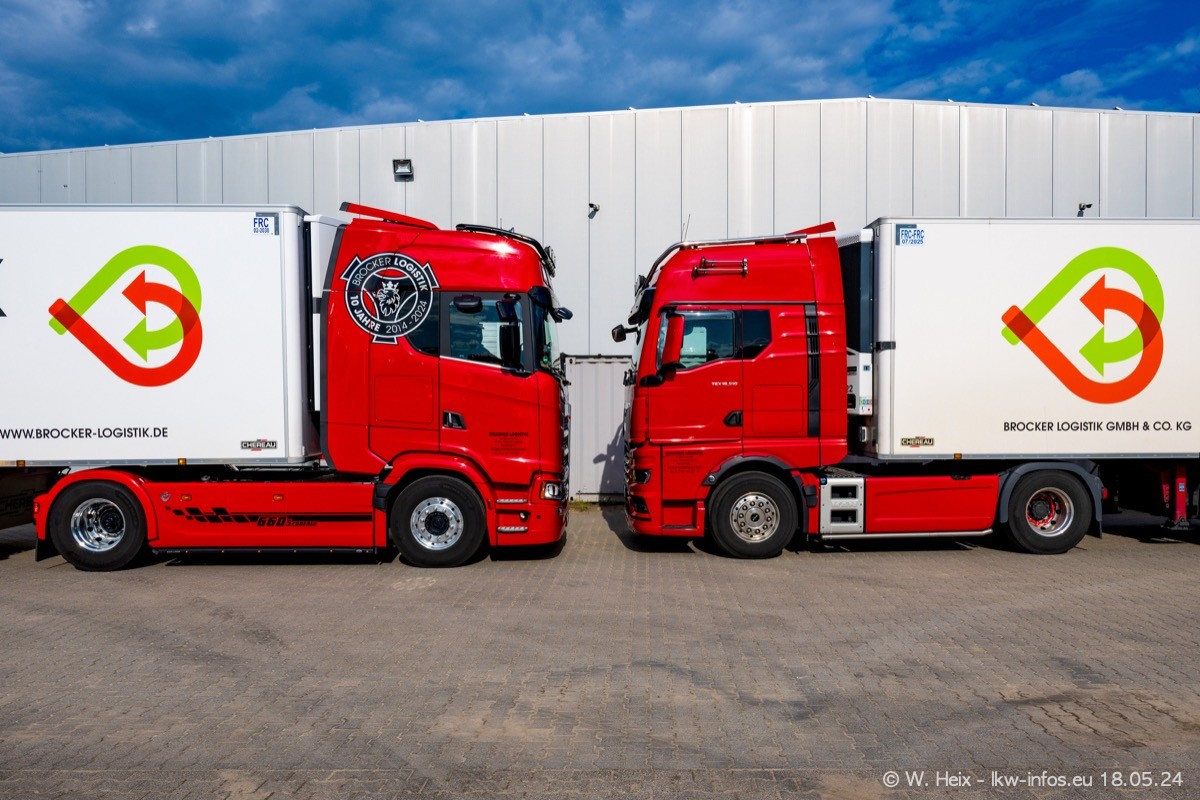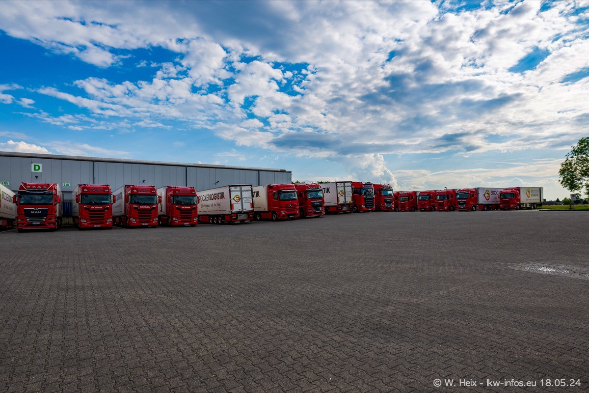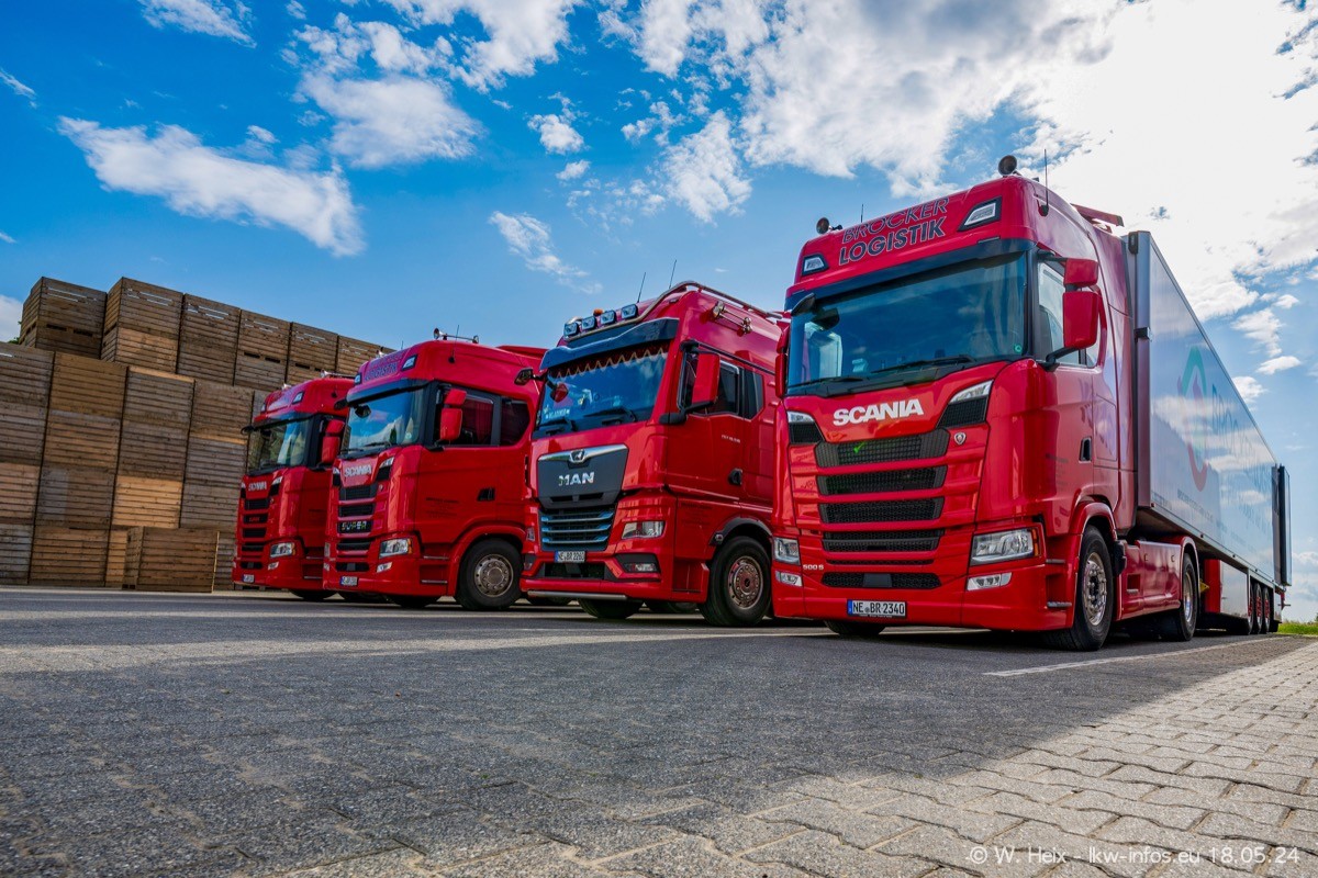 Nach über fünf Jahren war ich wieder bei Brocker Logistik in Korschenbroich. Diesmal wurde ich zu einem kleinen Fotoshooting eingeladen. Am späten Samstag Nachmittag war fast der komplette Fuhrpark zuhause. Das sind aktuell 38 LKW. Zwei fehlten. Zum 10-jährigen Firmenjubiläum wurde im März ein SCANIA 660 S V8 NextGen gekauft. Dieser ist etwas aufwändiger gestaltet als der restliche Fuhrpark, der sich aber auch sehen lassen kann. Auf dem weitläufigen Gelände gab es genug schöne Plätze für dieses kleine Fotoshooting.