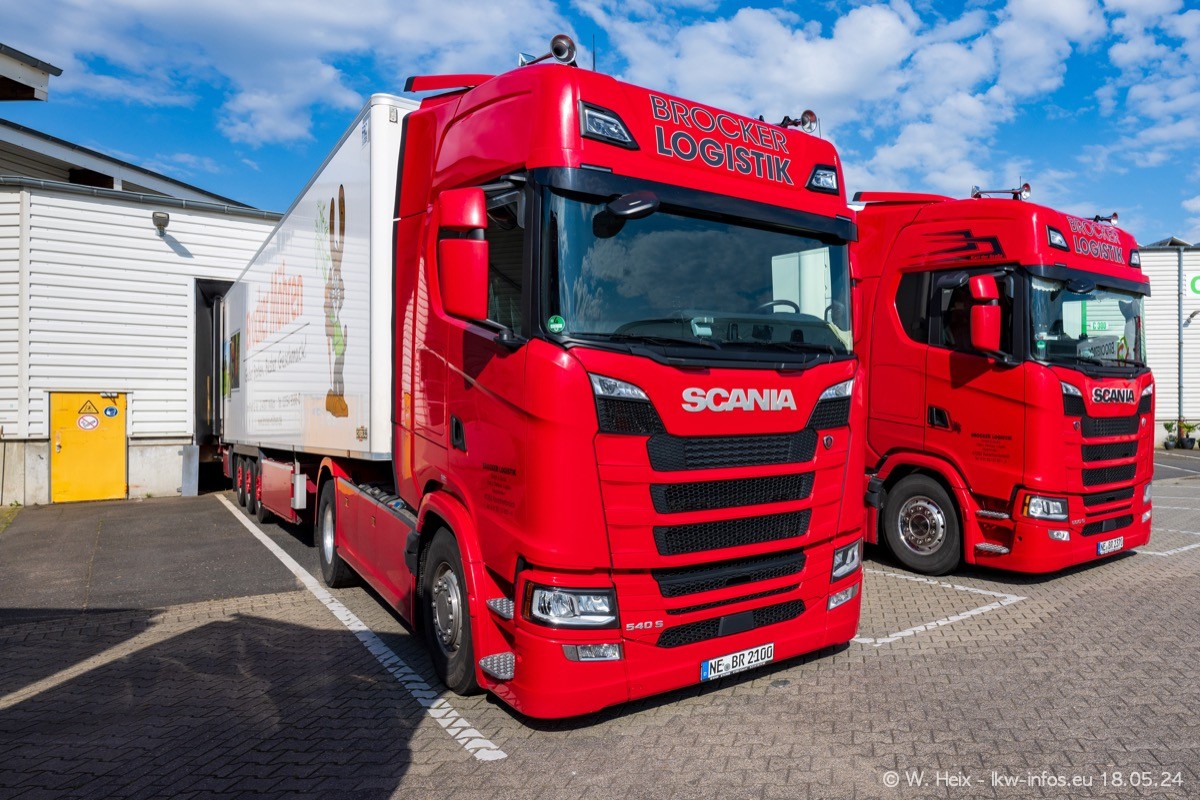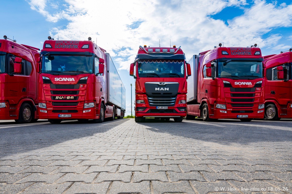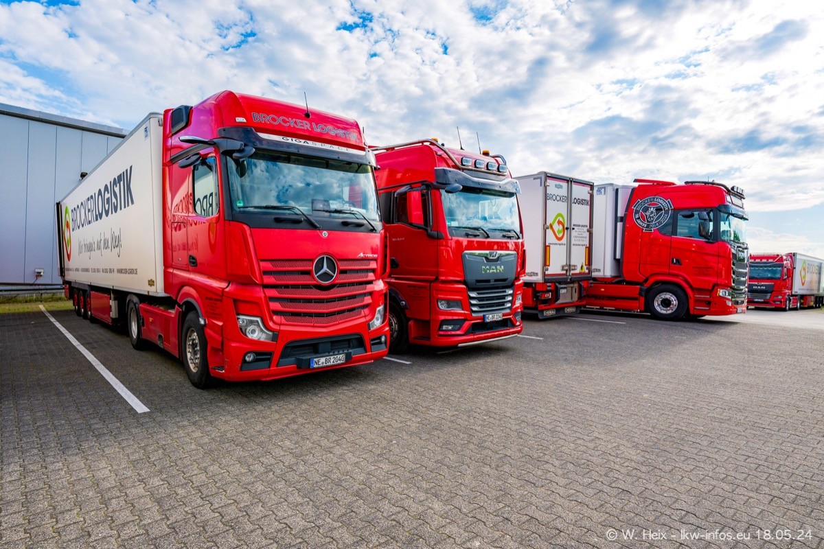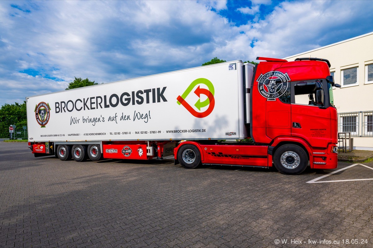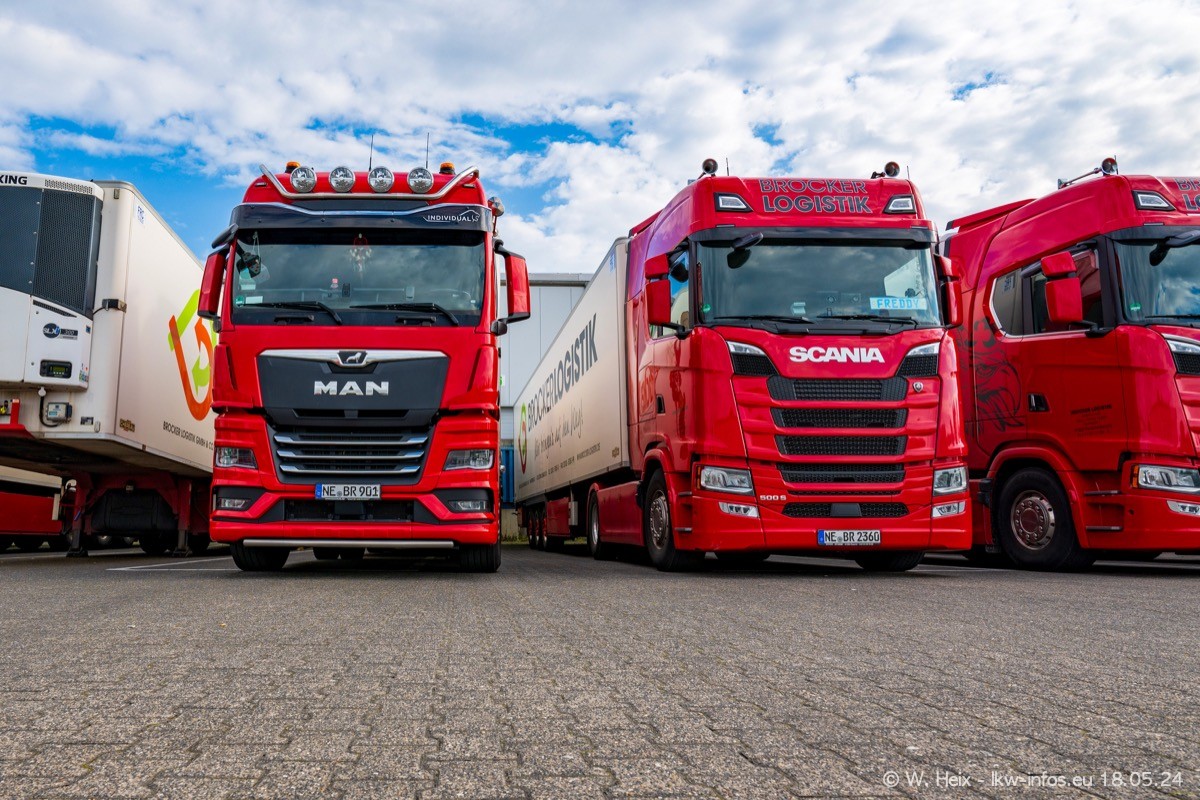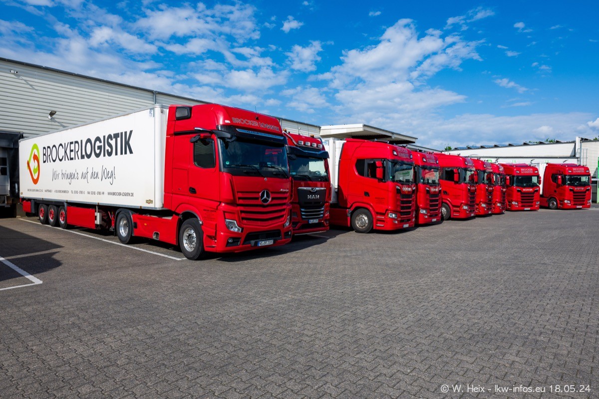 Nach über fünf Jahren war ich wieder bei Brocker Logistik in Korschenbroich. Diesmal wurde ich zu einem kleinen Fotoshooting eingeladen. Am späten Samstag Nachmittag war fast der komplette Fuhrpark zuhause. Das sind aktuell 38 LKW. Zwei fehlten. Zum 10-jährigen Firmenjubiläum wurde im März ein SCANIA 660 S V8 NextGen gekauft. Dieser ist etwas aufwändiger gestaltet als der restliche Fuhrpark, der sich aber auch sehen lassen kann. Auf dem weitläufigen Gelände gab es genug schöne Plätze für dieses kleine Fotoshooting.