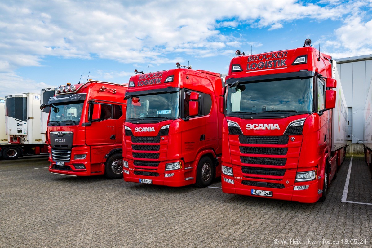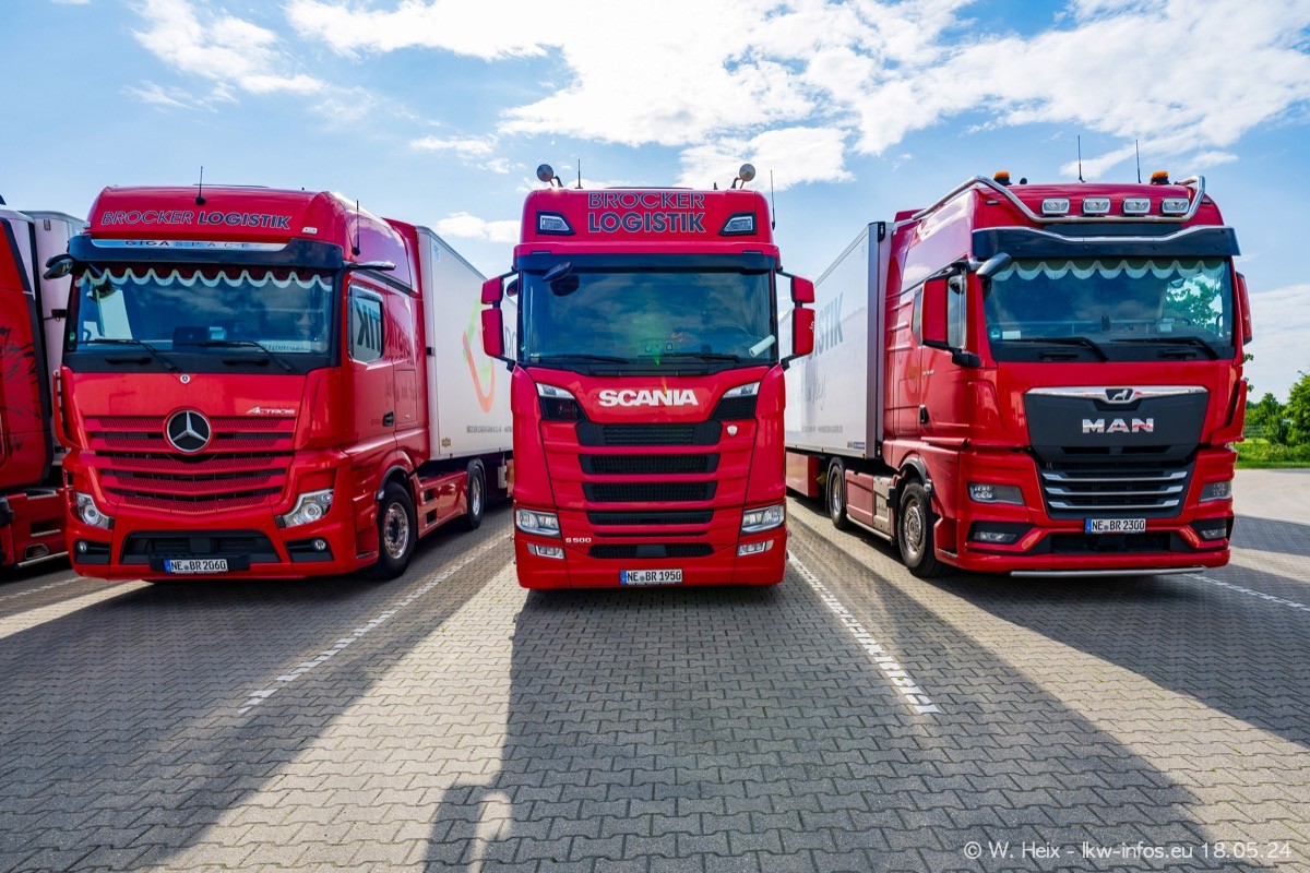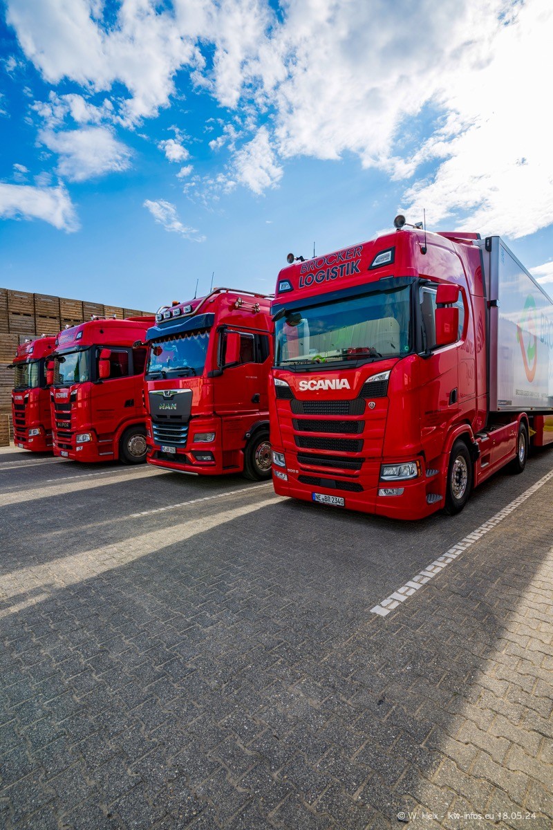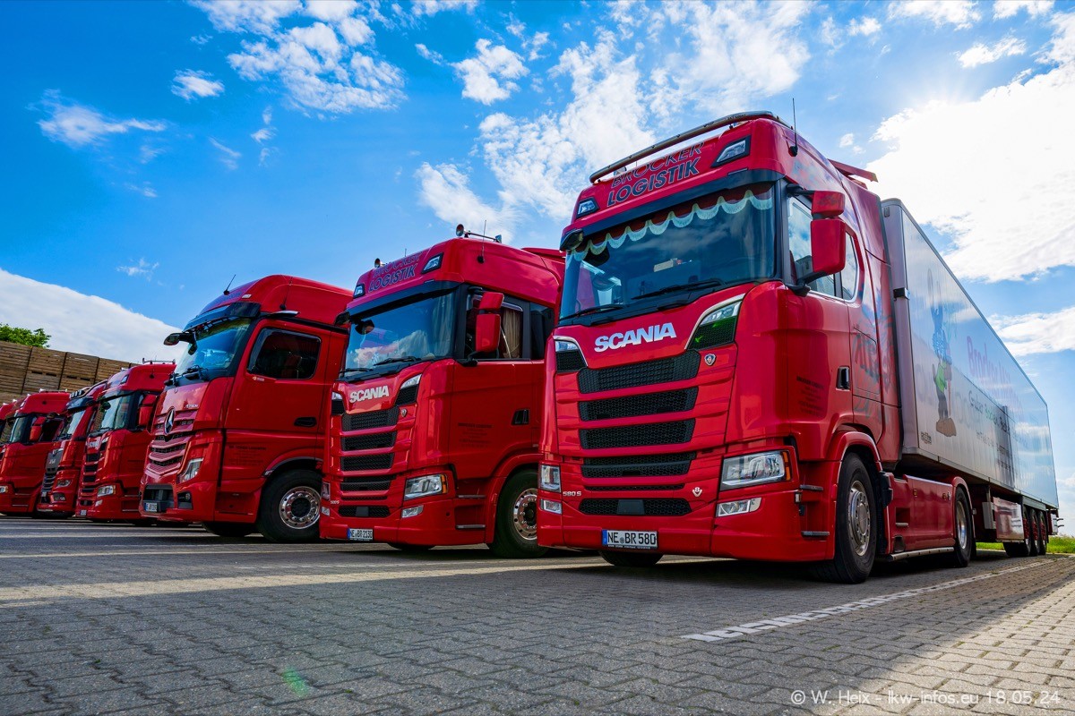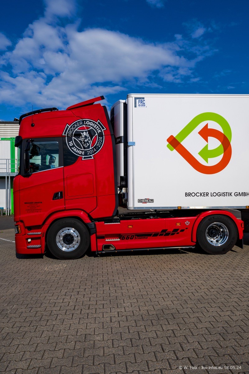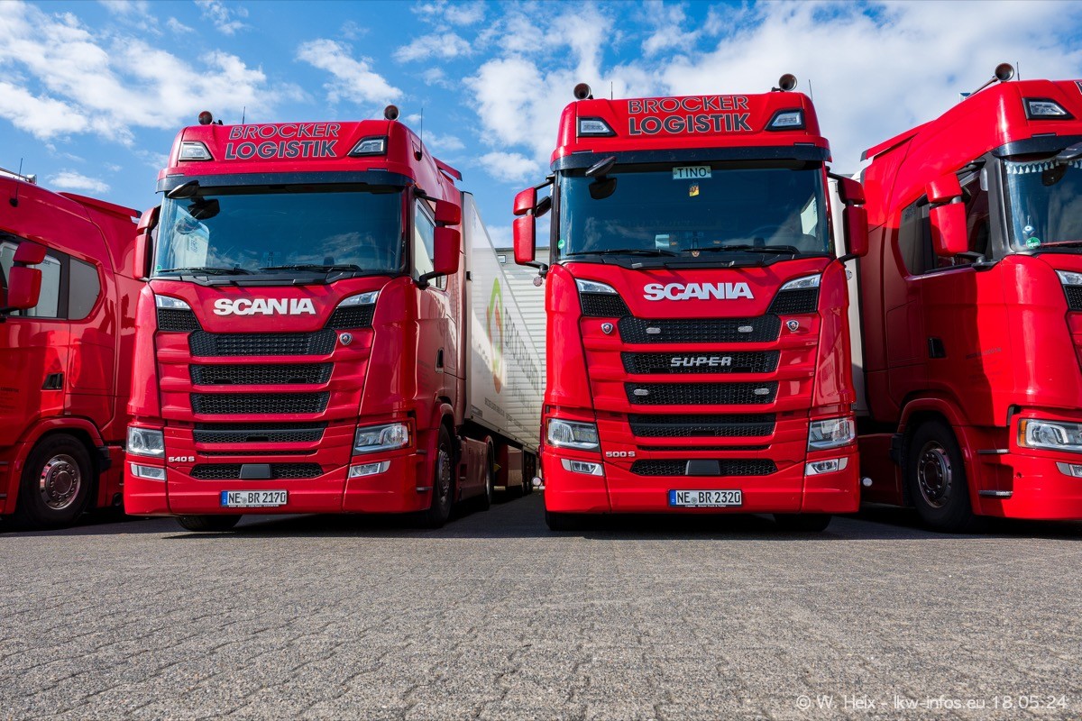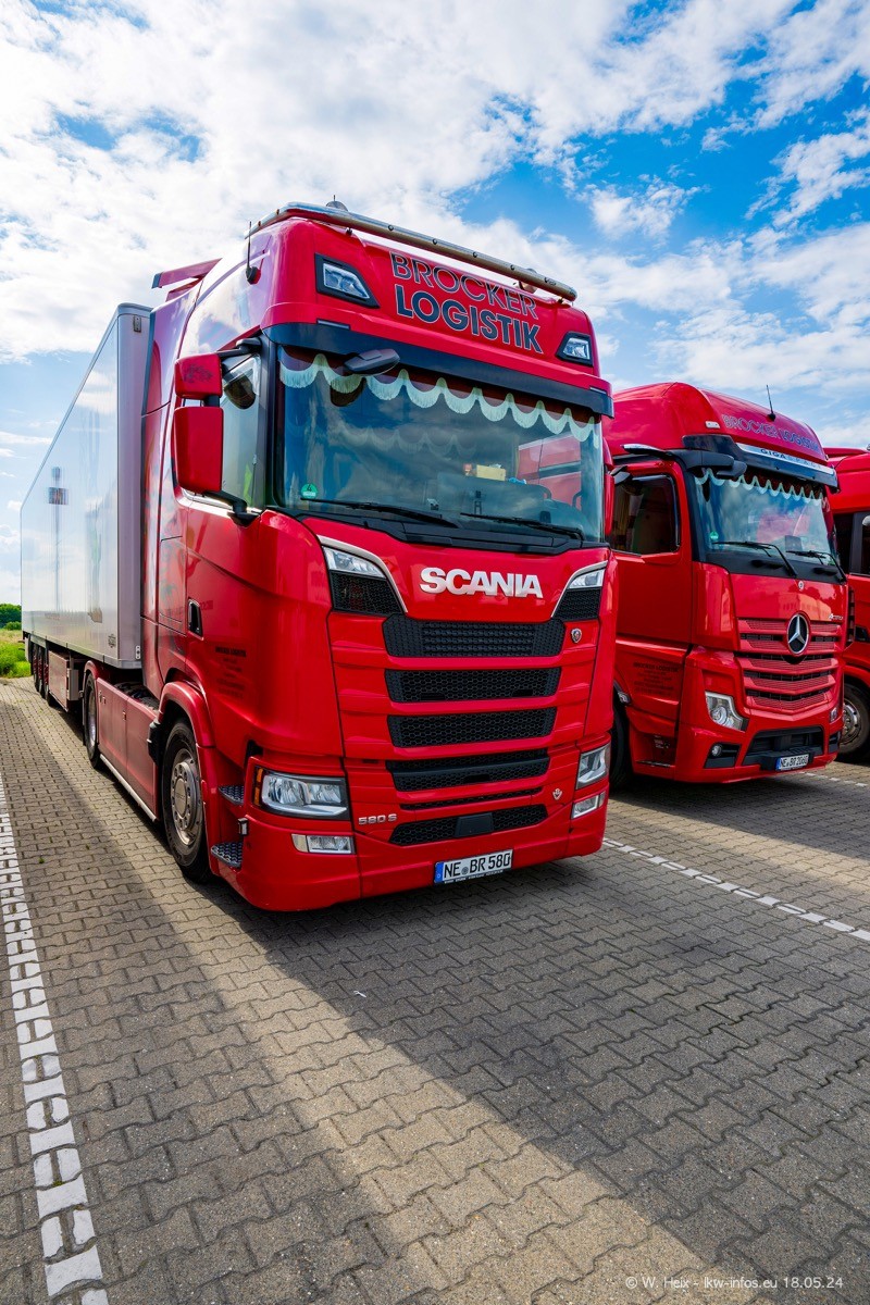 Nach über fünf Jahren war ich wieder bei Brocker Logistik in Korschenbroich. Diesmal wurde ich zu einem kleinen Fotoshooting eingeladen. Am späten Samstag Nachmittag war fast der komplette Fuhrpark zuhause. Das sind aktuell 38 LKW. Zwei fehlten. Zum 10-jährigen Firmenjubiläum wurde im März ein SCANIA 660 S V8 NextGen gekauft. Dieser ist etwas aufwändiger gestaltet als der restliche Fuhrpark, der sich aber auch sehen lassen kann. Auf dem weitläufigen Gelände gab es genug schöne Plätze für dieses kleine Fotoshooting.