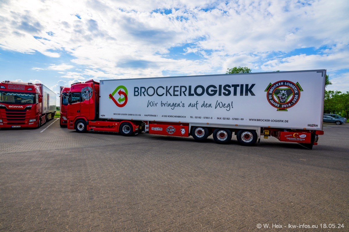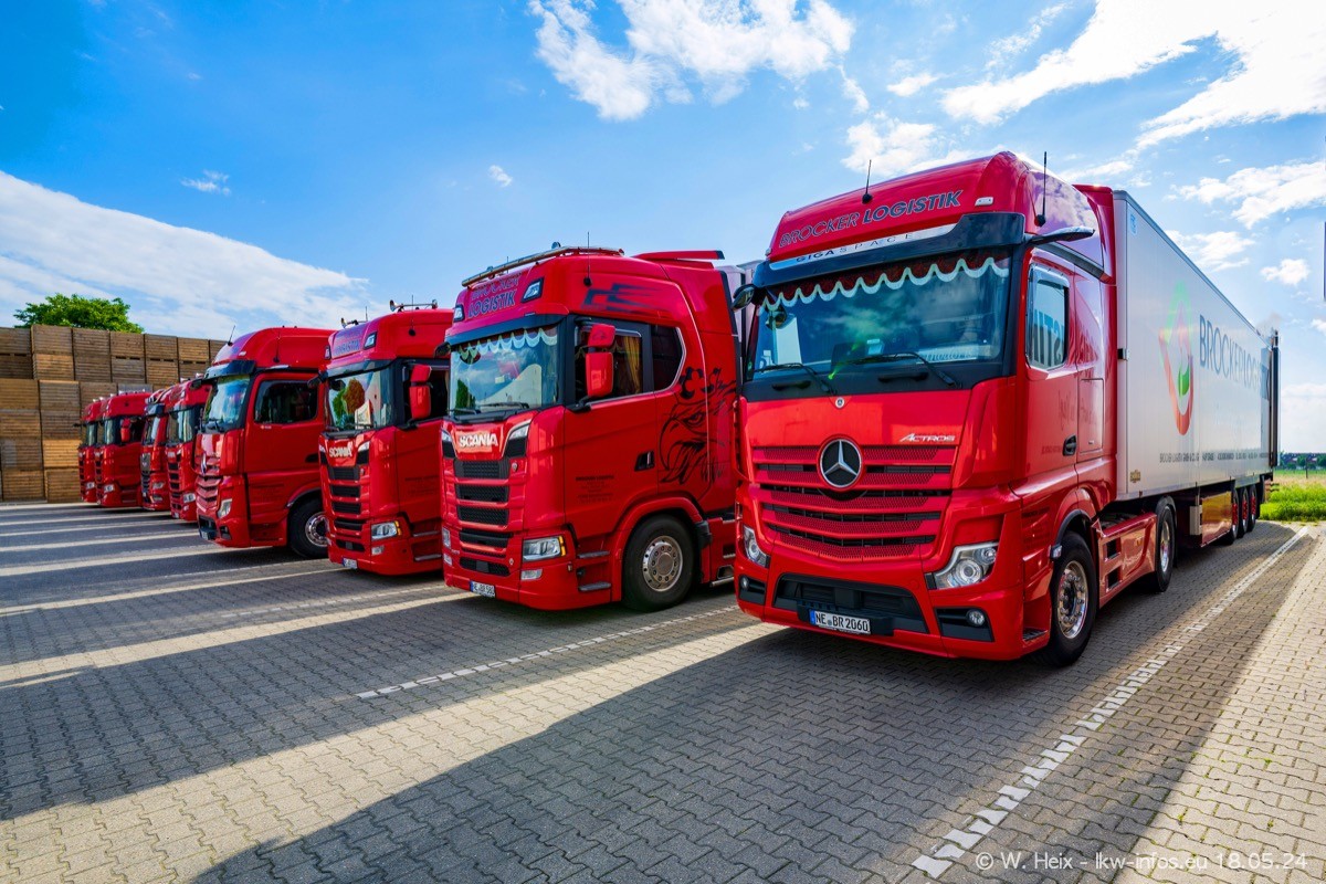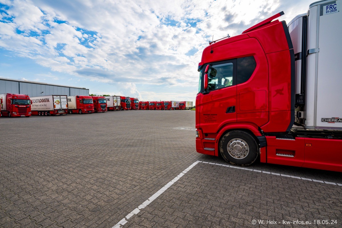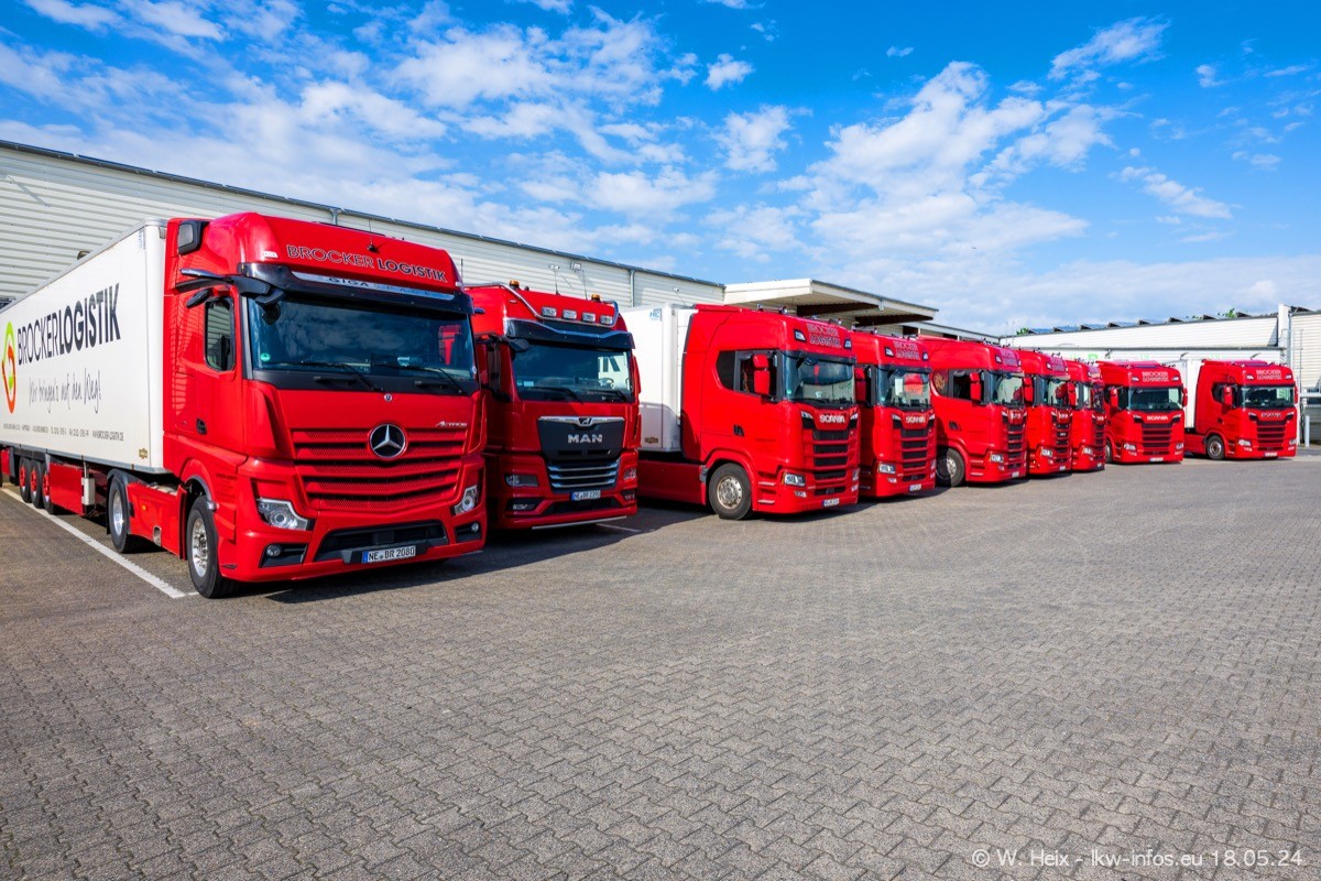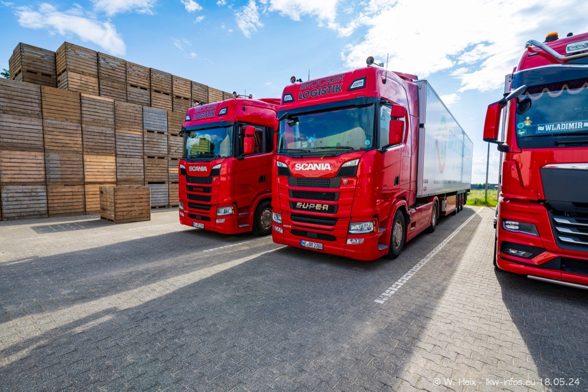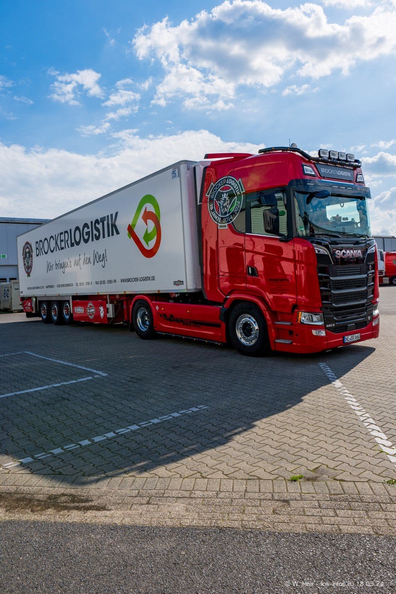 Nach über fünf Jahren war ich wieder bei Brocker Logistik in Korschenbroich. Diesmal wurde ich zu einem kleinen Fotoshooting eingeladen. Am späten Samstag Nachmittag war fast der komplette Fuhrpark zuhause. Das sind aktuell 38 LKW. Zwei fehlten. Zum 10-jährigen Firmenjubiläum wurde im März ein SCANIA 660 S V8 NextGen gekauft. Dieser ist etwas aufwändiger gestaltet als der restliche Fuhrpark, der sich aber auch sehen lassen kann. Auf dem weitläufigen Gelände gab es genug schöne Plätze für dieses kleine Fotoshooting.