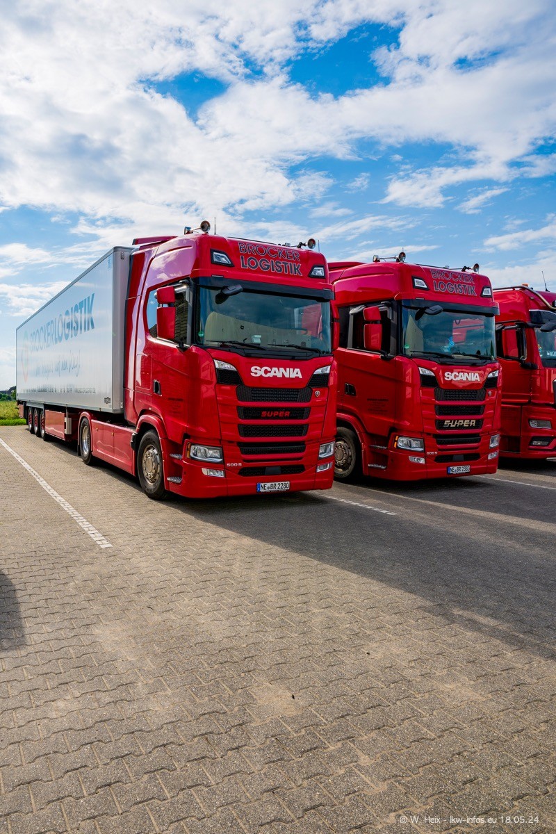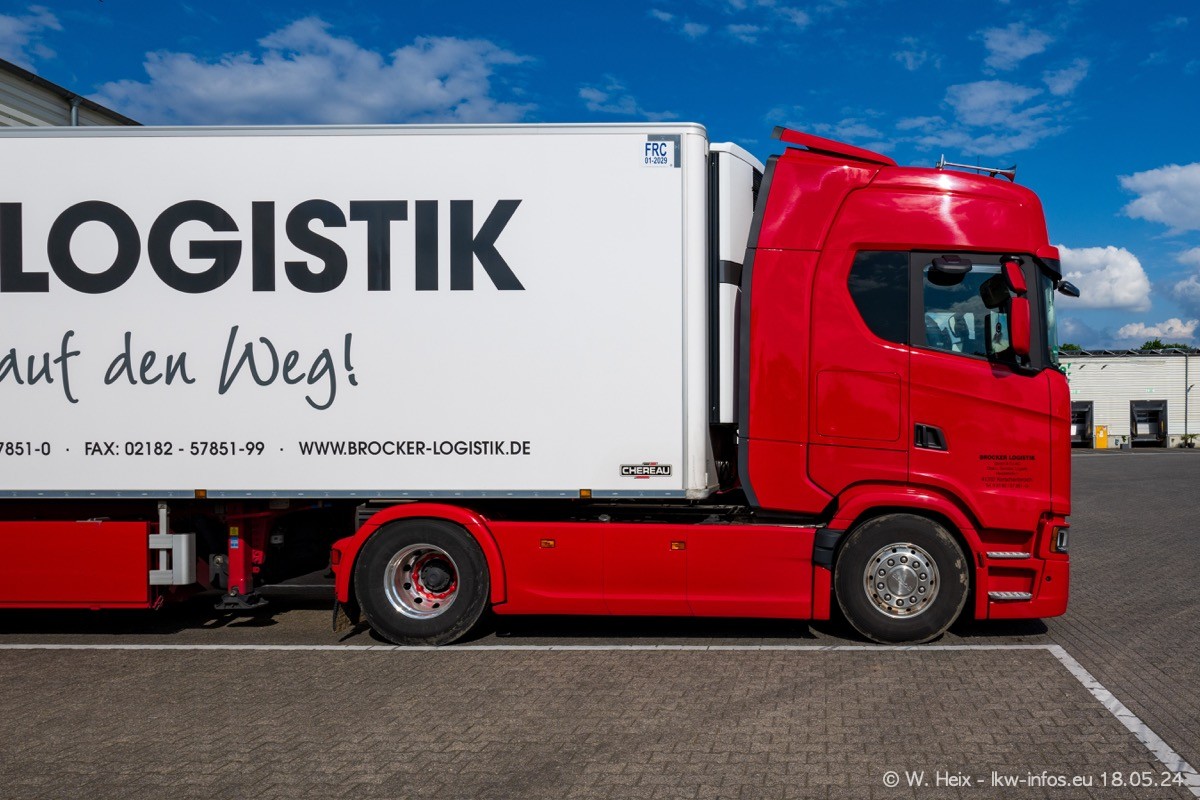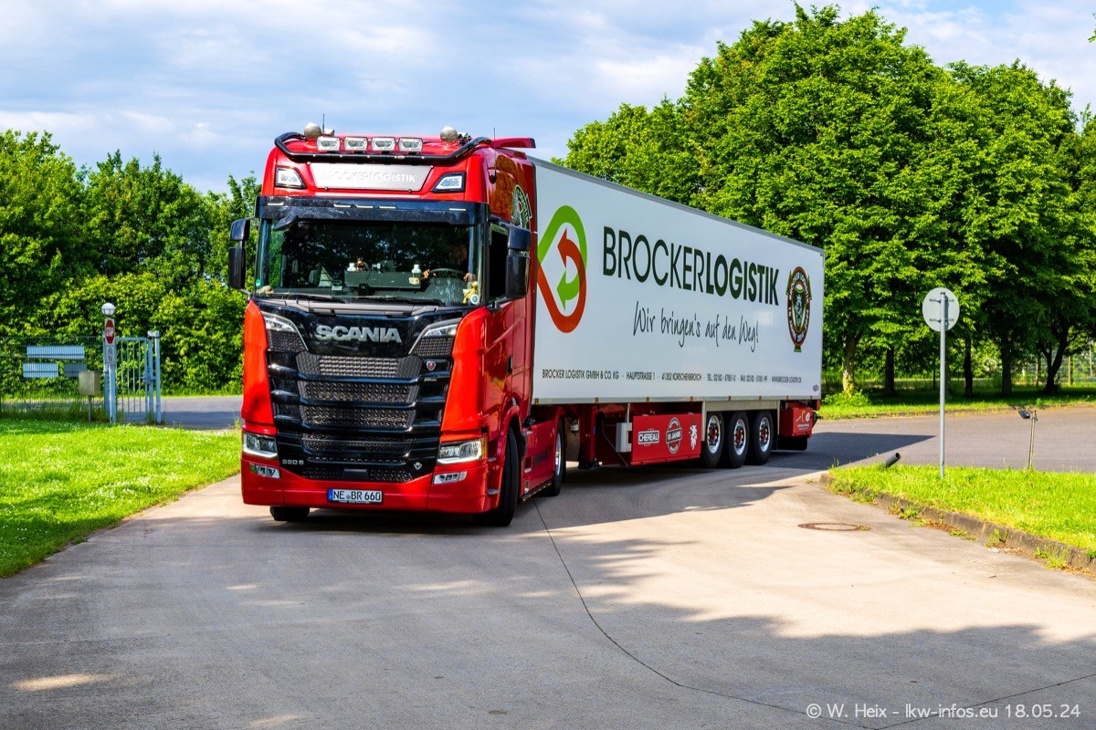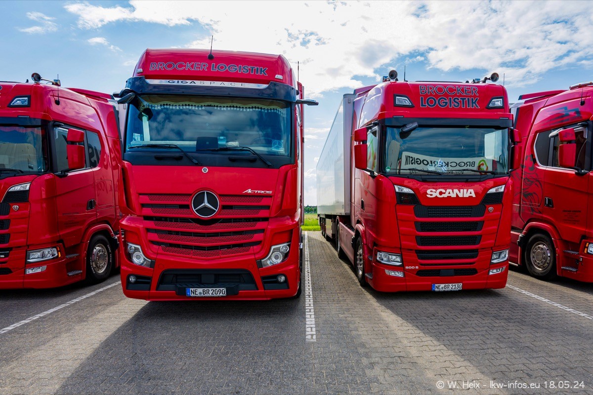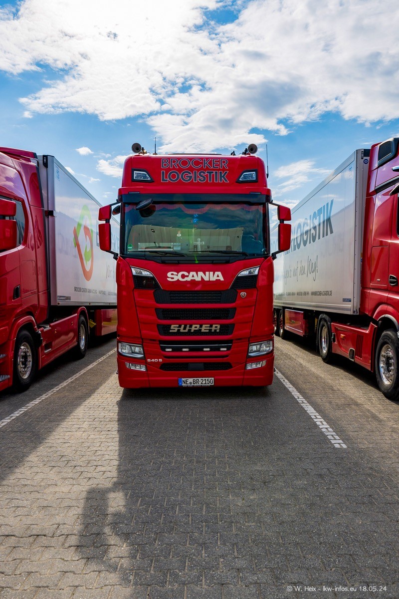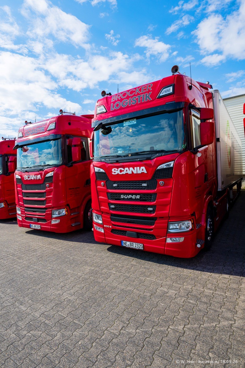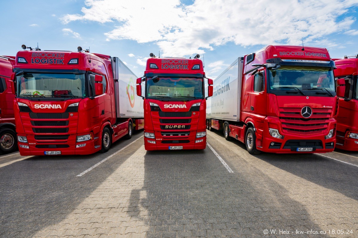 Nach über fünf Jahren war ich wieder bei Brocker Logistik in Korschenbroich. Diesmal wurde ich zu einem kleinen Fotoshooting eingeladen. Am späten Samstag Nachmittag war fast der komplette Fuhrpark zuhause. Das sind aktuell 38 LKW. Zwei fehlten. Zum 10-jährigen Firmenjubiläum wurde im März ein SCANIA 660 S V8 NextGen gekauft. Dieser ist etwas aufwändiger gestaltet als der restliche Fuhrpark, der sich aber auch sehen lassen kann. Auf dem weitläufigen Gelände gab es genug schöne Plätze für dieses kleine Fotoshooting.
