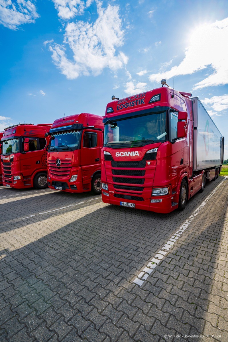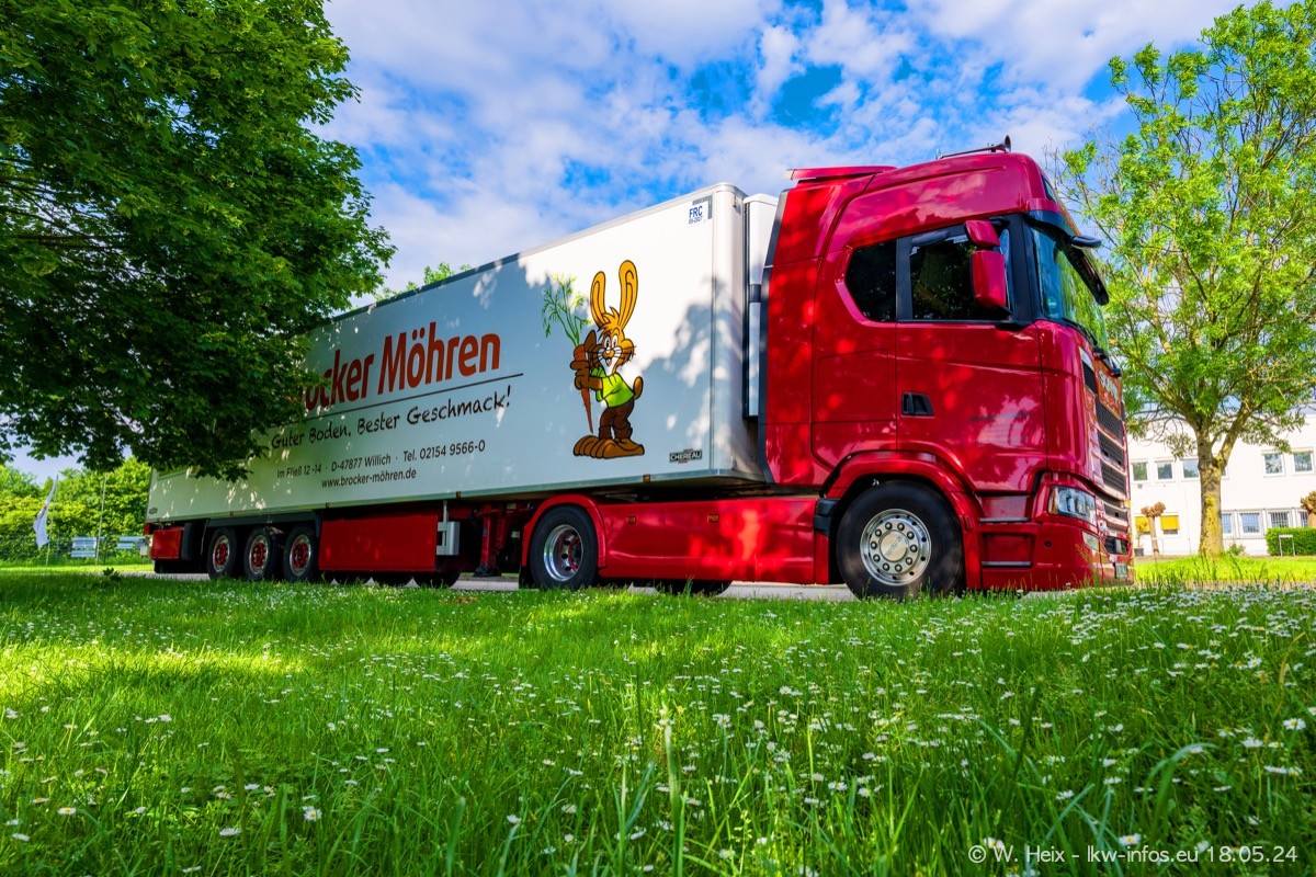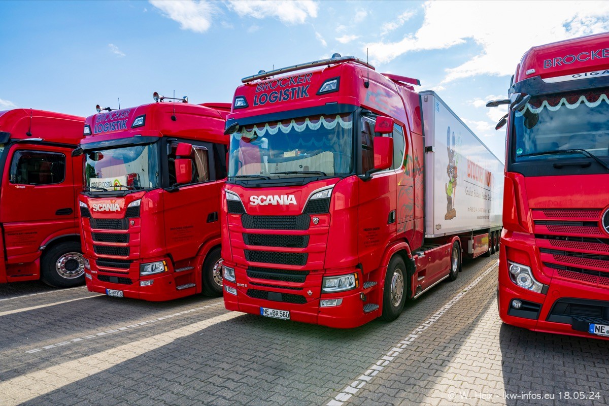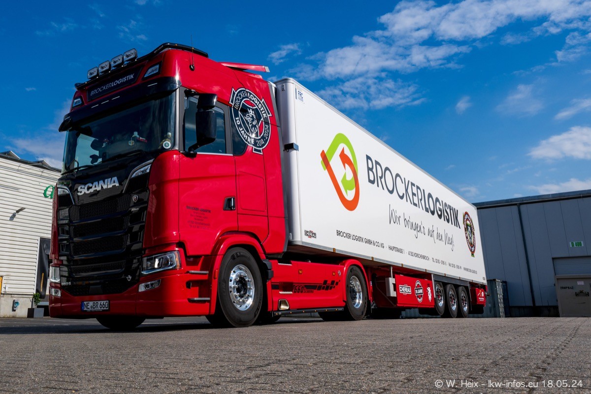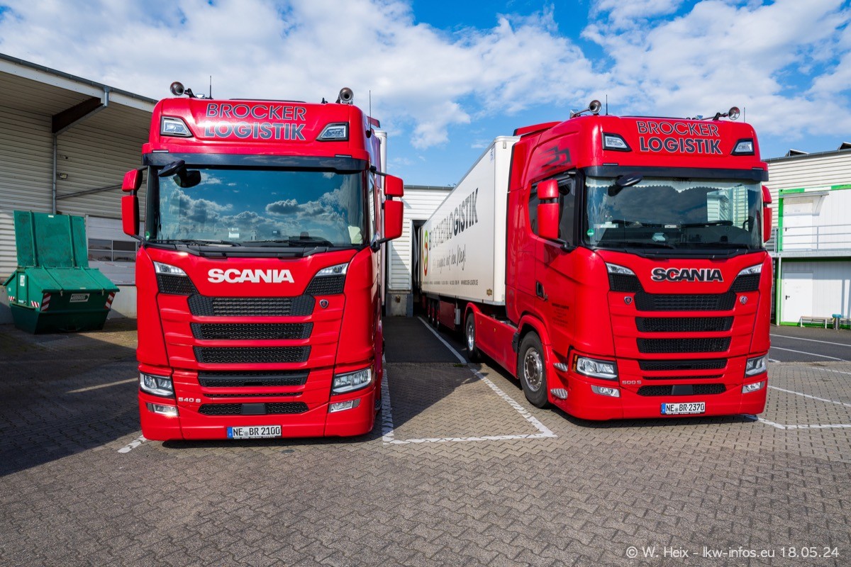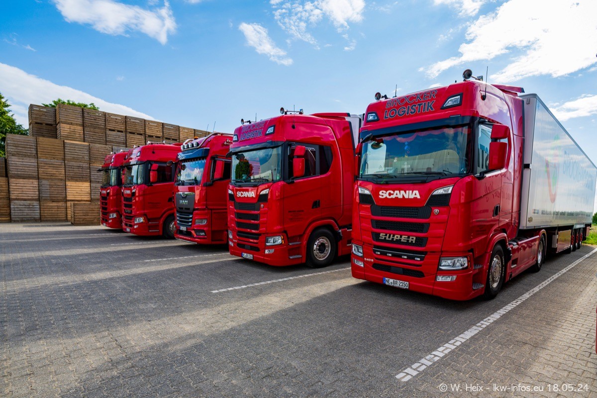 Nach über fünf Jahren war ich wieder bei Brocker Logistik in Korschenbroich. Diesmal wurde ich zu einem kleinen Fotoshooting eingeladen. Am späten Samstag Nachmittag war fast der komplette Fuhrpark zuhause. Das sind aktuell 38 LKW. Zwei fehlten. Zum 10-jährigen Firmenjubiläum wurde im März ein SCANIA 660 S V8 NextGen gekauft. Dieser ist etwas aufwändiger gestaltet als der restliche Fuhrpark, der sich aber auch sehen lassen kann. Auf dem weitläufigen Gelände gab es genug schöne Plätze für dieses kleine Fotoshooting.