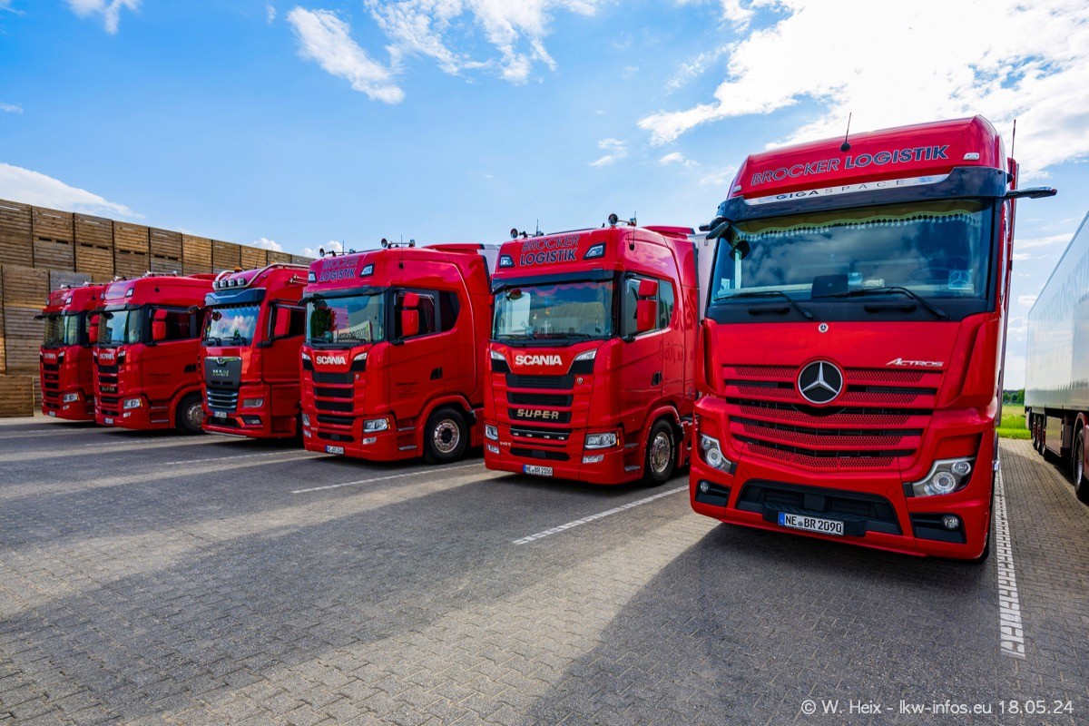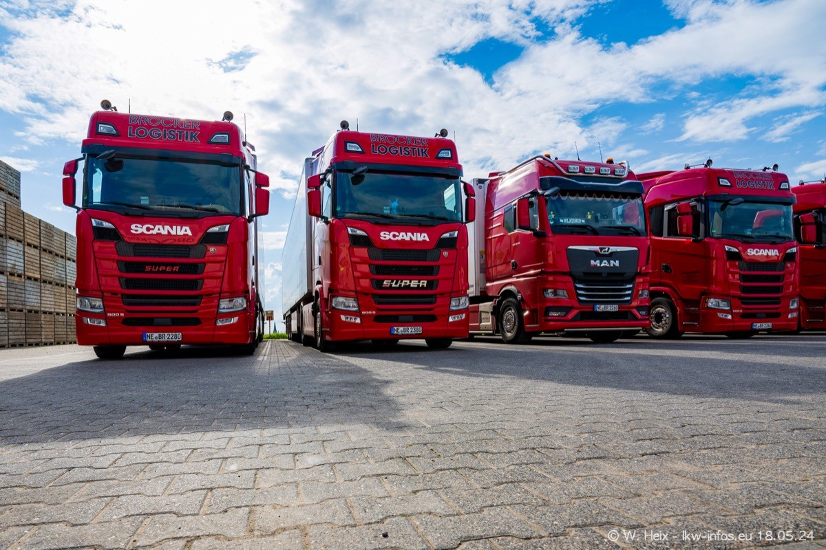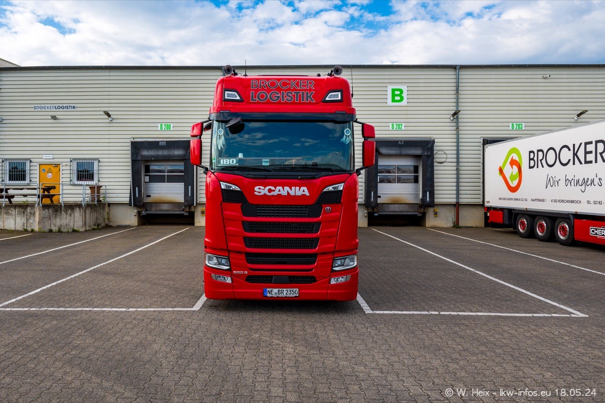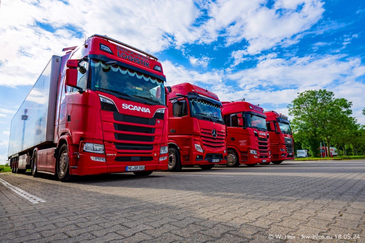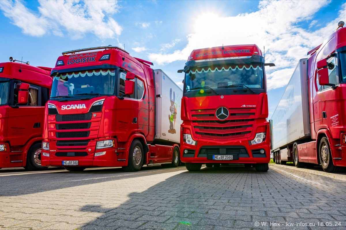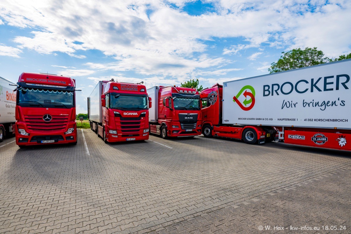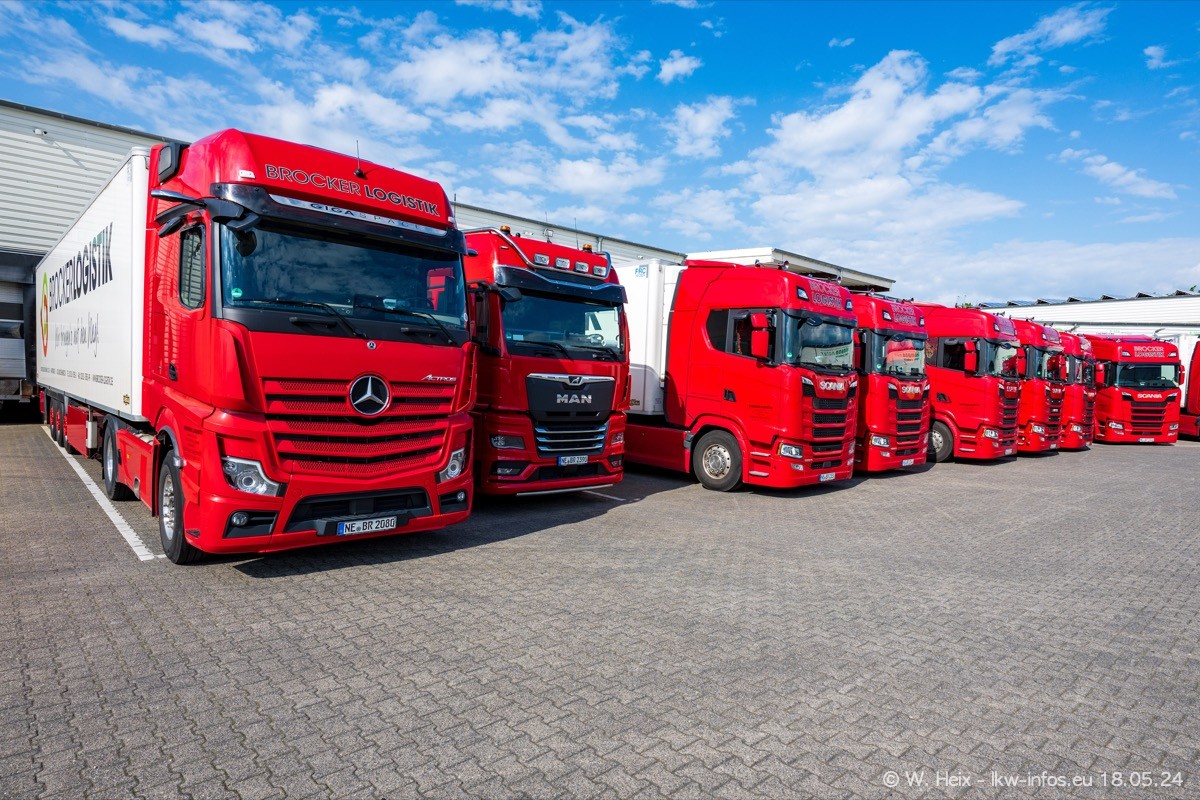 Nach über fünf Jahren war ich wieder bei Brocker Logistik in Korschenbroich. Diesmal wurde ich zu einem kleinen Fotoshooting eingeladen. Am späten Samstag Nachmittag war fast der komplette Fuhrpark zuhause. Das sind aktuell 38 LKW. Zwei fehlten. Zum 10-jährigen Firmenjubiläum wurde im März ein SCANIA 660 S V8 NextGen gekauft. Dieser ist etwas aufwändiger gestaltet als der restliche Fuhrpark, der sich aber auch sehen lassen kann. Auf dem weitläufigen Gelände gab es genug schöne Plätze für dieses kleine Fotoshooting.