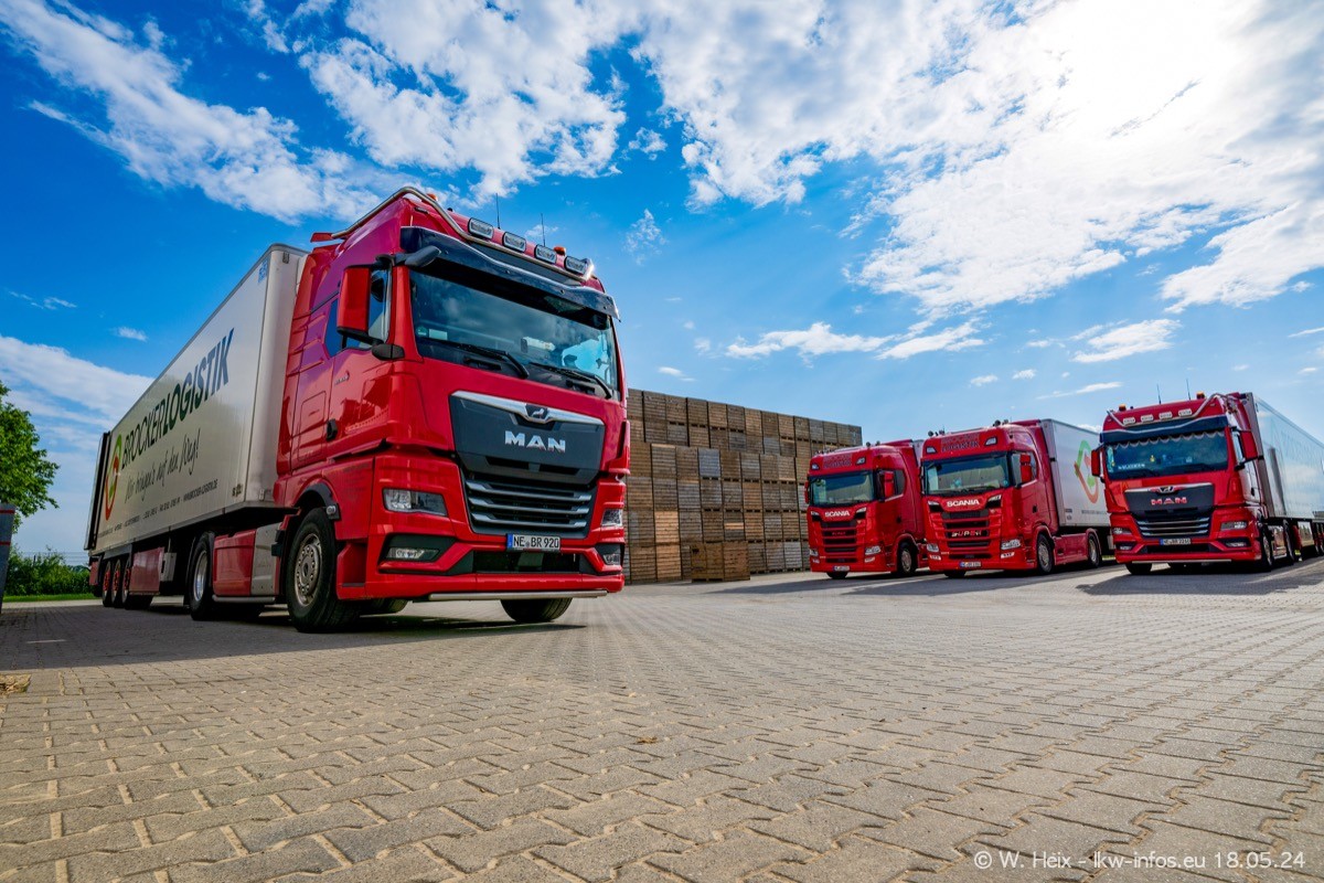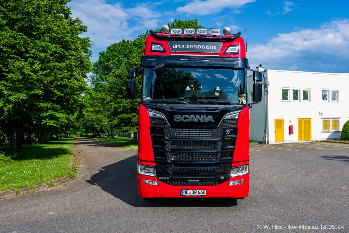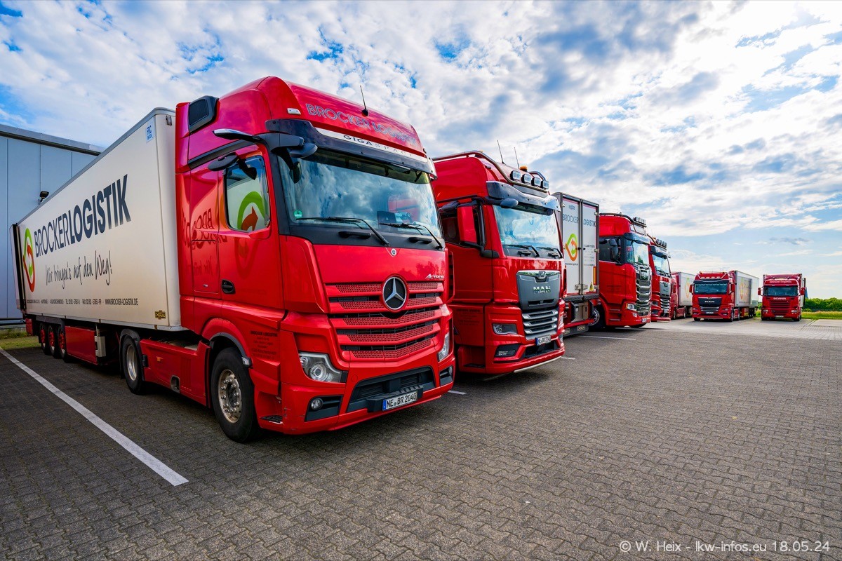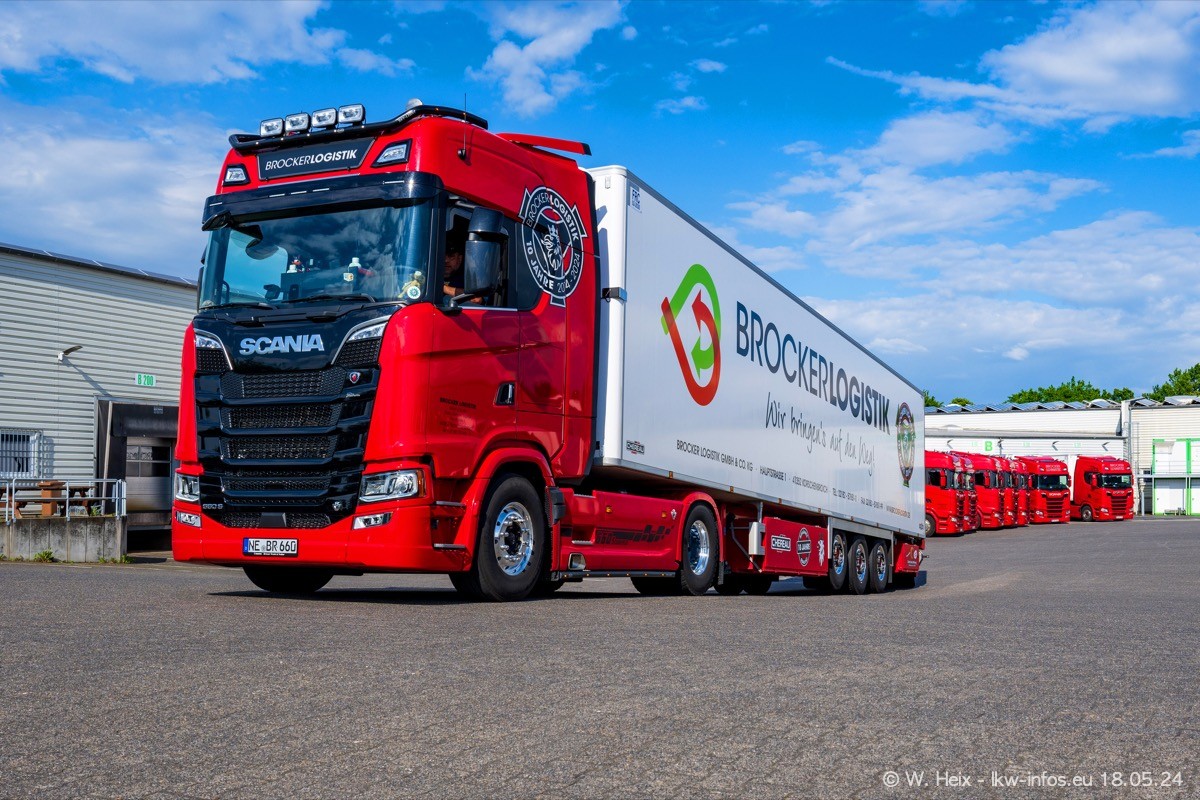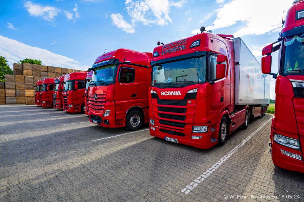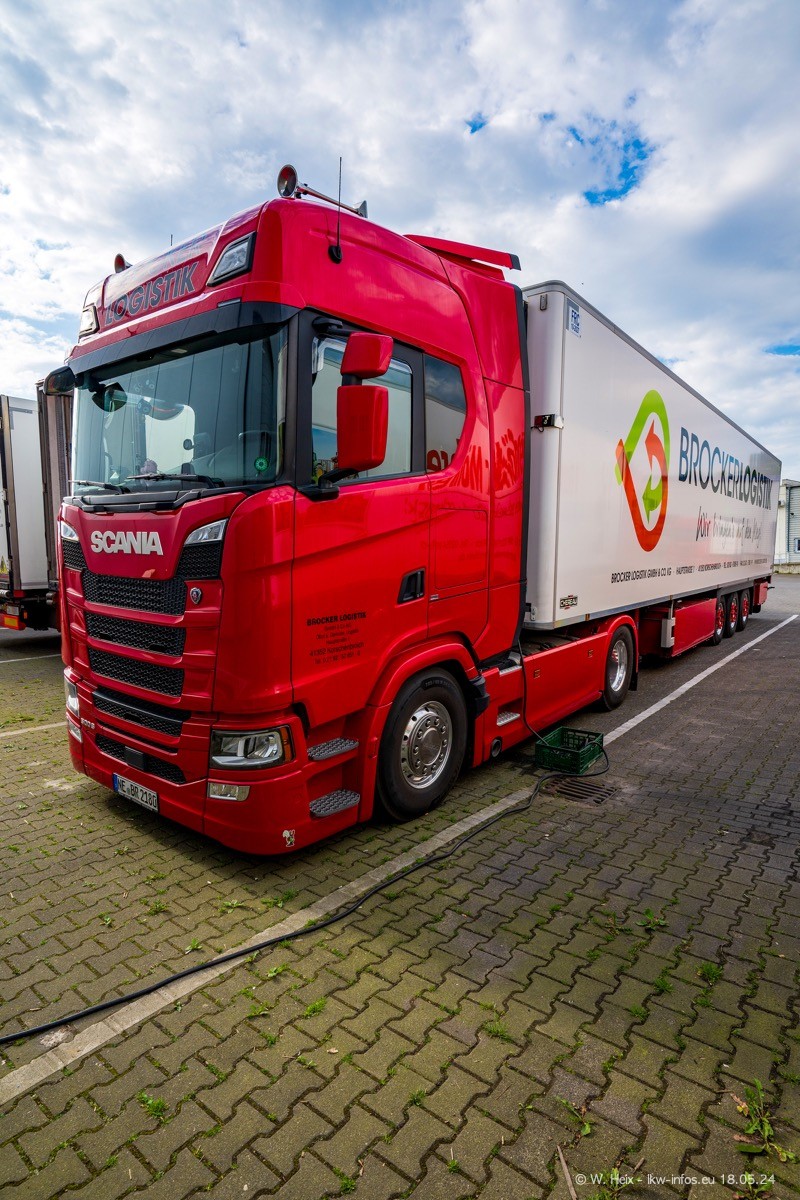 Nach über fünf Jahren war ich wieder bei Brocker Logistik in Korschenbroich. Diesmal wurde ich zu einem kleinen Fotoshooting eingeladen. Am späten Samstag Nachmittag war fast der komplette Fuhrpark zuhause. Das sind aktuell 38 LKW. Zwei fehlten. Zum 10-jährigen Firmenjubiläum wurde im März ein SCANIA 660 S V8 NextGen gekauft. Dieser ist etwas aufwändiger gestaltet als der restliche Fuhrpark, der sich aber auch sehen lassen kann. Auf dem weitläufigen Gelände gab es genug schöne Plätze für dieses kleine Fotoshooting.