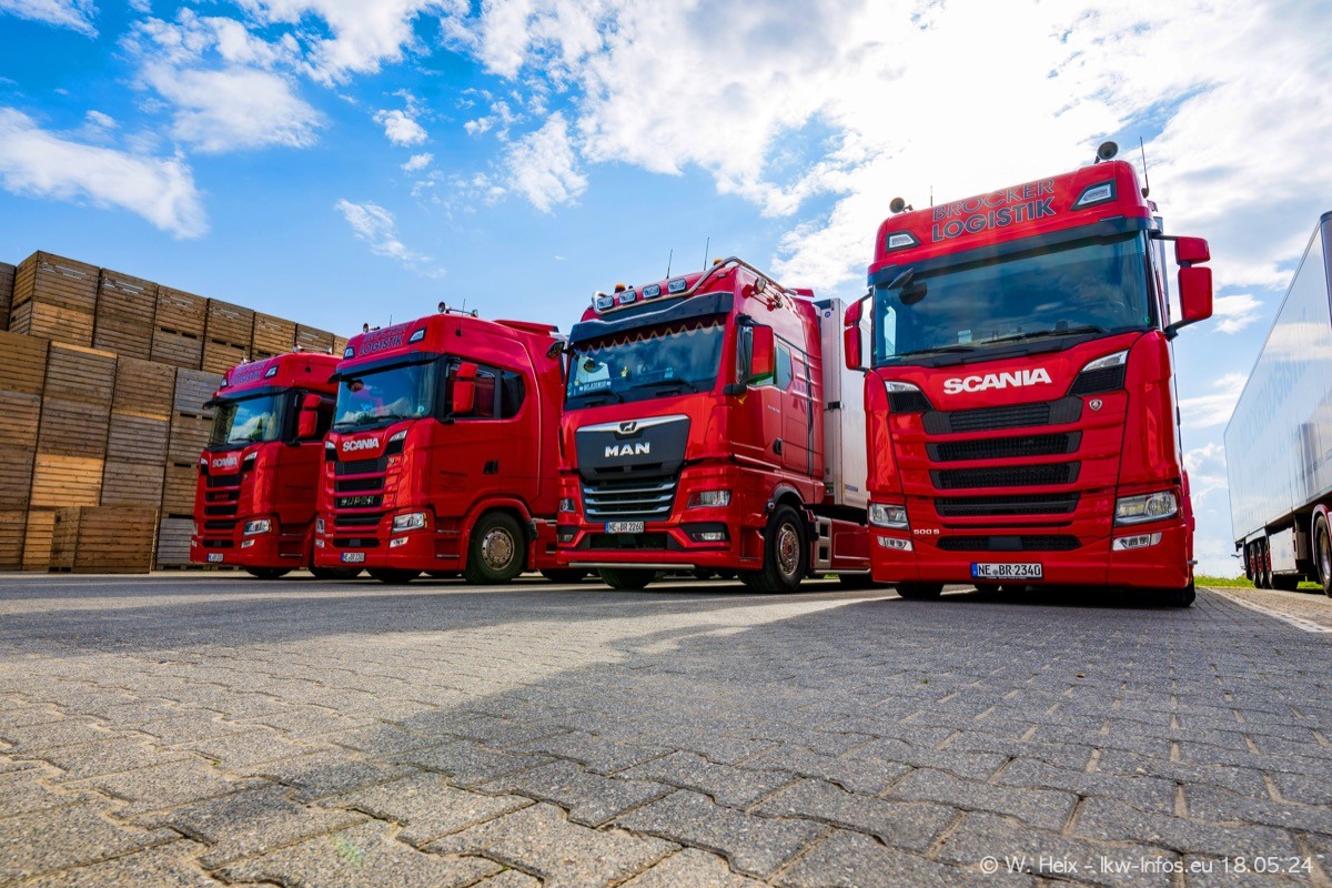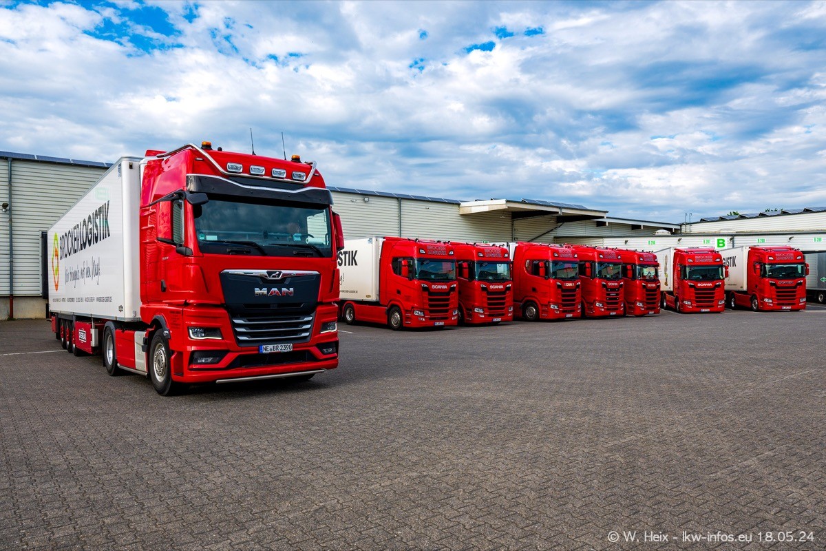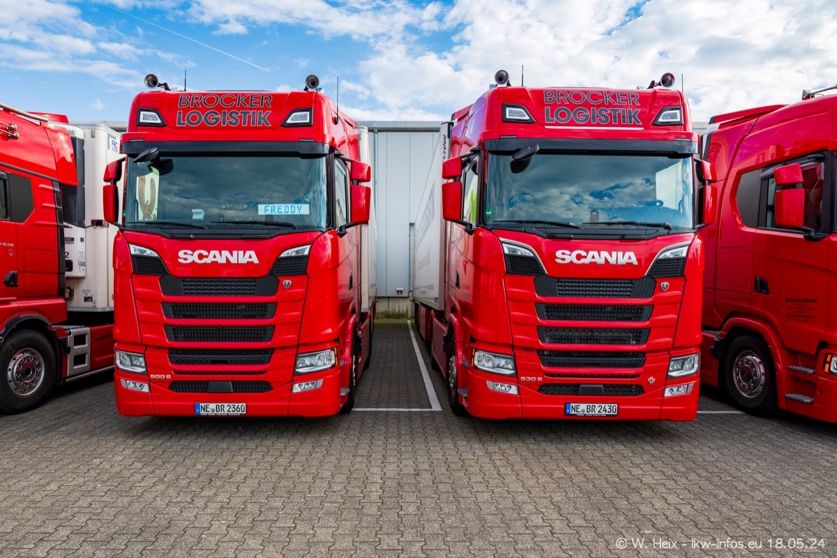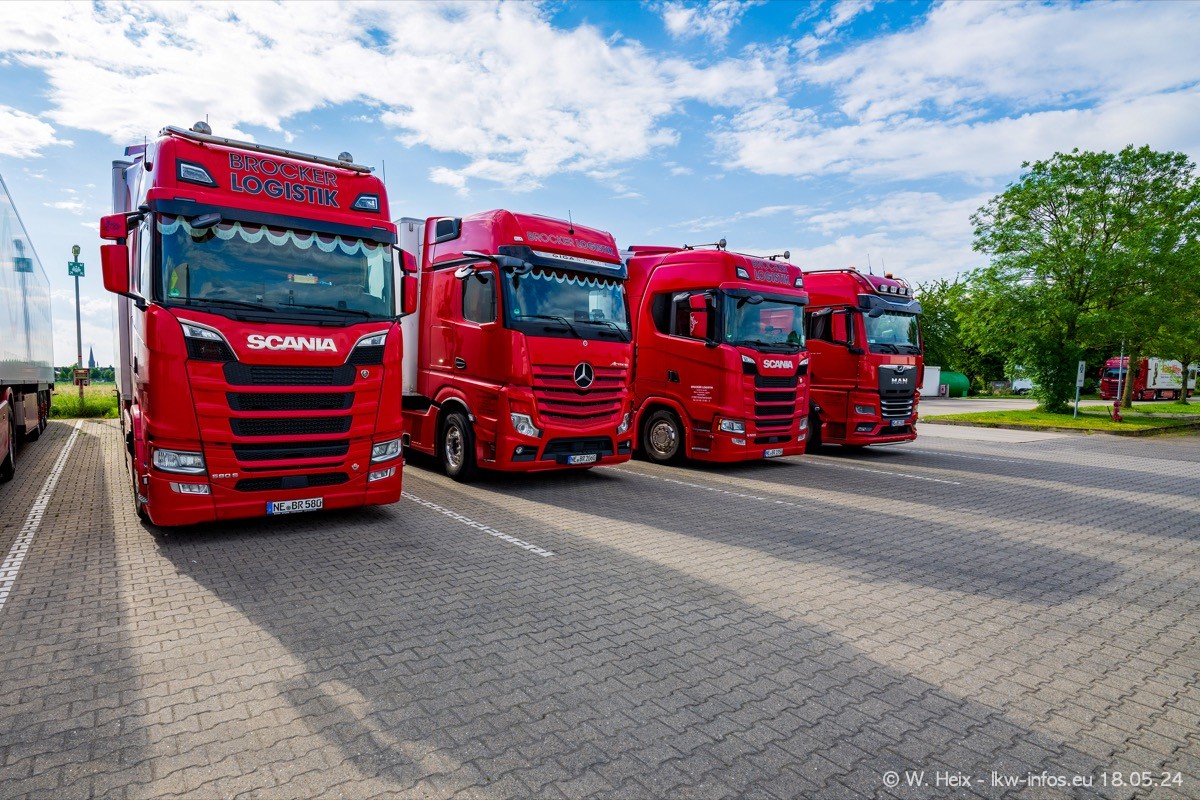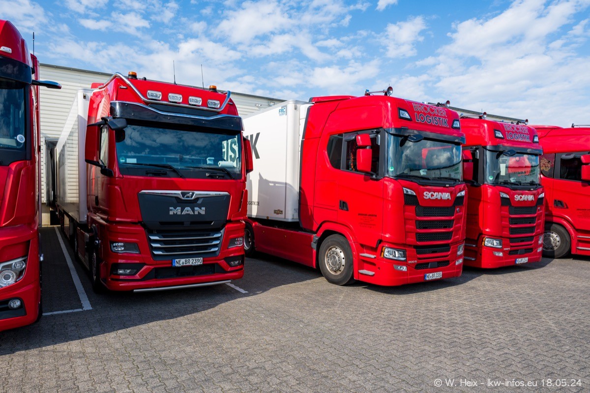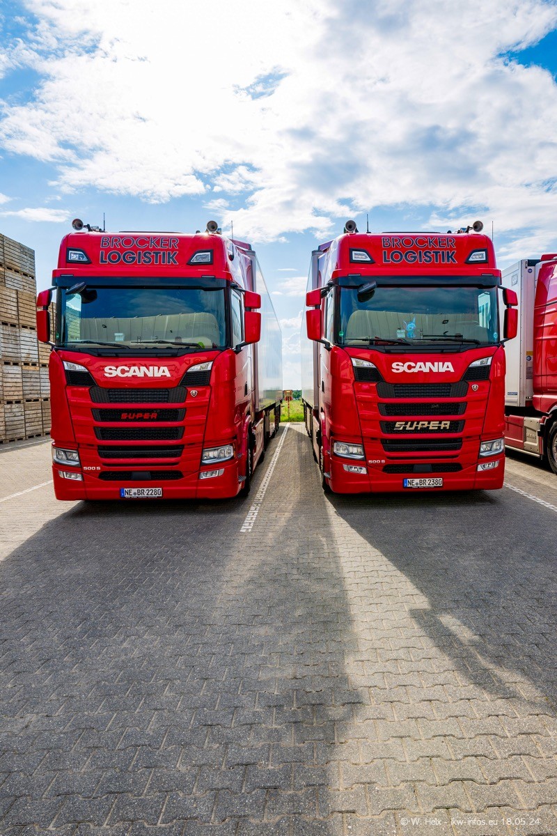 Nach über fünf Jahren war ich wieder bei Brocker Logistik in Korschenbroich. Diesmal wurde ich zu einem kleinen Fotoshooting eingeladen. Am späten Samstag Nachmittag war fast der komplette Fuhrpark zuhause. Das sind aktuell 38 LKW. Zwei fehlten. Zum 10-jährigen Firmenjubiläum wurde im März ein SCANIA 660 S V8 NextGen gekauft. Dieser ist etwas aufwändiger gestaltet als der restliche Fuhrpark, der sich aber auch sehen lassen kann. Auf dem weitläufigen Gelände gab es genug schöne Plätze für dieses kleine Fotoshooting.