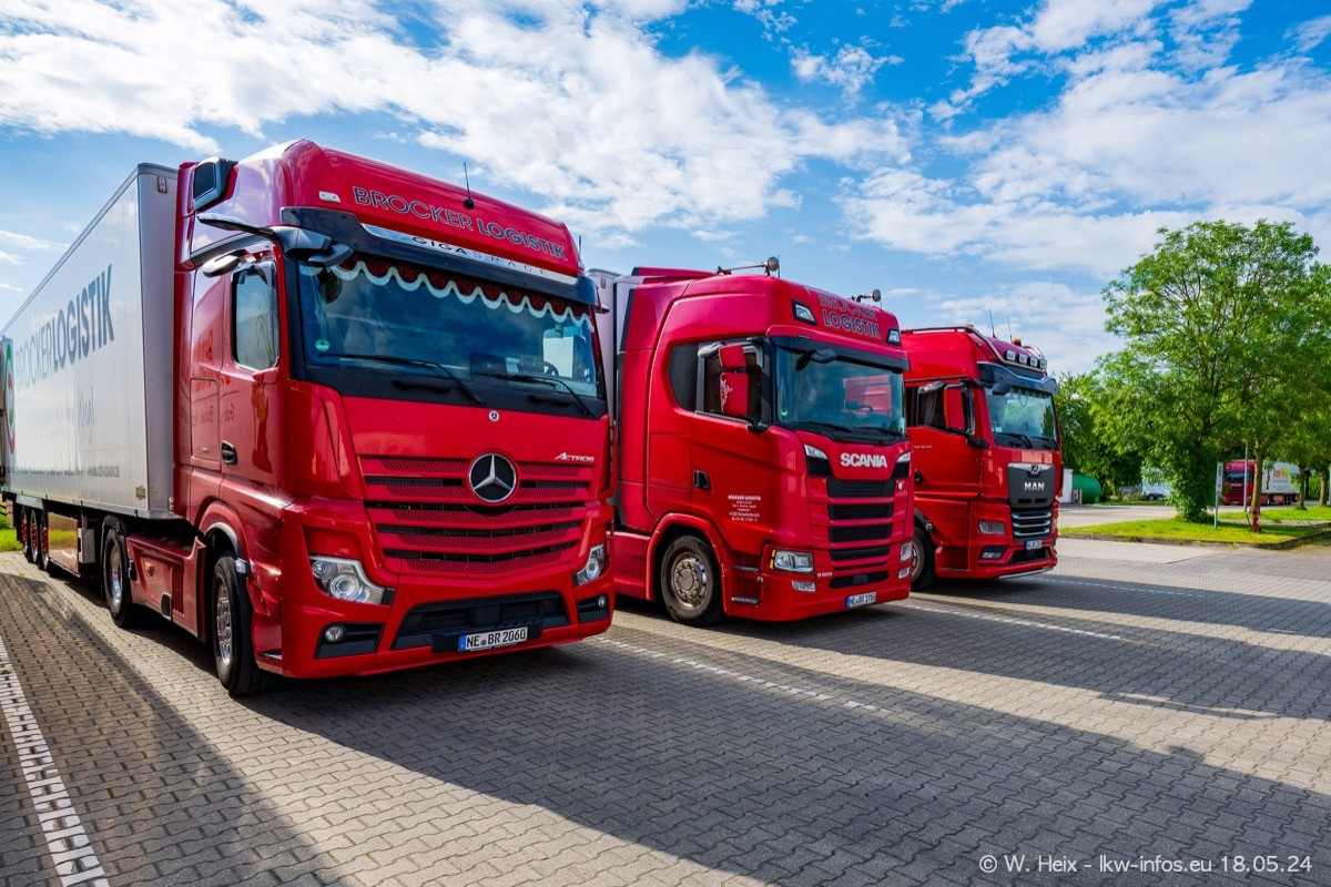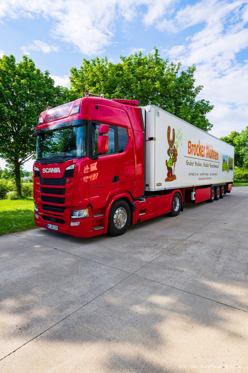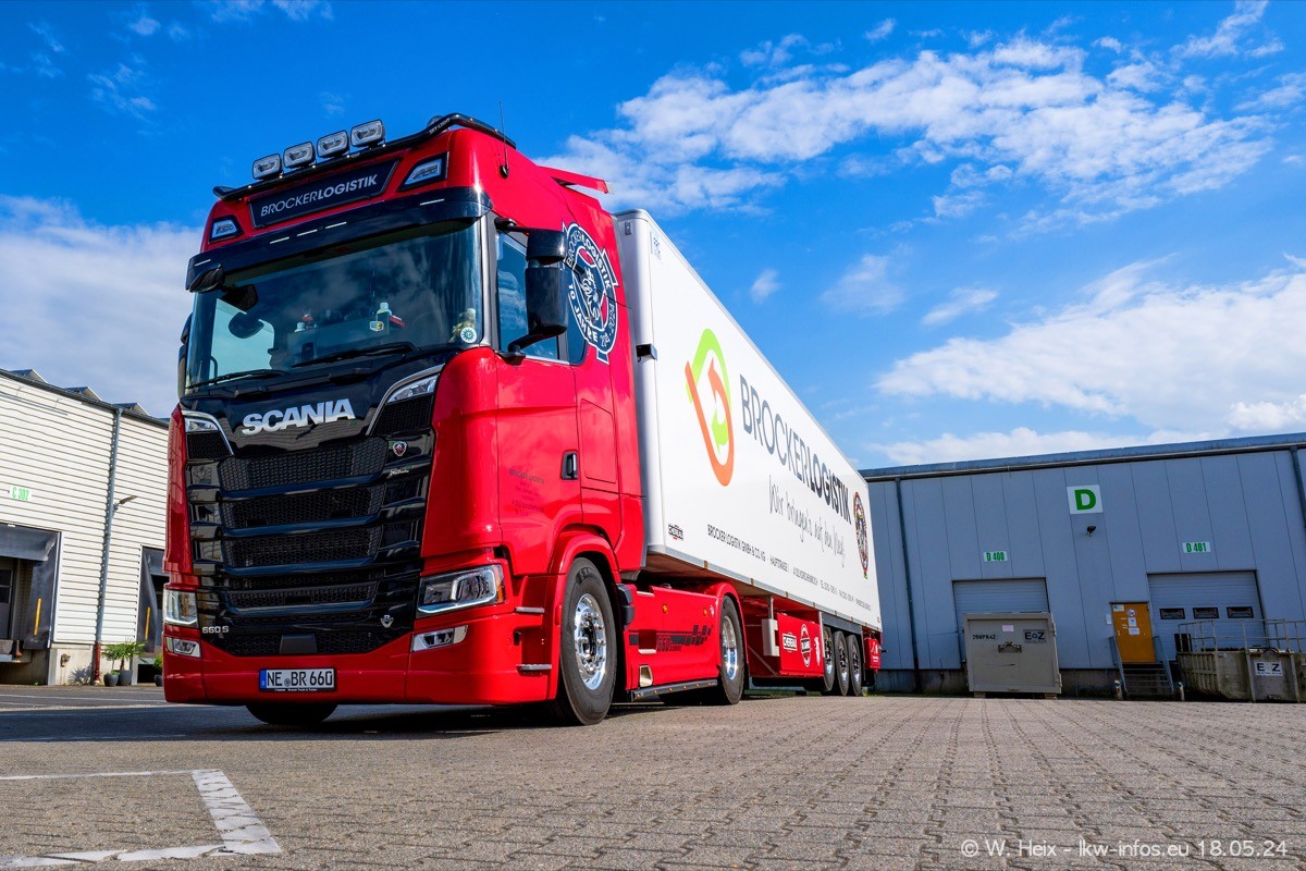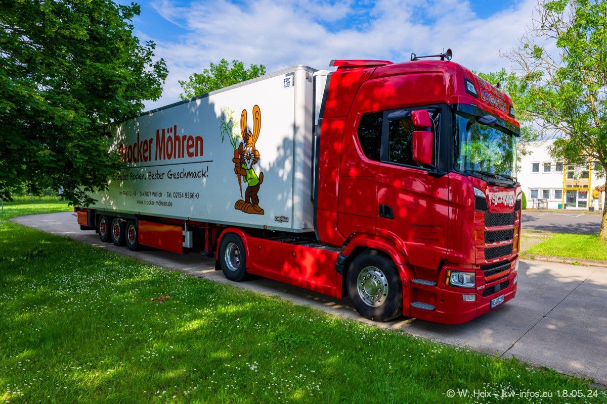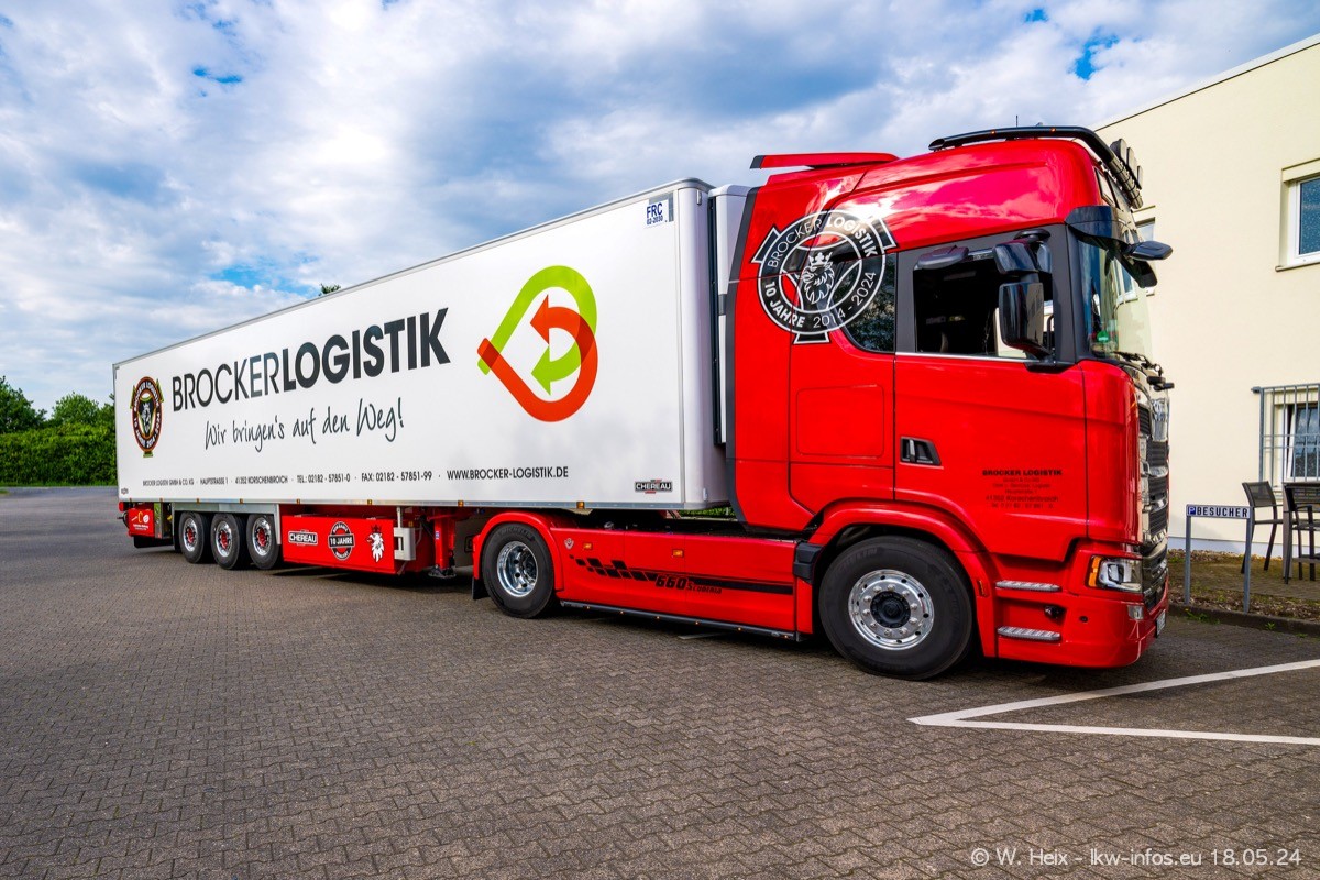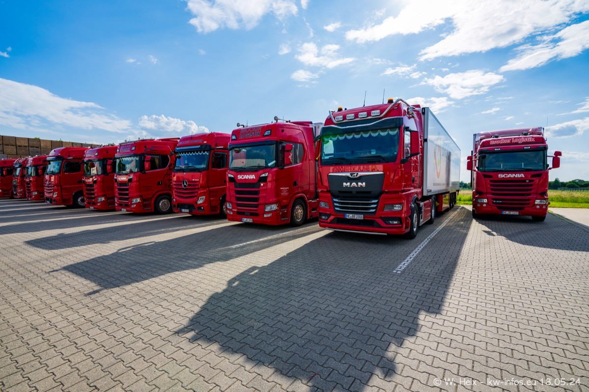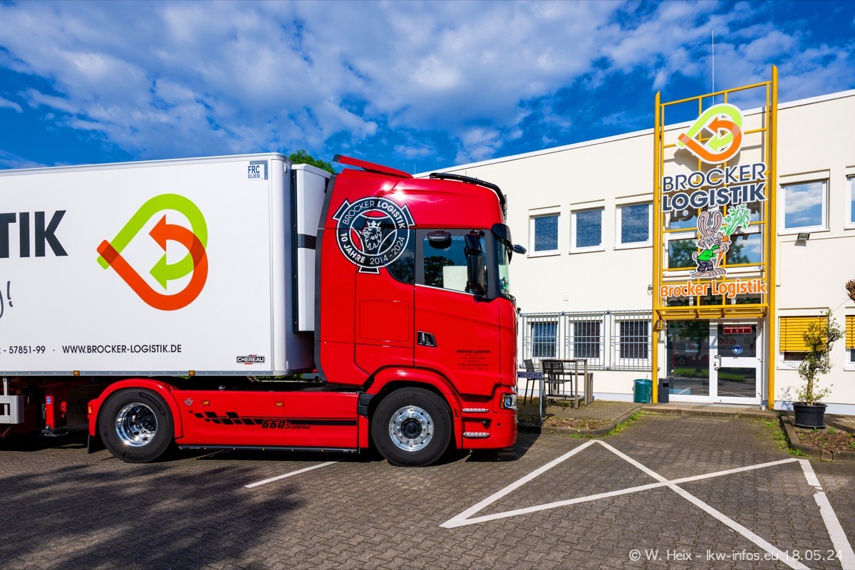 Nach über fünf Jahren war ich wieder bei Brocker Logistik in Korschenbroich. Diesmal wurde ich zu einem kleinen Fotoshooting eingeladen. Am späten Samstag Nachmittag war fast der komplette Fuhrpark zuhause. Das sind aktuell 38 LKW. Zwei fehlten. Zum 10-jährigen Firmenjubiläum wurde im März ein SCANIA 660 S V8 NextGen gekauft. Dieser ist etwas aufwändiger gestaltet als der restliche Fuhrpark, der sich aber auch sehen lassen kann. Auf dem weitläufigen Gelände gab es genug schöne Plätze für dieses kleine Fotoshooting.