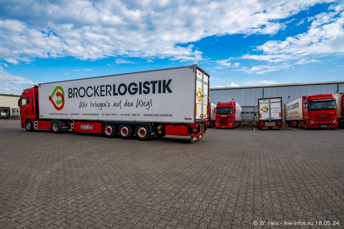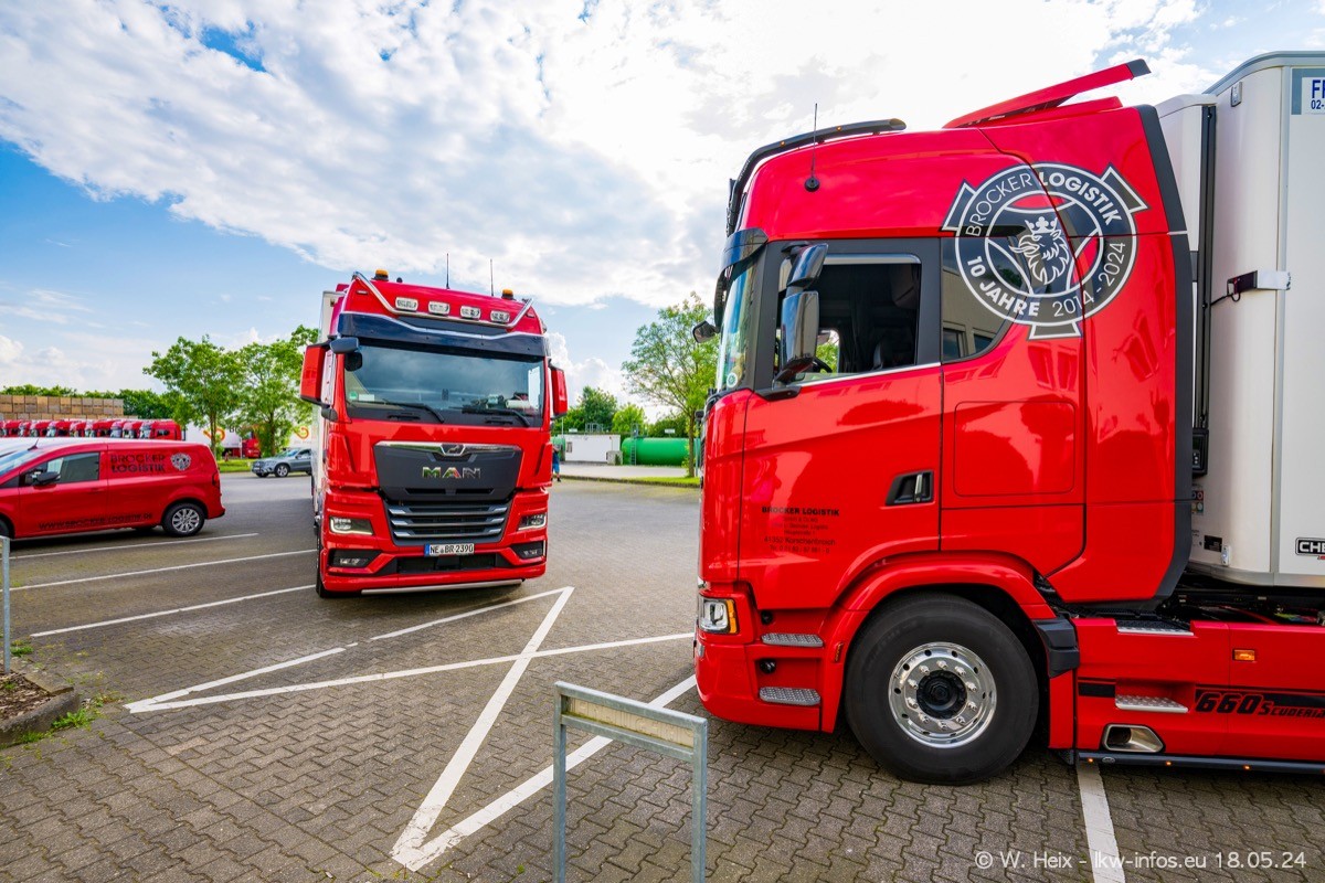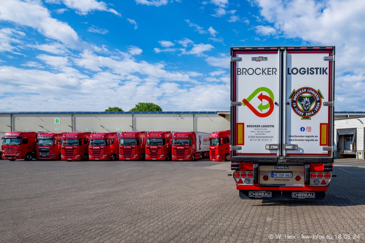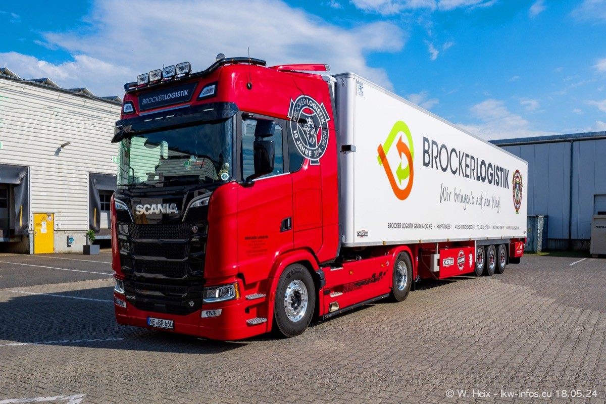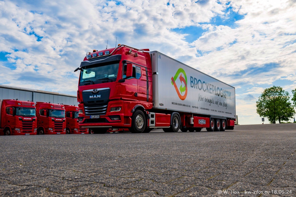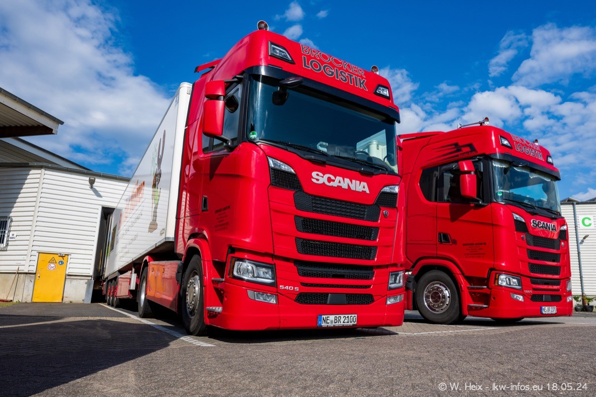 Nach über fünf Jahren war ich wieder bei Brocker Logistik in Korschenbroich. Diesmal wurde ich zu einem kleinen Fotoshooting eingeladen. Am späten Samstag Nachmittag war fast der komplette Fuhrpark zuhause. Das sind aktuell 38 LKW. Zwei fehlten. Zum 10-jährigen Firmenjubiläum wurde im März ein SCANIA 660 S V8 NextGen gekauft. Dieser ist etwas aufwändiger gestaltet als der restliche Fuhrpark, der sich aber auch sehen lassen kann. Auf dem weitläufigen Gelände gab es genug schöne Plätze für dieses kleine Fotoshooting.