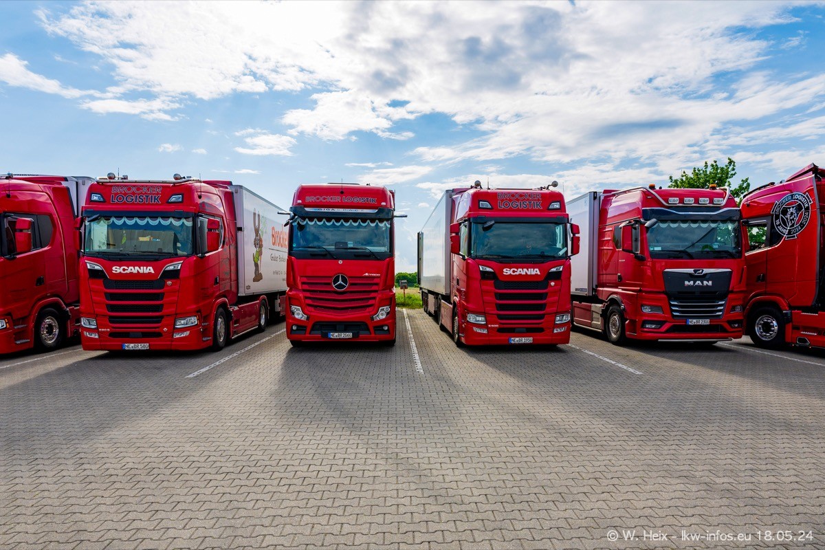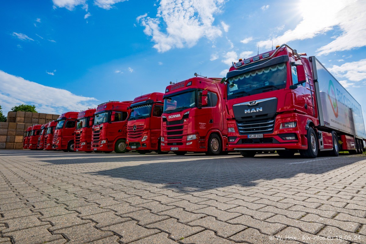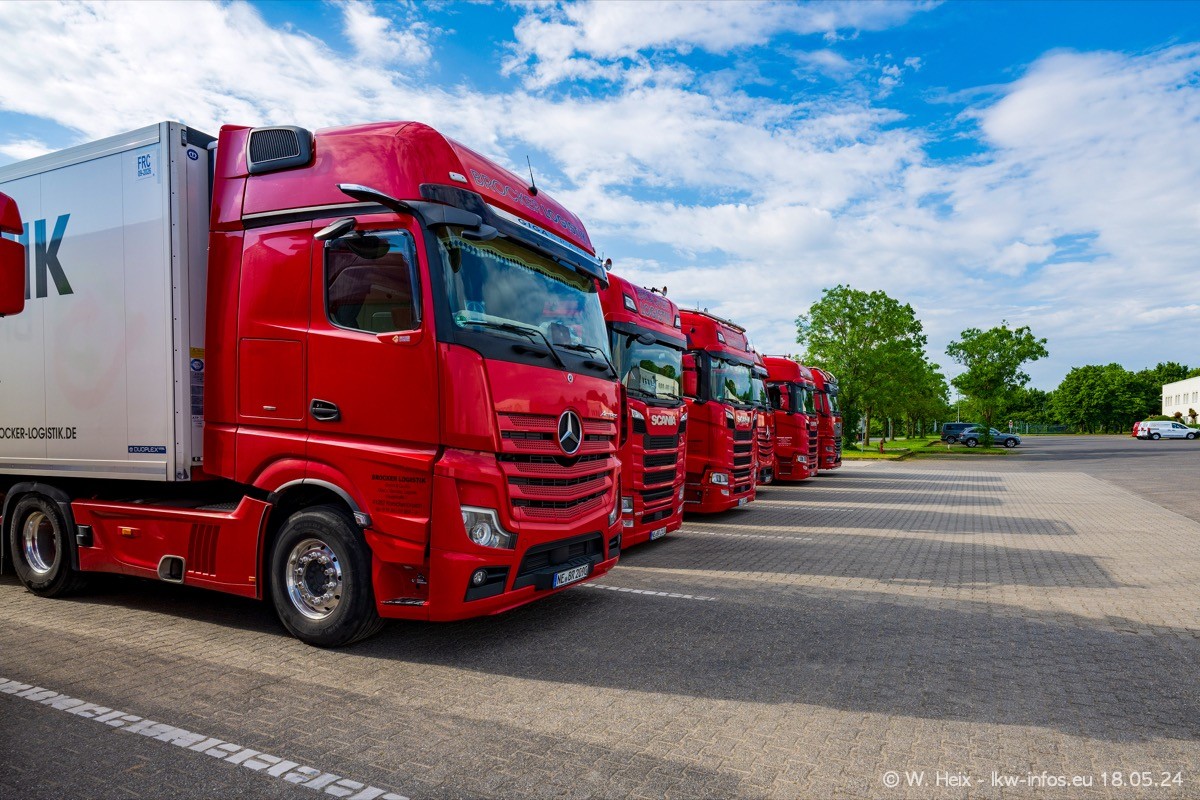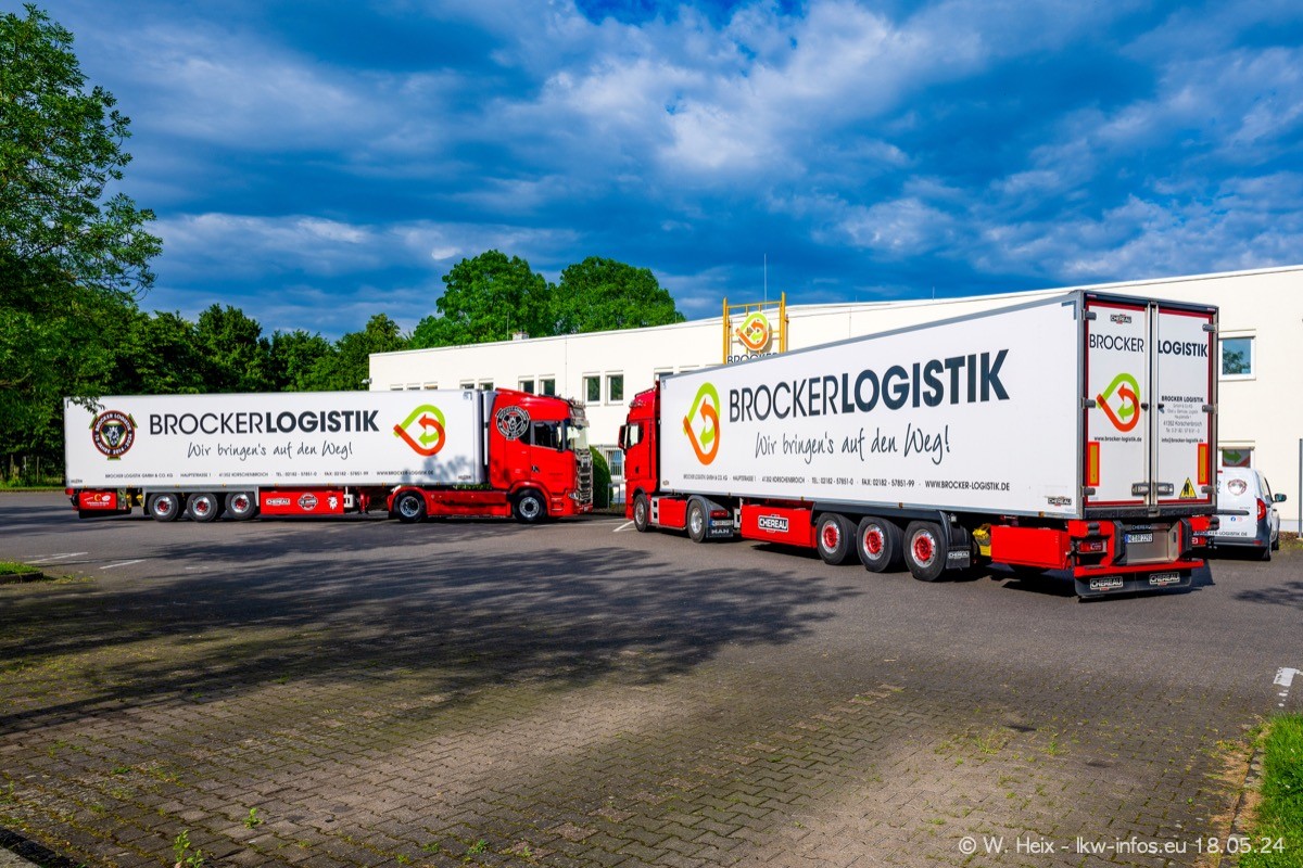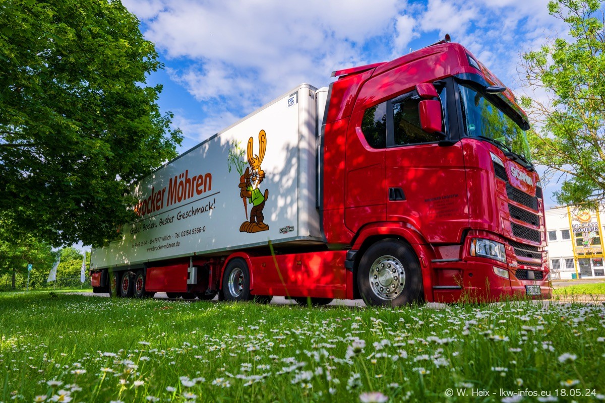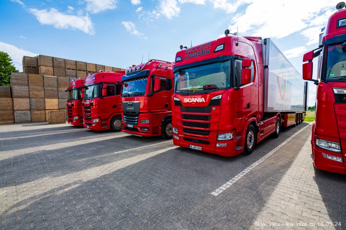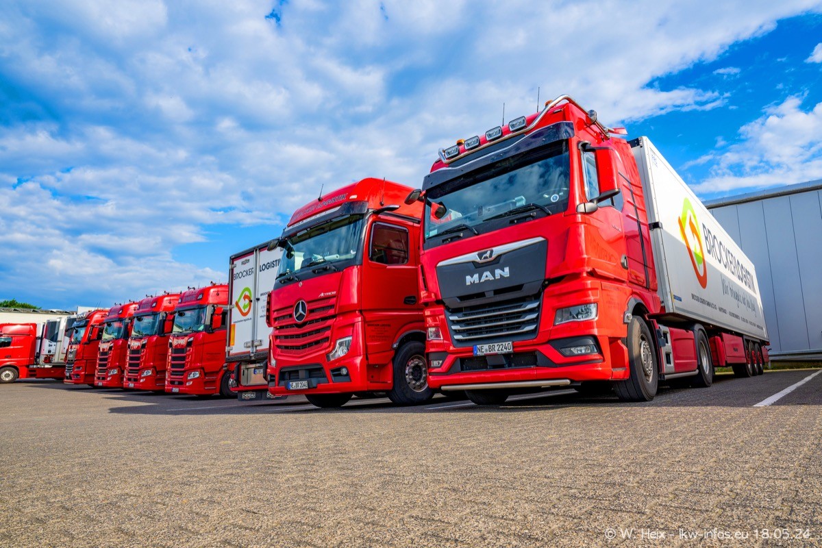 Nach über fünf Jahren war ich wieder bei Brocker Logistik in Korschenbroich. Diesmal wurde ich zu einem kleinen Fotoshooting eingeladen. Am späten Samstag Nachmittag war fast der komplette Fuhrpark zuhause. Das sind aktuell 38 LKW. Zwei fehlten. Zum 10-jährigen Firmenjubiläum wurde im März ein SCANIA 660 S V8 NextGen gekauft. Dieser ist etwas aufwändiger gestaltet als der restliche Fuhrpark, der sich aber auch sehen lassen kann. Auf dem weitläufigen Gelände gab es genug schöne Plätze für dieses kleine Fotoshooting.