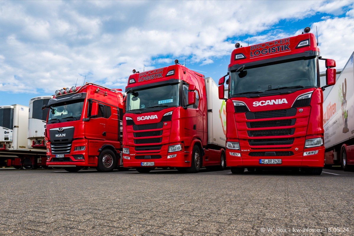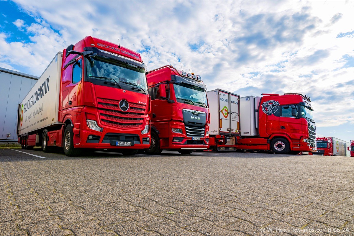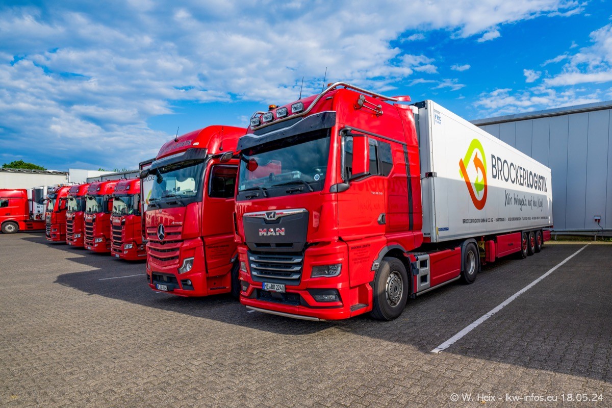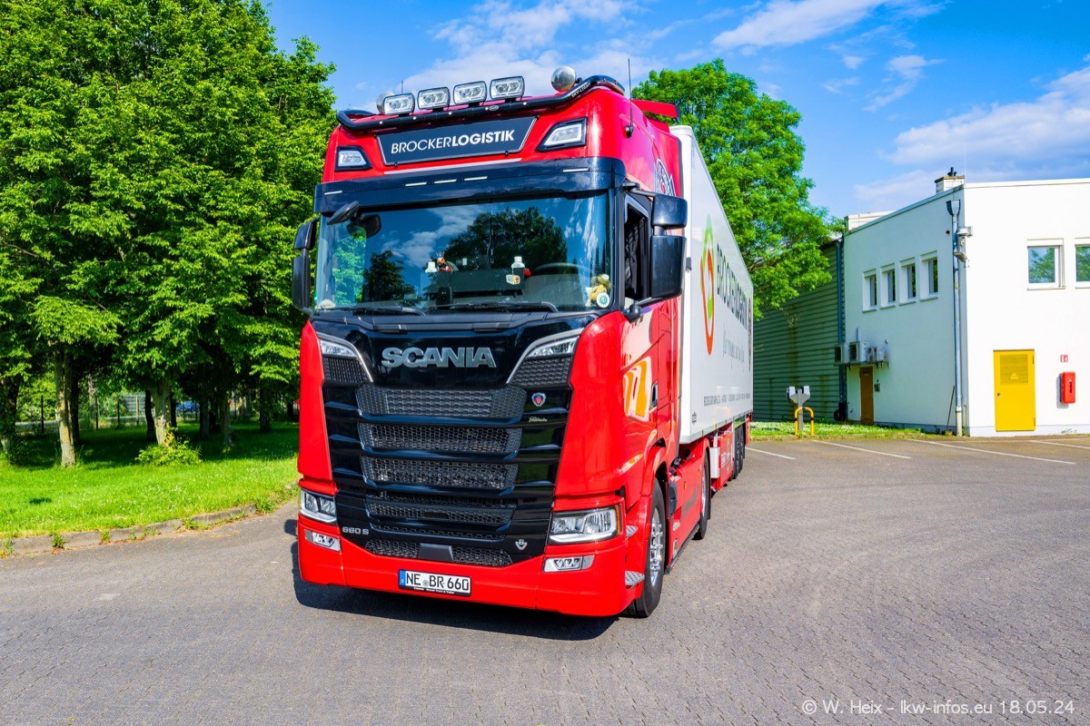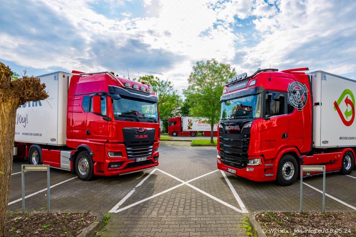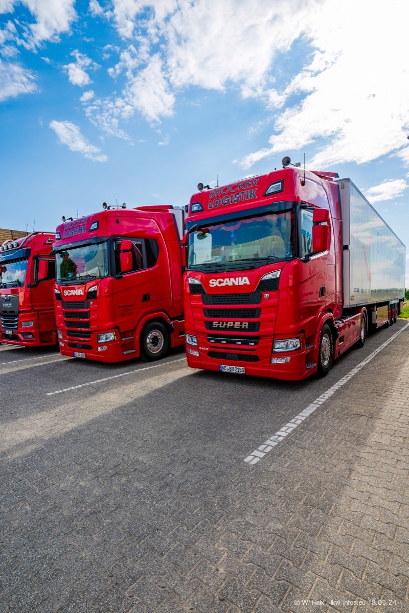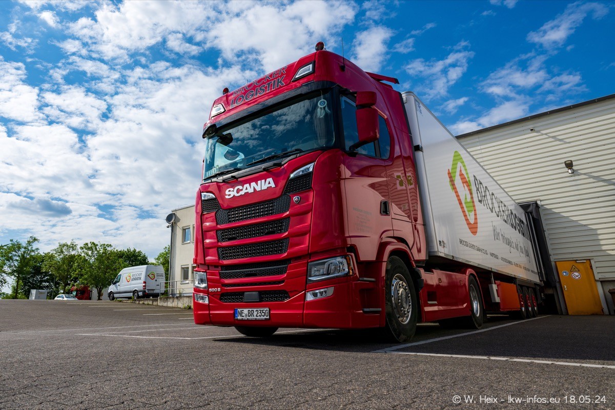 Nach über fünf Jahren war ich wieder bei Brocker Logistik in Korschenbroich. Diesmal wurde ich zu einem kleinen Fotoshooting eingeladen. Am späten Samstag Nachmittag war fast der komplette Fuhrpark zuhause. Das sind aktuell 38 LKW. Zwei fehlten. Zum 10-jährigen Firmenjubiläum wurde im März ein SCANIA 660 S V8 NextGen gekauft. Dieser ist etwas aufwändiger gestaltet als der restliche Fuhrpark, der sich aber auch sehen lassen kann. Auf dem weitläufigen Gelände gab es genug schöne Plätze für dieses kleine Fotoshooting.
