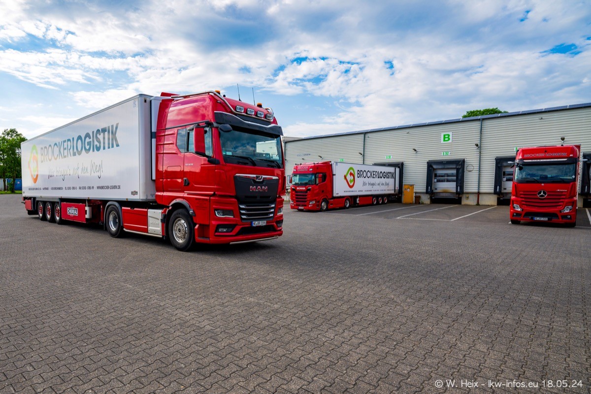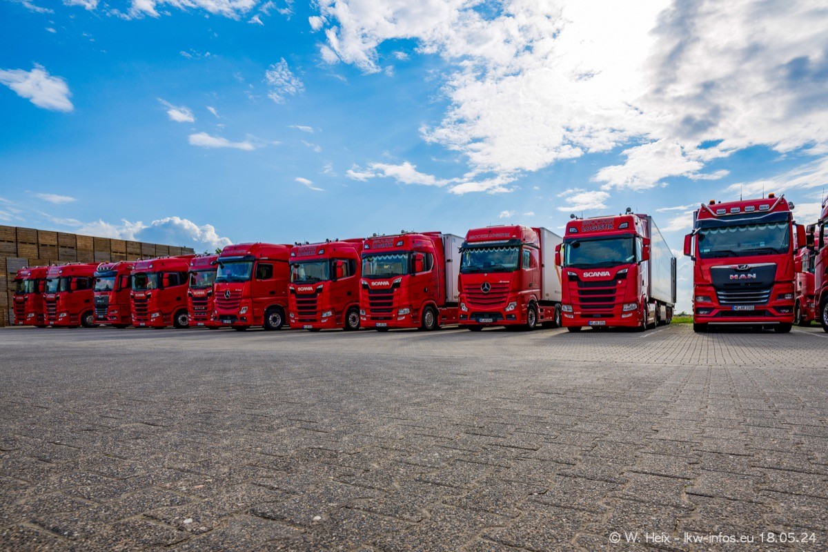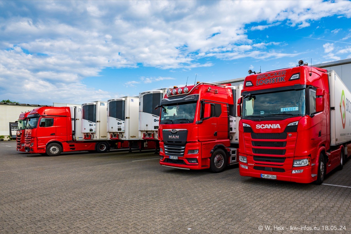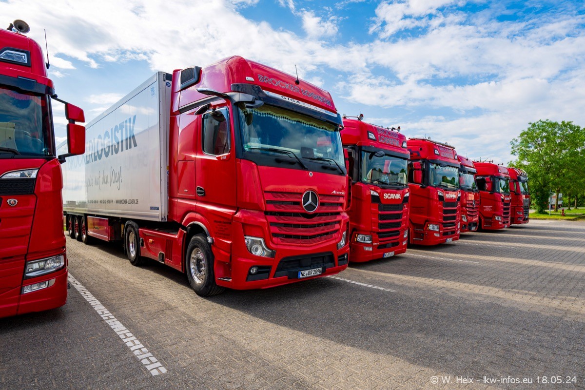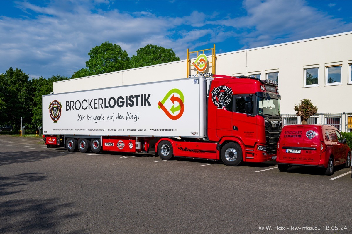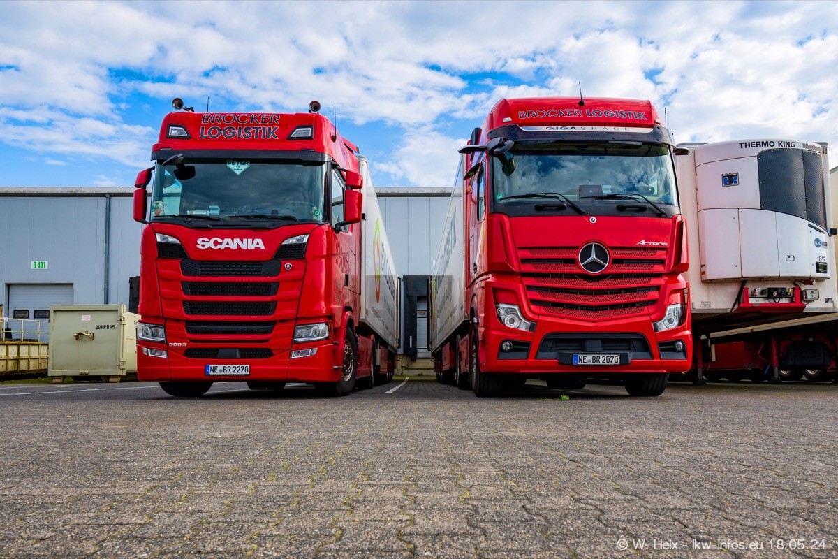 Nach über fünf Jahren war ich wieder bei Brocker Logistik in Korschenbroich. Diesmal wurde ich zu einem kleinen Fotoshooting eingeladen. Am späten Samstag Nachmittag war fast der komplette Fuhrpark zuhause. Das sind aktuell 38 LKW. Zwei fehlten. Zum 10-jährigen Firmenjubiläum wurde im März ein SCANIA 660 S V8 NextGen gekauft. Dieser ist etwas aufwändiger gestaltet als der restliche Fuhrpark, der sich aber auch sehen lassen kann. Auf dem weitläufigen Gelände gab es genug schöne Plätze für dieses kleine Fotoshooting.