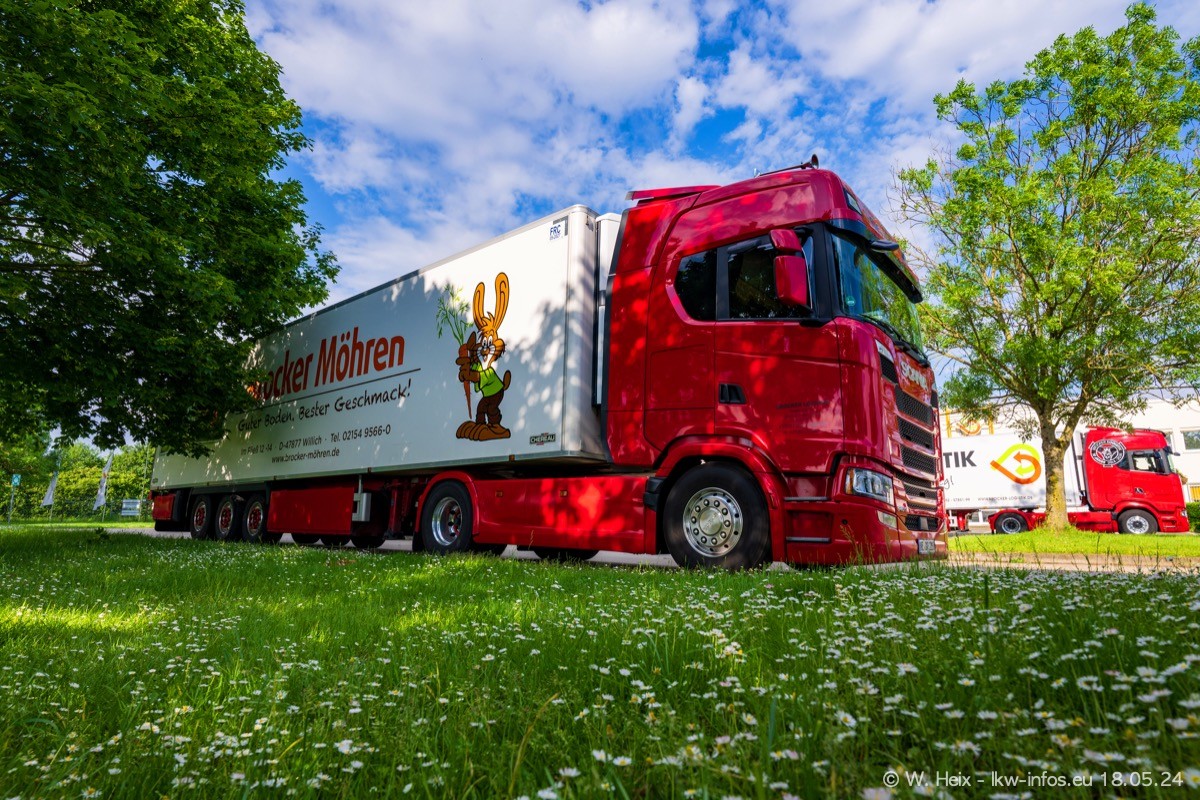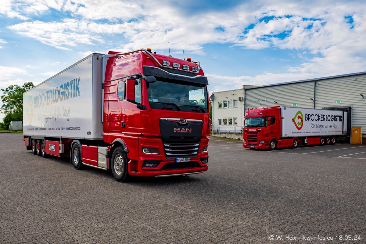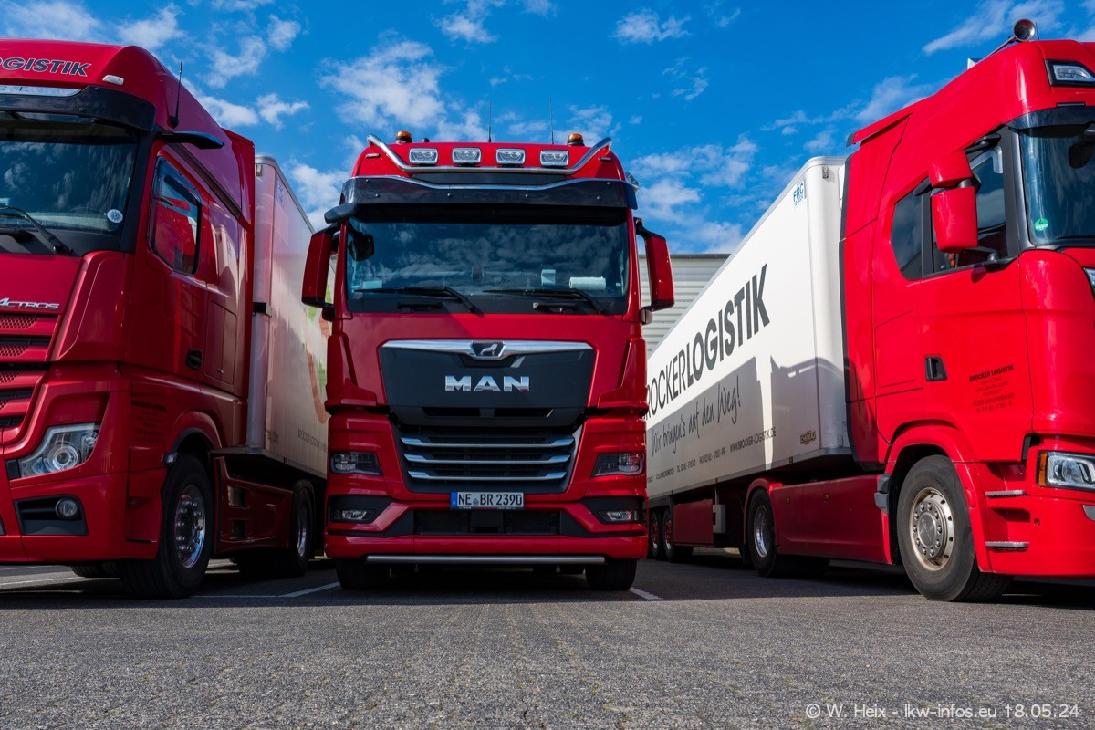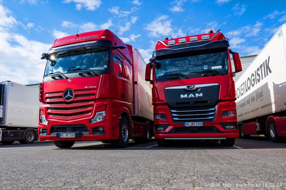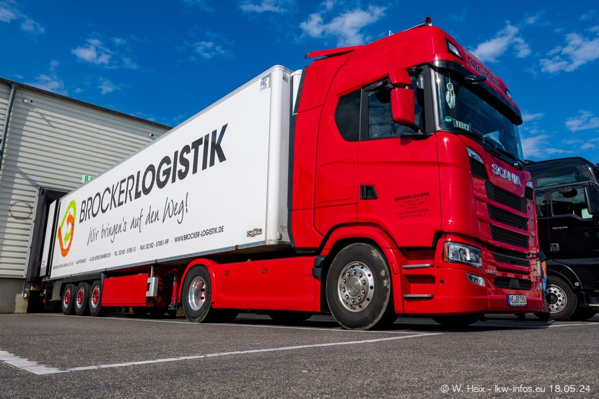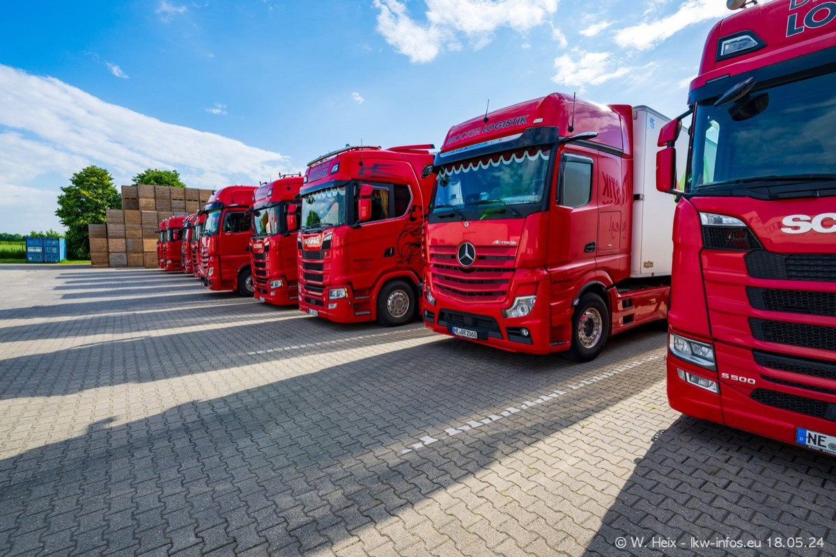 Nach über fünf Jahren war ich wieder bei Brocker Logistik in Korschenbroich. Diesmal wurde ich zu einem kleinen Fotoshooting eingeladen. Am späten Samstag Nachmittag war fast der komplette Fuhrpark zuhause. Das sind aktuell 38 LKW. Zwei fehlten. Zum 10-jährigen Firmenjubiläum wurde im März ein SCANIA 660 S V8 NextGen gekauft. Dieser ist etwas aufwändiger gestaltet als der restliche Fuhrpark, der sich aber auch sehen lassen kann. Auf dem weitläufigen Gelände gab es genug schöne Plätze für dieses kleine Fotoshooting.