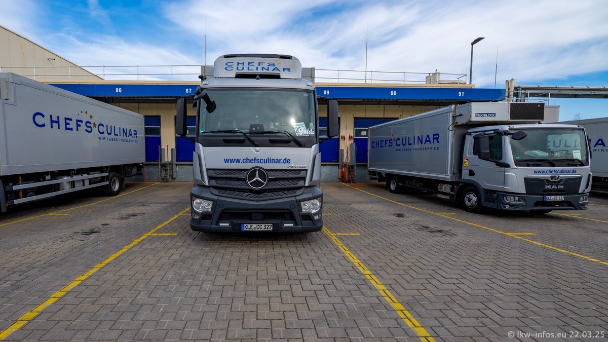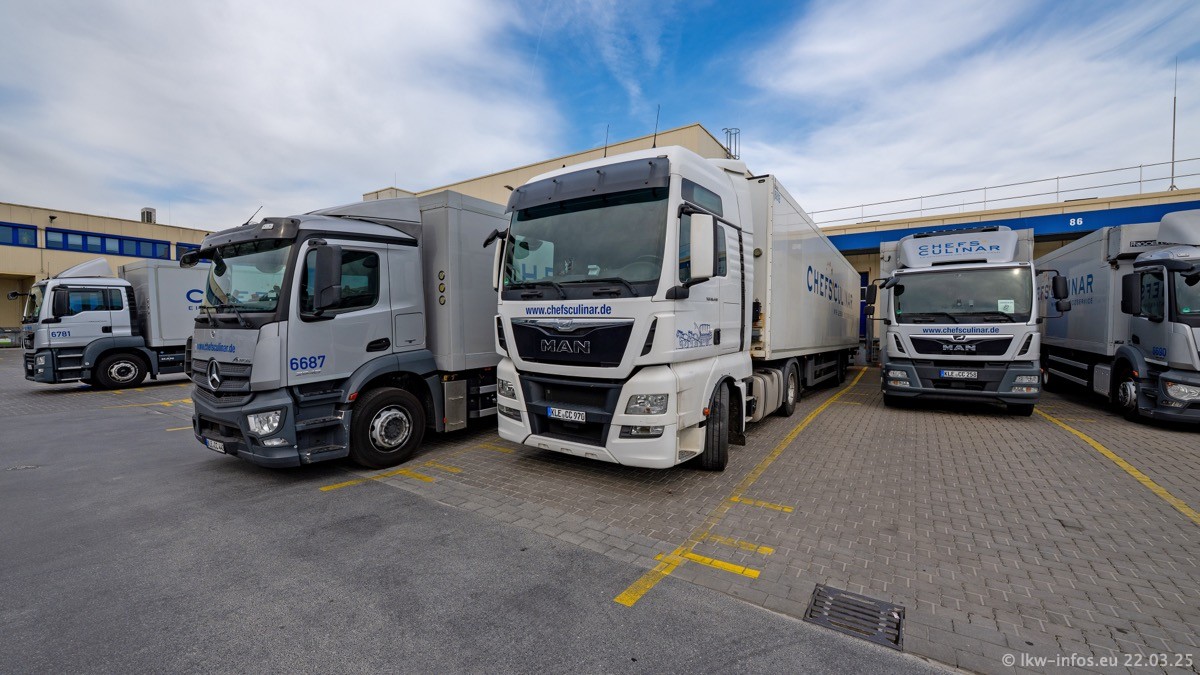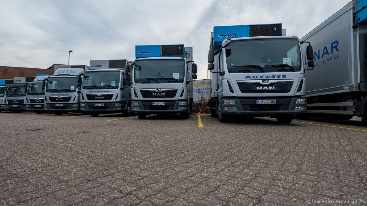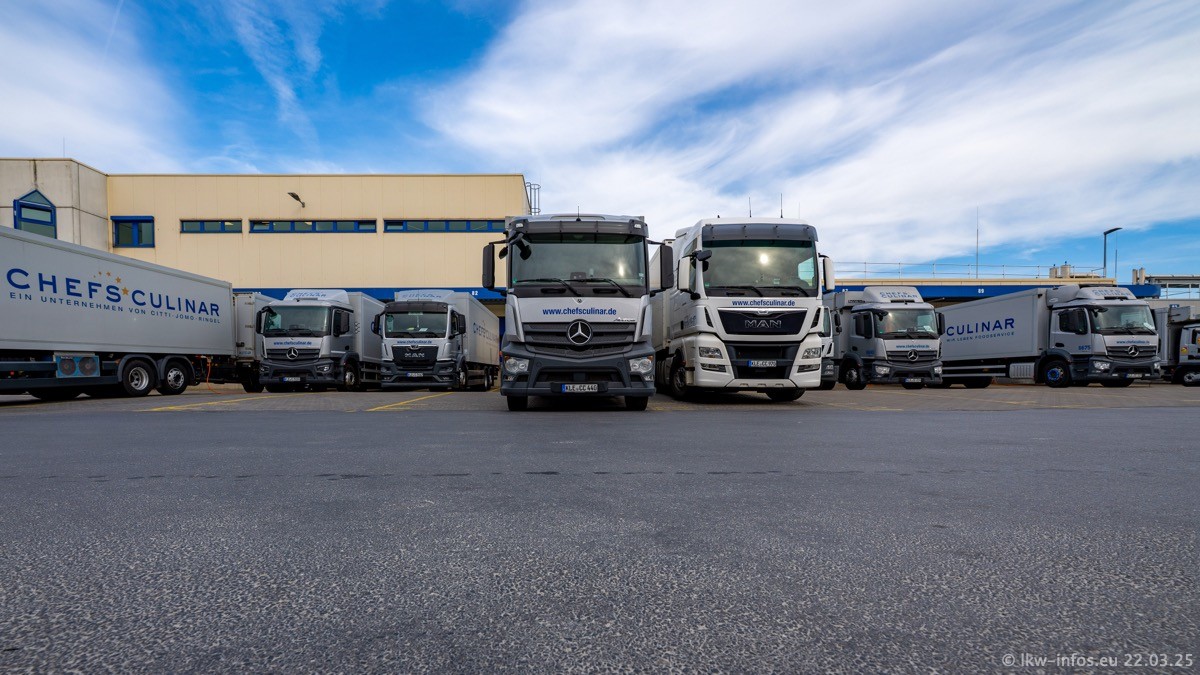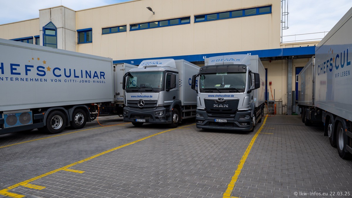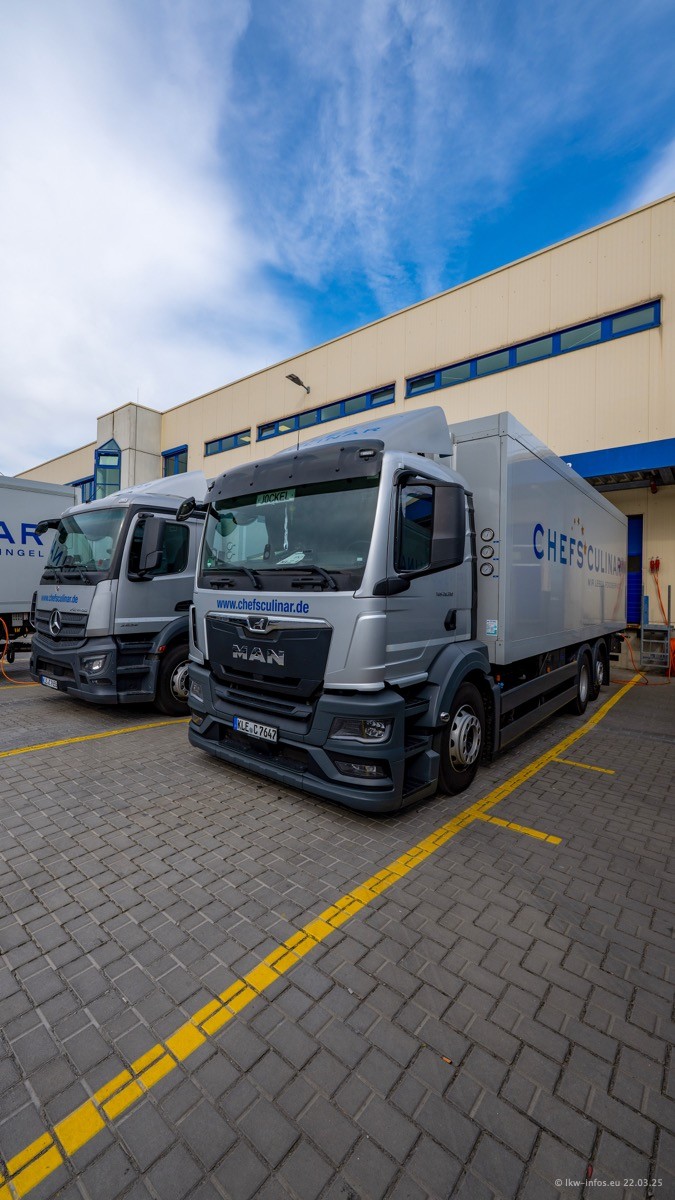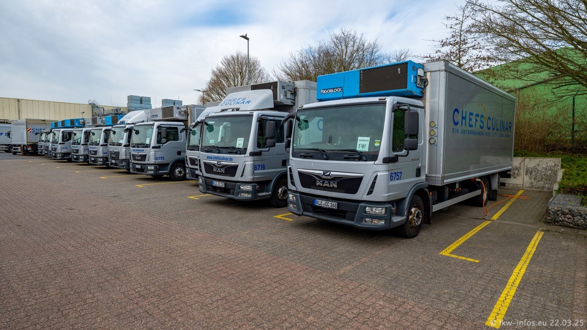 Mein letzter Besuch bei CHEFS CULINAR war Mitte 2021, war also vor fast vier Jahren. Entsprechend viel hat sich im Fuhrpark verändert. Insgesamt gibt es aktuell gut 170 LKW am Standort Weeze. Das sind ein paar letzte VOLVO FE, Mercedes-Benz Antos und Actros, MAN TGL, TGS und 2 TGX Sattelzüge. Dazu komen drei Fuso Canter und ein paar IVECO Daily und mindestens ein Mercedes-Benz Sprinter. Seit April 2024 ist mit SCANIA ein neuer Hersteller im Fuprpark vertreten. Das sind aktuell 10 SCANIA P 320 NextGen. Die letzten sind im Oktober 2024 dazu gekommen. In den letzten zwei Jahren wurden außerdem 70 neue MAN TGL und TGS gekauft, die ältere Fahrzeuge ersetzen und ein paar Mercedes-Benz Actros sind ebenfalls neu. Außerdem gibt es noch eine "Besonderheit": In der nächsten Woche wird der letzte MAN TGS im alten blau-gelben Design "JOMO" den Fuhrpark verlassen. Die Umstellung auf das heutige Design begann im Jahr 2013. Der LKW ist im Teil 5 ganz am Ende der Galerie zu sehen.