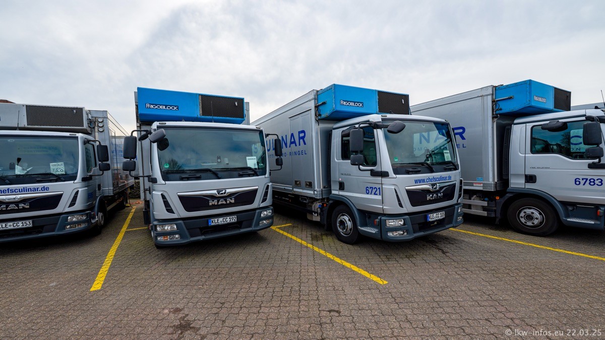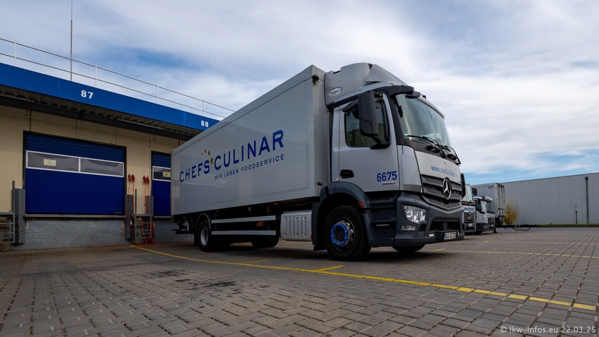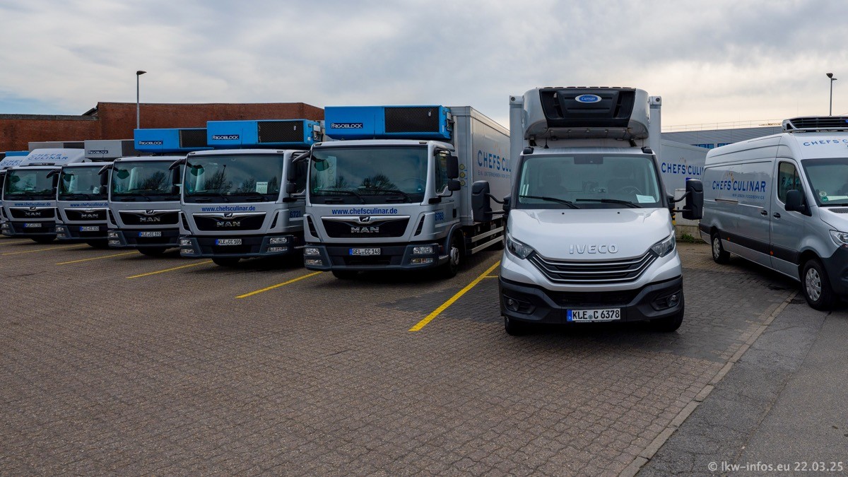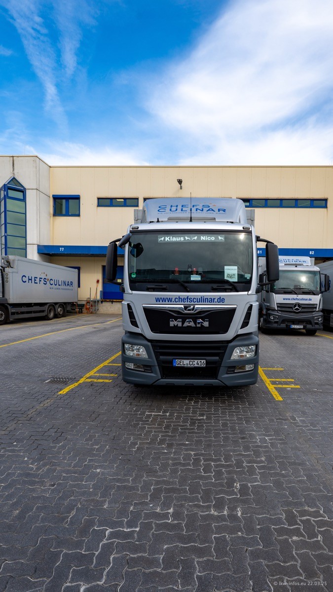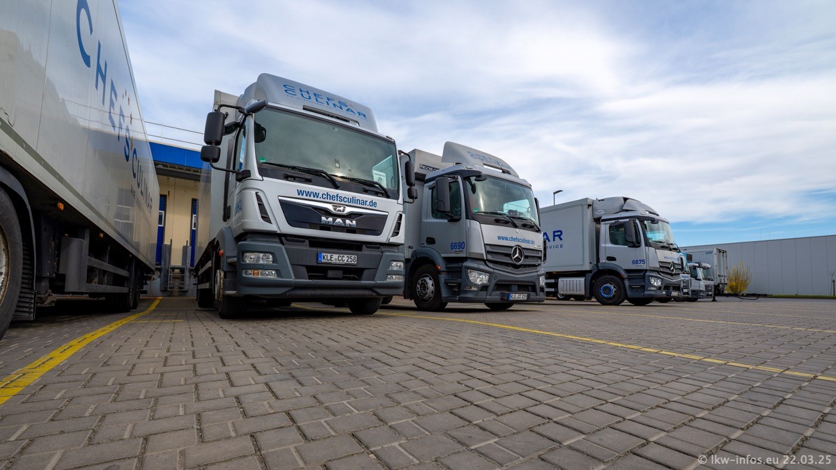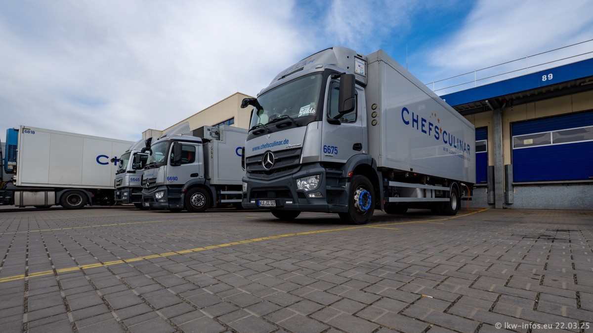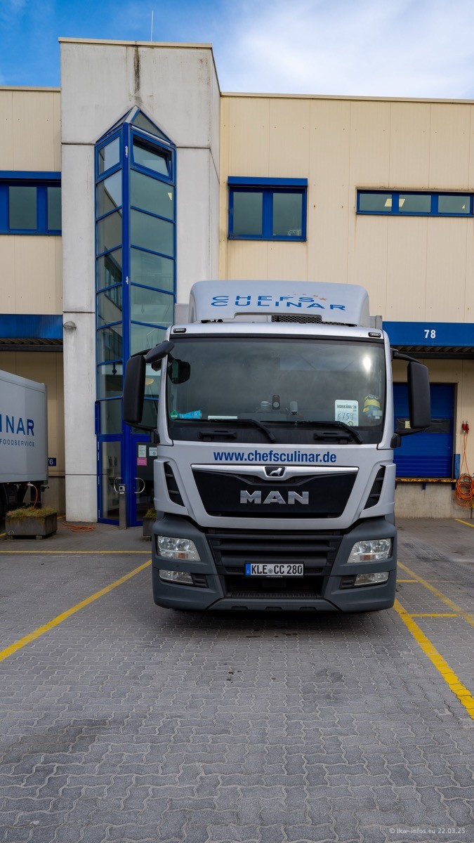 Mein letzter Besuch bei CHEFS CULINAR war Mitte 2021, war also vor fast vier Jahren. Entsprechend viel hat sich im Fuhrpark verändert. Insgesamt gibt es aktuell gut 170 LKW am Standort Weeze. Das sind ein paar letzte VOLVO FE, Mercedes-Benz Antos und Actros, MAN TGL, TGS und 2 TGX Sattelzüge. Dazu komen drei Fuso Canter und ein paar IVECO Daily und mindestens ein Mercedes-Benz Sprinter. Seit April 2024 ist mit SCANIA ein neuer Hersteller im Fuprpark vertreten. Das sind aktuell 10 SCANIA P 320 NextGen. Die letzten sind im Oktober 2024 dazu gekommen. In den letzten zwei Jahren wurden außerdem 70 neue MAN TGL und TGS gekauft, die ältere Fahrzeuge ersetzen und ein paar Mercedes-Benz Actros sind ebenfalls neu. Außerdem gibt es noch eine "Besonderheit": In der nächsten Woche wird der letzte MAN TGS im alten blau-gelben Design "JOMO" den Fuhrpark verlassen. Die Umstellung auf das heutige Design begann im Jahr 2013. Der LKW ist im Teil 5 ganz am Ende der Galerie zu sehen.