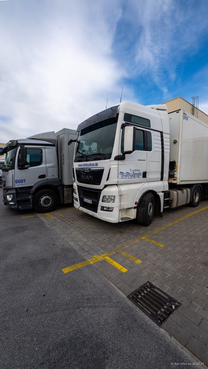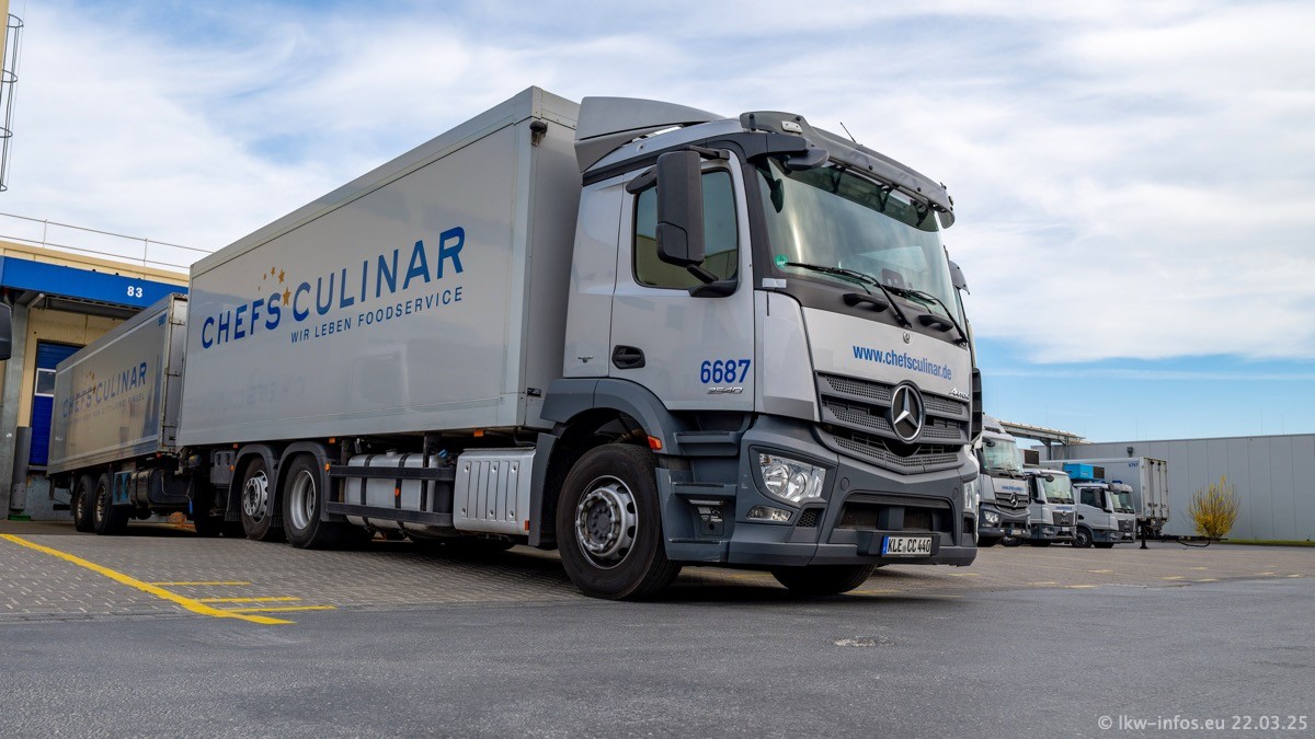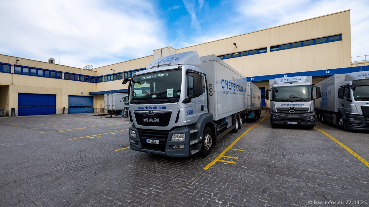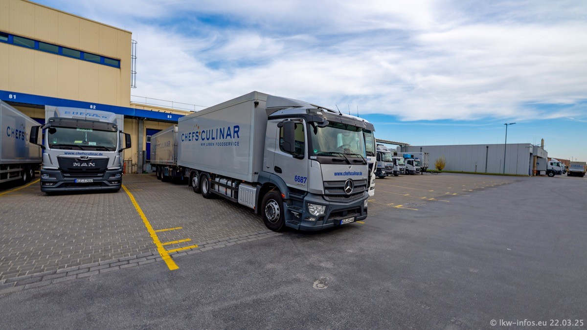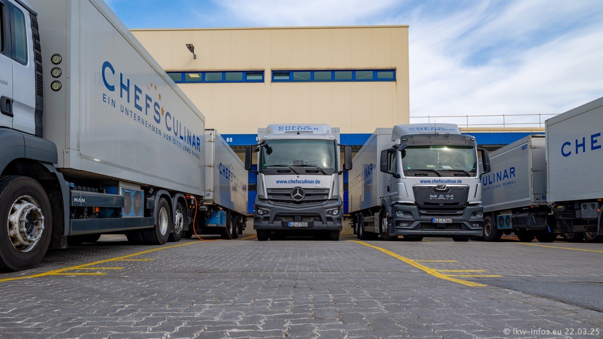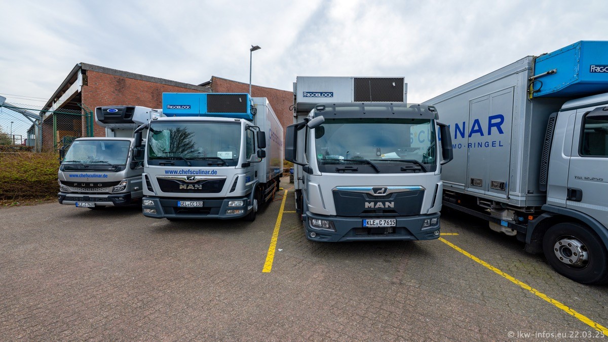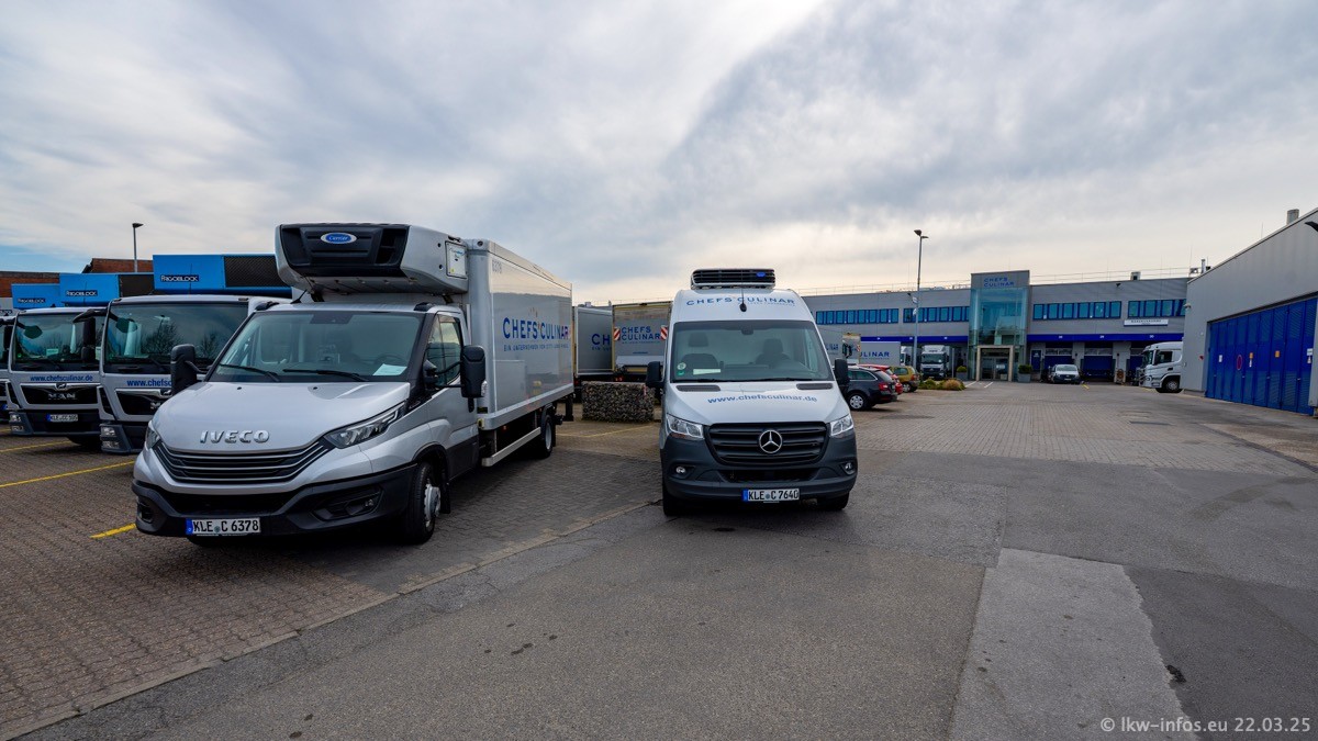 Mein letzter Besuch bei CHEFS CULINAR war Mitte 2021, war also vor fast vier Jahren. Entsprechend viel hat sich im Fuhrpark verändert. Insgesamt gibt es aktuell gut 170 LKW am Standort Weeze. Das sind ein paar letzte VOLVO FE, Mercedes-Benz Antos und Actros, MAN TGL, TGS und 2 TGX Sattelzüge. Dazu komen drei Fuso Canter und ein paar IVECO Daily und mindestens ein Mercedes-Benz Sprinter. Seit April 2024 ist mit SCANIA ein neuer Hersteller im Fuprpark vertreten. Das sind aktuell 10 SCANIA P 320 NextGen. Die letzten sind im Oktober 2024 dazu gekommen. In den letzten zwei Jahren wurden außerdem 70 neue MAN TGL und TGS gekauft, die ältere Fahrzeuge ersetzen und ein paar Mercedes-Benz Actros sind ebenfalls neu. Außerdem gibt es noch eine "Besonderheit": In der nächsten Woche wird der letzte MAN TGS im alten blau-gelben Design "JOMO" den Fuhrpark verlassen. Die Umstellung auf das heutige Design begann im Jahr 2013. Der LKW ist im Teil 5 ganz am Ende der Galerie zu sehen.