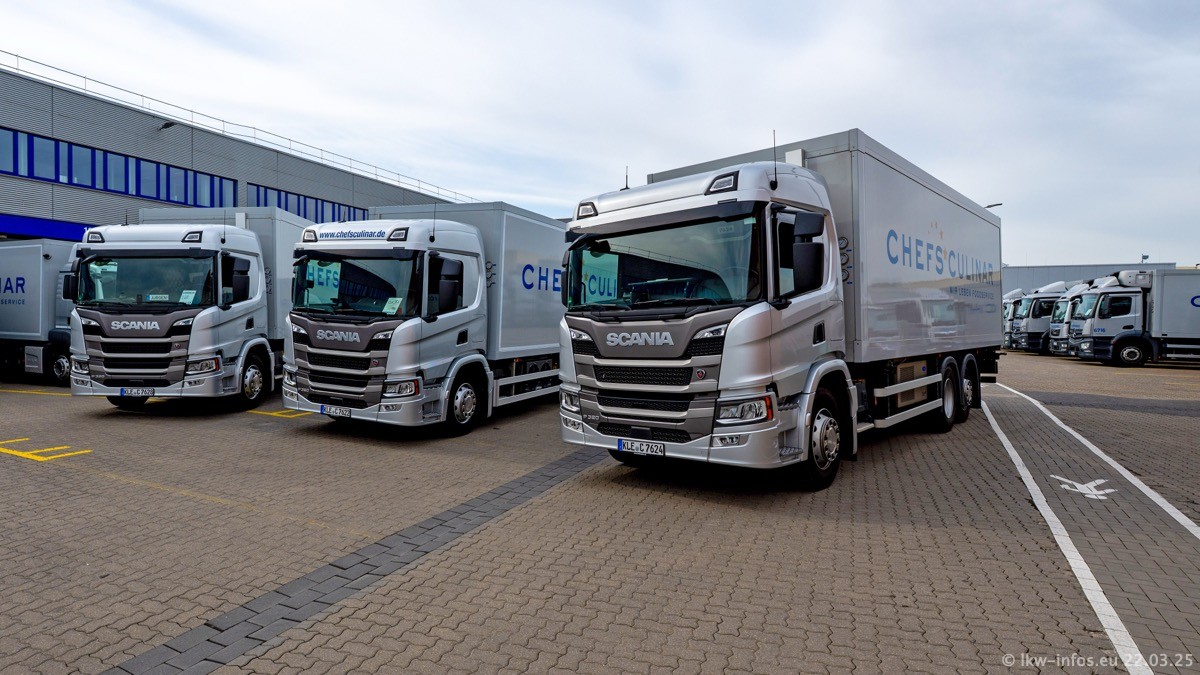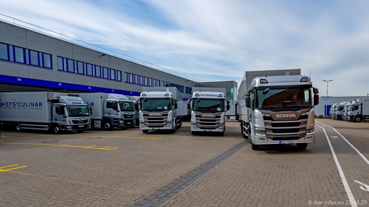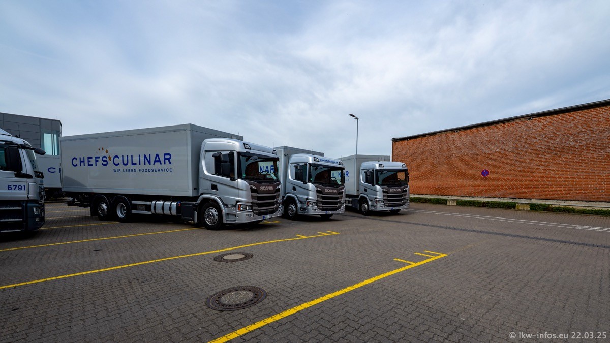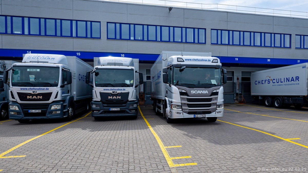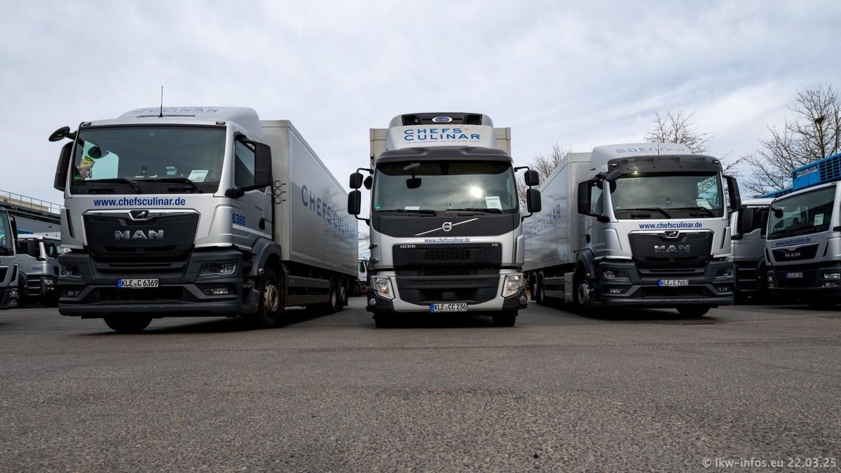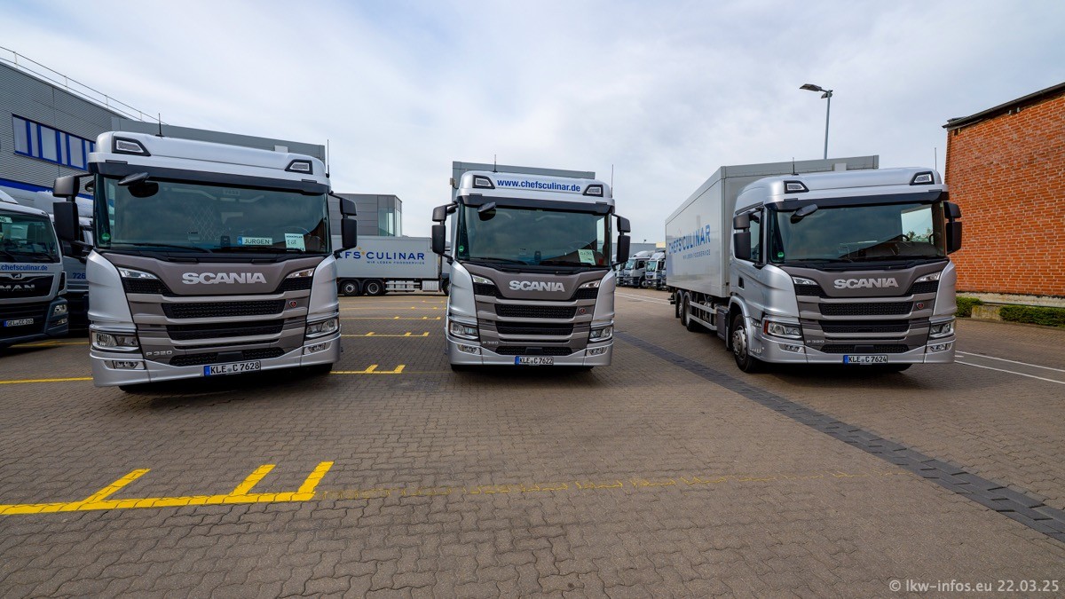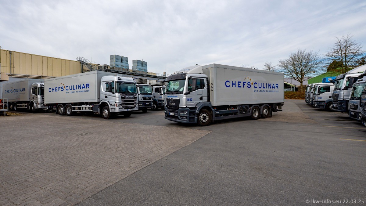 Mein letzter Besuch bei CHEFS CULINAR war Mitte 2021, war also vor fast vier Jahren. Entsprechend viel hat sich im Fuhrpark verändert. Insgesamt gibt es aktuell gut 170 LKW am Standort Weeze. Das sind ein paar letzte VOLVO FE, Mercedes-Benz Antos und Actros, MAN TGL, TGS und 2 TGX Sattelzüge. Dazu komen drei Fuso Canter und ein paar IVECO Daily und mindestens ein Mercedes-Benz Sprinter. Seit April 2024 ist mit SCANIA ein neuer Hersteller im Fuprpark vertreten. Das sind aktuell 10 SCANIA P 320 NextGen. Die letzten sind im Oktober 2024 dazu gekommen. In den letzten zwei Jahren wurden außerdem 70 neue MAN TGL und TGS gekauft, die ältere Fahrzeuge ersetzen und ein paar Mercedes-Benz Actros sind ebenfalls neu. Außerdem gibt es noch eine "Besonderheit": In der nächsten Woche wird der letzte MAN TGS im alten blau-gelben Design "JOMO" den Fuhrpark verlassen. Die Umstellung auf das heutige Design begann im Jahr 201. Der LKW ist im Teil 5 ganz am Ende der Galerie zu sehen.