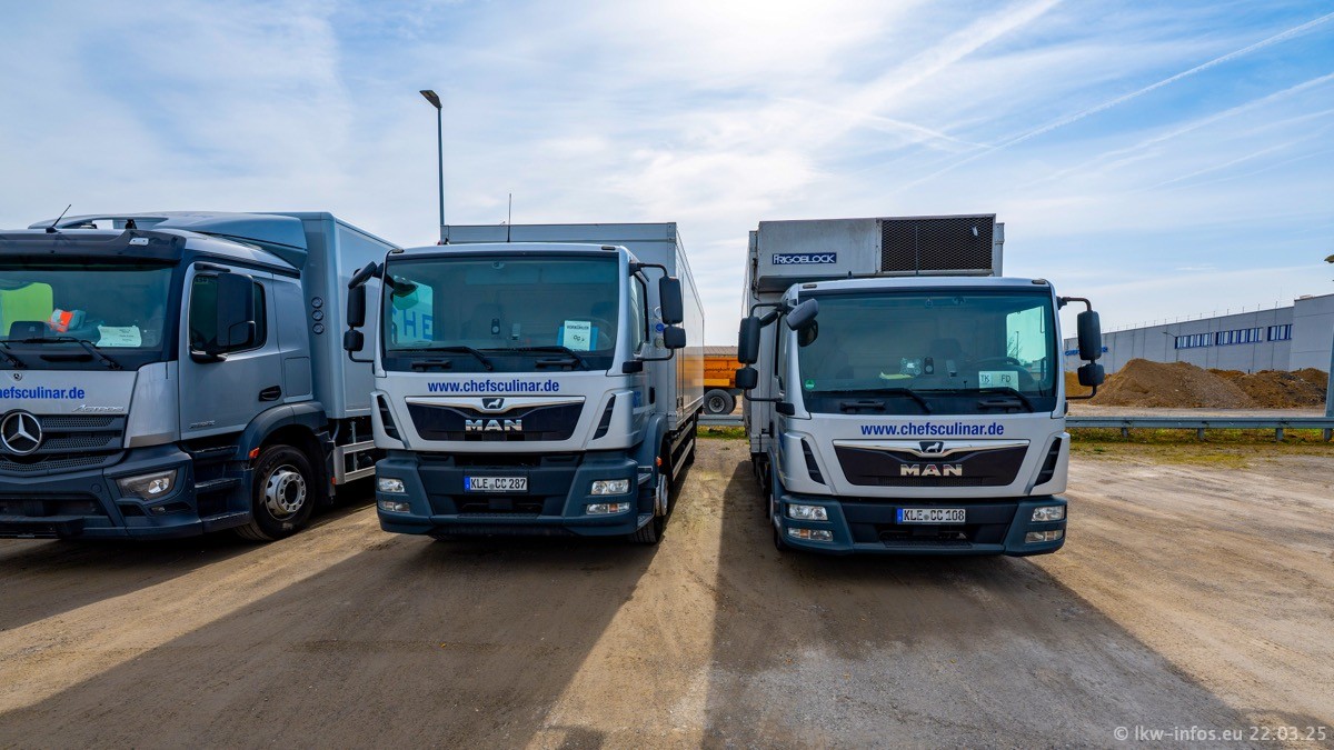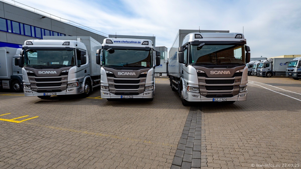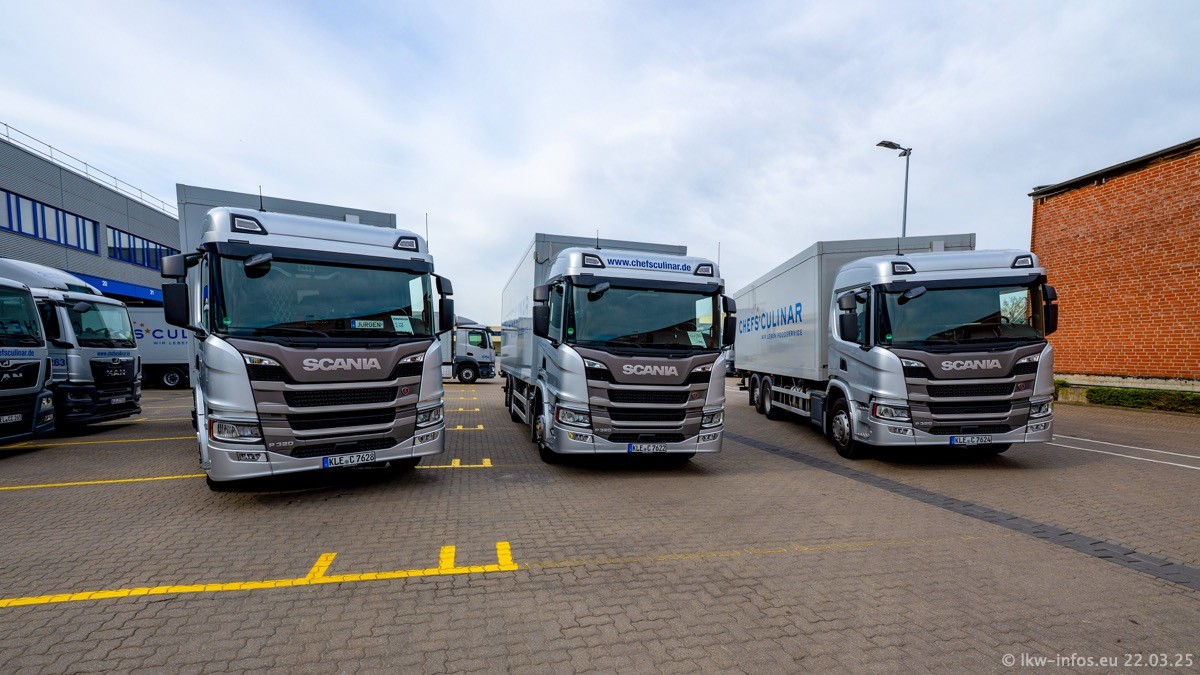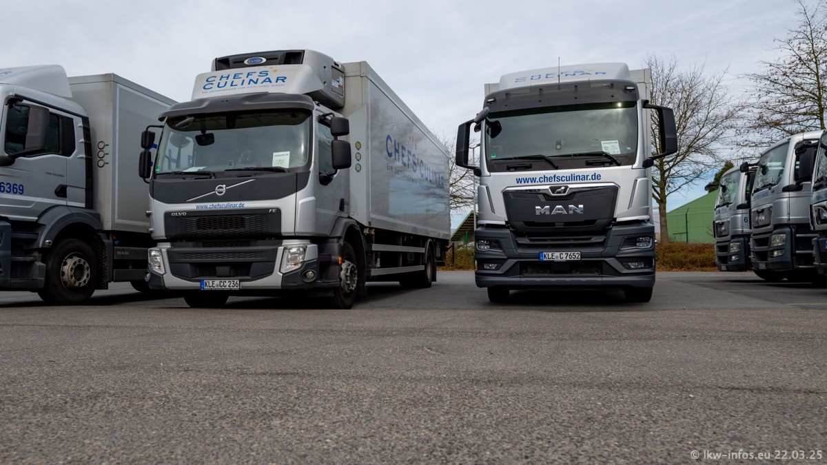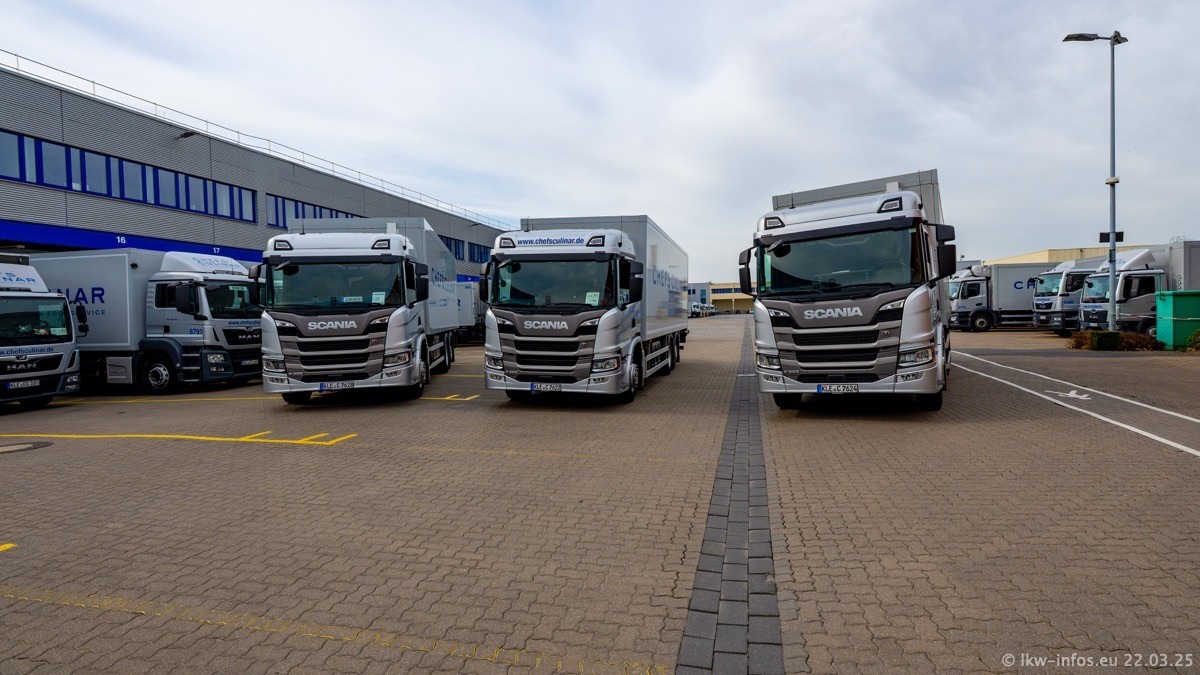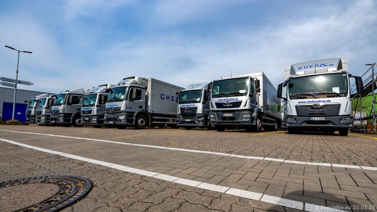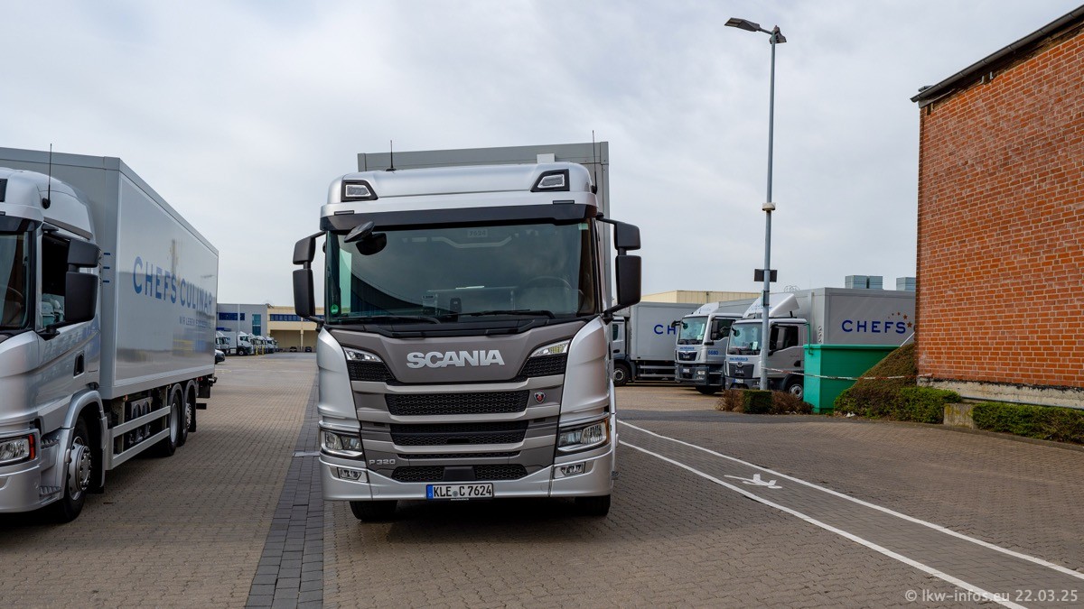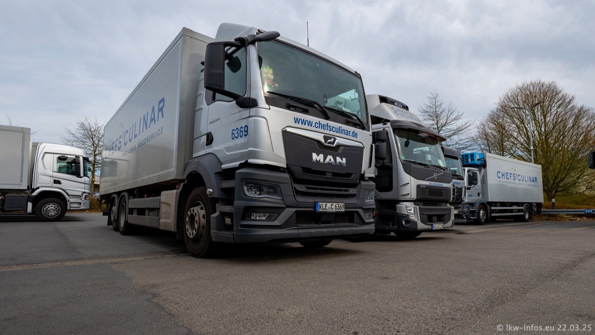 Mein letzter Besuch bei CHEFS CULINAR war Mitte 2021, war also vor fast vier Jahren. Entsprechend viel hat sich im Fuhrpark verändert. Insgesamt gibt es aktuell gut 170 LKW am Standort Weeze. Das sind ein paar letzte VOLVO FE, Mercedes-Benz Antos und Actros, MAN TGL, TGS und 2 TGX Sattelzüge. Dazu komen drei Fuso Canter und ein paar IVECO Daily und mindestens ein Mercedes-Benz Sprinter. Seit April 2024 ist mit SCANIA ein neuer Hersteller im Fuprpark vertreten. Das sind aktuell 10 SCANIA P 320 NextGen. Die letzten sind im Oktober 2024 dazu gekommen. In den letzten zwei Jahren wurden außerdem 70 neue MAN TGL und TGS gekauft, die ältere Fahrzeuge ersetzen und ein paar Mercedes-Benz Actros sind ebenfalls neu. Außerdem gibt es noch eine "Besonderheit": In der nächsten Woche wird der letzte MAN TGS im alten blau-gelben Design "JOMO" den Fuhrpark verlassen. Die Umstellung auf das heutige Design begann im Jahr 201. Der LKW ist im Teil 5 ganz am Ende der Galerie zu sehen.