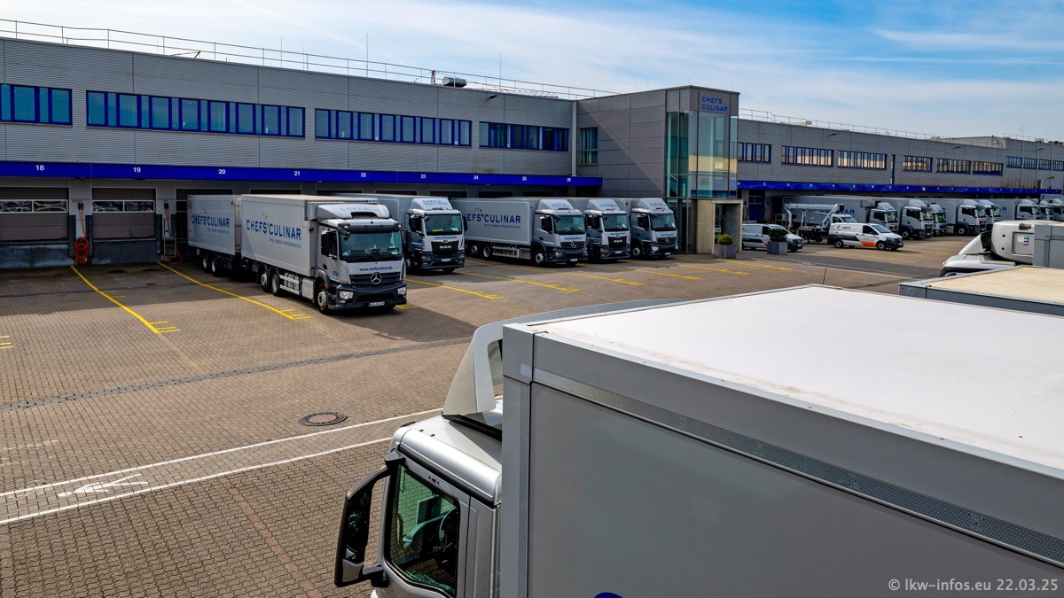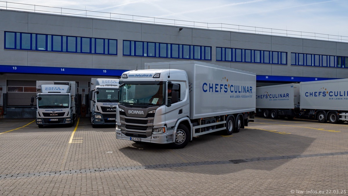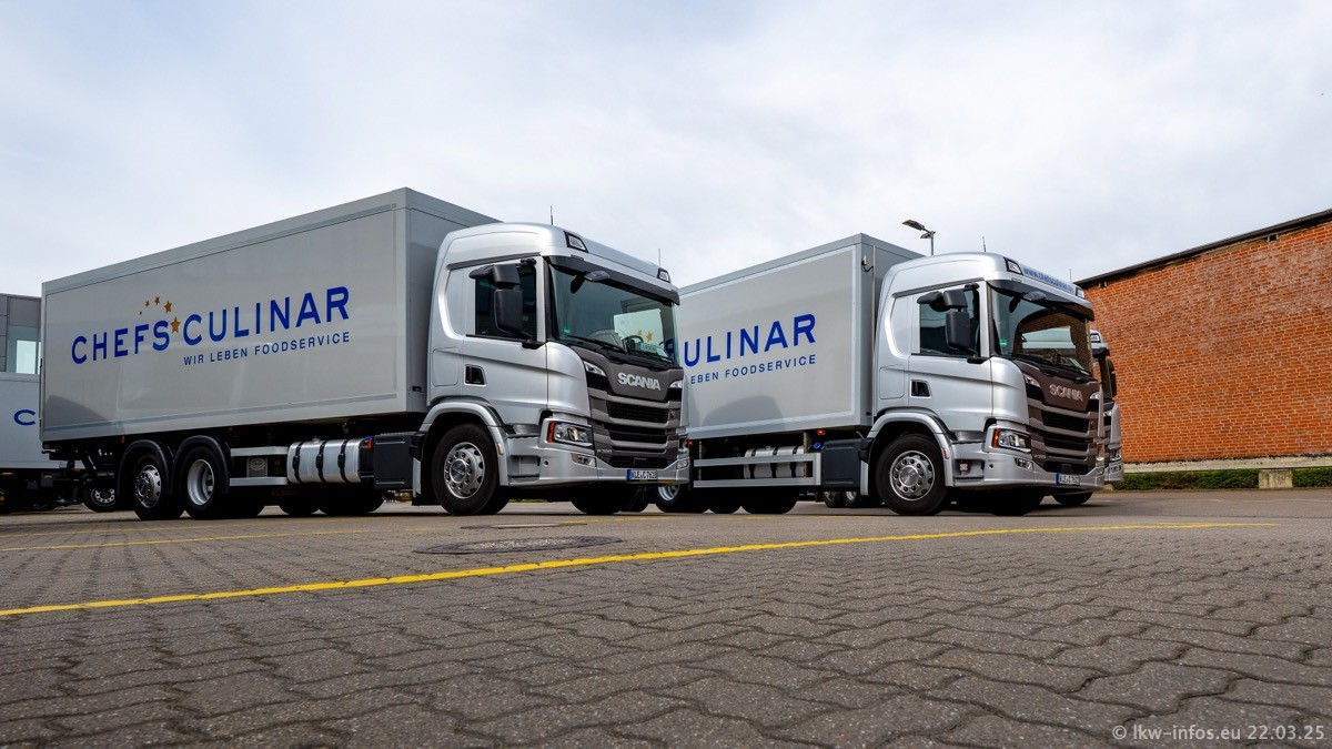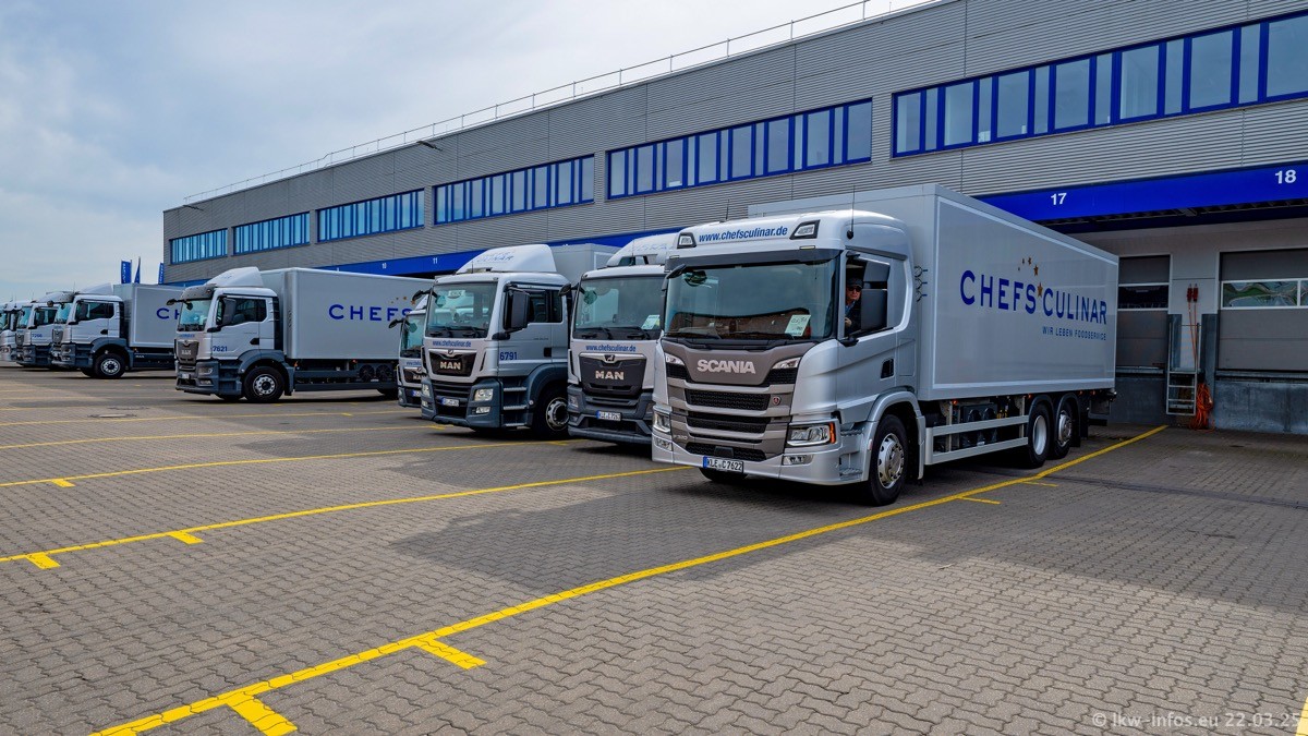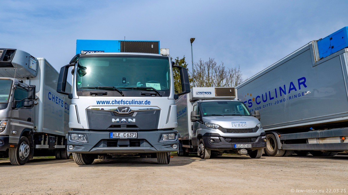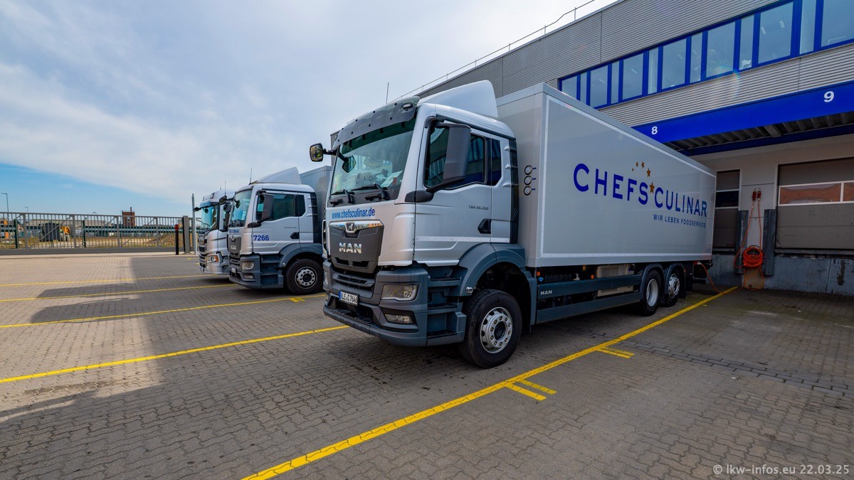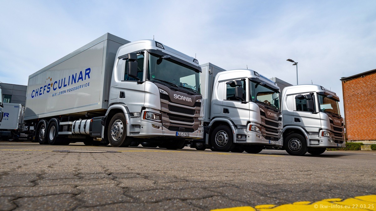 Mein letzter Besuch bei CHEFS CULINAR war Mitte 2021, war also vor fast vier Jahren. Entsprechend viel hat sich im Fuhrpark verändert. Insgesamt gibt es aktuell gut 170 LKW am Standort Weeze. Das sind ein paar letzte VOLVO FE, Mercedes-Benz Antos und Actros, MAN TGL, TGS und 2 TGX Sattelzüge. Dazu komen drei Fuso Canter und ein paar IVECO Daily und mindestens ein Mercedes-Benz Sprinter. Seit April 2024 ist mit SCANIA ein neuer Hersteller im Fuprpark vertreten. Das sind aktuell 10 SCANIA P 320 NextGen. Die letzten sind im Oktober 2024 dazu gekommen. In den letzten zwei Jahren wurden außerdem 70 neue MAN TGL und TGS gekauft, die ältere Fahrzeuge ersetzen und ein paar Mercedes-Benz Actros sind ebenfalls neu. Außerdem gibt es noch eine "Besonderheit": In der nächsten Woche wird der letzte MAN TGS im alten blau-gelben Design "JOMO" den Fuhrpark verlassen. Die Umstellung auf das heutige Design begann im Jahr 201. Der LKW ist im Teil 5 ganz am Ende der Galerie zu sehen.