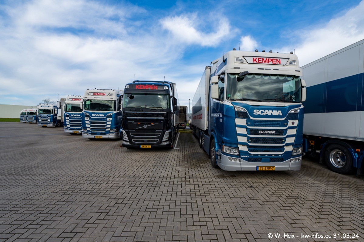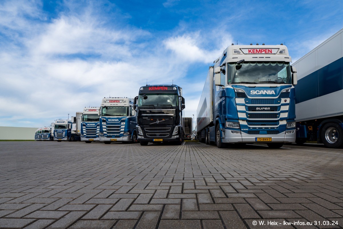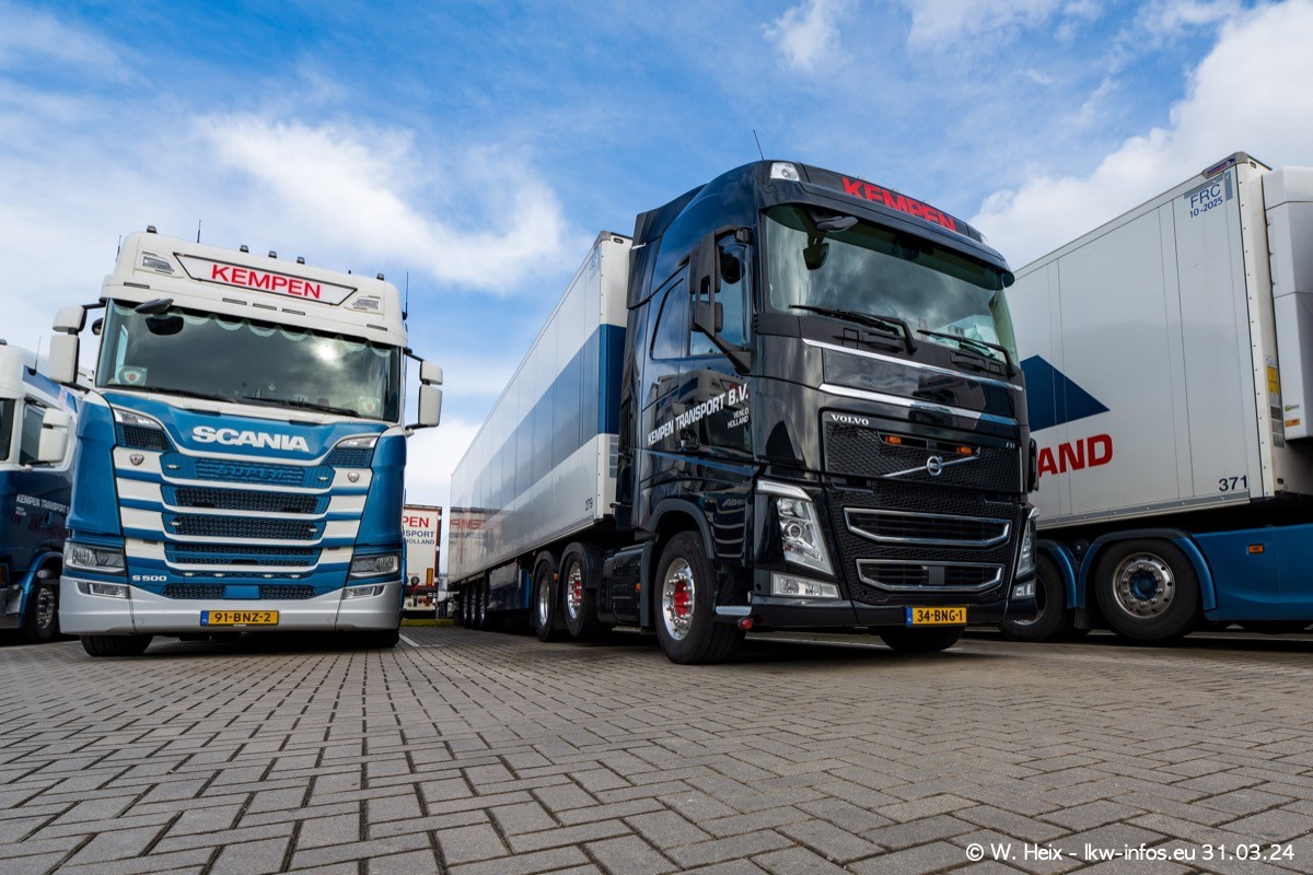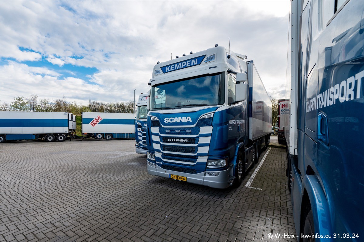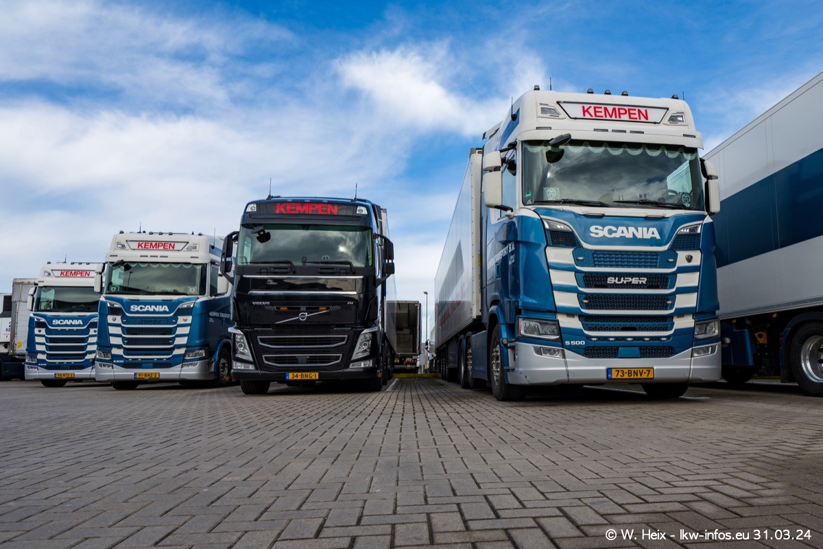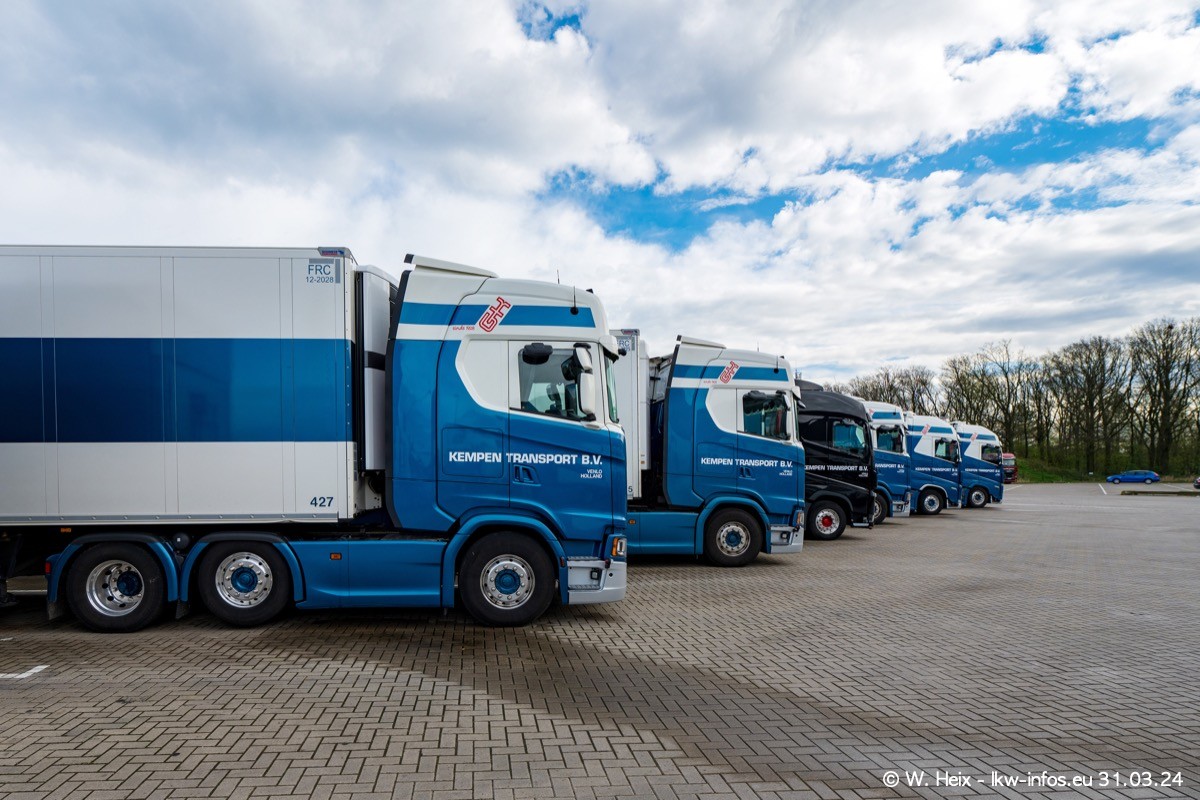 In diesem Jahr sind schon insgesamt mindestens 10 neue LKW in den Fuhrpark gekommen. Alle neuen LKW sind seit 2024 daran zu erkennen, dass aon der Fromt oben am Dach der Kempen-Schriftzug jetzt weiß ist in einem blauen Feld. Bisher war dieser immer rot auf weiß. Es waren so gut wie alle LKW zuzhause und standen auch wieder auf den Nachbargrundstücken. Diesmal konnte ich keinen SCANIA R Streamline und keinen DAF XF mehr sehen bis auf den neuen blauen DAF XG+ natürlich. Vermutlich sind jetzt alle alten SCANIA und DAF ersetzt durch VOLVO FH 5 und SCANIA R/S NextGen. Es sind natürlich auch wieder Bilder von den Chatern (Subunternehmern) in den Galerien enthalten. Auch hier tut sich immer wieder mal was.