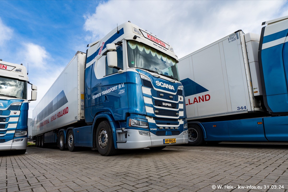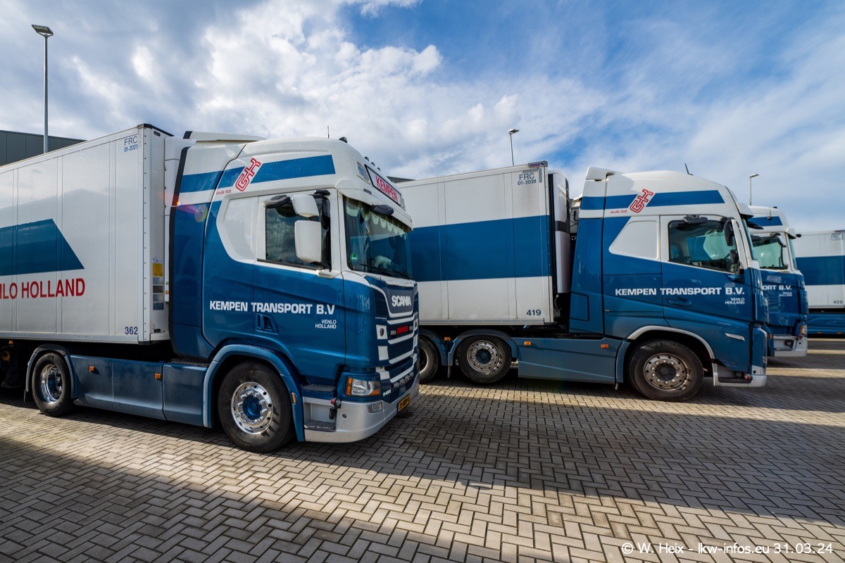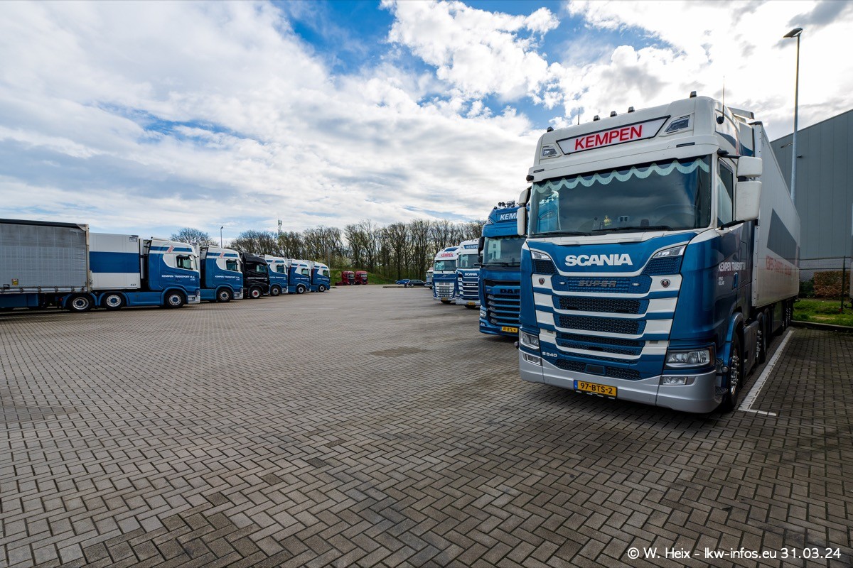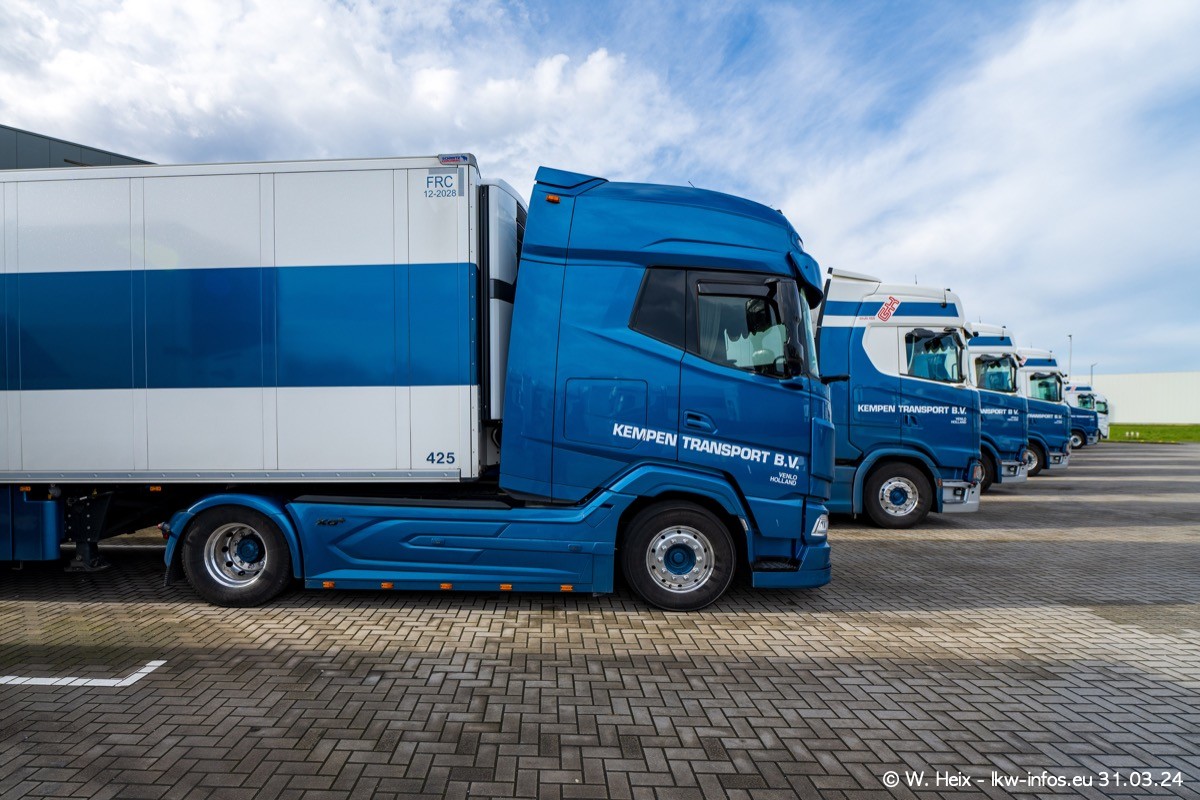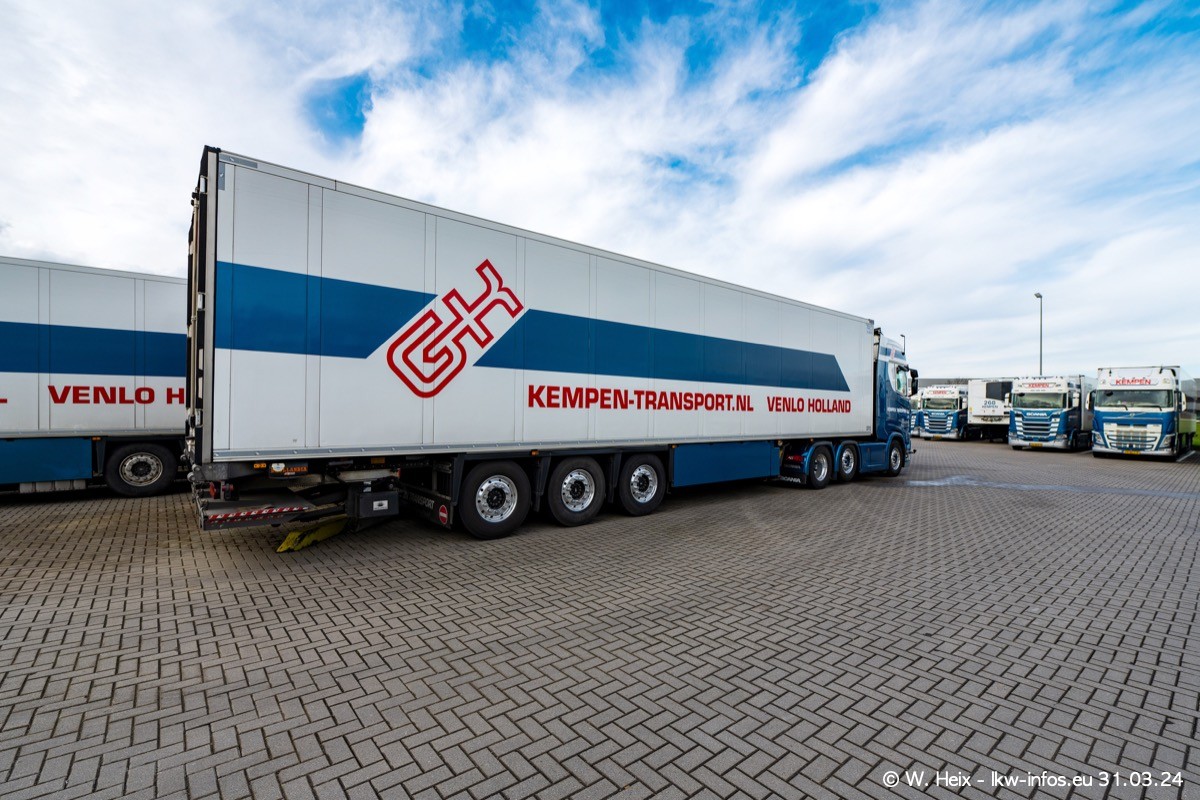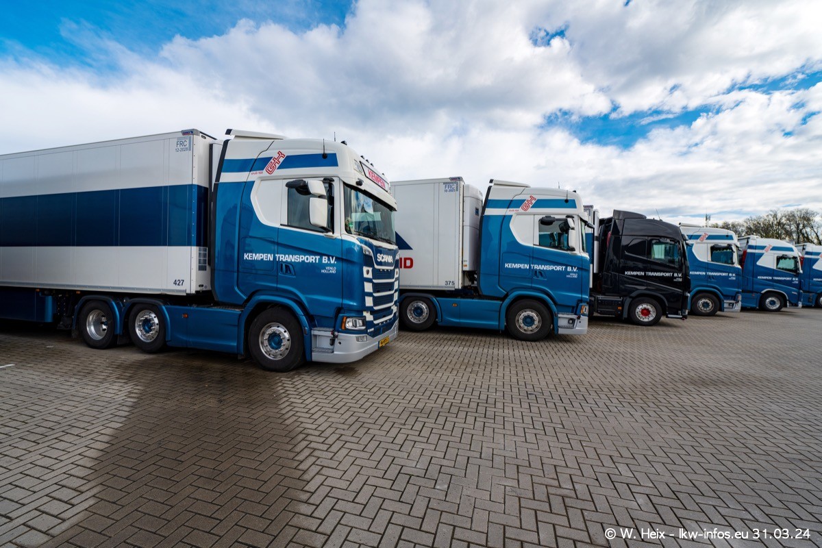 In diesem Jahr sind schon insgesamt mindestens 10 neue LKW in den Fuhrpark gekommen. Alle neuen LKW sind seit 2024 daran zu erkennen, dass aon der Fromt oben am Dach der Kempen-Schriftzug jetzt weiß ist in einem blauen Feld. Bisher war dieser immer rot auf weiß. Es waren so gut wie alle LKW zuzhause und standen auch wieder auf den Nachbargrundstücken. Diesmal konnte ich keinen SCANIA R Streamline und keinen DAF XF mehr sehen bis auf den neuen blauen DAF XG+ natürlich. Vermutlich sind jetzt alle alten SCANIA und DAF ersetzt durch VOLVO FH 5 und SCANIA R/S NextGen. Es sind natürlich auch wieder Bilder von den Chatern (Subunternehmern) in den Galerien enthalten. Auch hier tut sich immer wieder mal was.