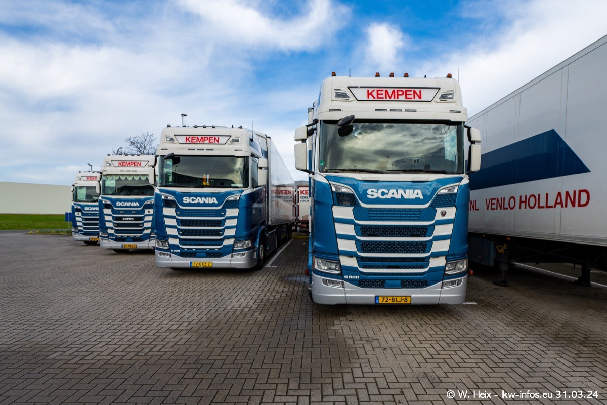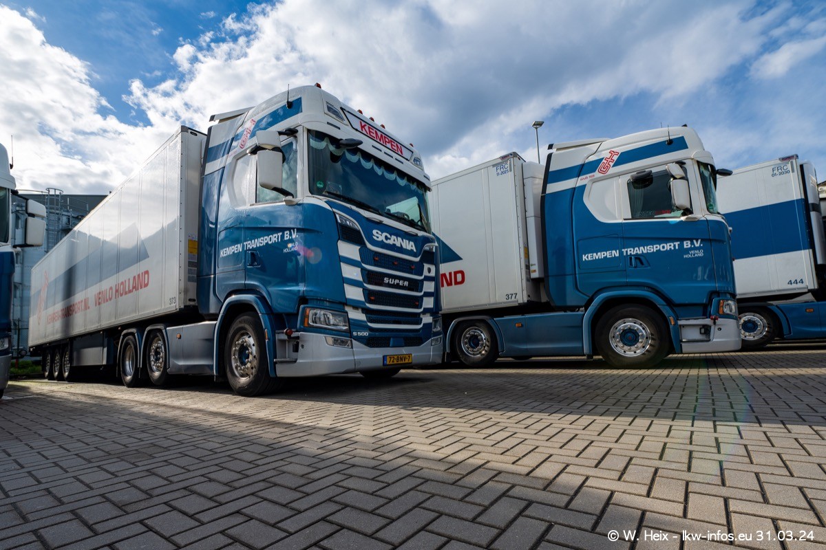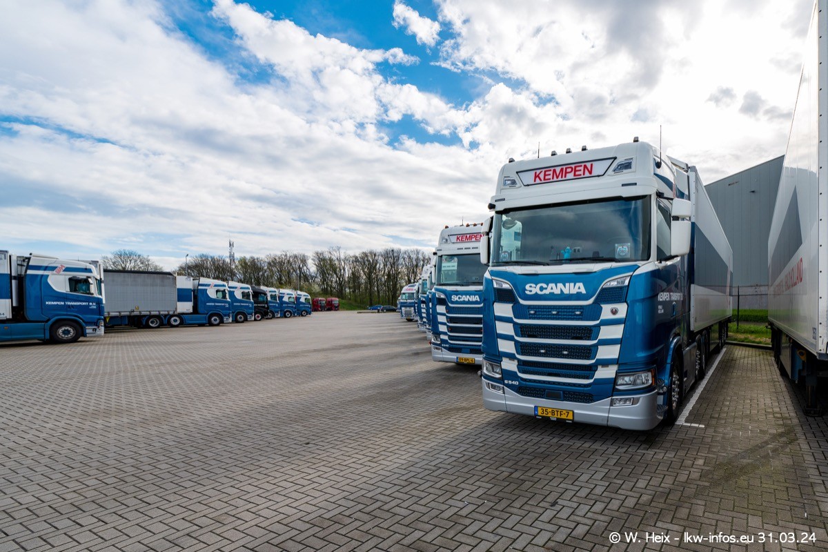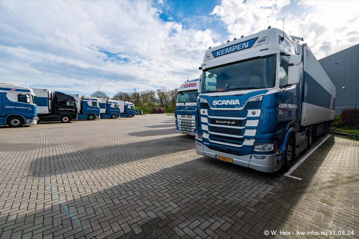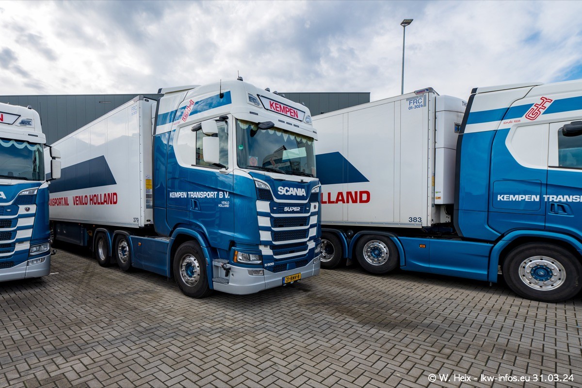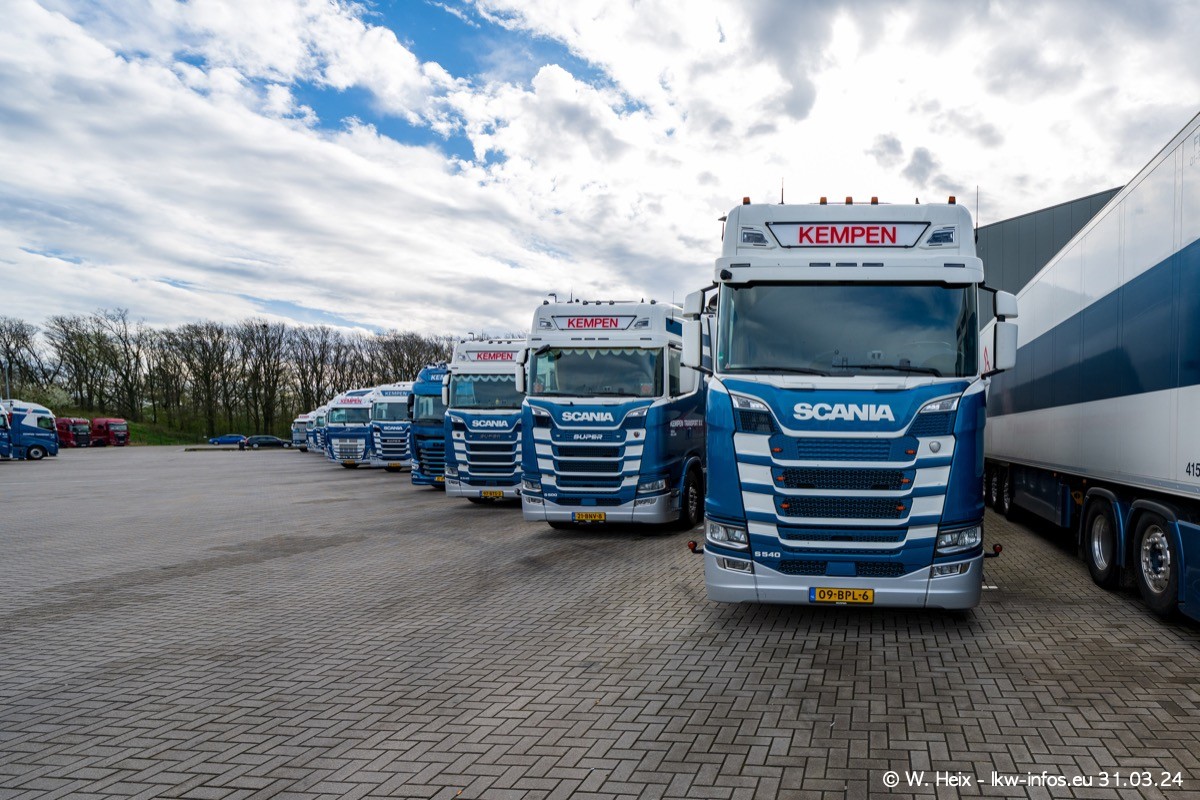 In diesem Jahr sind schon insgesamt mindestens 10 neue LKW in den Fuhrpark gekommen. Alle neuen LKW sind seit 2024 daran zu erkennen, dass aon der Fromt oben am Dach der Kempen-Schriftzug jetzt weiß ist in einem blauen Feld. Bisher war dieser immer rot auf weiß. Es waren so gut wie alle LKW zuzhause und standen auch wieder auf den Nachbargrundstücken. Diesmal konnte ich keinen SCANIA R Streamline und keinen DAF XF mehr sehen bis auf den neuen blauen DAF XG+ natürlich. Vermutlich sind jetzt alle alten SCANIA und DAF ersetzt durch VOLVO FH 5 und SCANIA R/S NextGen. Es sind natürlich auch wieder Bilder von den Chatern (Subunternehmern) in den Galerien enthalten. Auch hier tut sich immer wieder mal was.